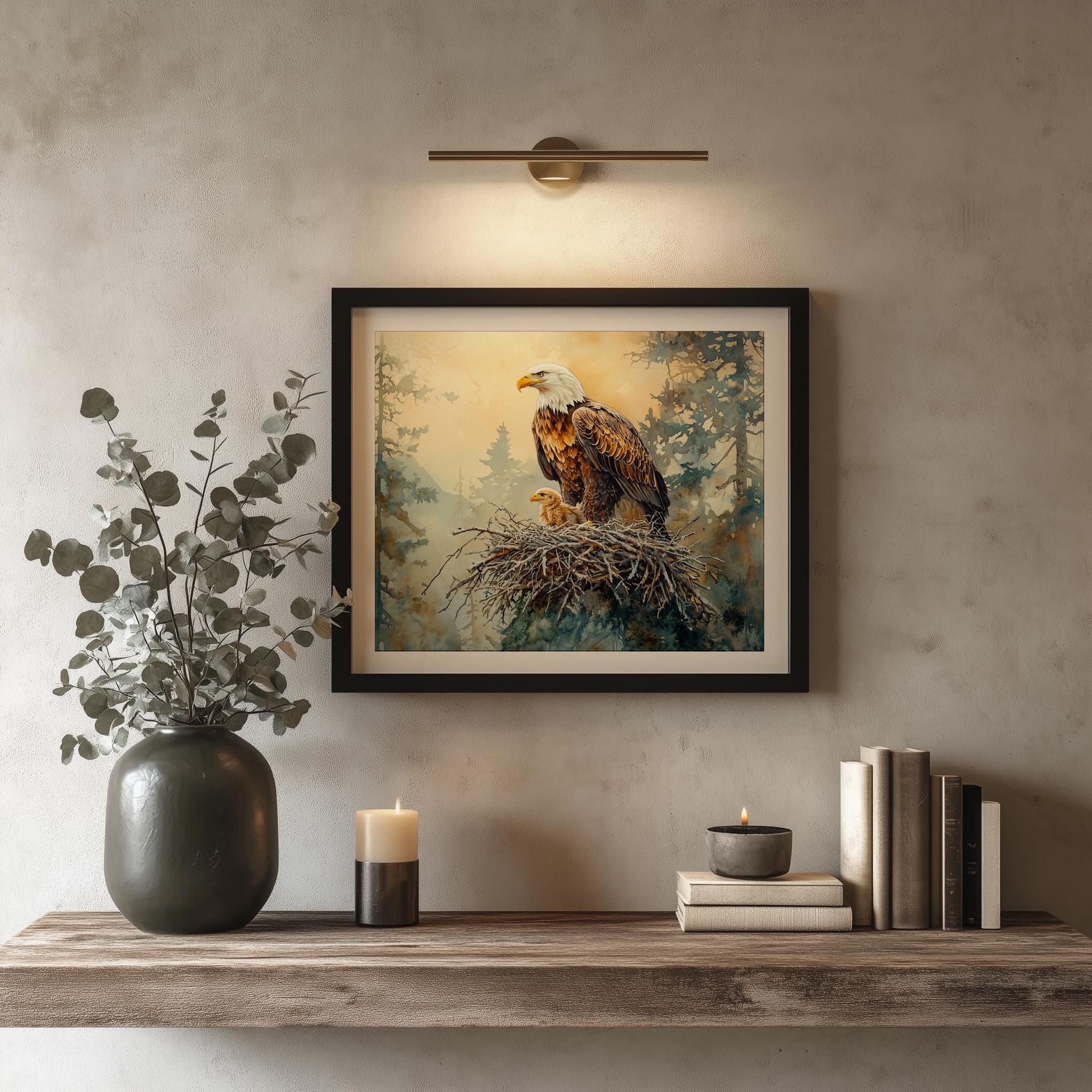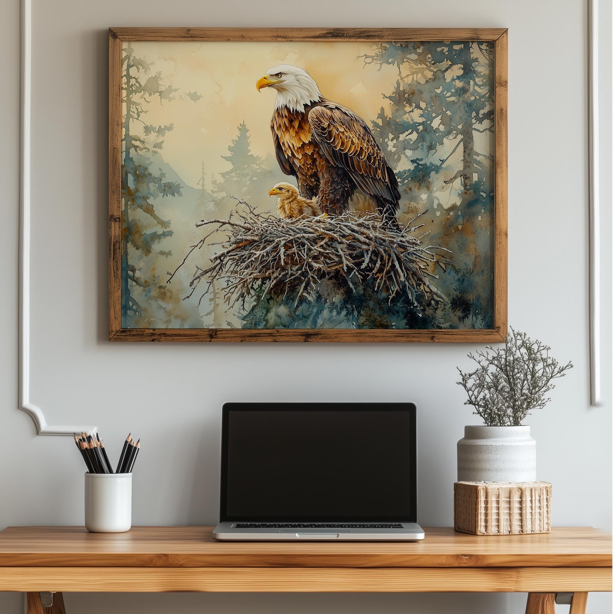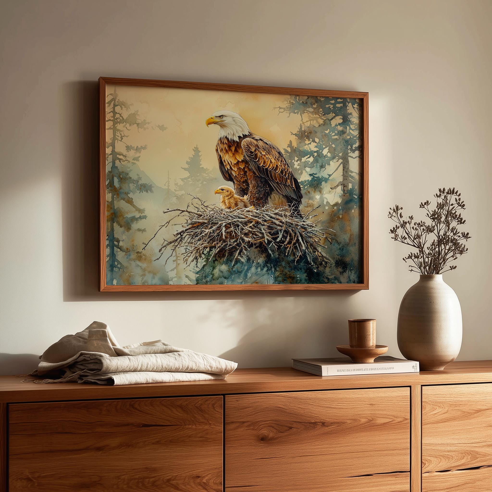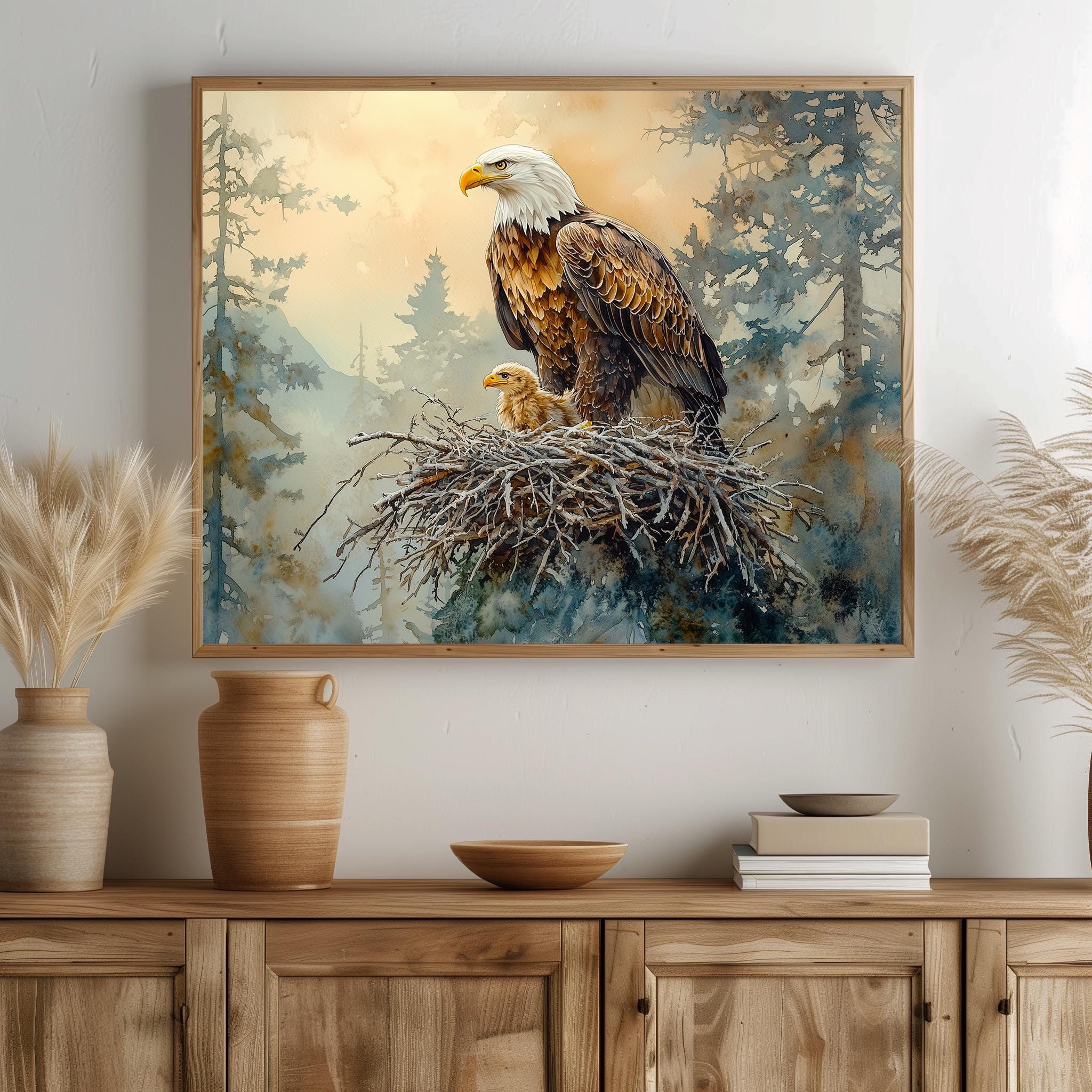 Immerse yourself in the charm with this rustic painting of a majestic bald eagle and its eaglet soaring above a serene forest landscape. An instantly downloadable print, it's perfect for elevating your decor with budget-friendly charm. This gives you the flexibility to customize the size, frame, and material according to your personal taste and space, ensuring a perfect fit for your walls.