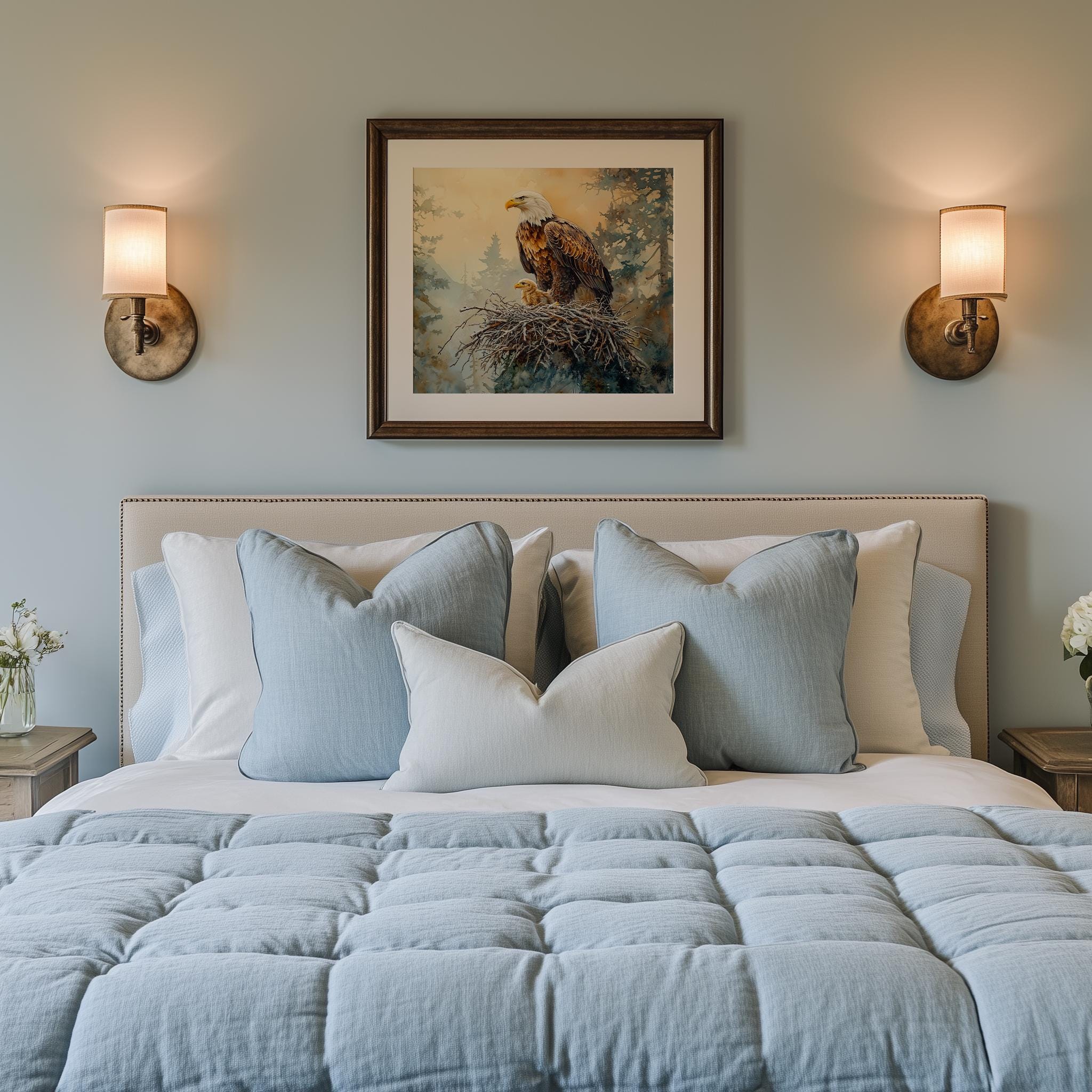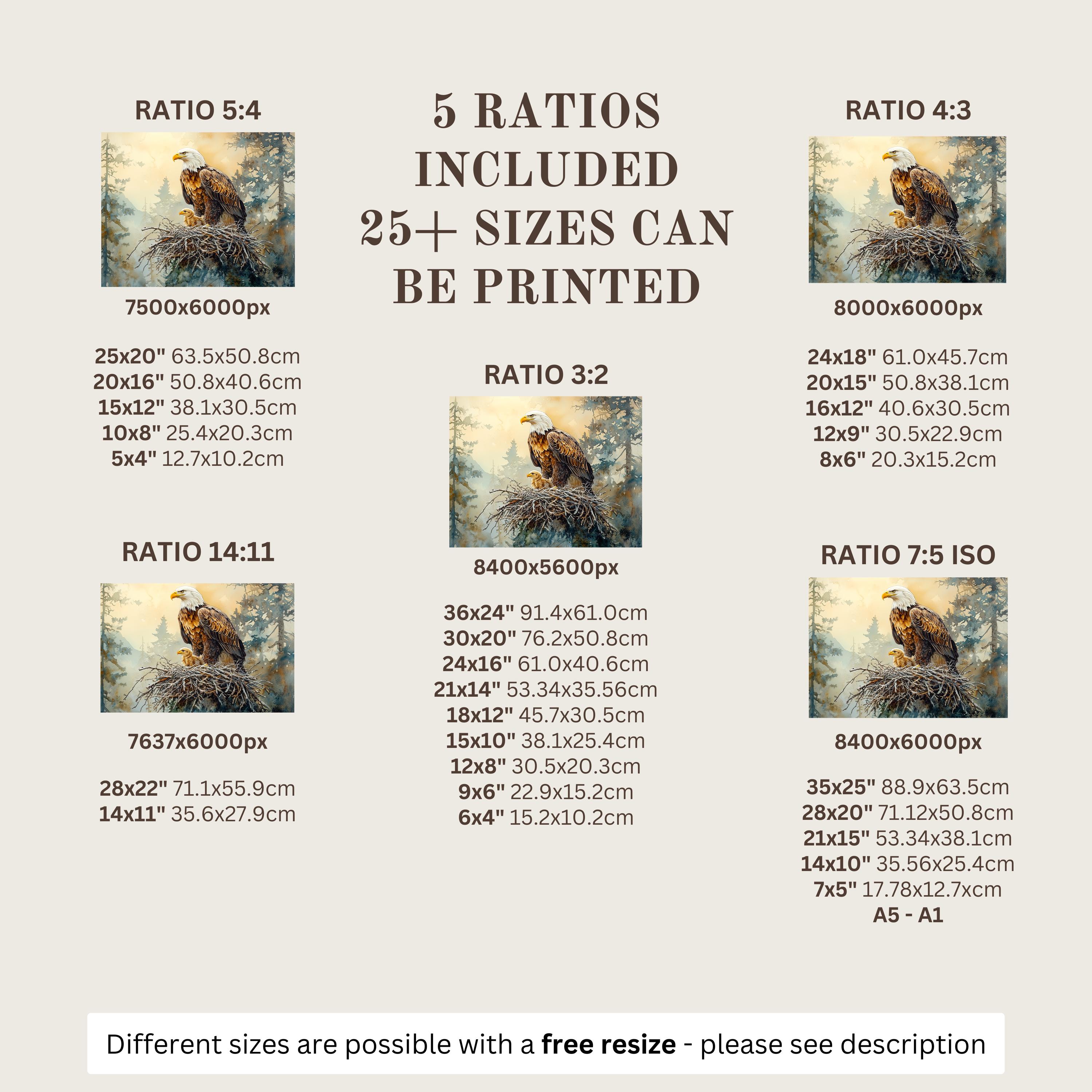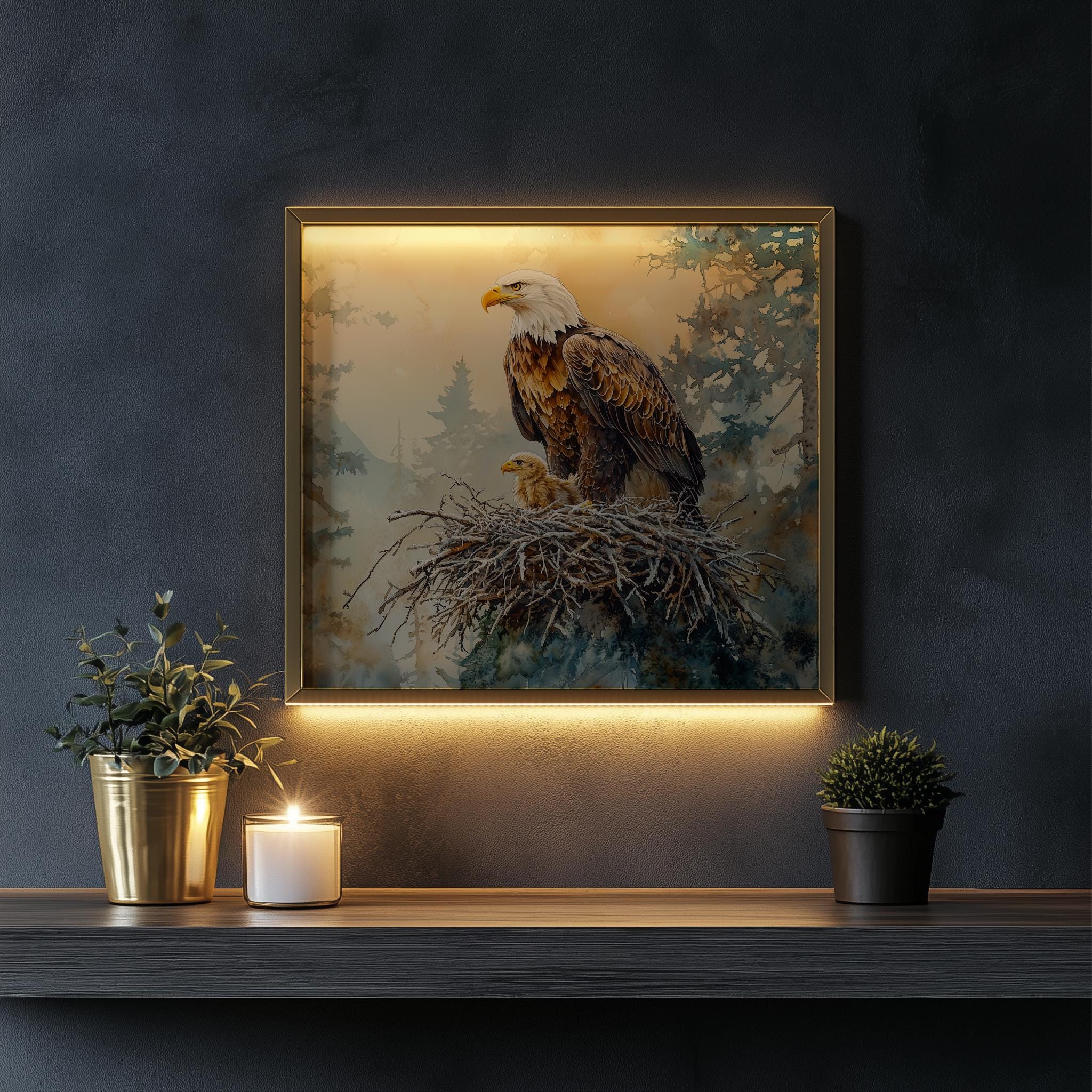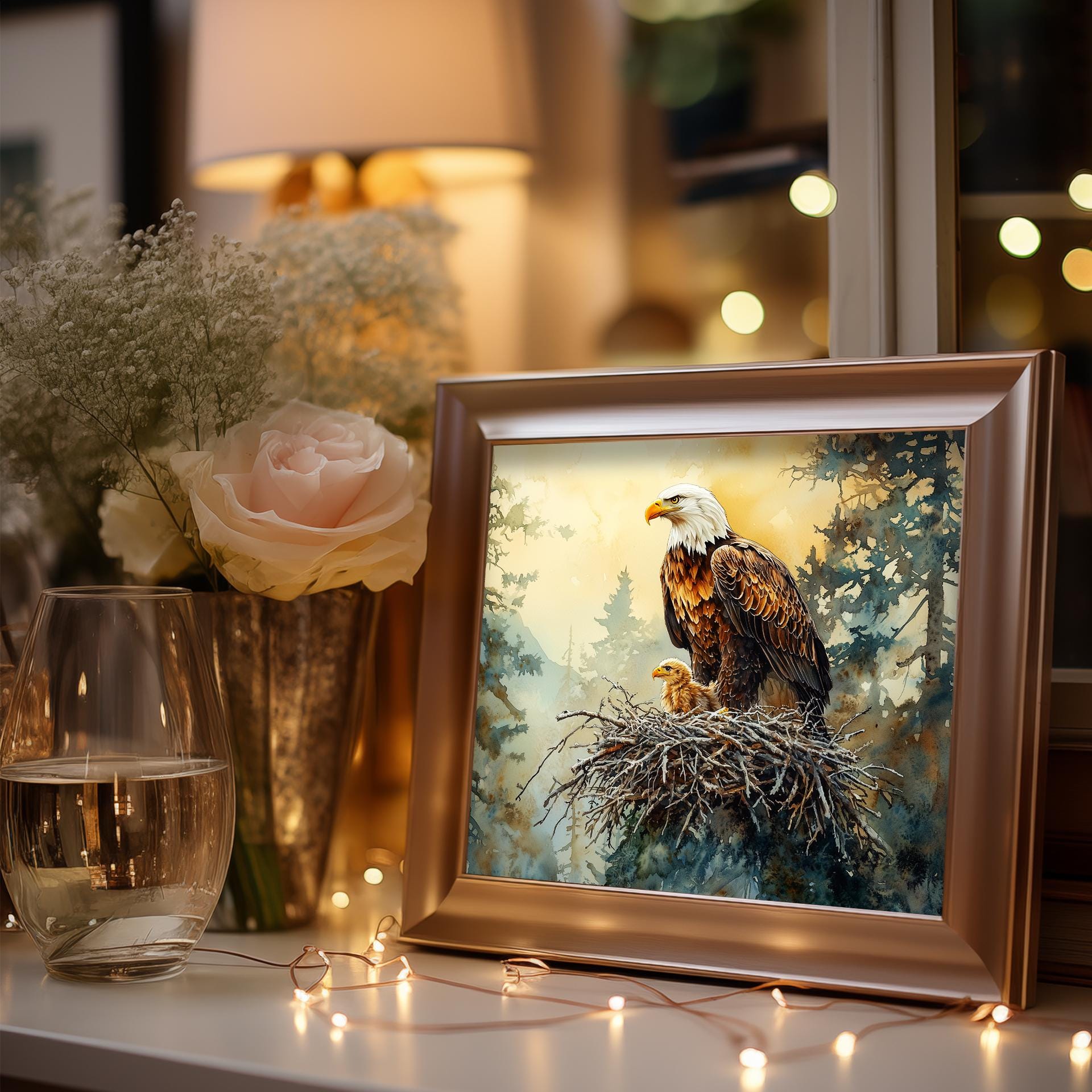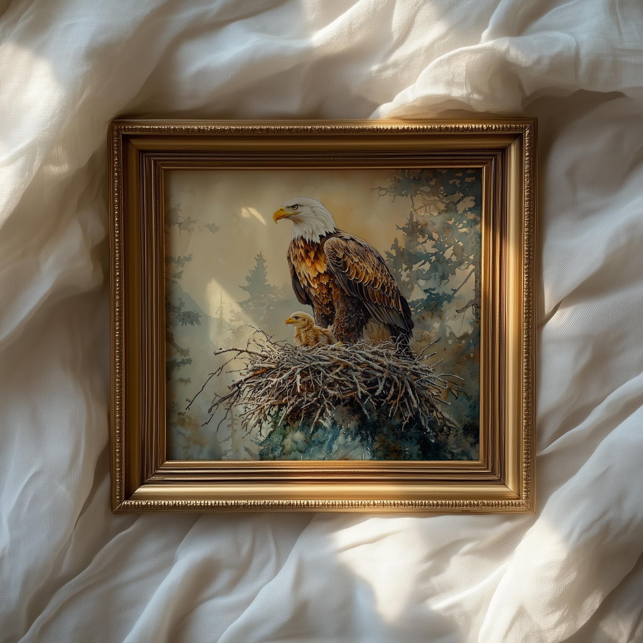 Immerse yourself in the charm with this rustic painting of a majestic bald eagle and its eaglet soaring above a serene forest landscape. An instantly downloadable print, it's perfect for elevating your decor with budget-friendly charm. This gives you the flexibility to customize the size, frame, and material according to your personal taste and space, ensuring a perfect fit for your walls.