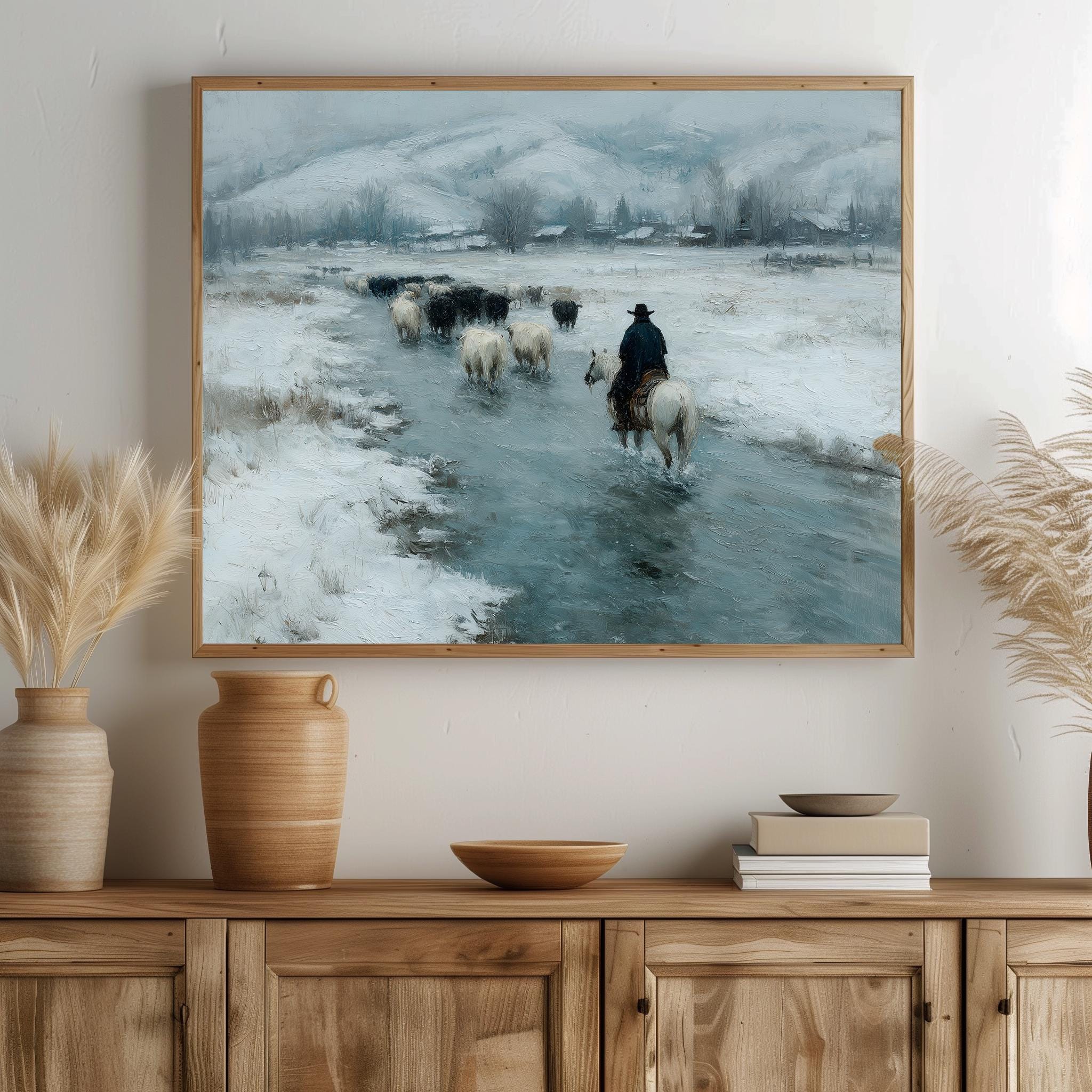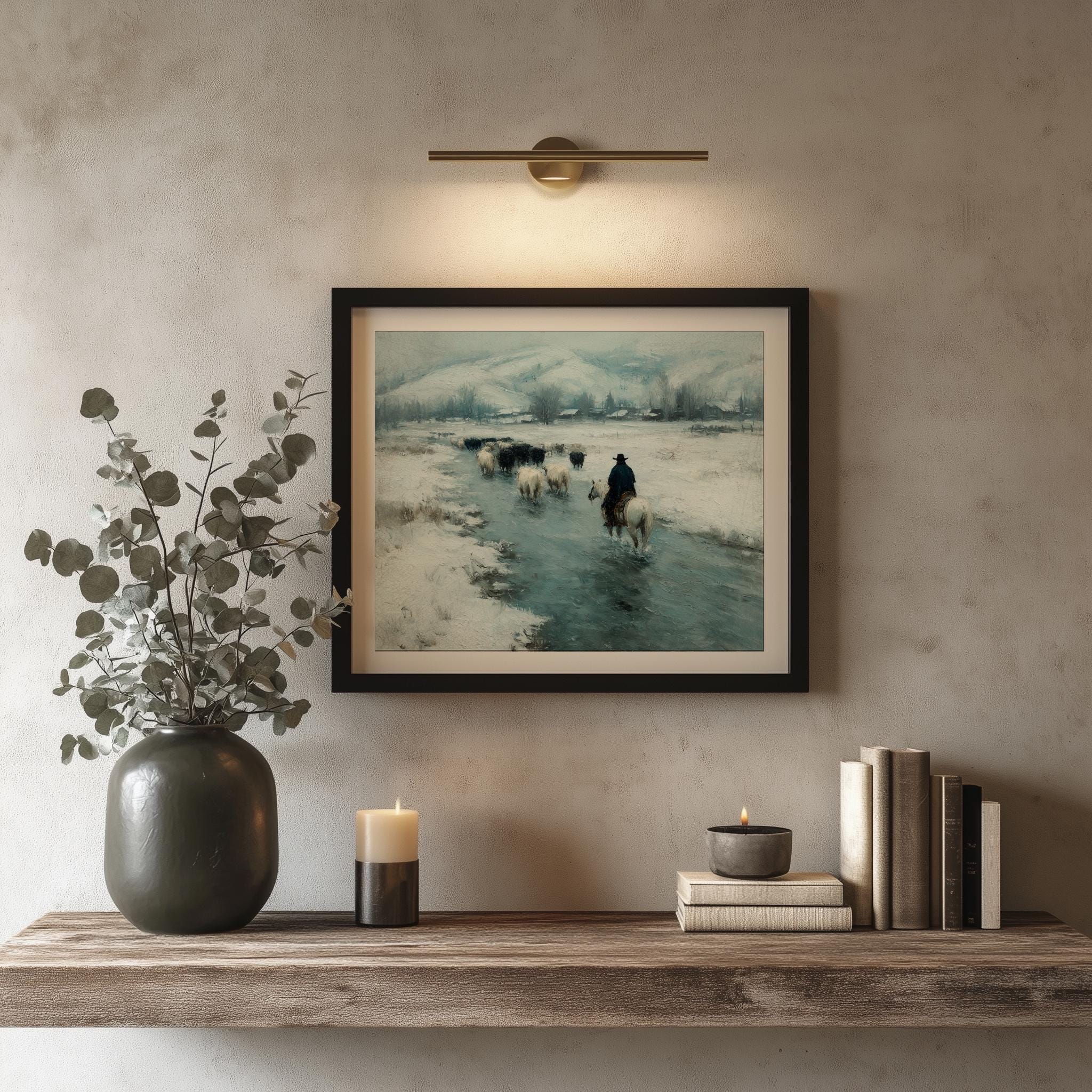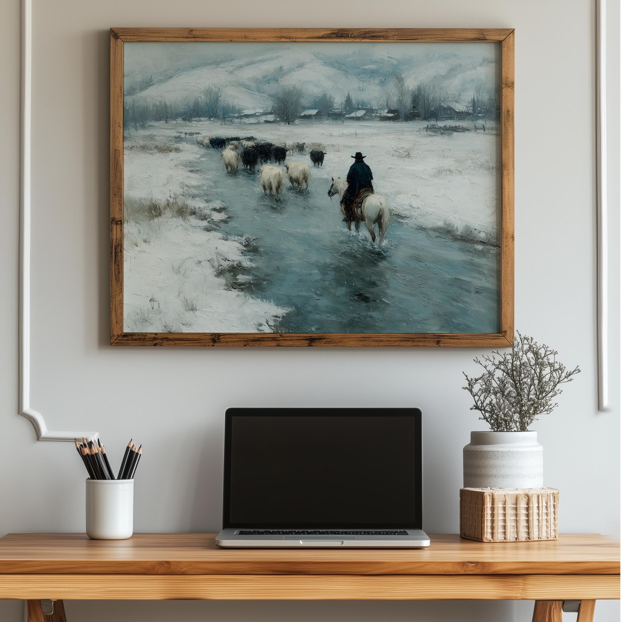 Immerse yourself in the charm with this rustic painting of a cowboy herding cattle along an icy stream. An instantly downloadable print, it's perfect for elevating your decor with budget-friendly charm. This gives you the flexibility to customize the size, frame, and material according to your personal taste and space, ensuring a perfect fit for your walls.