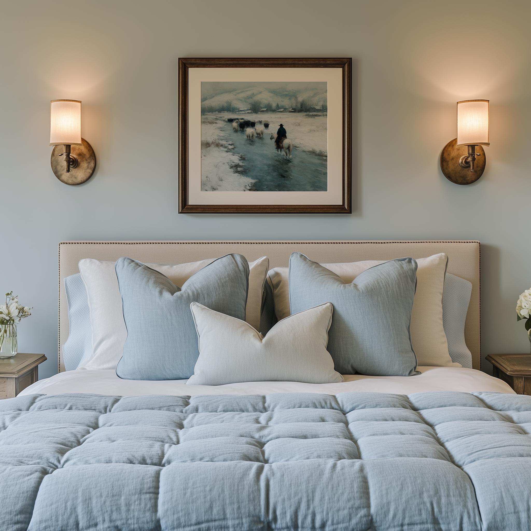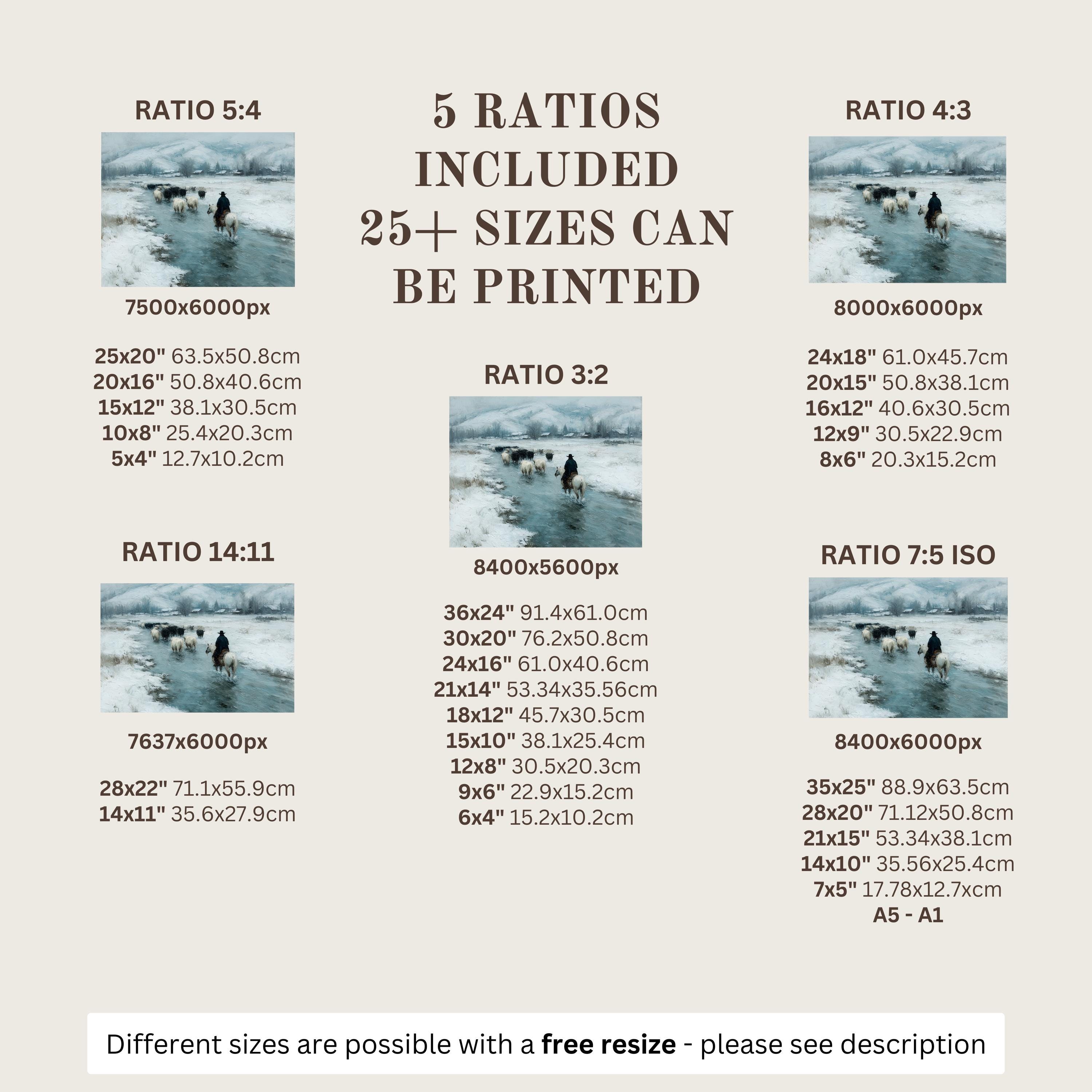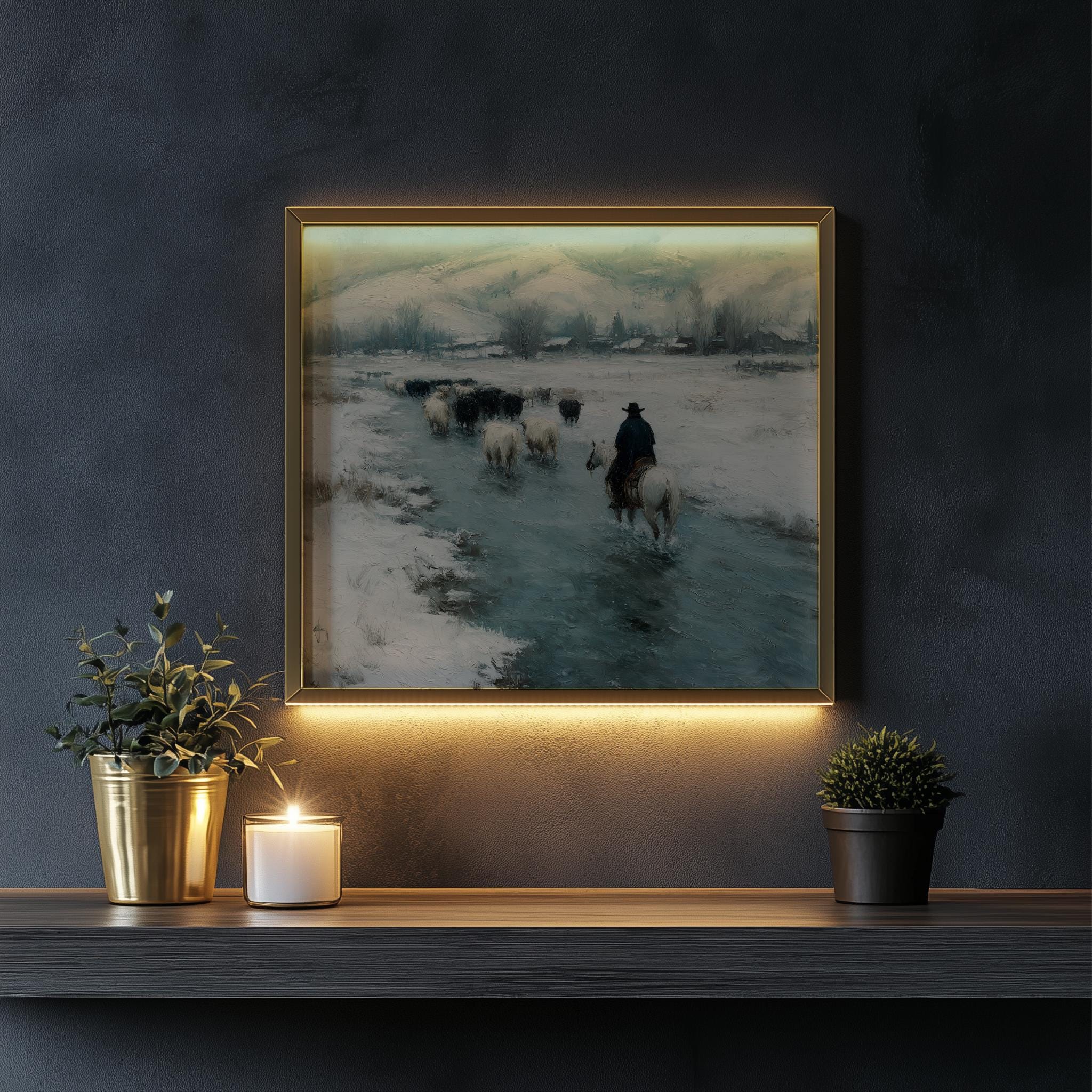 Immerse yourself in the charm with this rustic painting of a cowboy herding cattle along an icy stream. An instantly downloadable print, it's perfect for elevating your decor with budget-friendly charm. This gives you the flexibility to customize the size, frame, and material according to your personal taste and space, ensuring a perfect fit for your walls.
