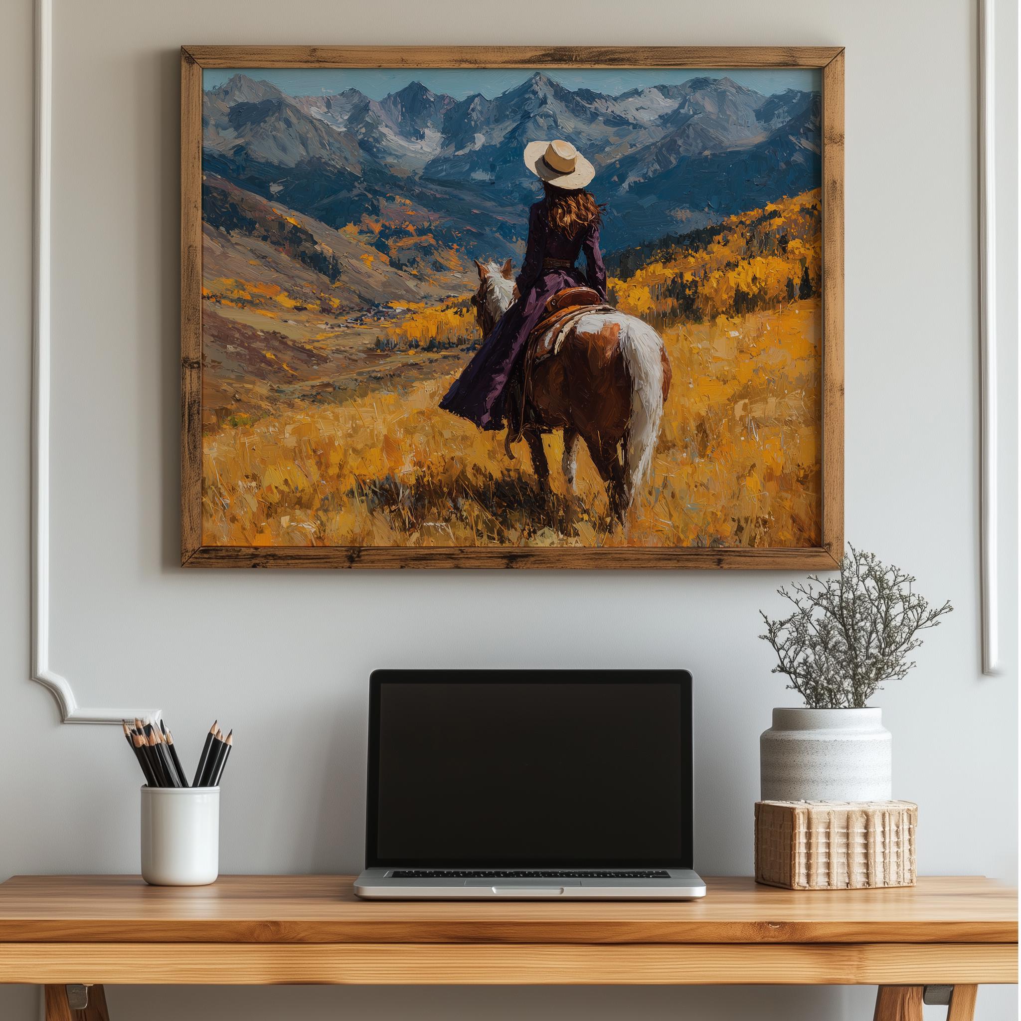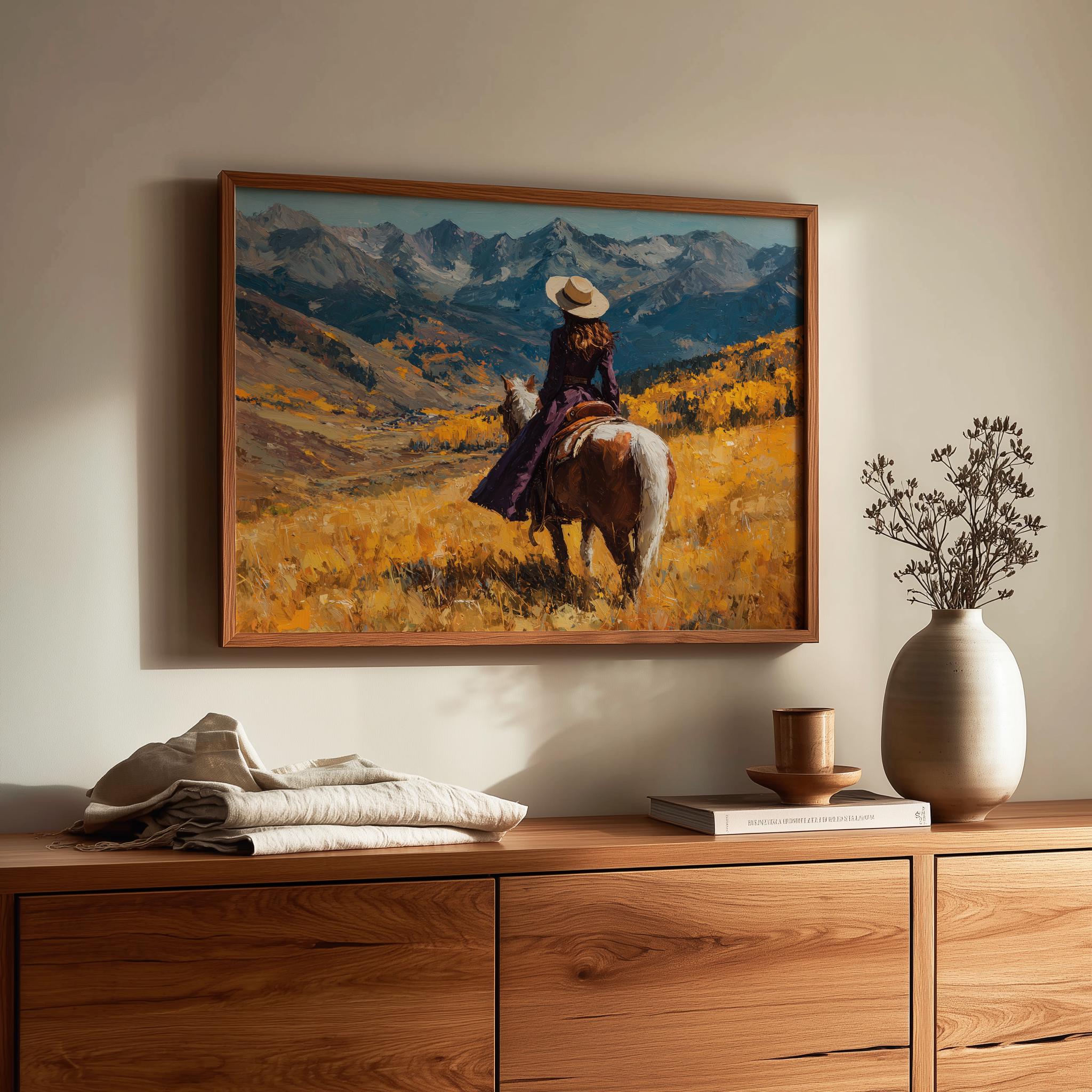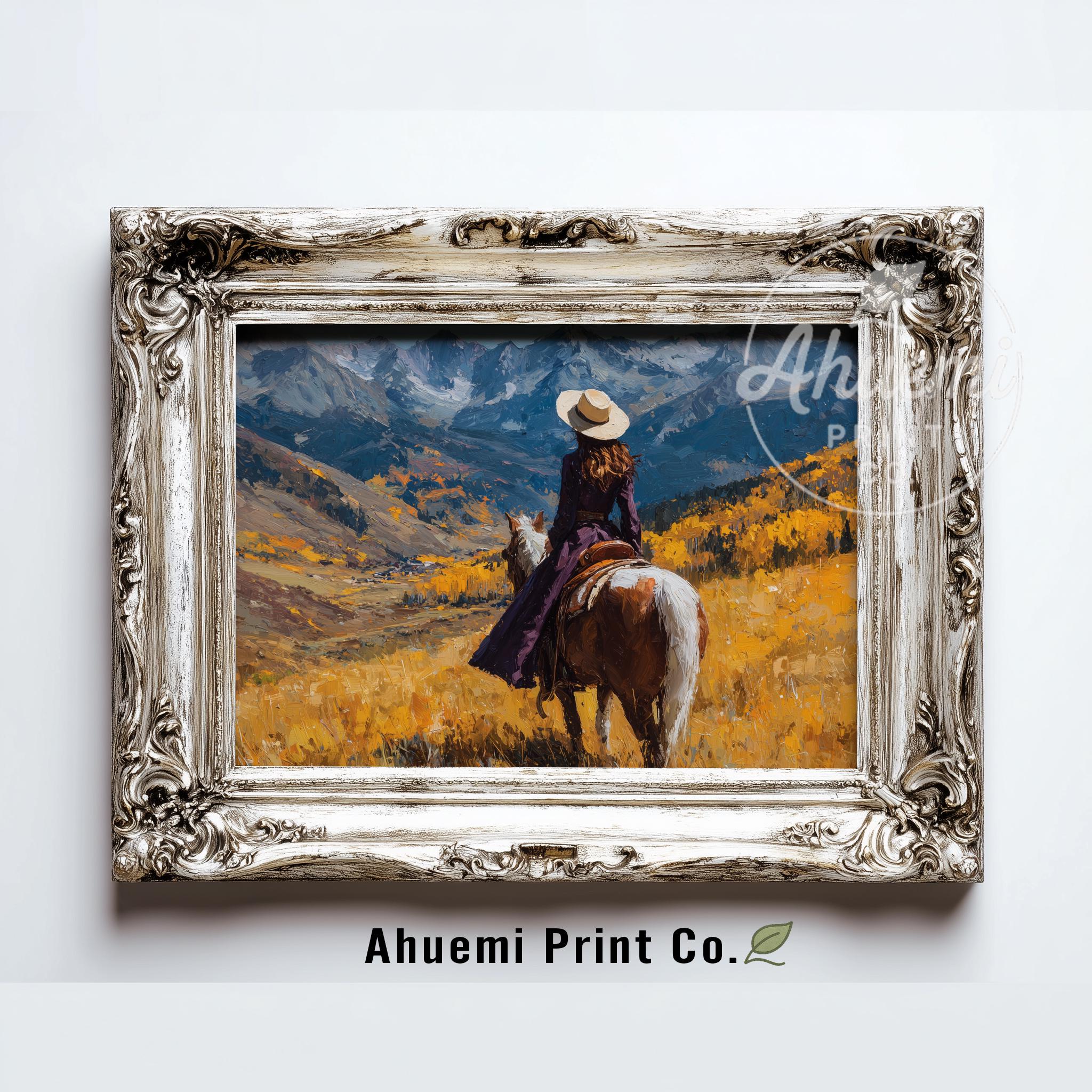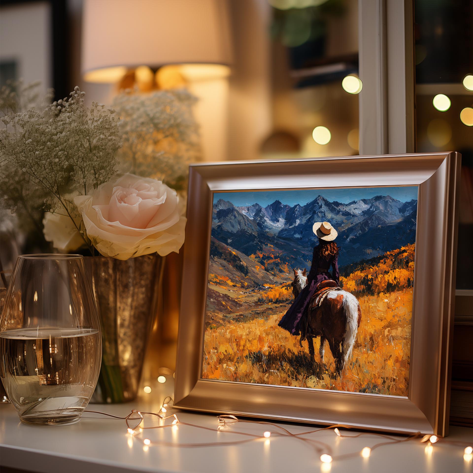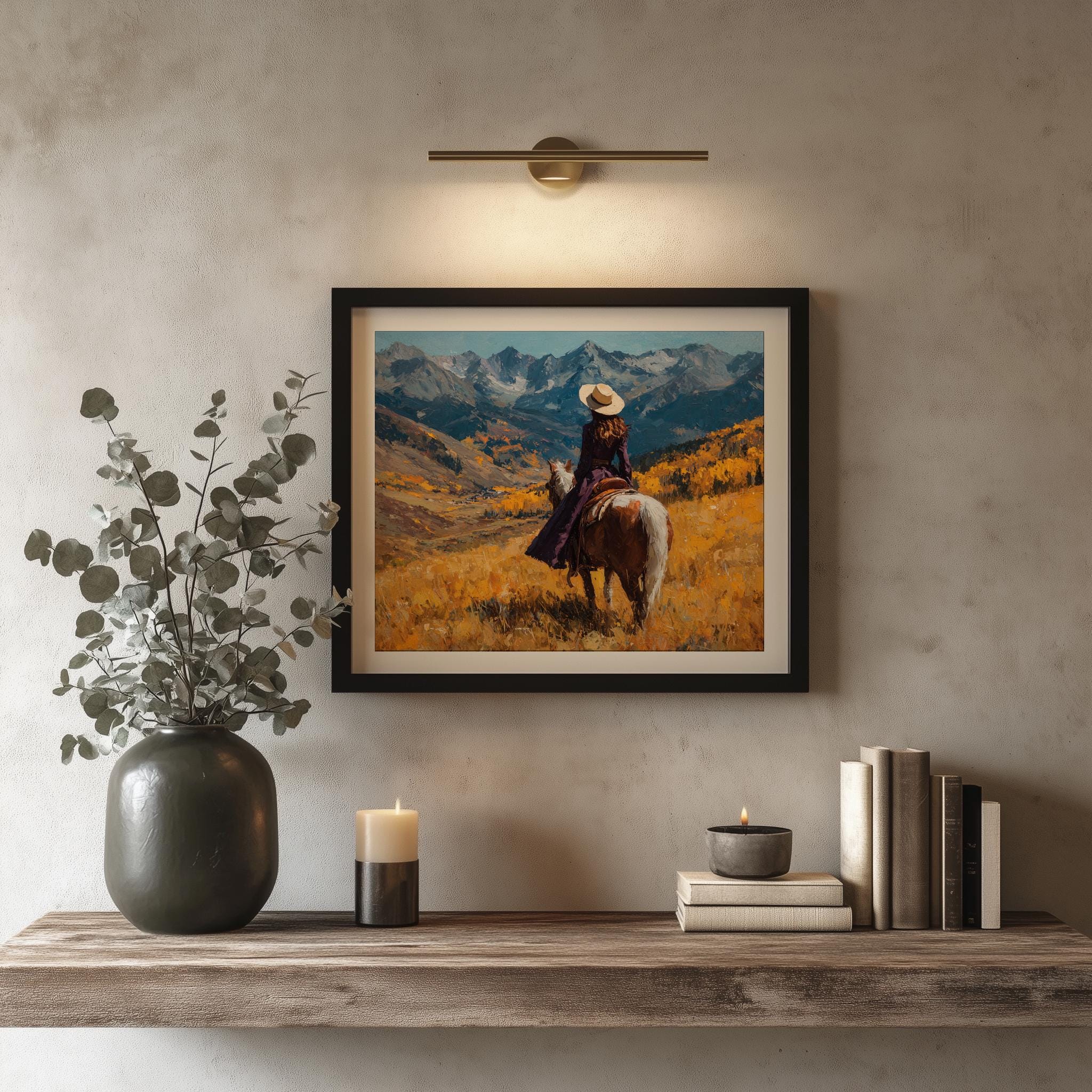 Immerse yourself in the charm with this rustic painting of a lone cowboy traversing an autumn mountain pass. An instantly downloadable print, it's perfect for elevating your decor with budget-friendly charm. This gives you the flexibility to customize the size, frame, and material according to your personal taste and space, ensuring a perfect fit for your walls.