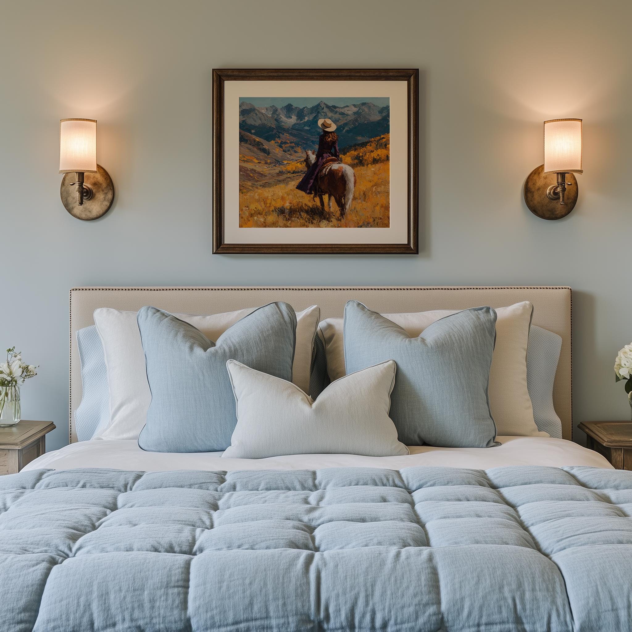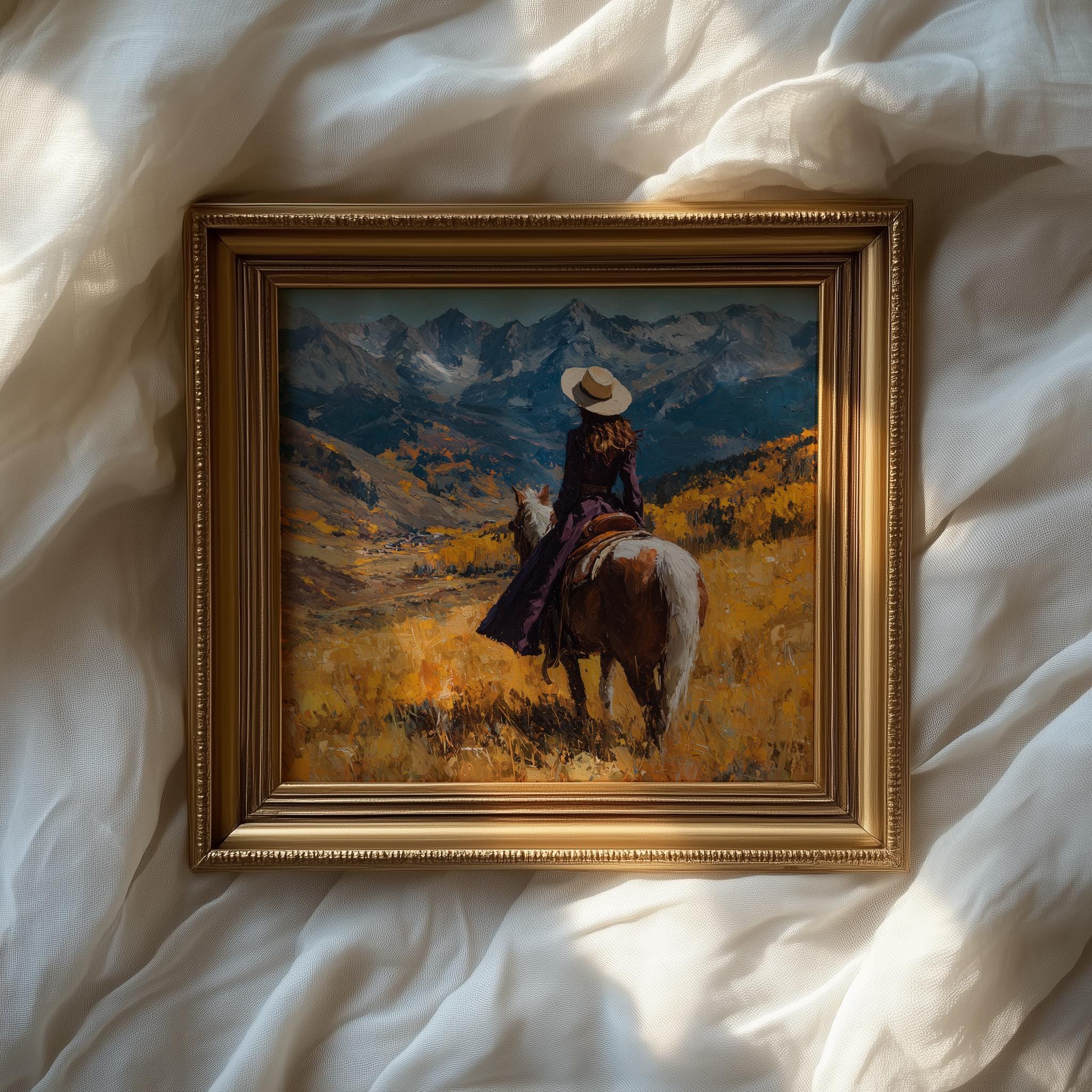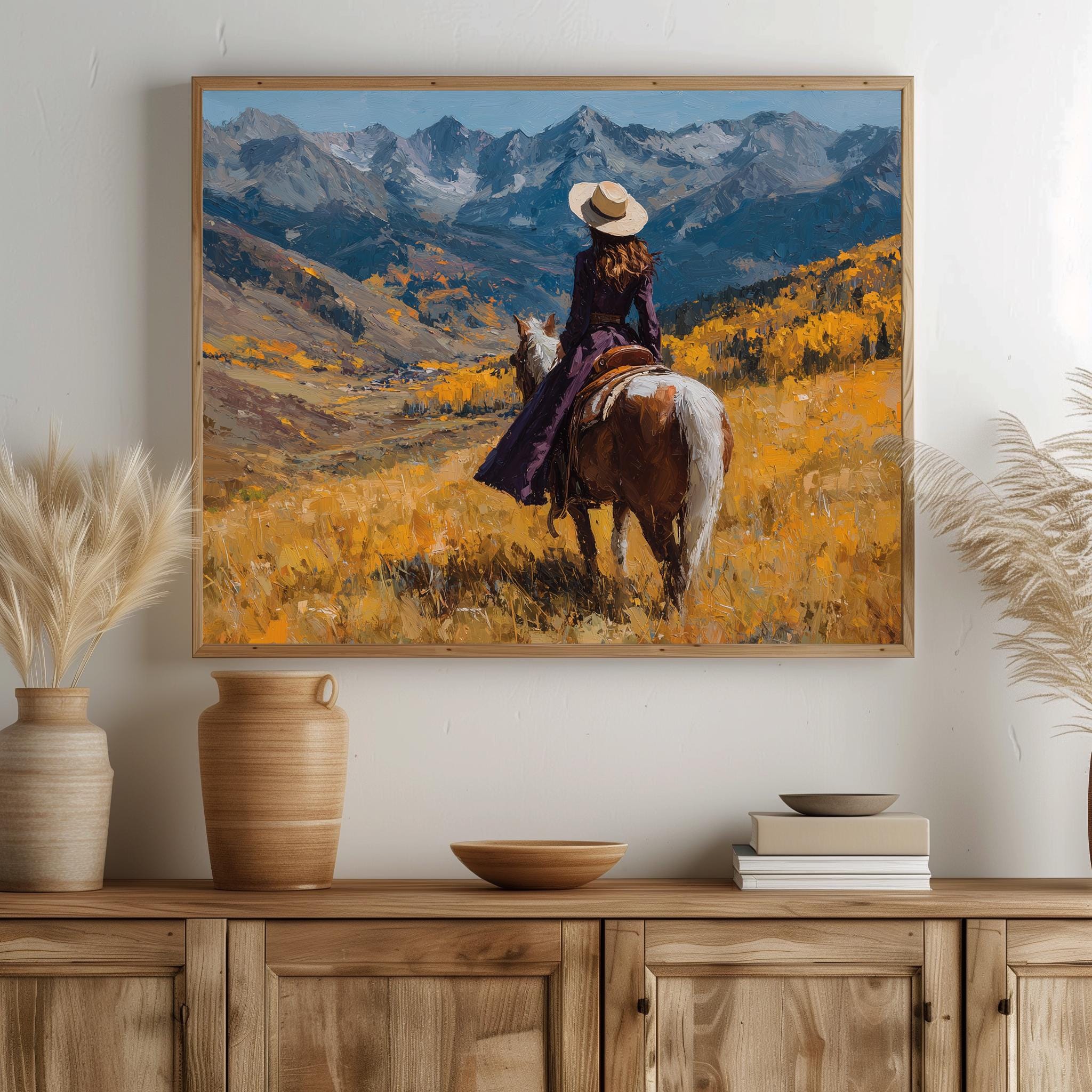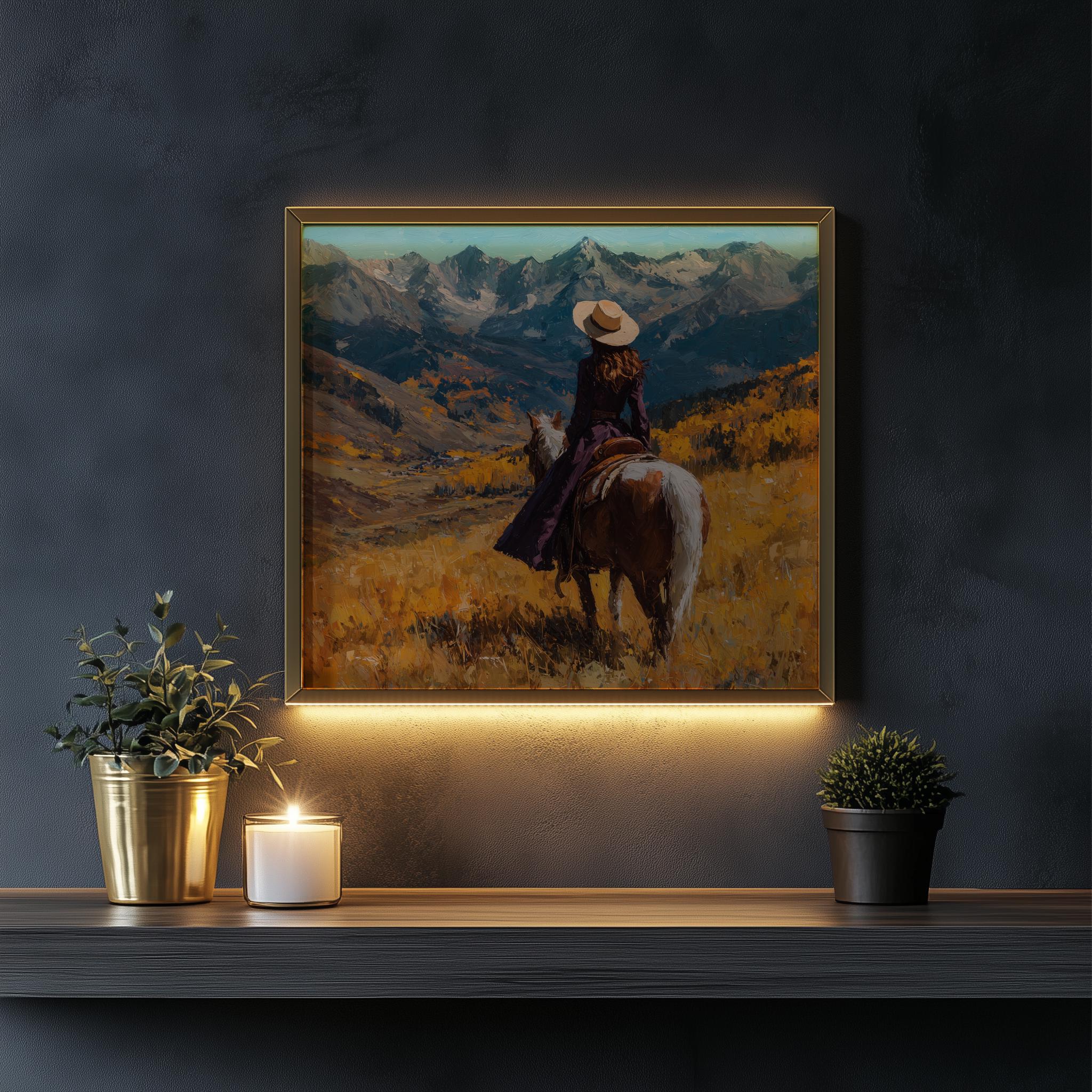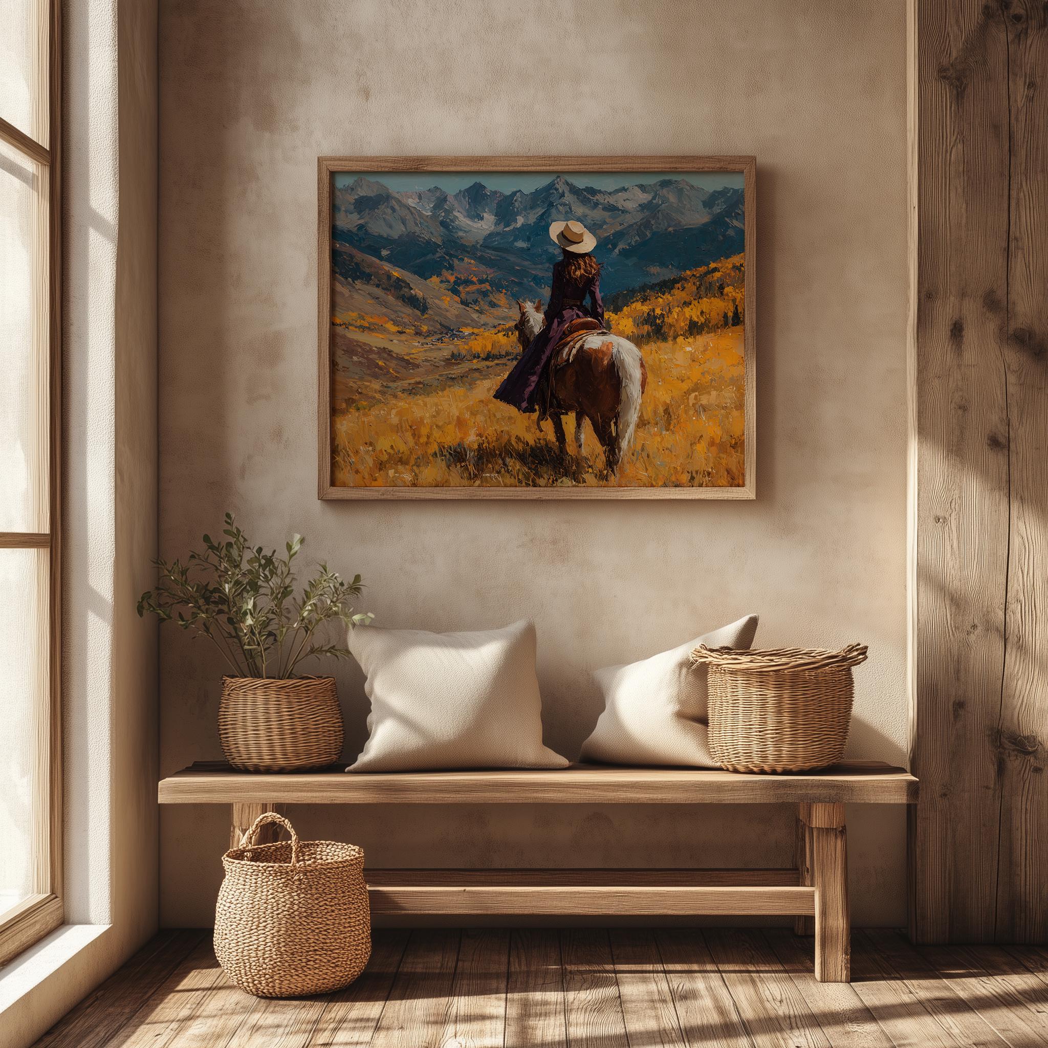 Immerse yourself in the charm with this rustic painting of a lone cowboy traversing an autumn mountain pass. An instantly downloadable print, it's perfect for elevating your decor with budget-friendly charm. This gives you the flexibility to customize the size, frame, and material according to your personal taste and space, ensuring a perfect fit for your walls.