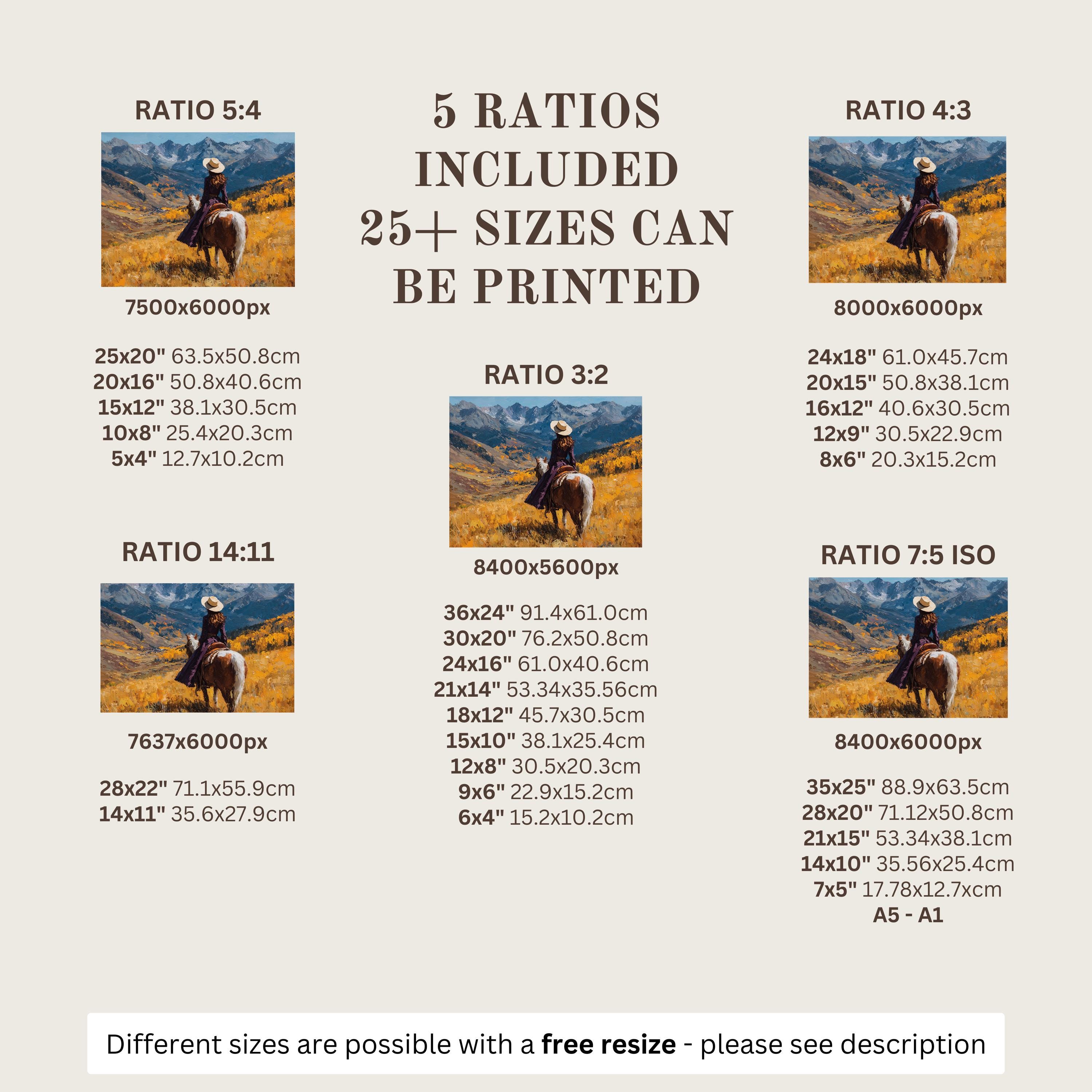 Each artwork includes 5 aspect ratios with 25+ print sizes. Most standard frames are covered. One custom resize per purchase available—message before ordering.