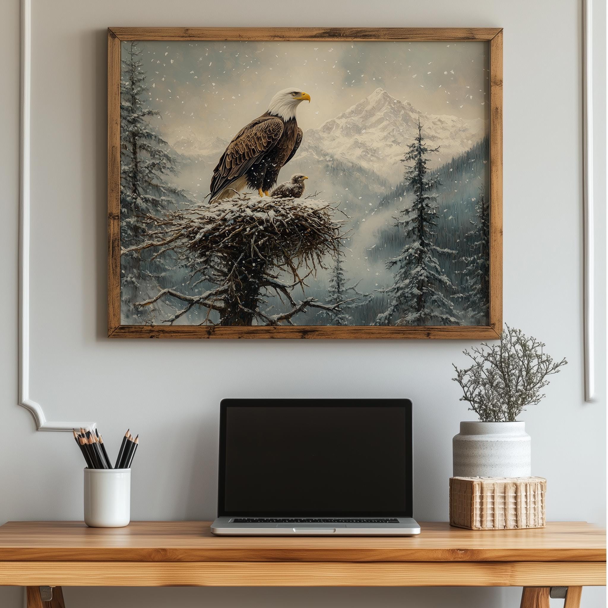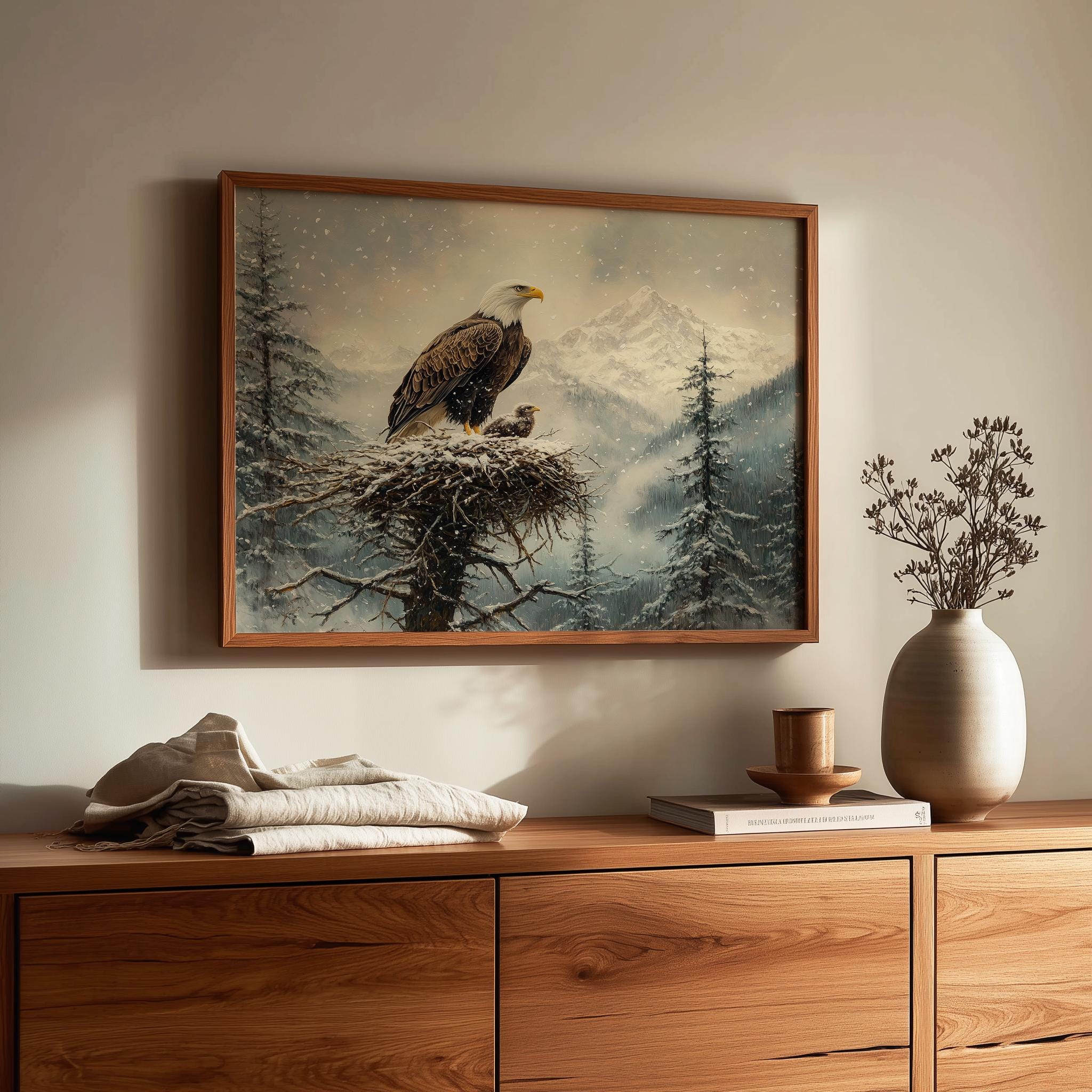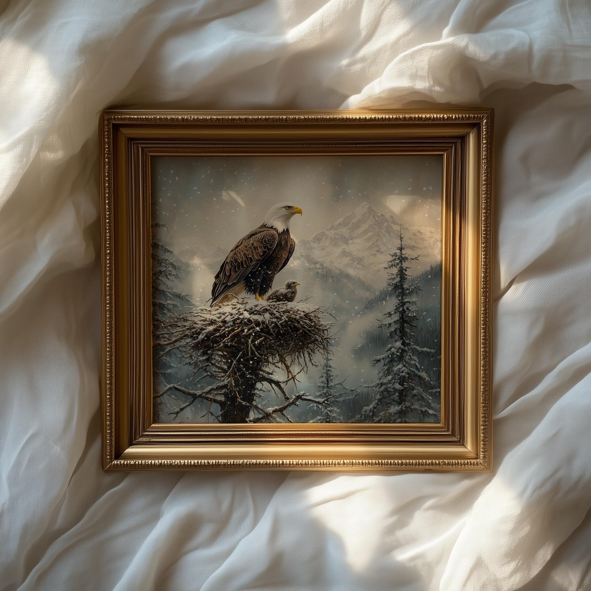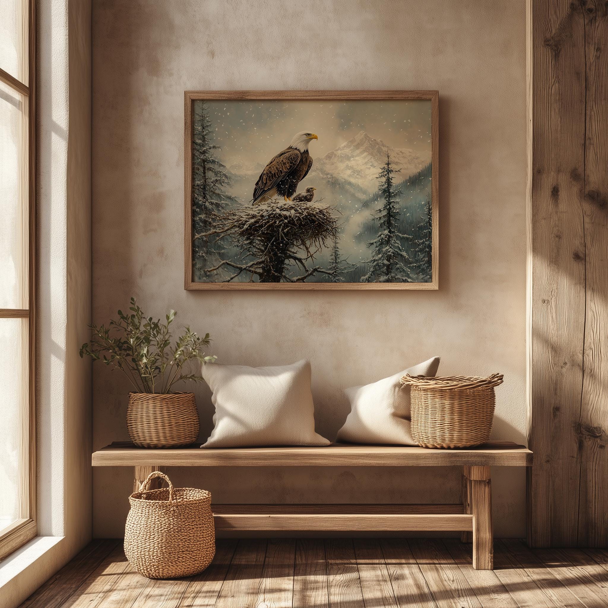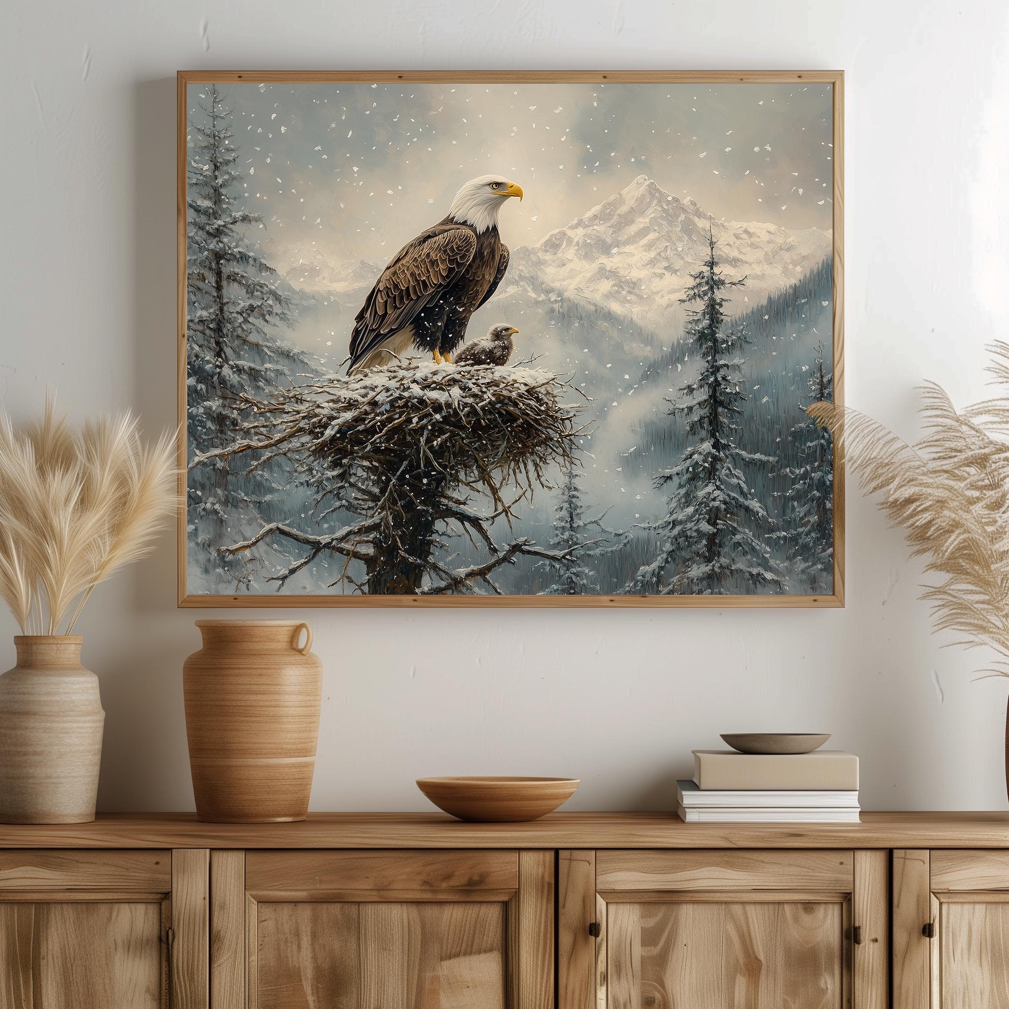 Immerse yourself in the charm with this rustic painting of a majestic bald eagle nestled in a snowy nest. An instantly downloadable print, it's perfect for elevating your decor with budget-friendly charm. This gives you the flexibility to customize the size, frame, and material according to your personal taste and space, ensuring a perfect fit for your walls.