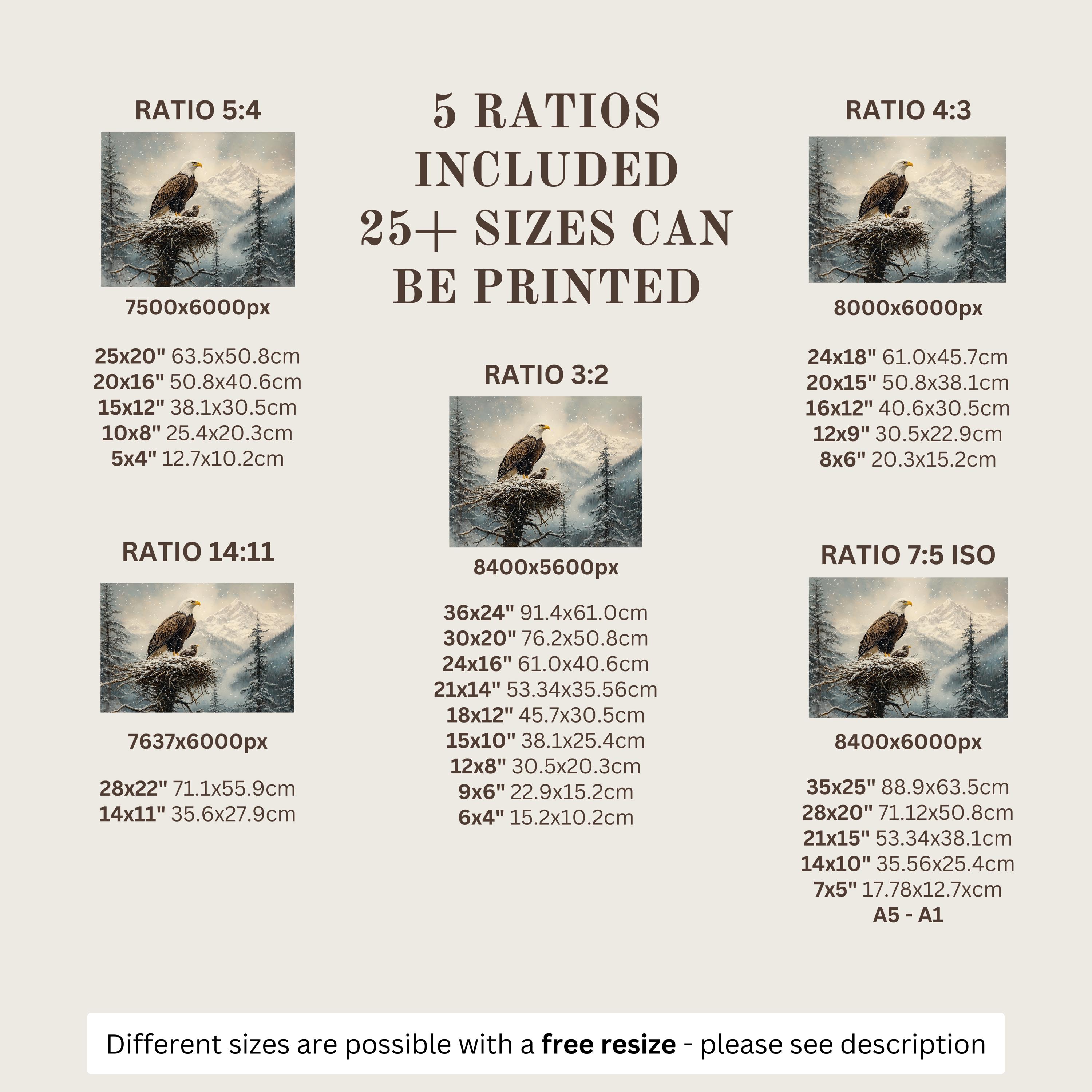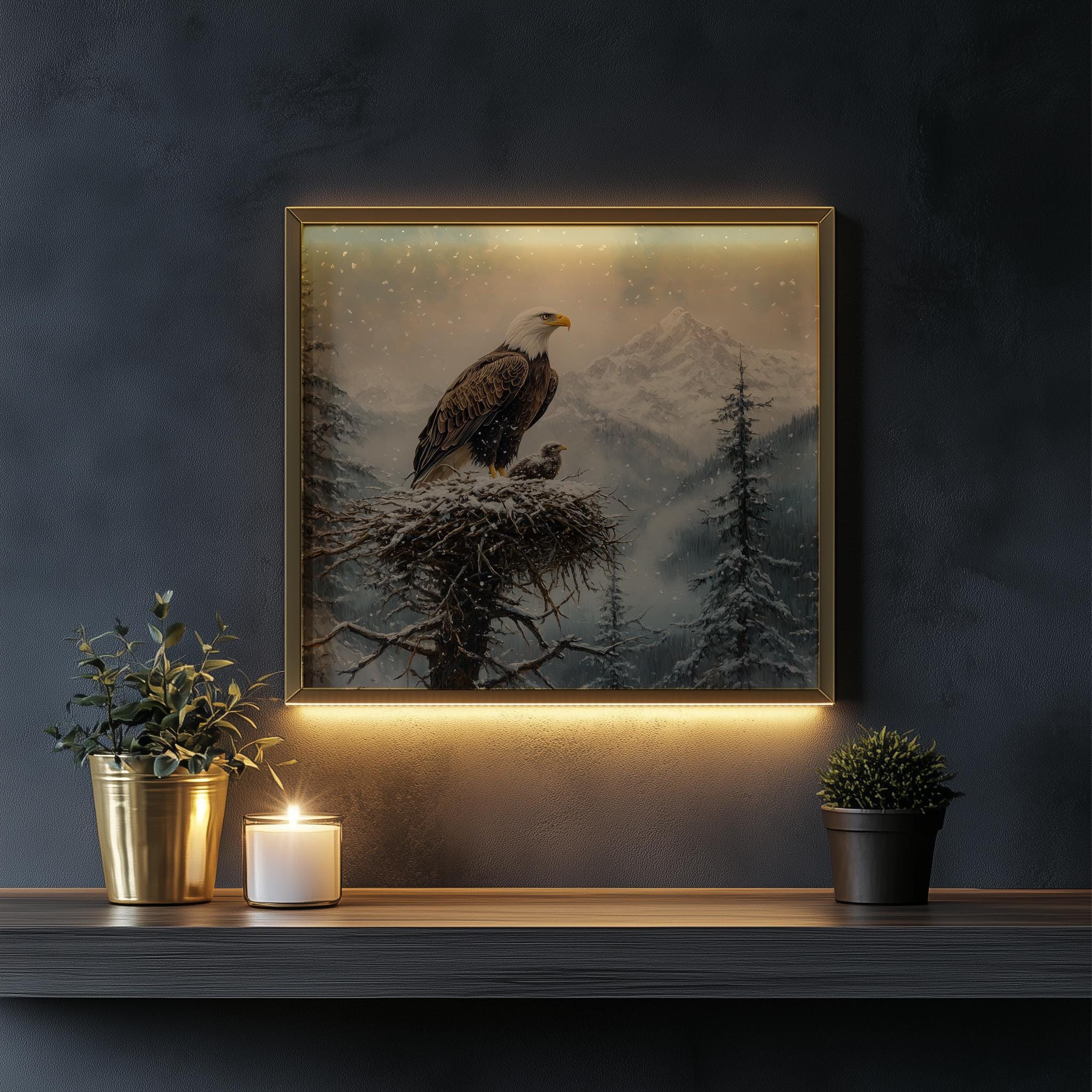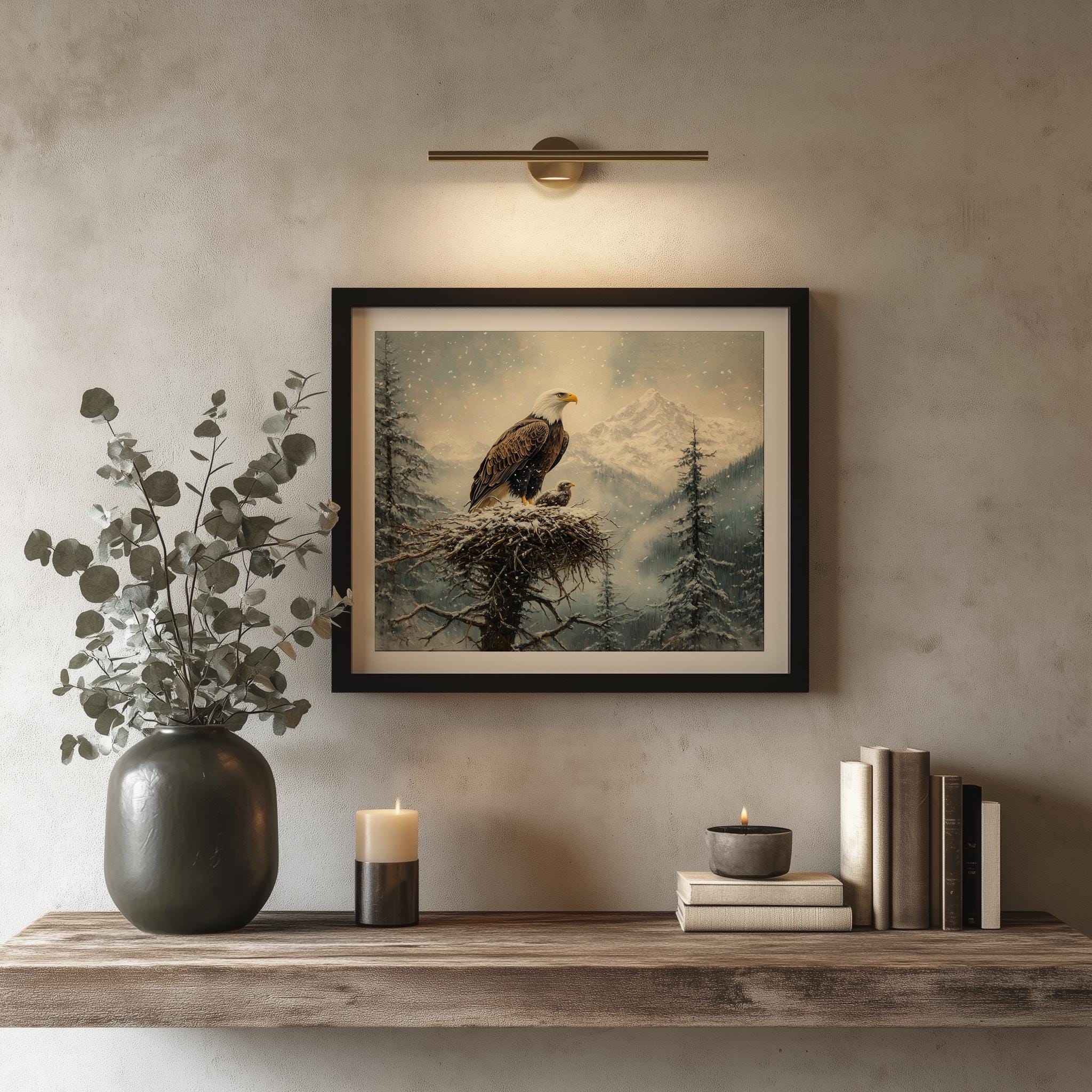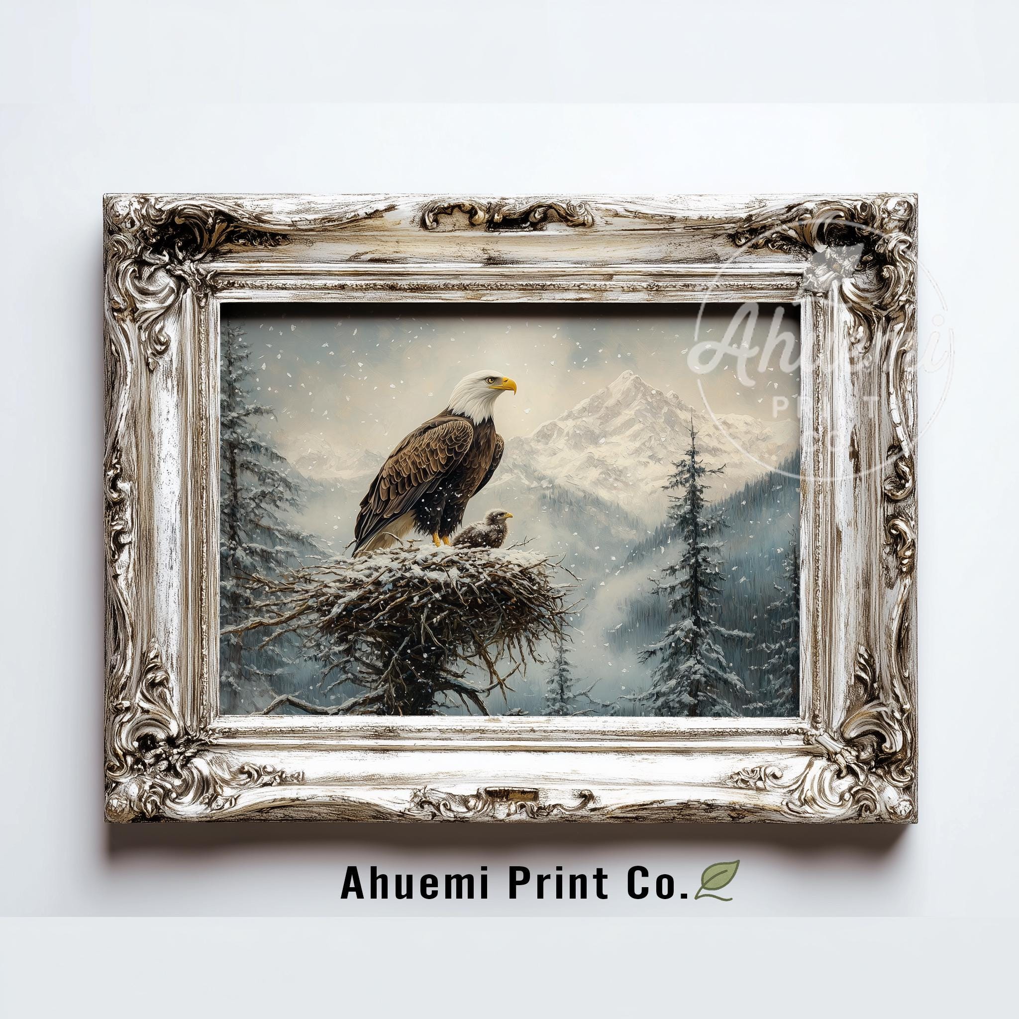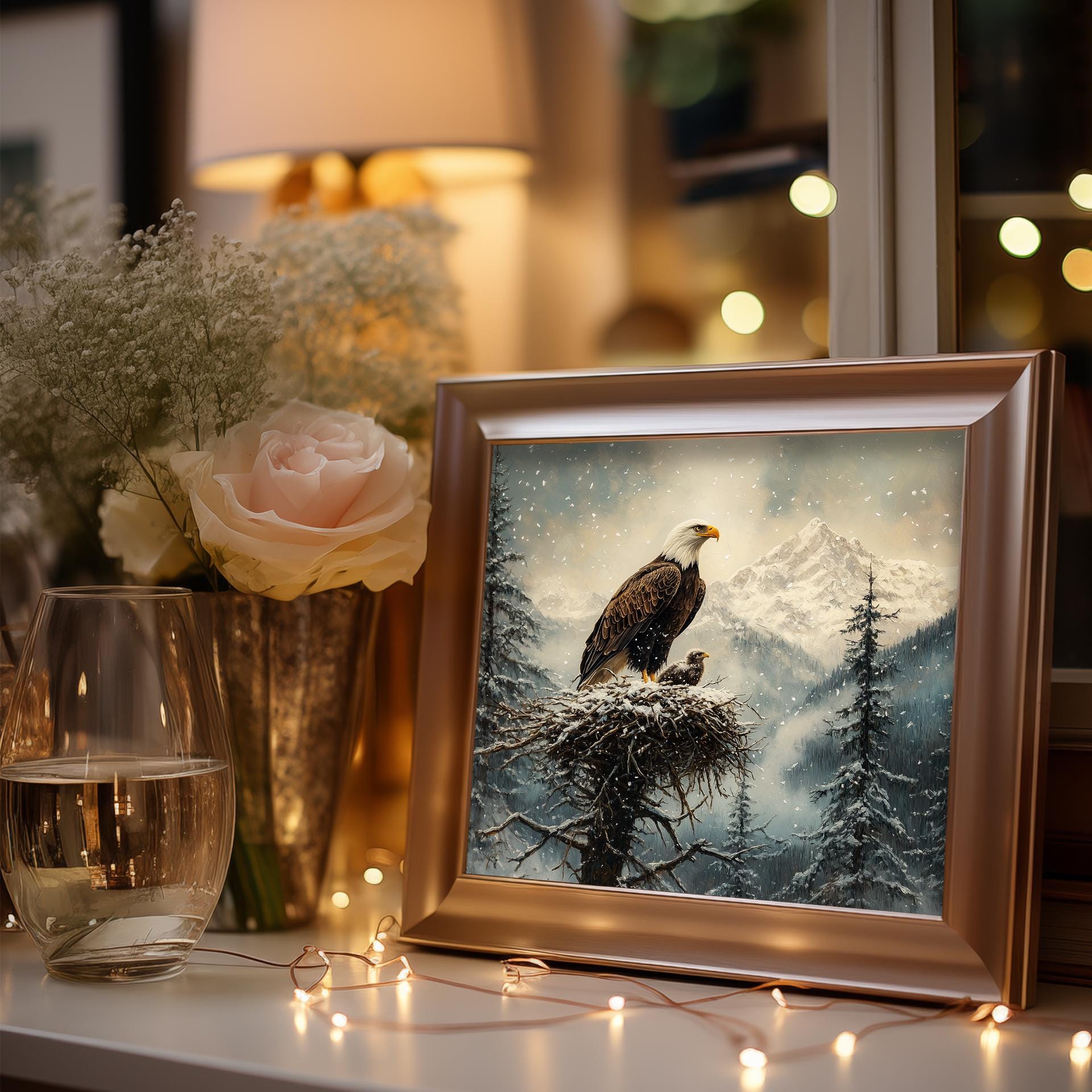 Immerse yourself in the charm with this rustic painting of a majestic bald eagle nestled in a snowy nest. An instantly downloadable print, it's perfect for elevating your decor with budget-friendly charm. This gives you the flexibility to customize the size, frame, and material according to your personal taste and space, ensuring a perfect fit for your walls.