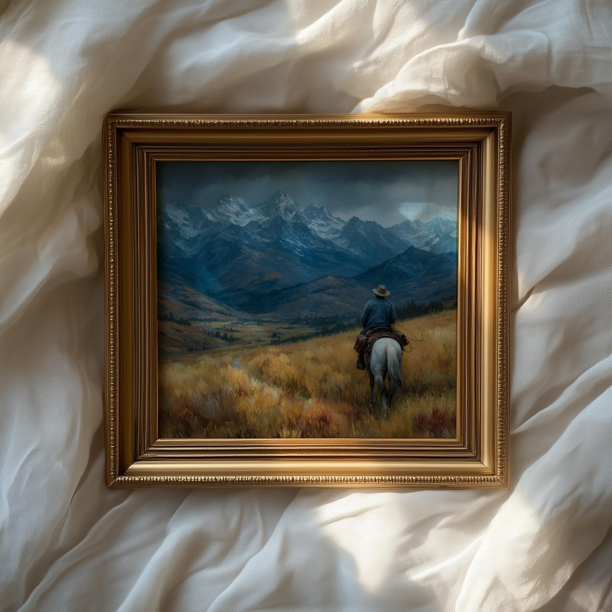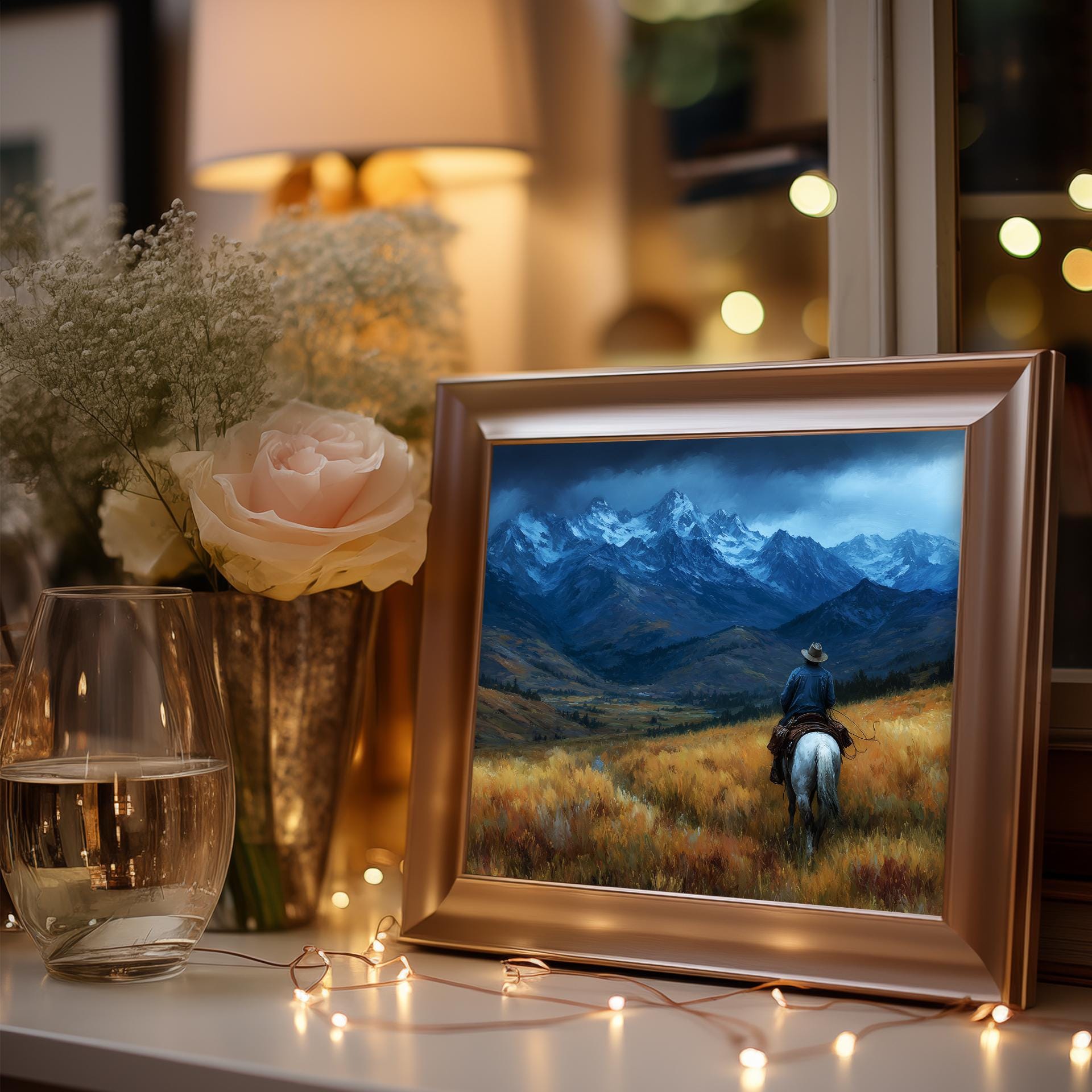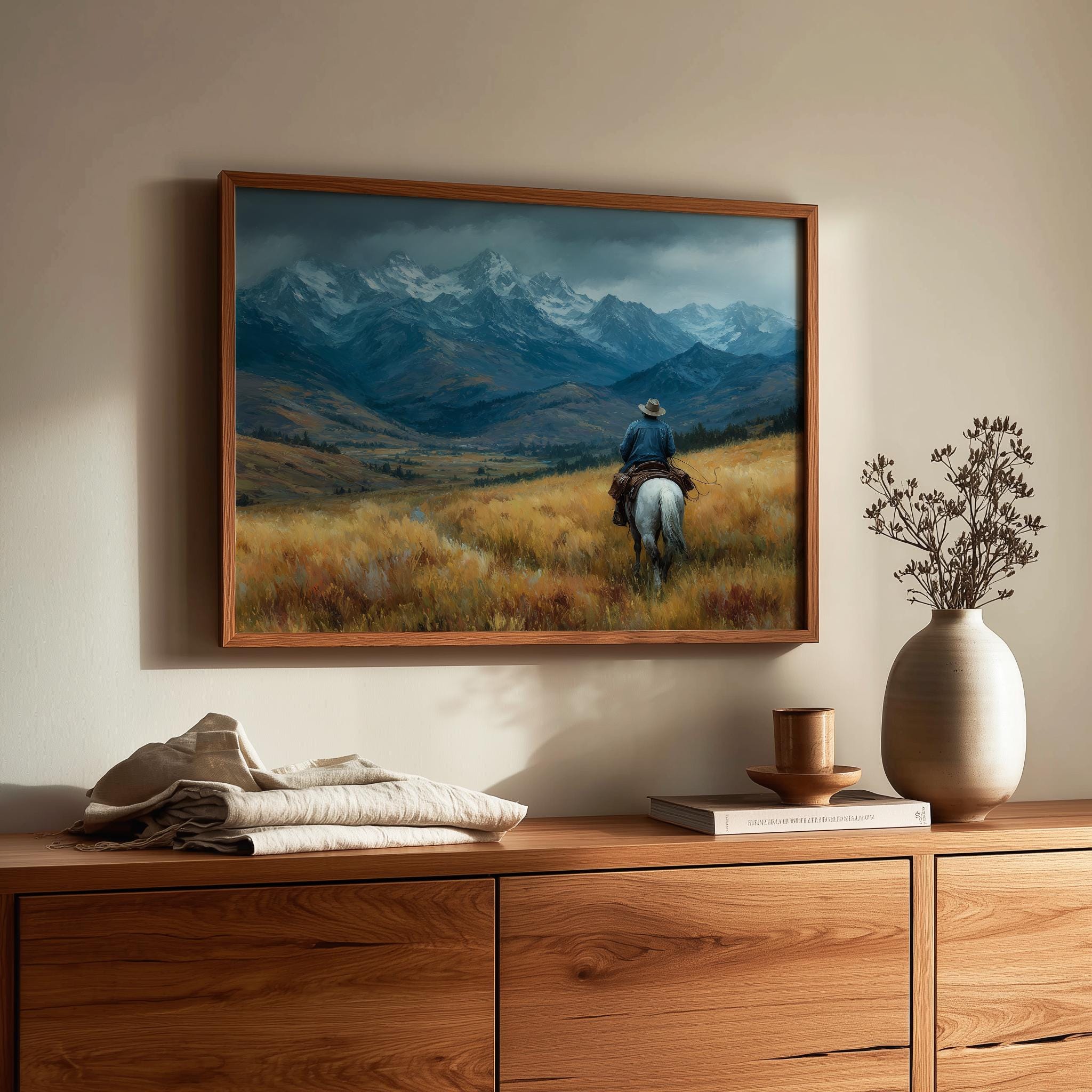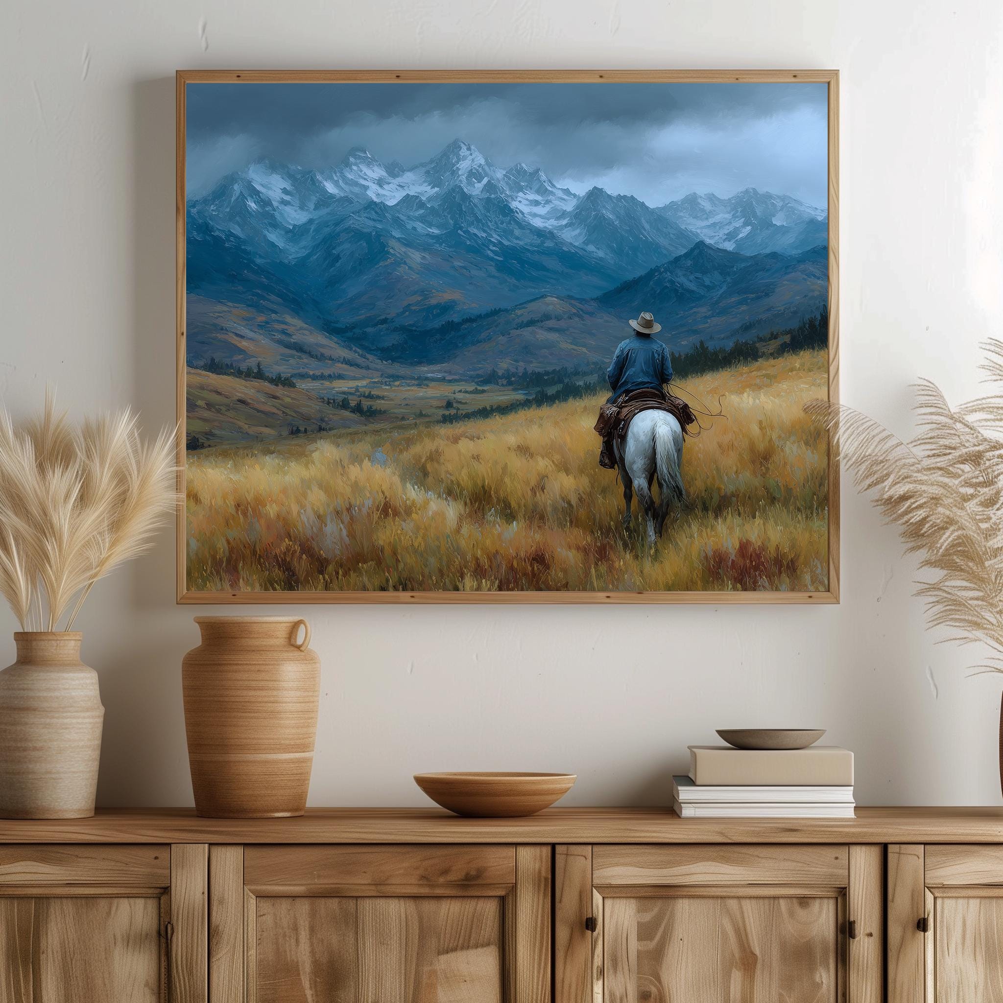 Immerse yourself in the charm with this rustic painting of a cowboy riding along a prairie trail. An instantly downloadable print, it's perfect for elevating your decor with budget-friendly charm. This gives you the flexibility to customize the size, frame, and material according to your personal taste and space, ensuring a perfect fit for your walls.