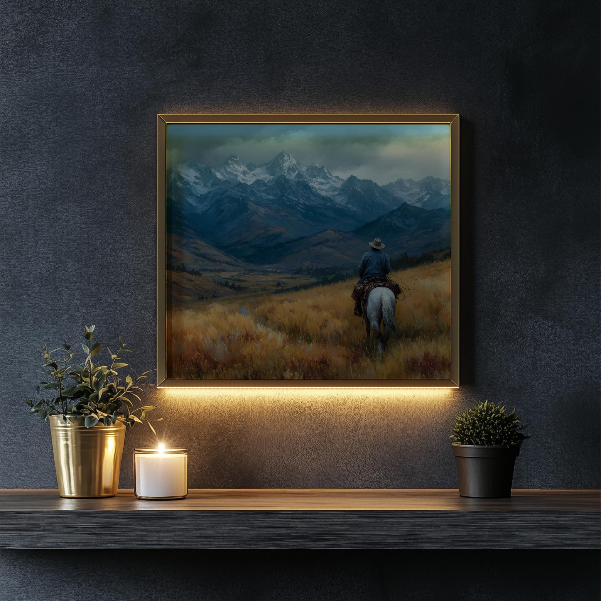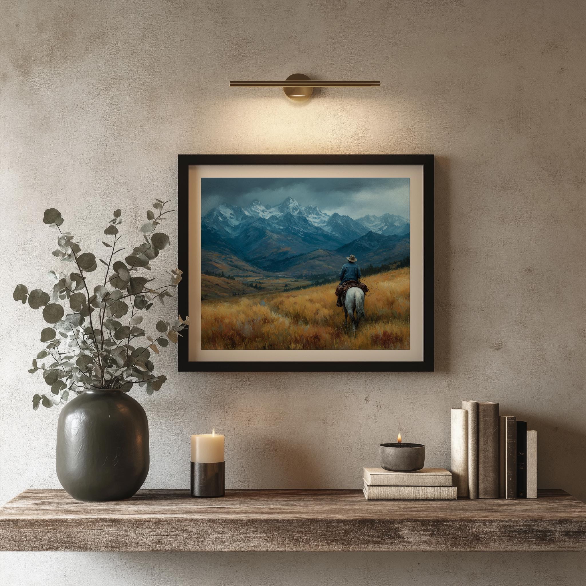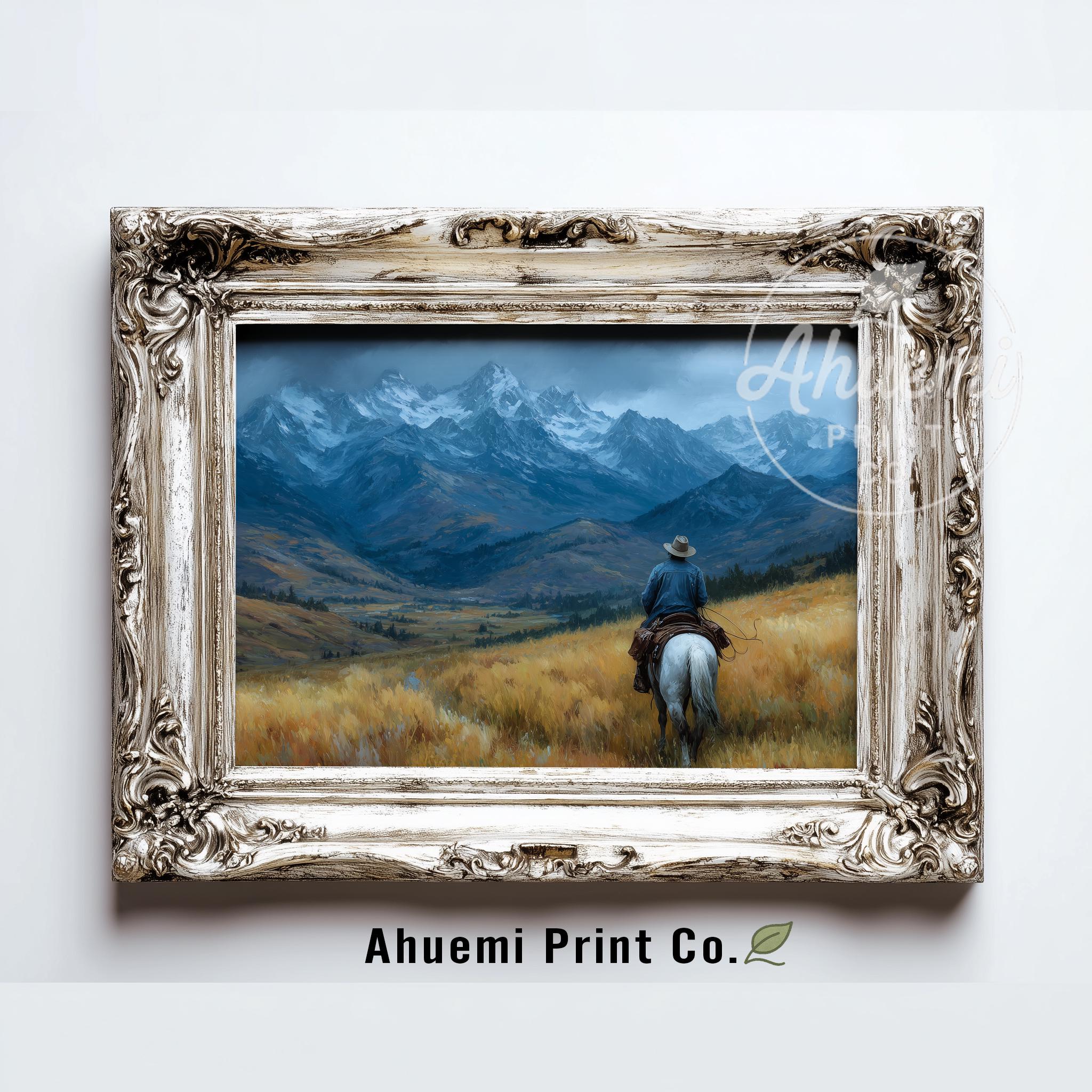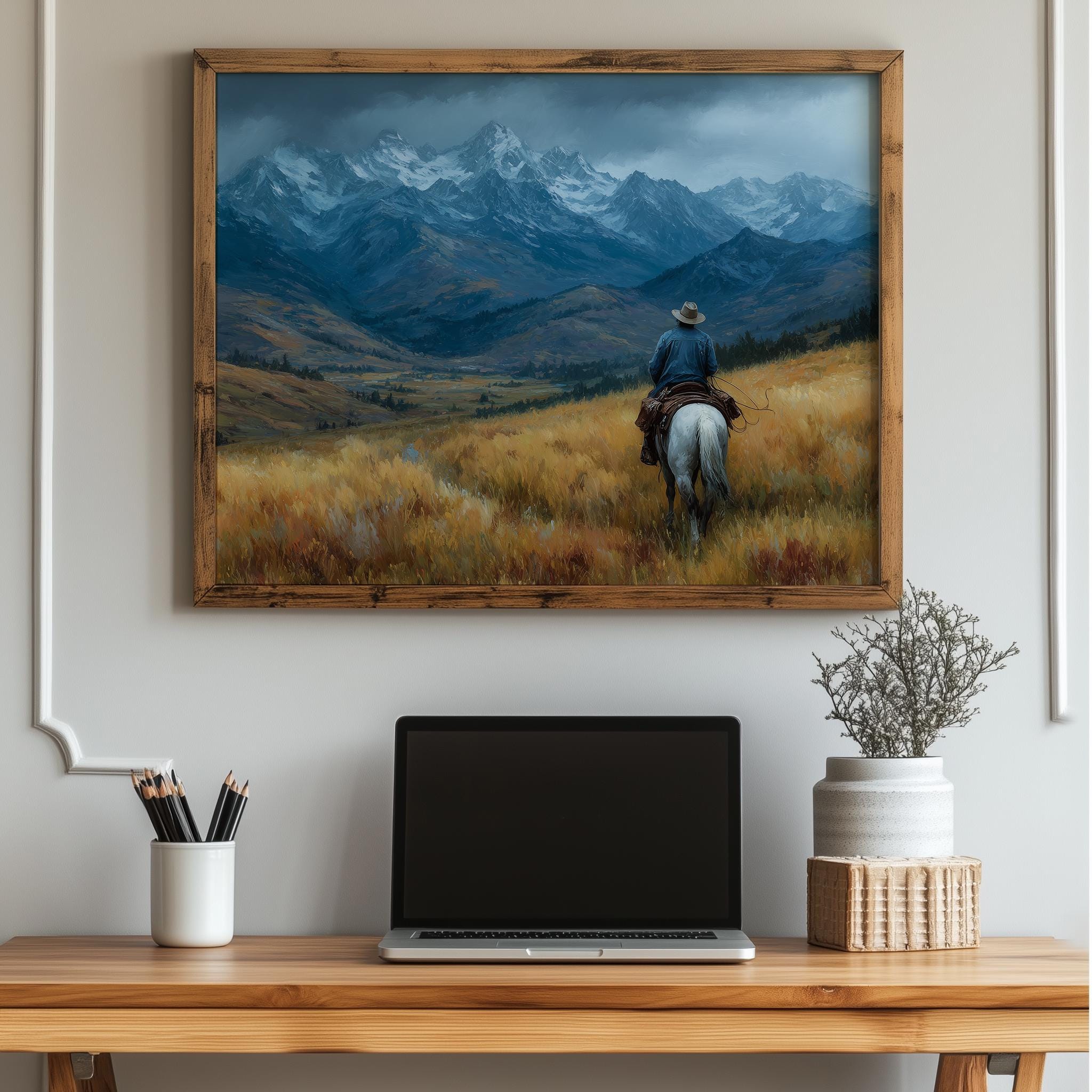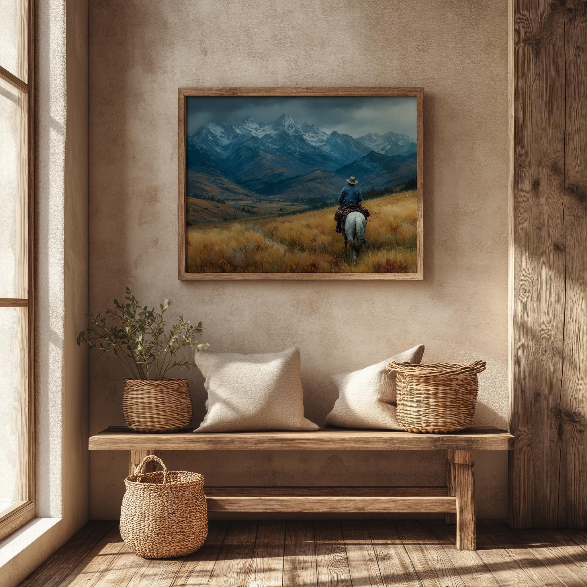 Immerse yourself in the charm with this rustic painting of a cowboy riding along a prairie trail. An instantly downloadable print, it's perfect for elevating your decor with budget-friendly charm. This gives you the flexibility to customize the size, frame, and material according to your personal taste and space, ensuring a perfect fit for your walls.