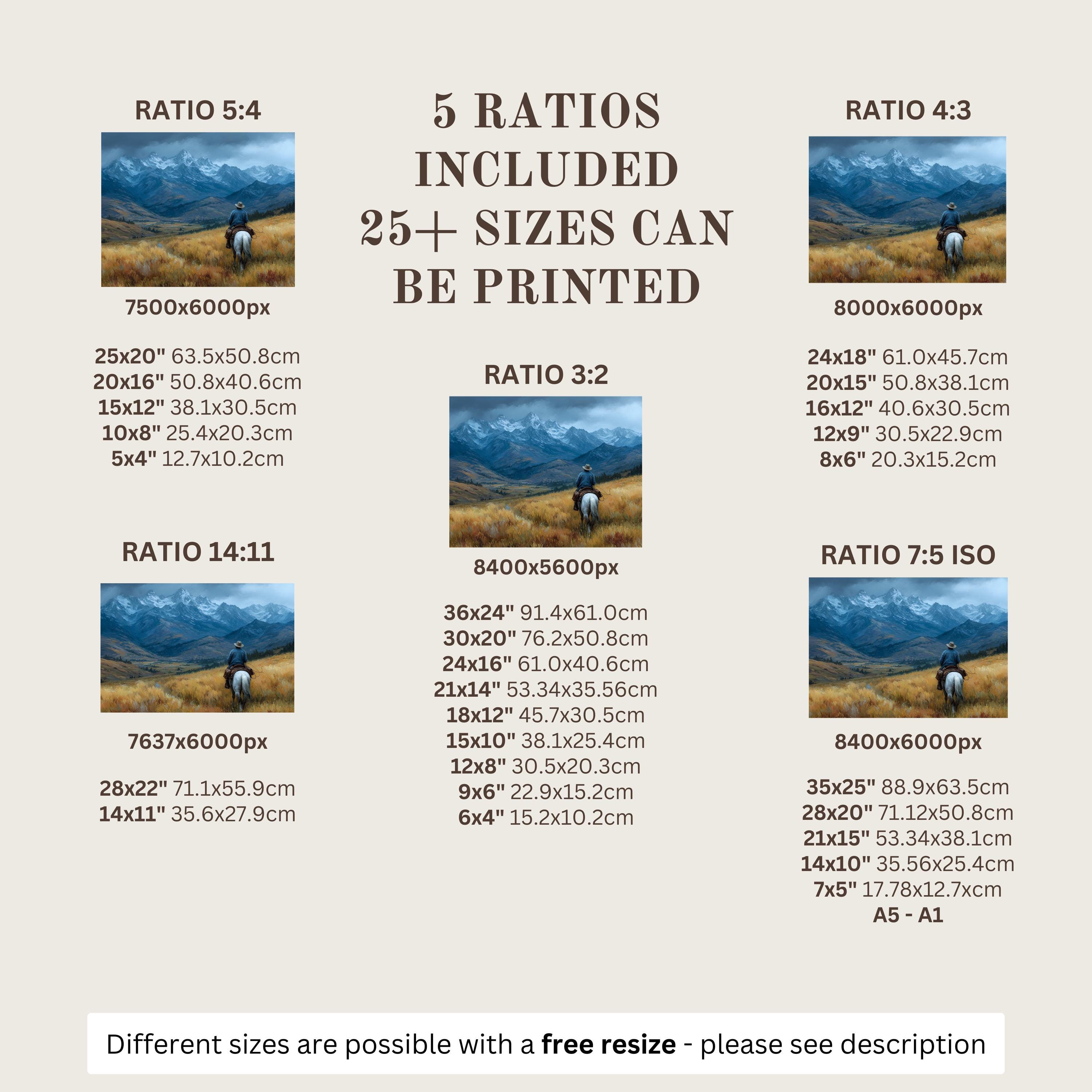Each artwork includes 5 aspect ratios with 25+ print sizes. Most standard frames are covered. One custom resize per purchase available—message before ordering.