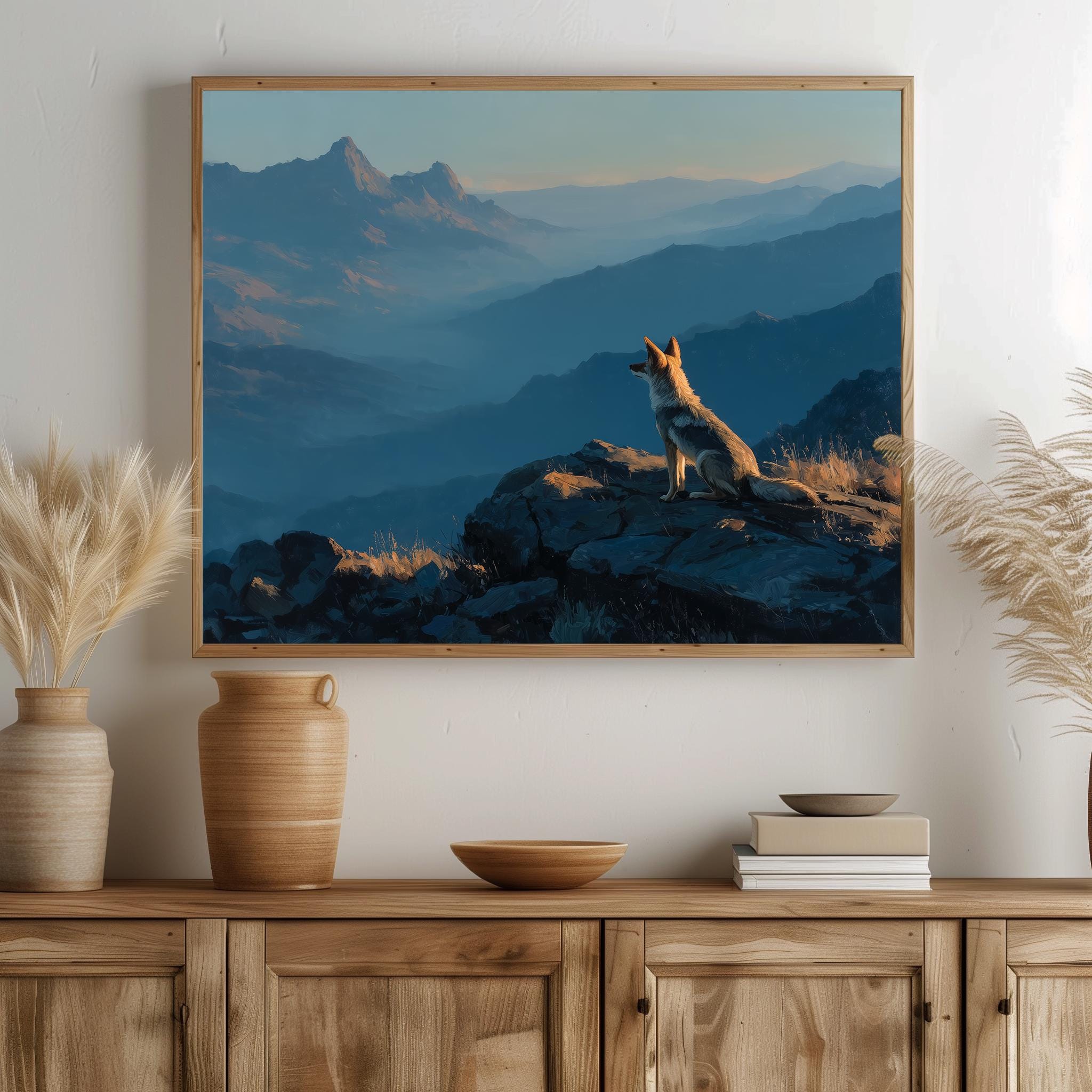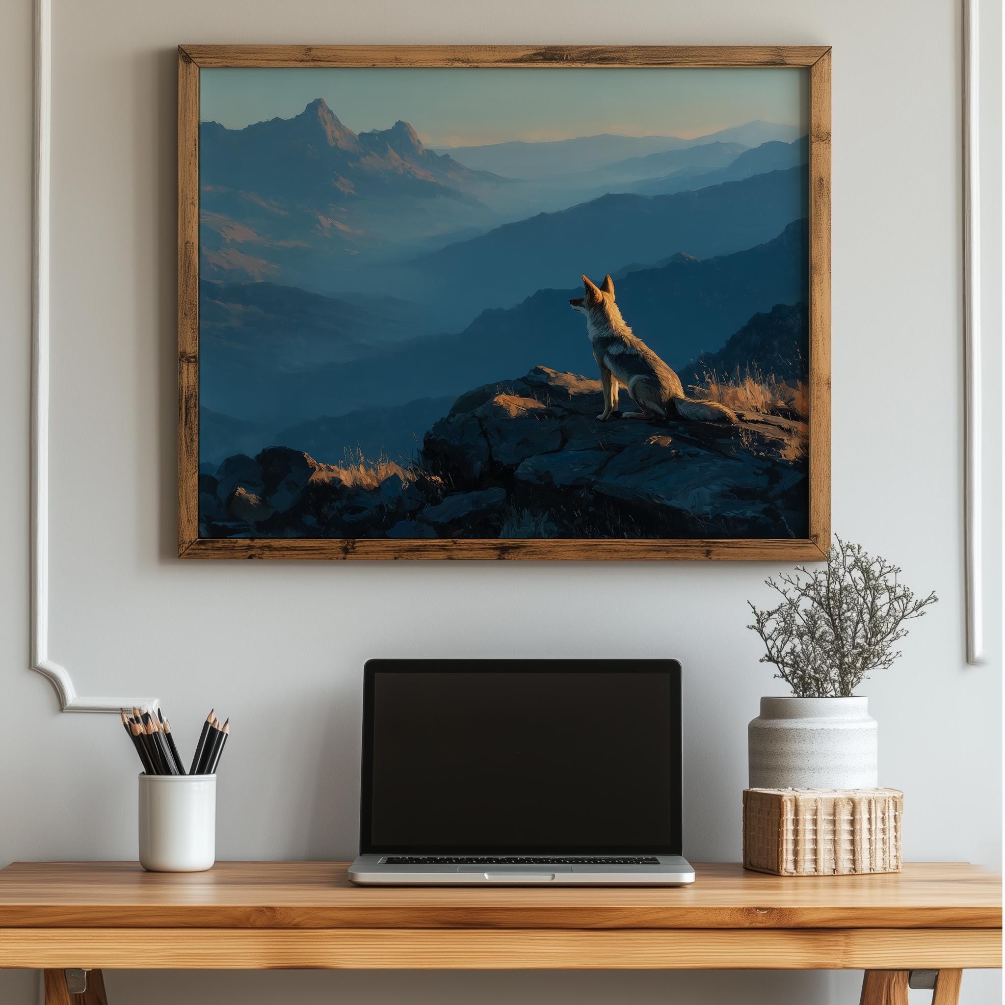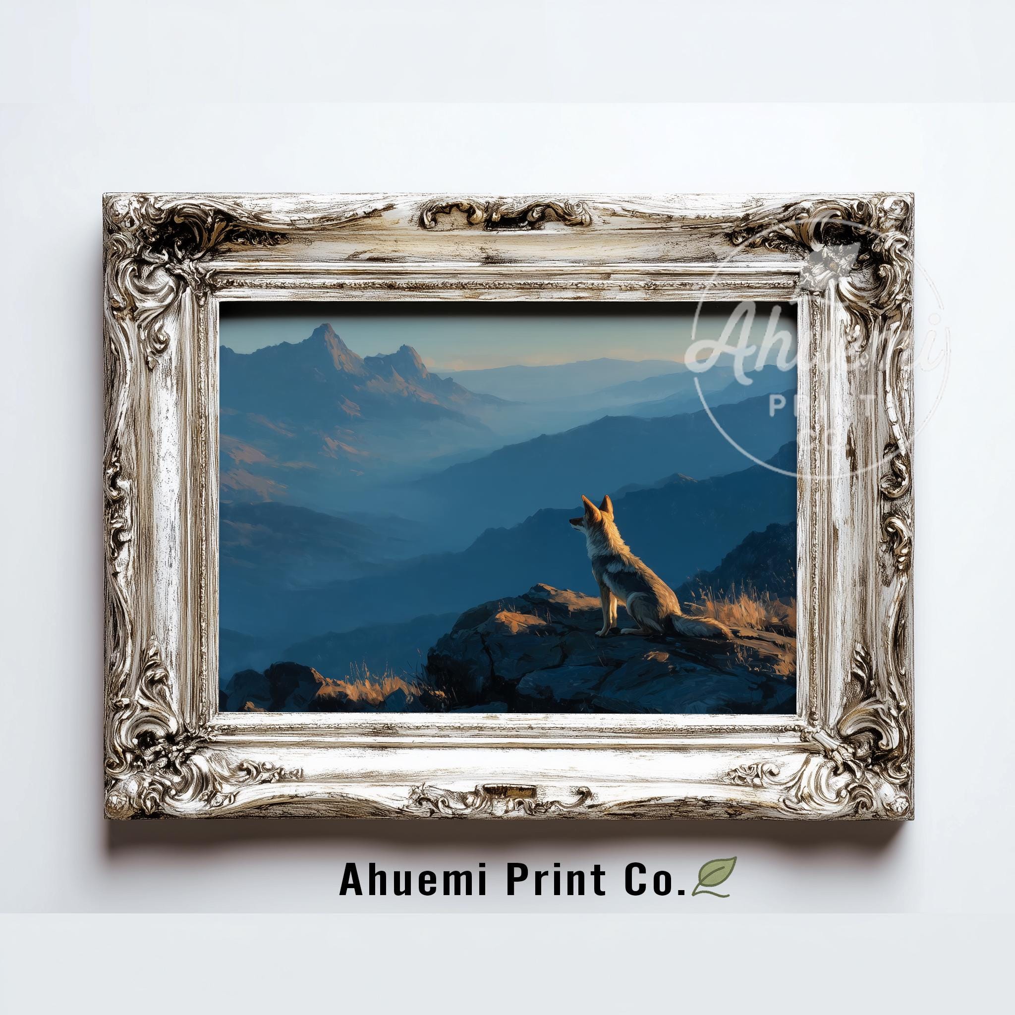 Immerse yourself in the charm with this rustic painting of a lone coyote howling on a mountain ridge. An instantly downloadable print, it's perfect for elevating your decor with budget-friendly charm. This gives you the flexibility to customize the size, frame, and material according to your personal taste and space, ensuring a perfect fit for your walls.