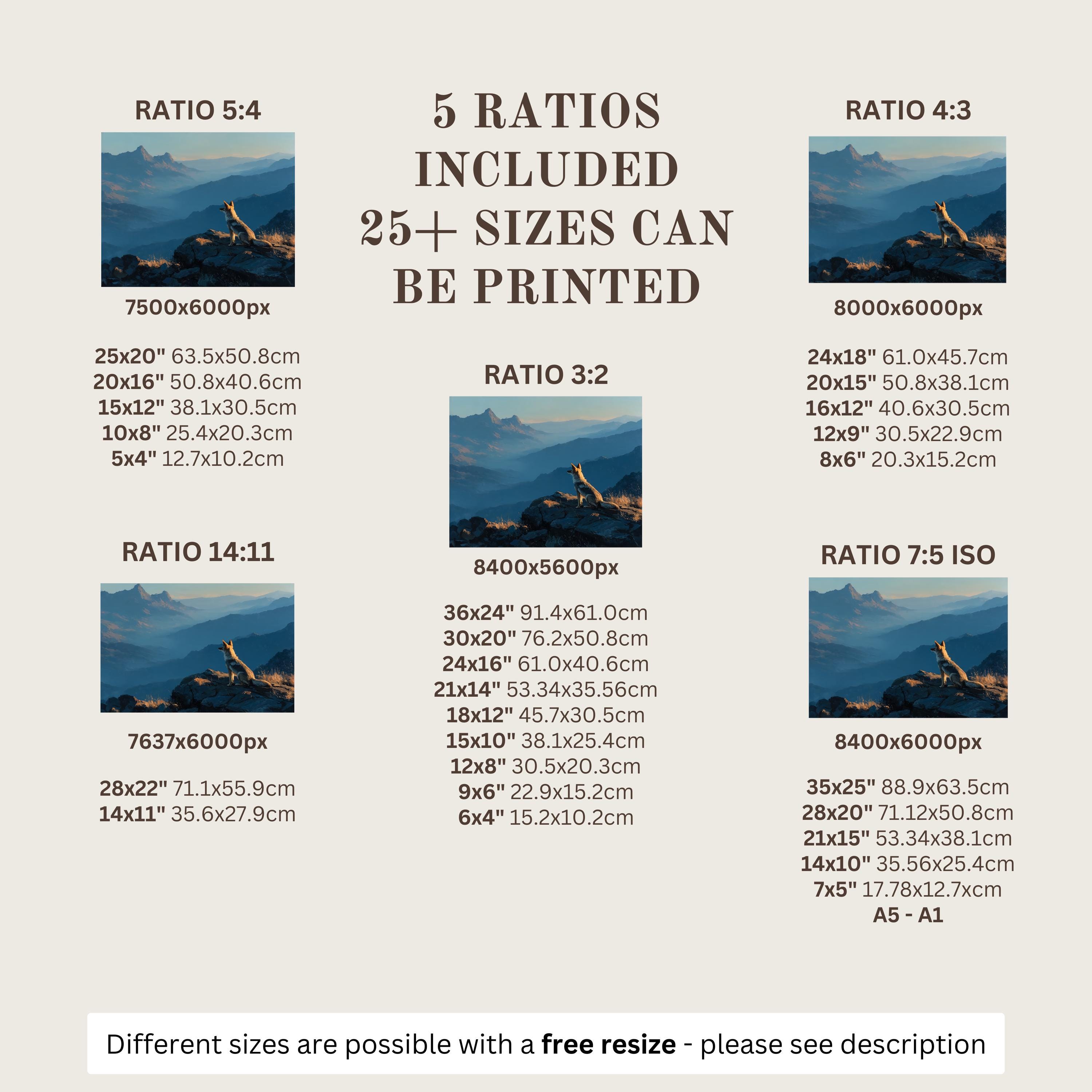 Each artwork includes 5 aspect ratios with 25+ print sizes. Most standard frames are covered. One custom resize per purchase available—message before ordering.