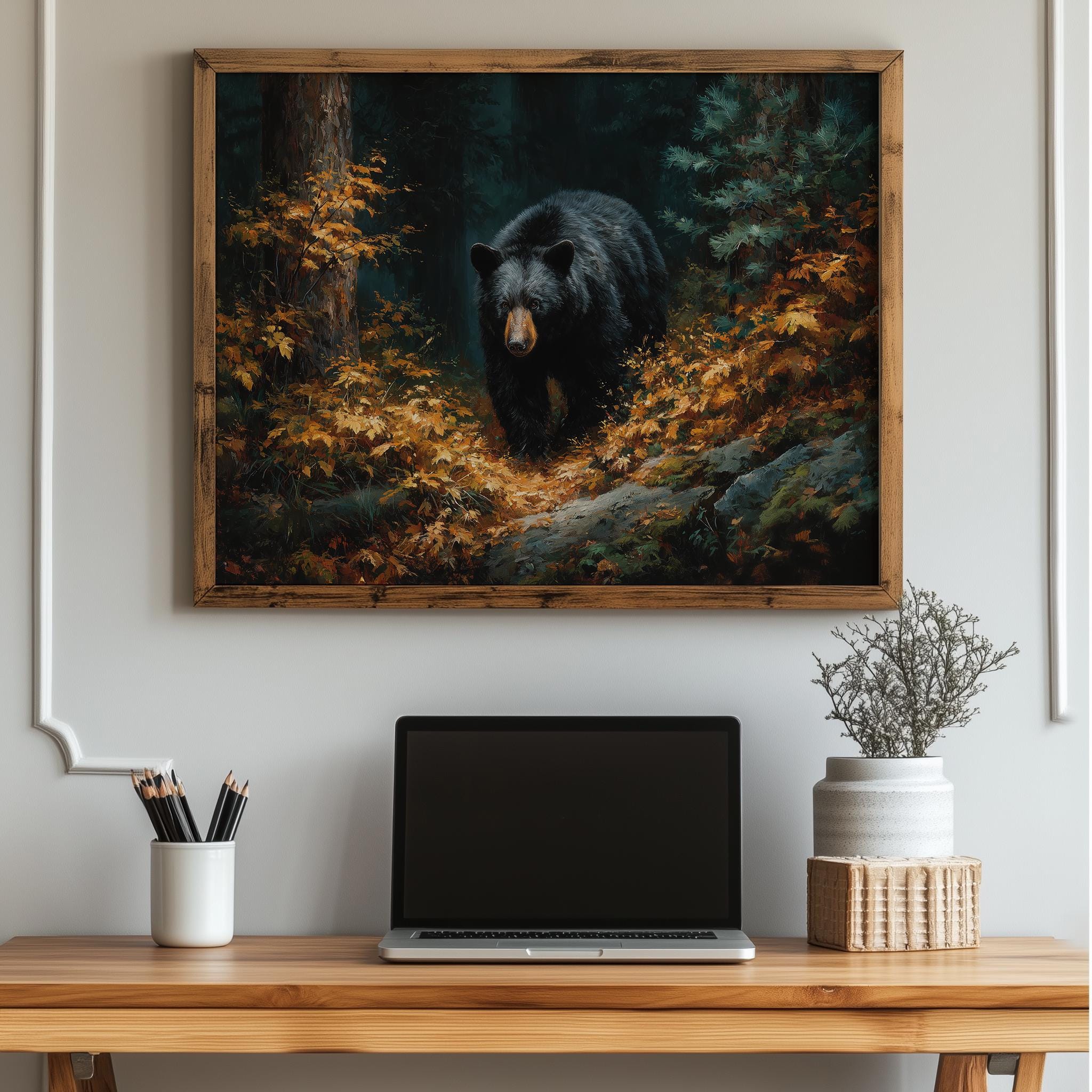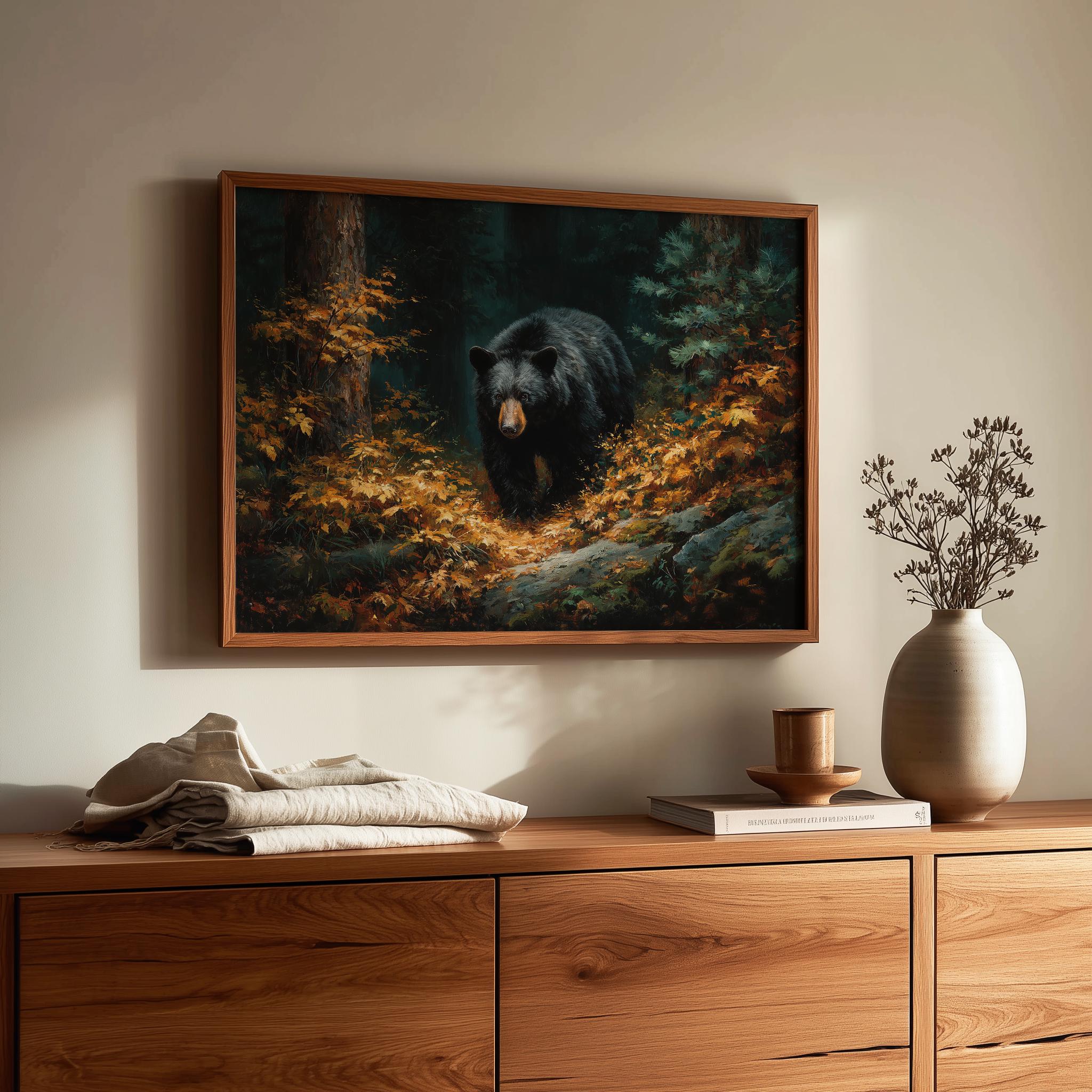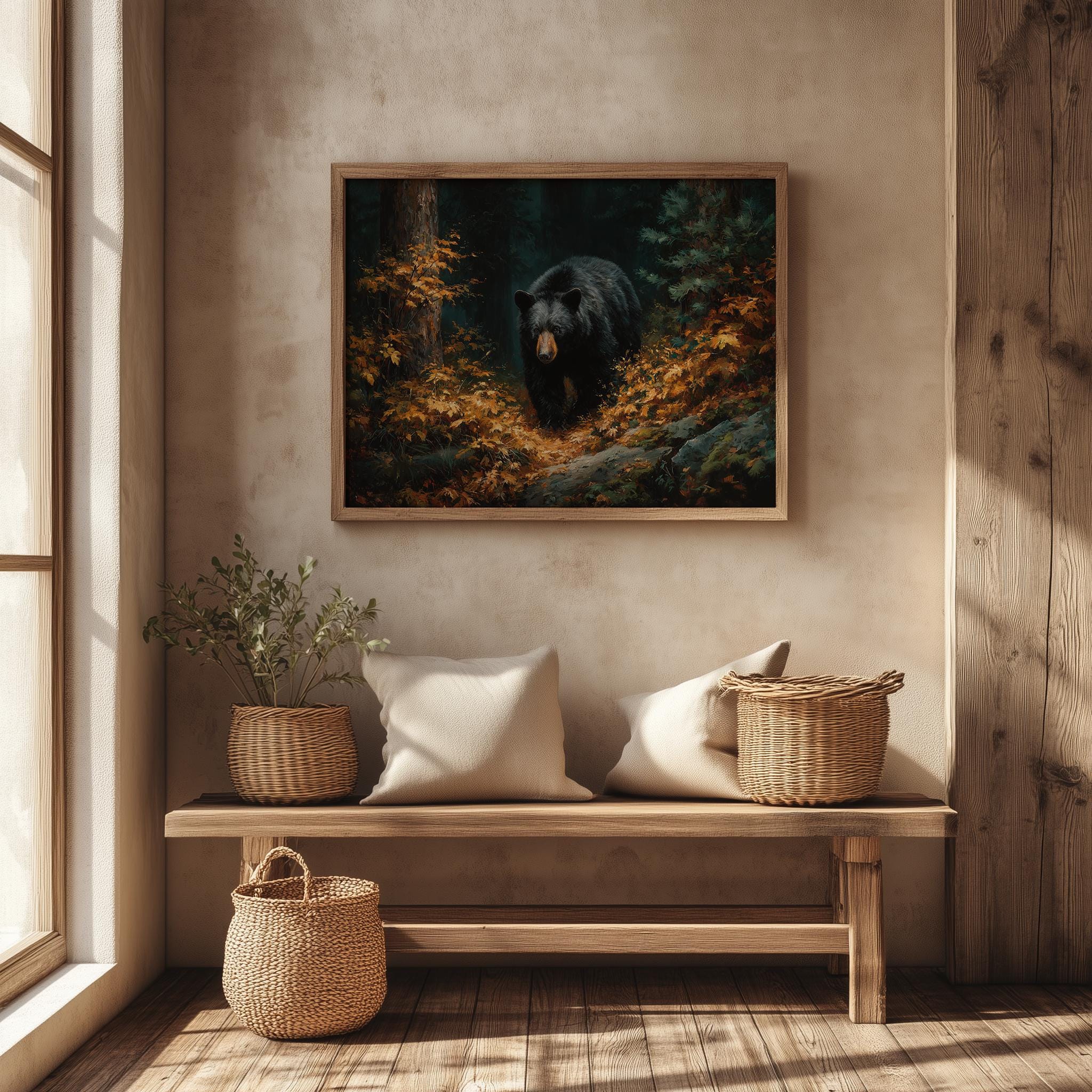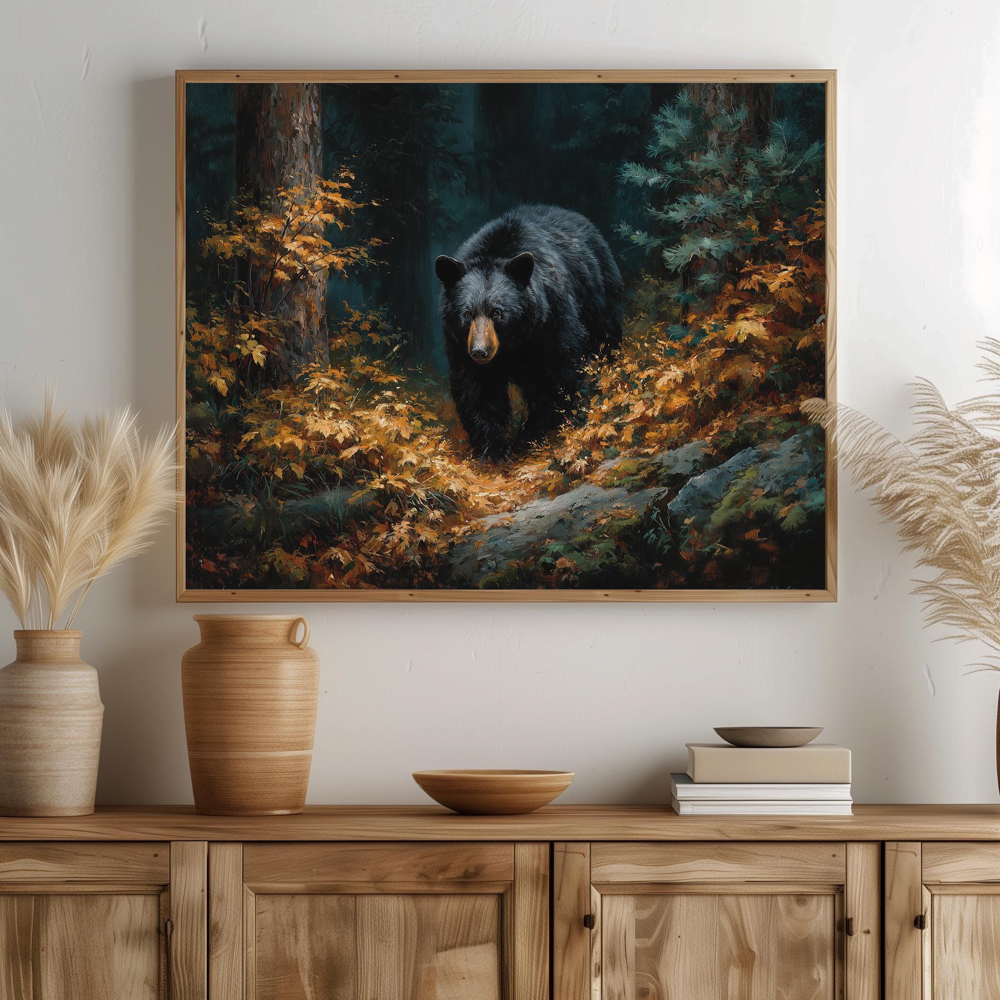 Immerse yourself in the charm with this rustic painting of a majestic black bear surrounded by vibrant autumn foliage. An instantly downloadable print, it's perfect for elevating your decor with budget-friendly charm. This gives you the flexibility to customize the size, frame, and material according to your personal taste and space, ensuring a perfect fit for your walls.