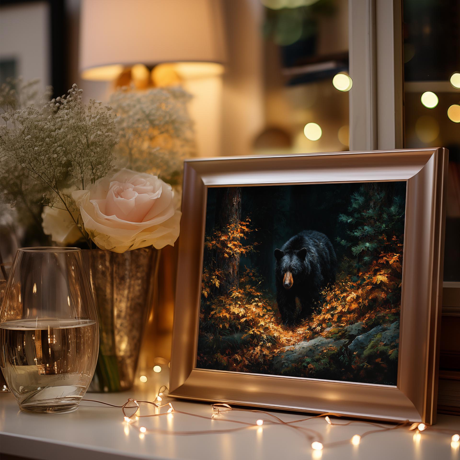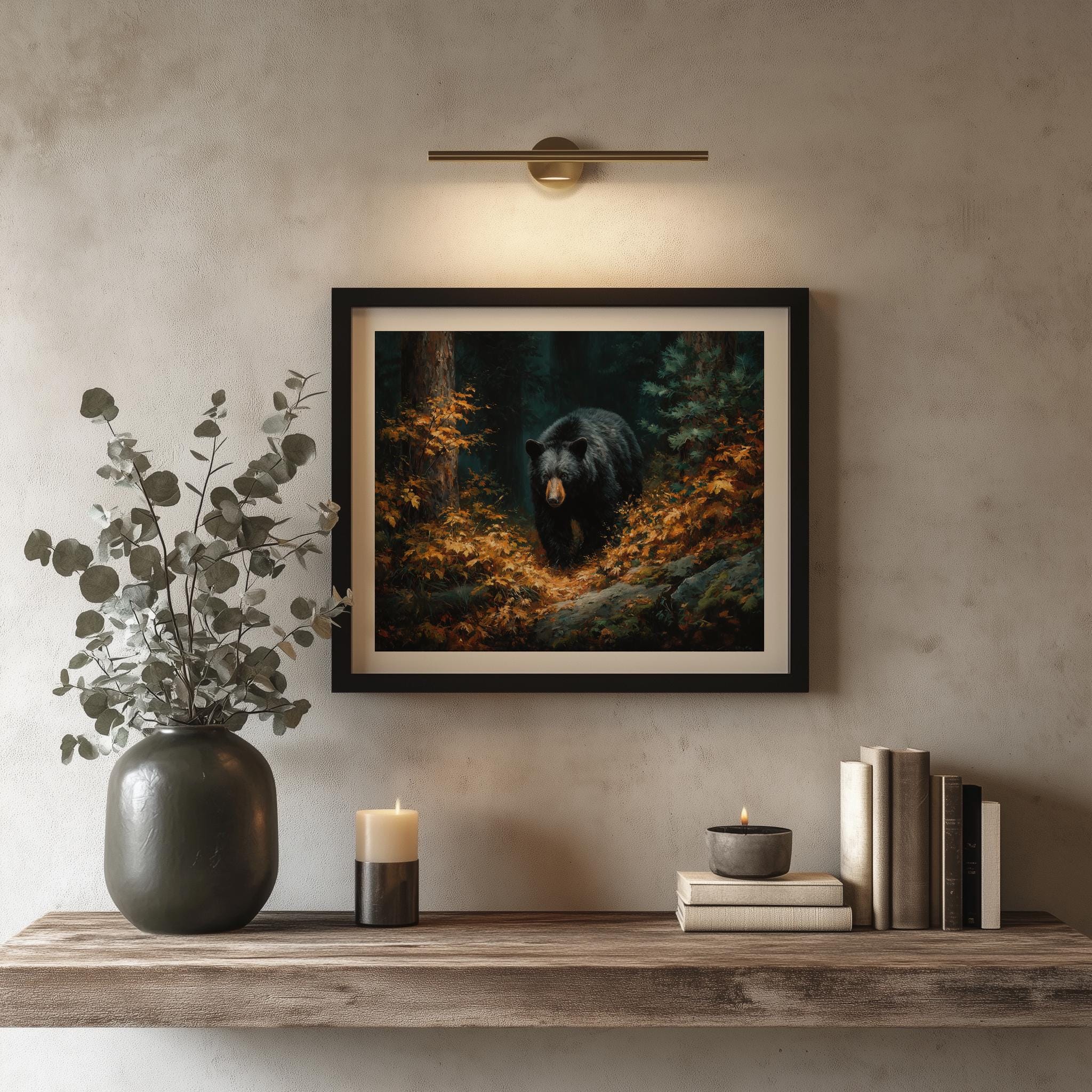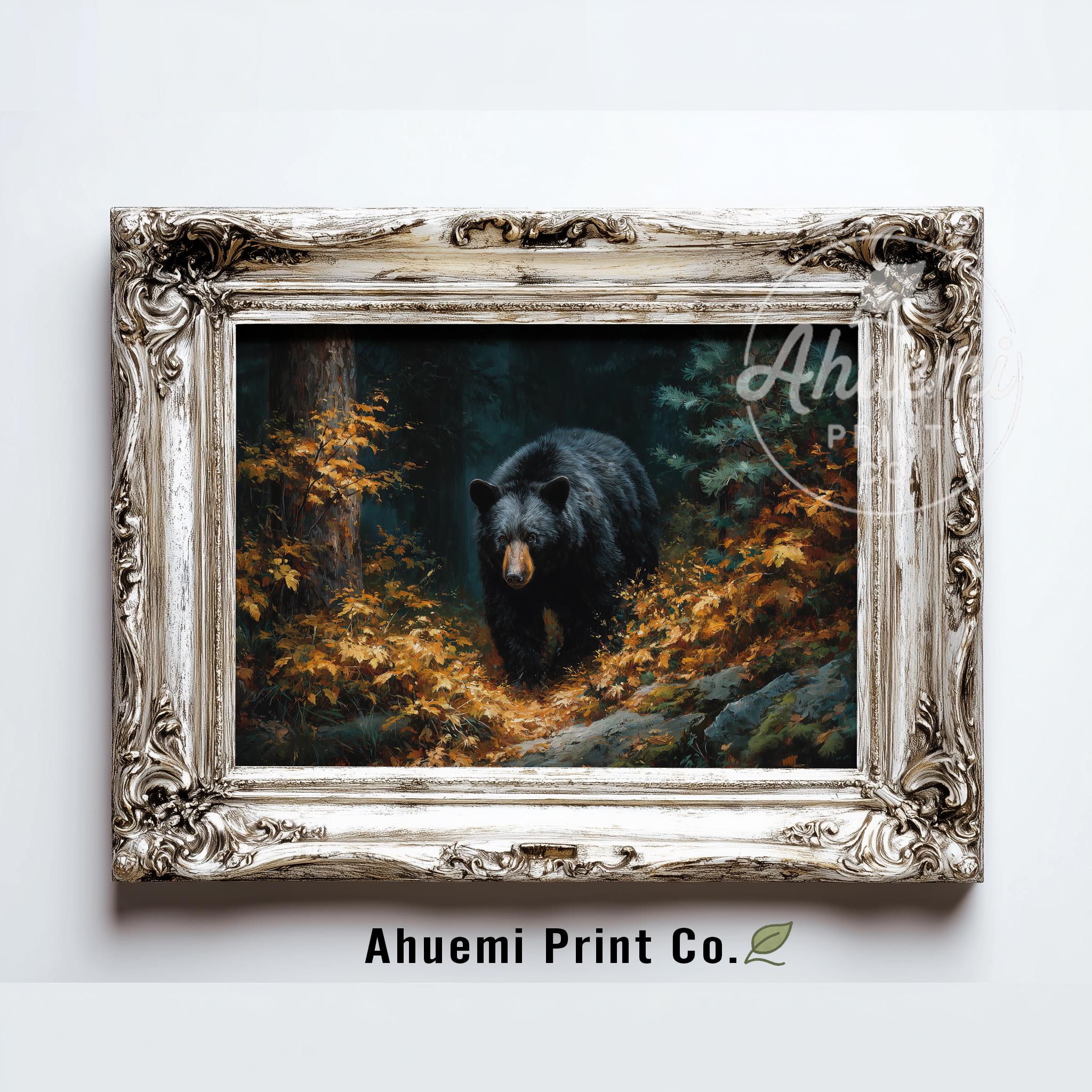 Immerse yourself in the charm with this rustic painting of a majestic black bear surrounded by vibrant autumn foliage. An instantly downloadable print, it's perfect for elevating your decor with budget-friendly charm. This gives you the flexibility to customize the size, frame, and material according to your personal taste and space, ensuring a perfect fit for your walls.