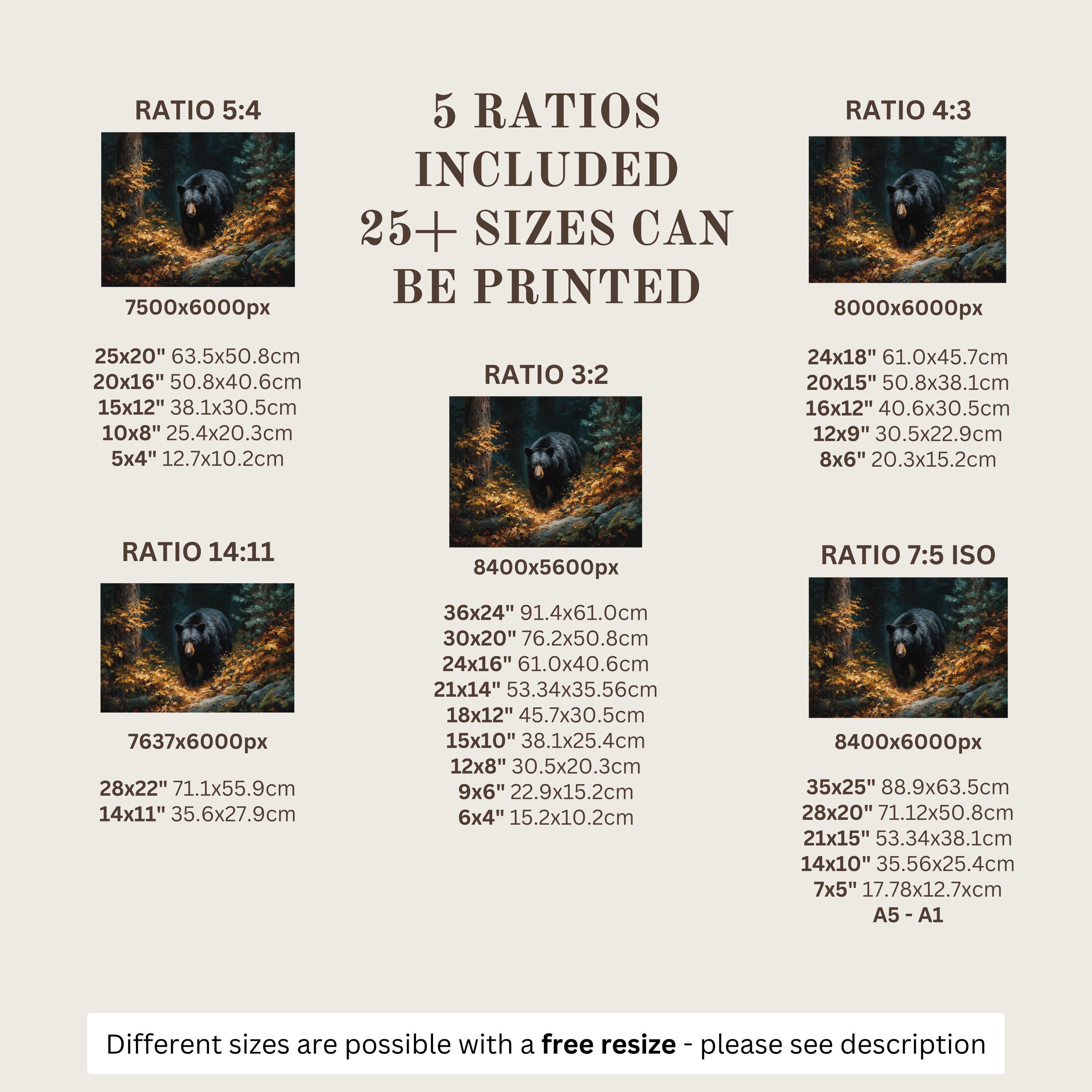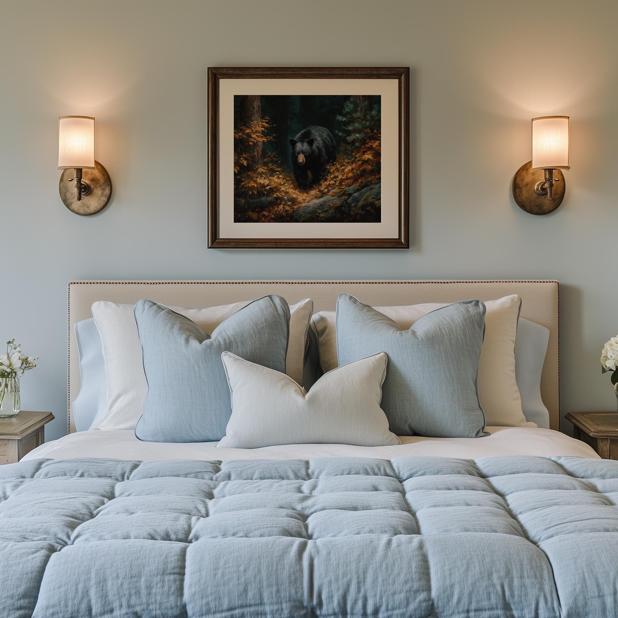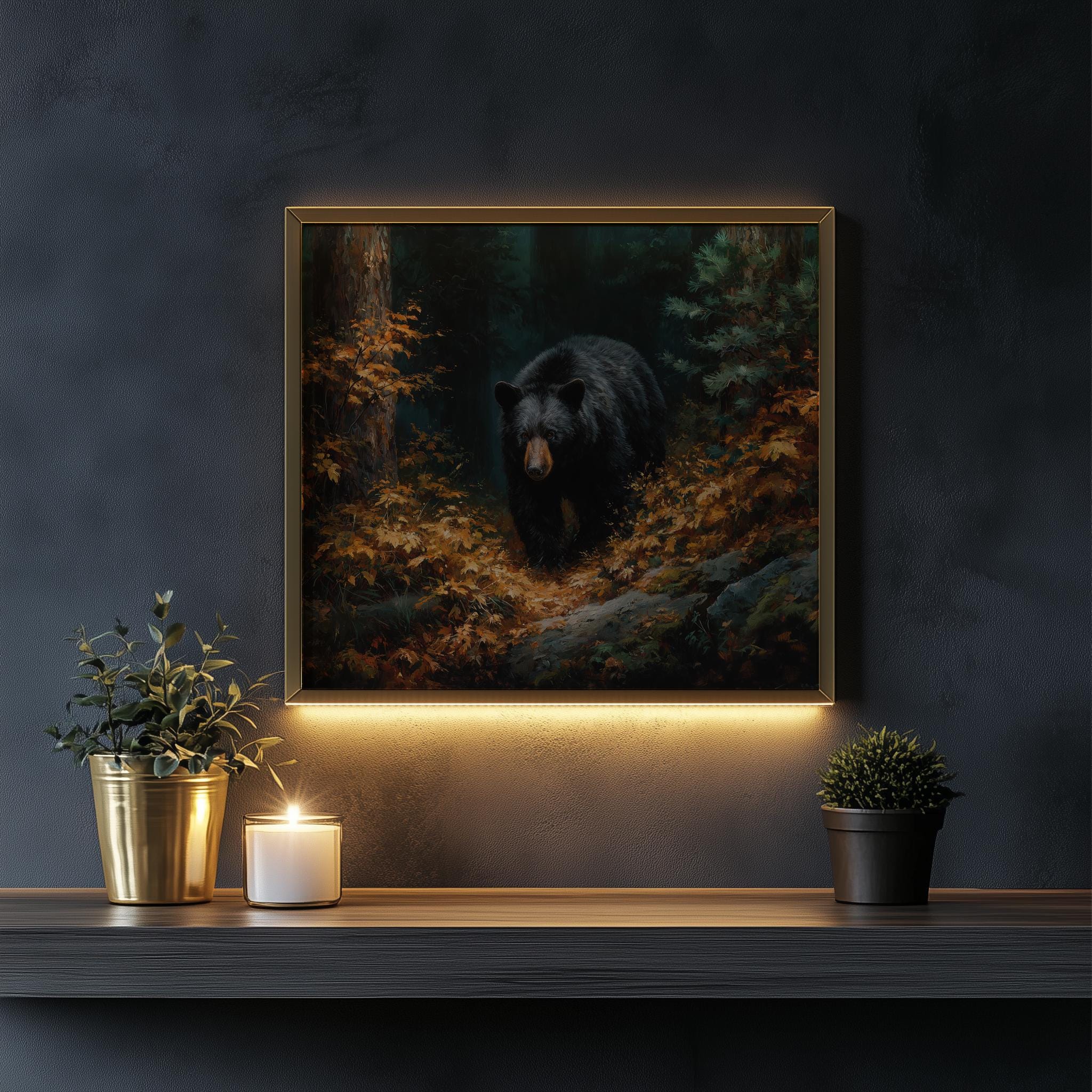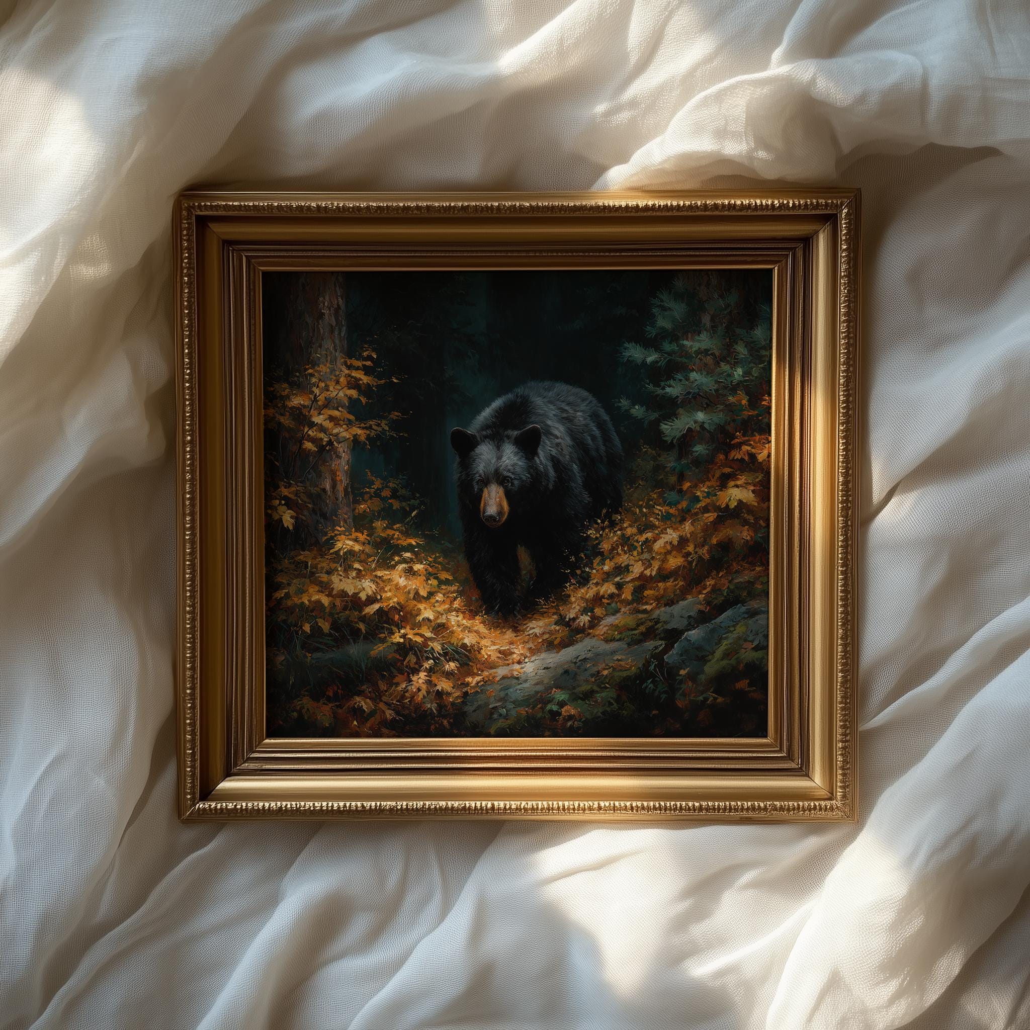 Immerse yourself in the charm with this rustic painting of a majestic black bear surrounded by vibrant autumn foliage. An instantly downloadable print, it's perfect for elevating your decor with budget-friendly charm. This gives you the flexibility to customize the size, frame, and material according to your personal taste and space, ensuring a perfect fit for your walls.