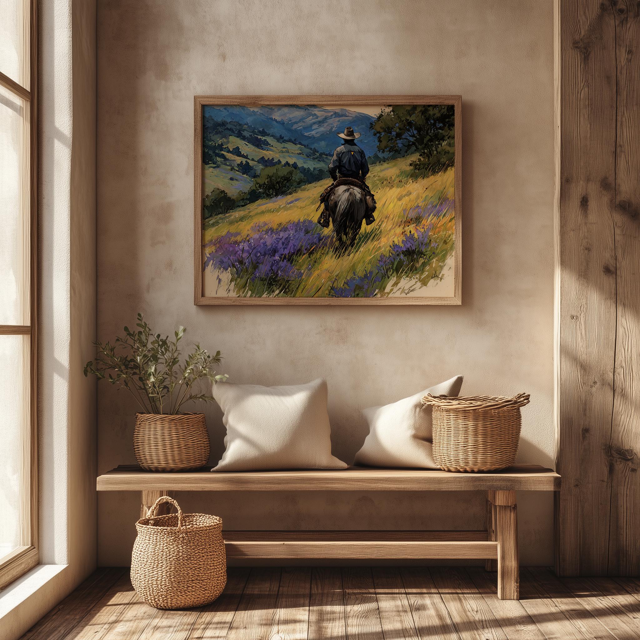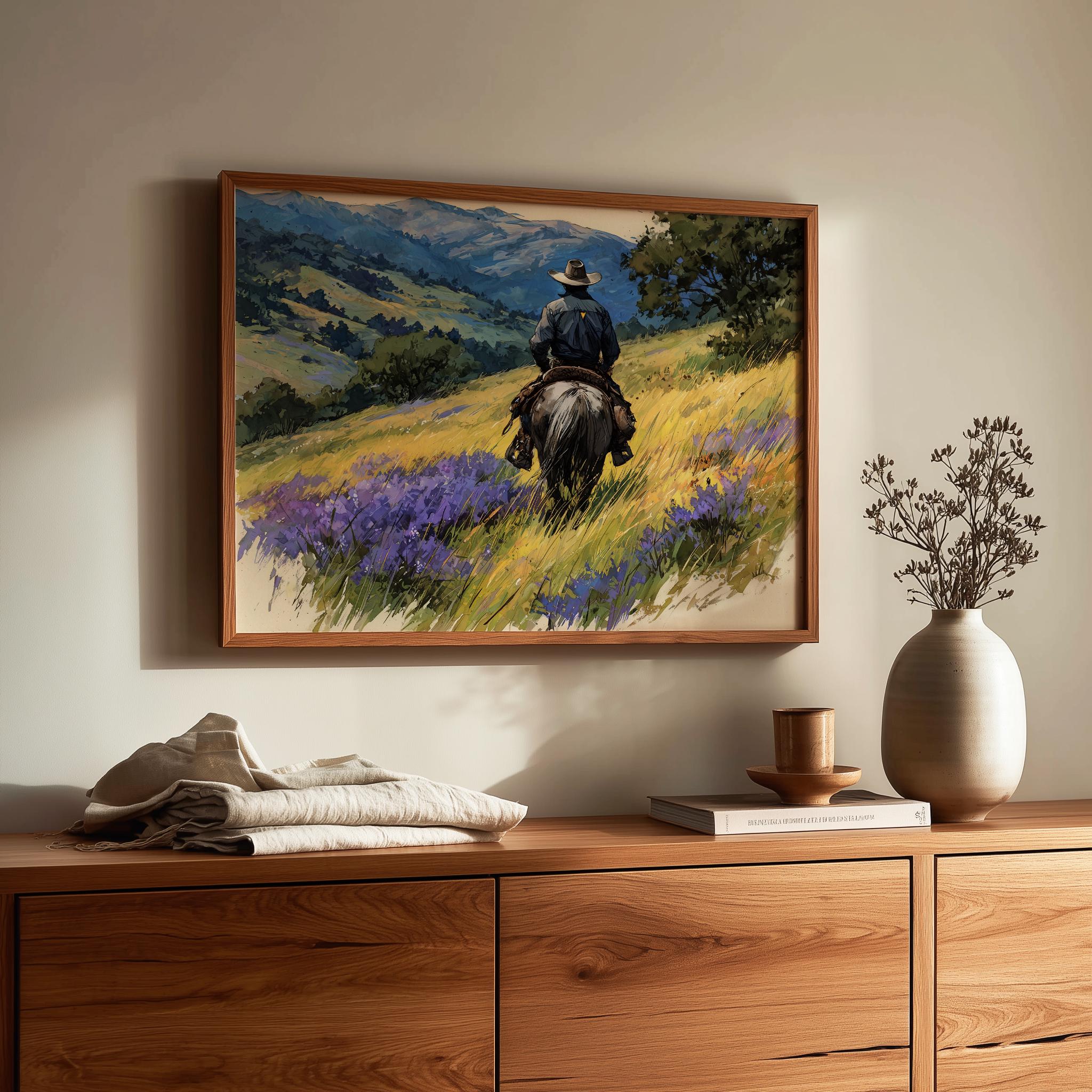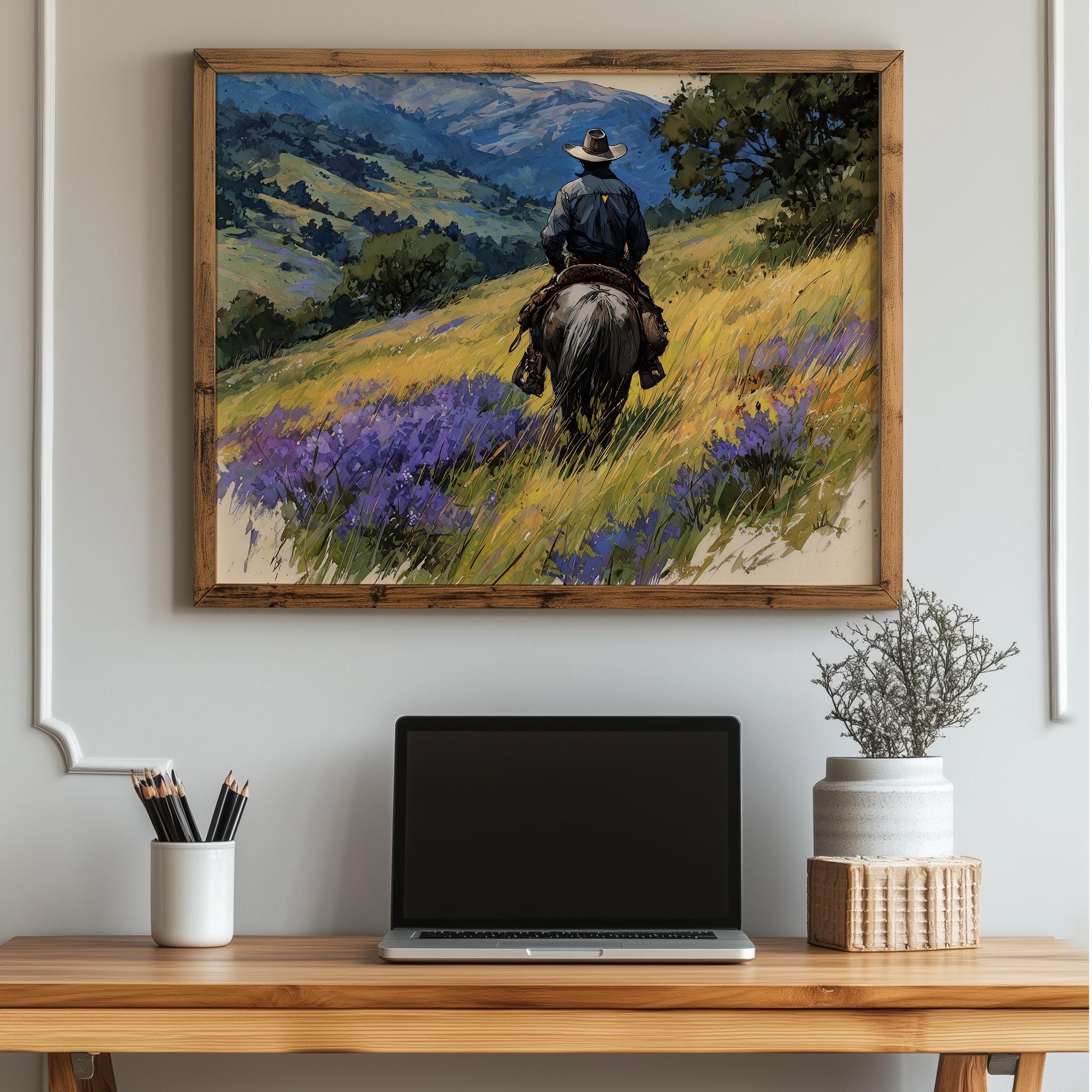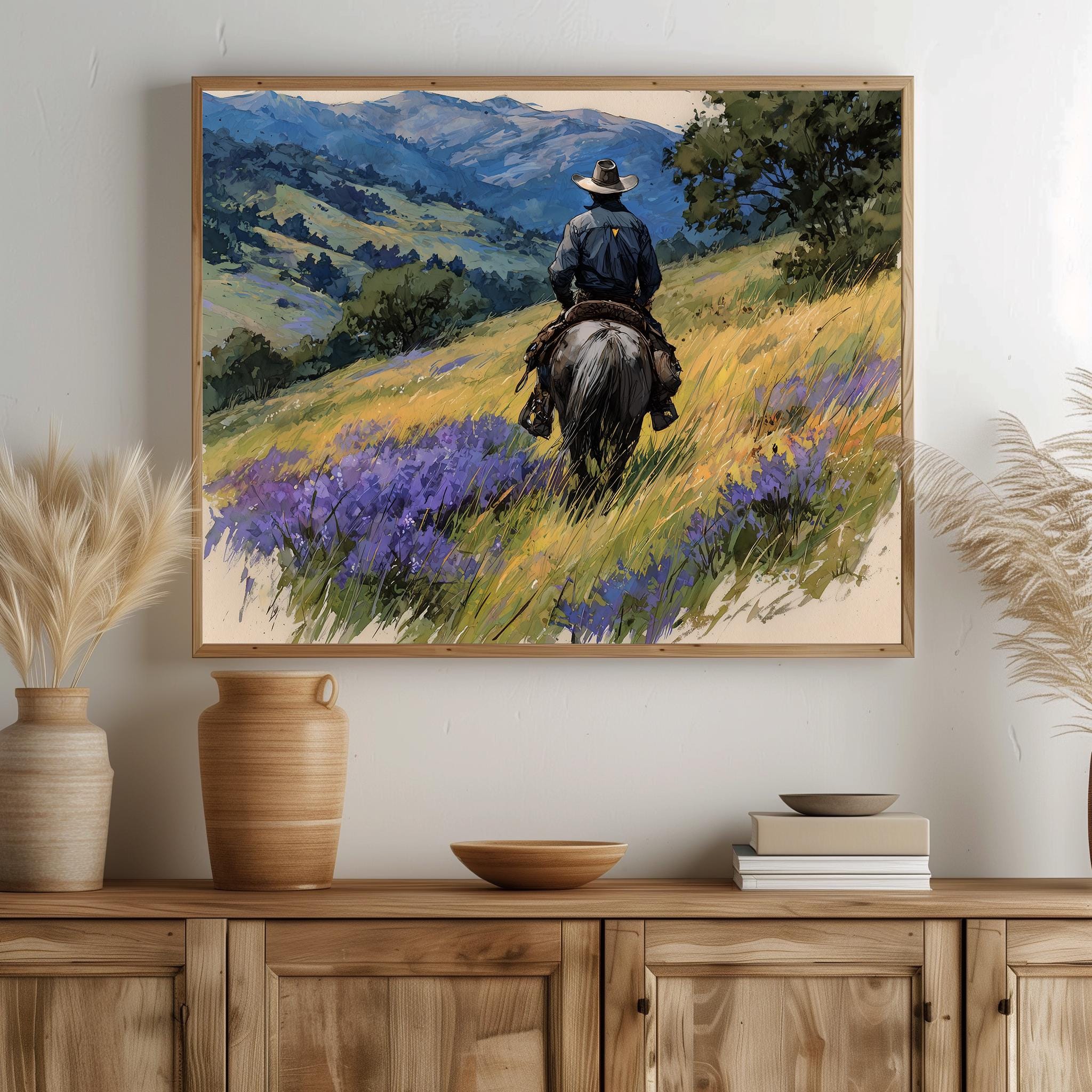 Immerse yourself in the charm with this rustic painting of a cowboy riding a horse through a serene landscape. An instantly downloadable print, it's perfect for elevating your decor with budget-friendly charm. This gives you the flexibility to customize the size, frame, and material according to your personal taste and space, ensuring a perfect fit for your walls.