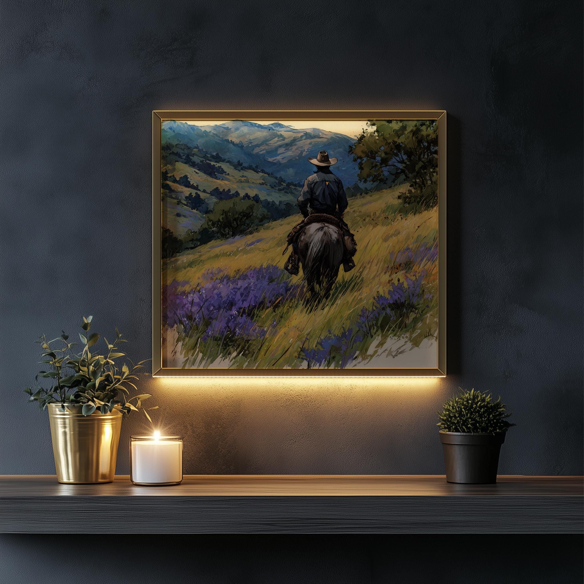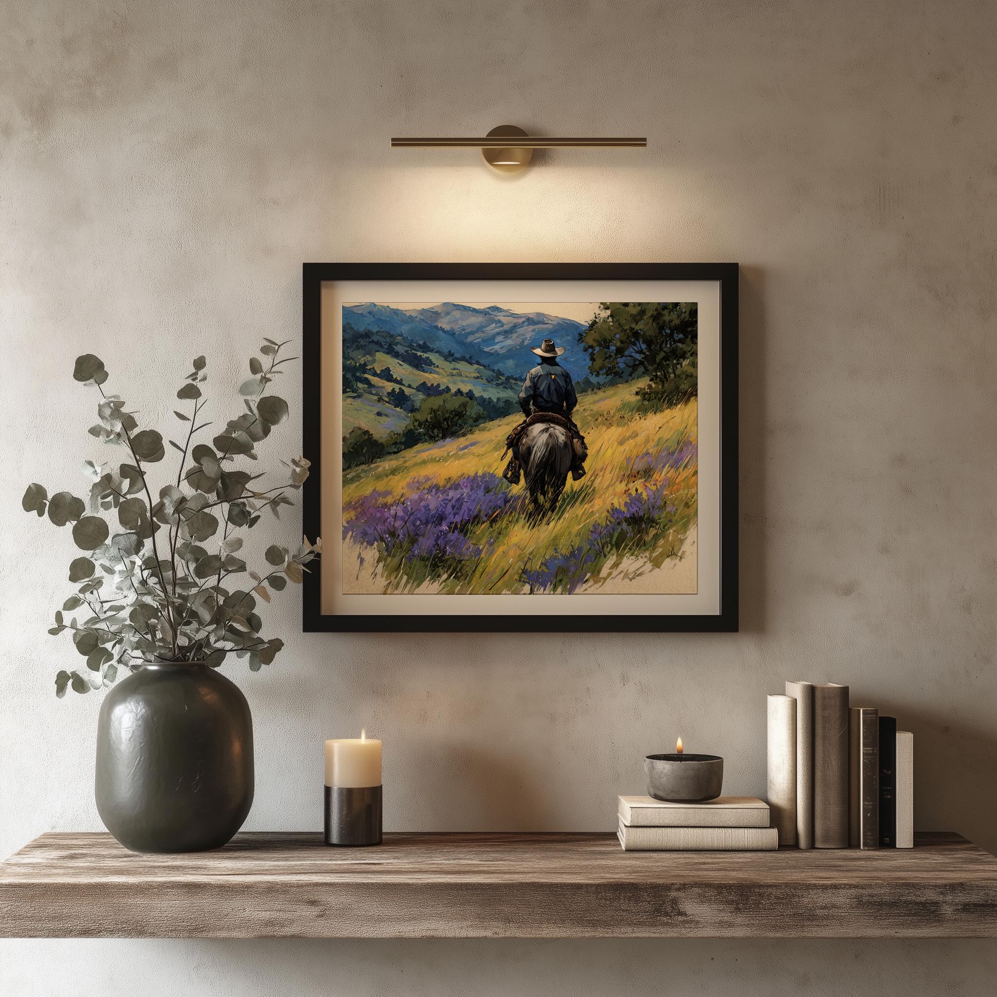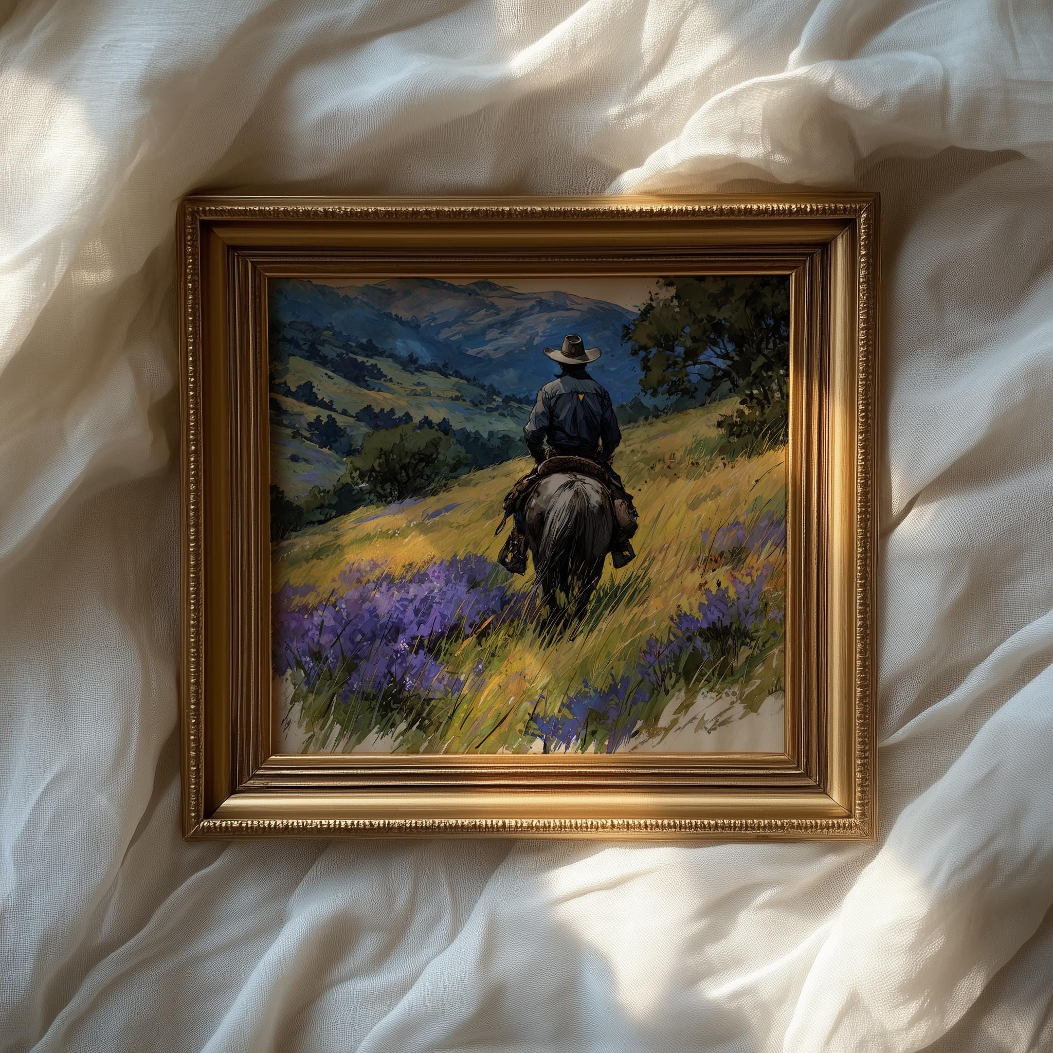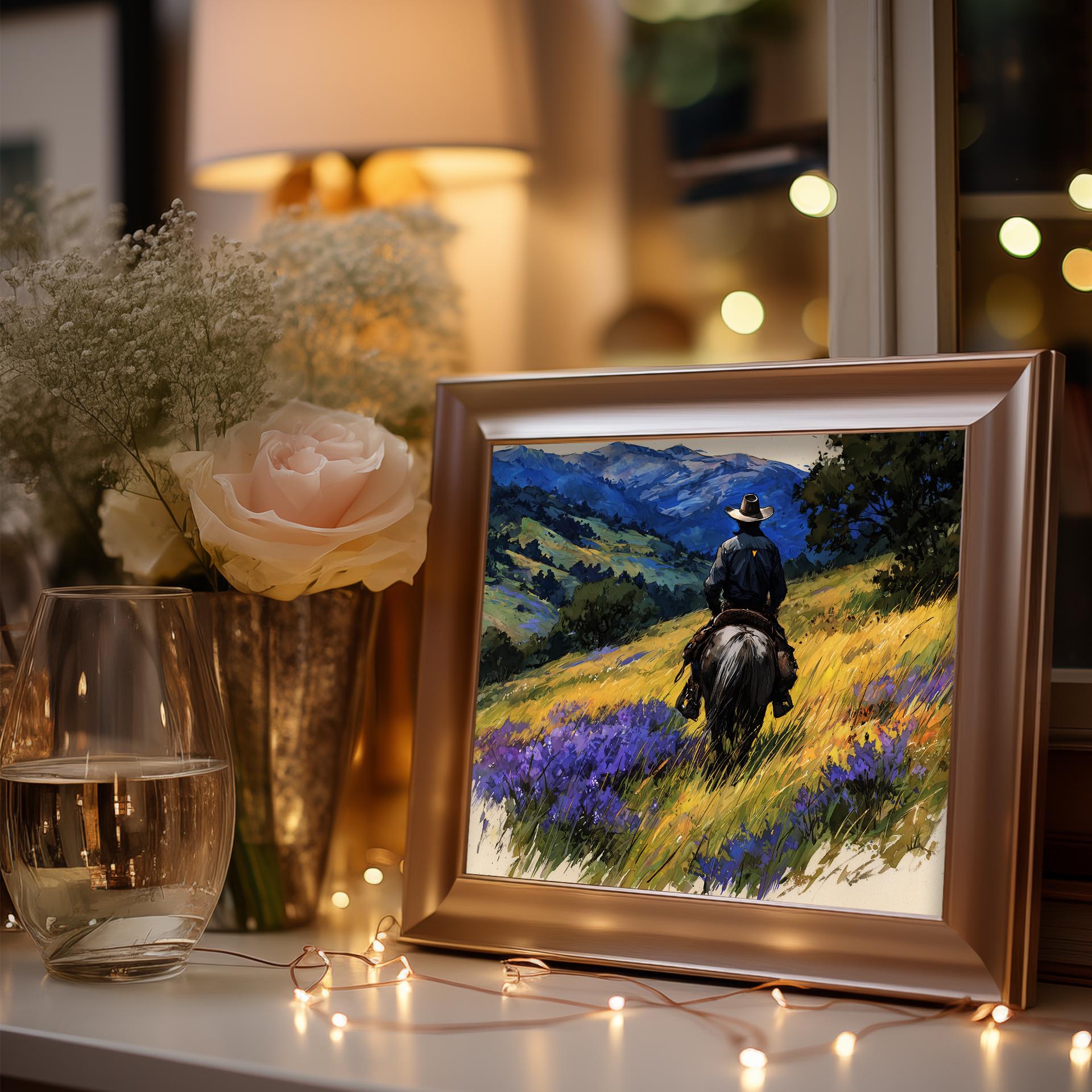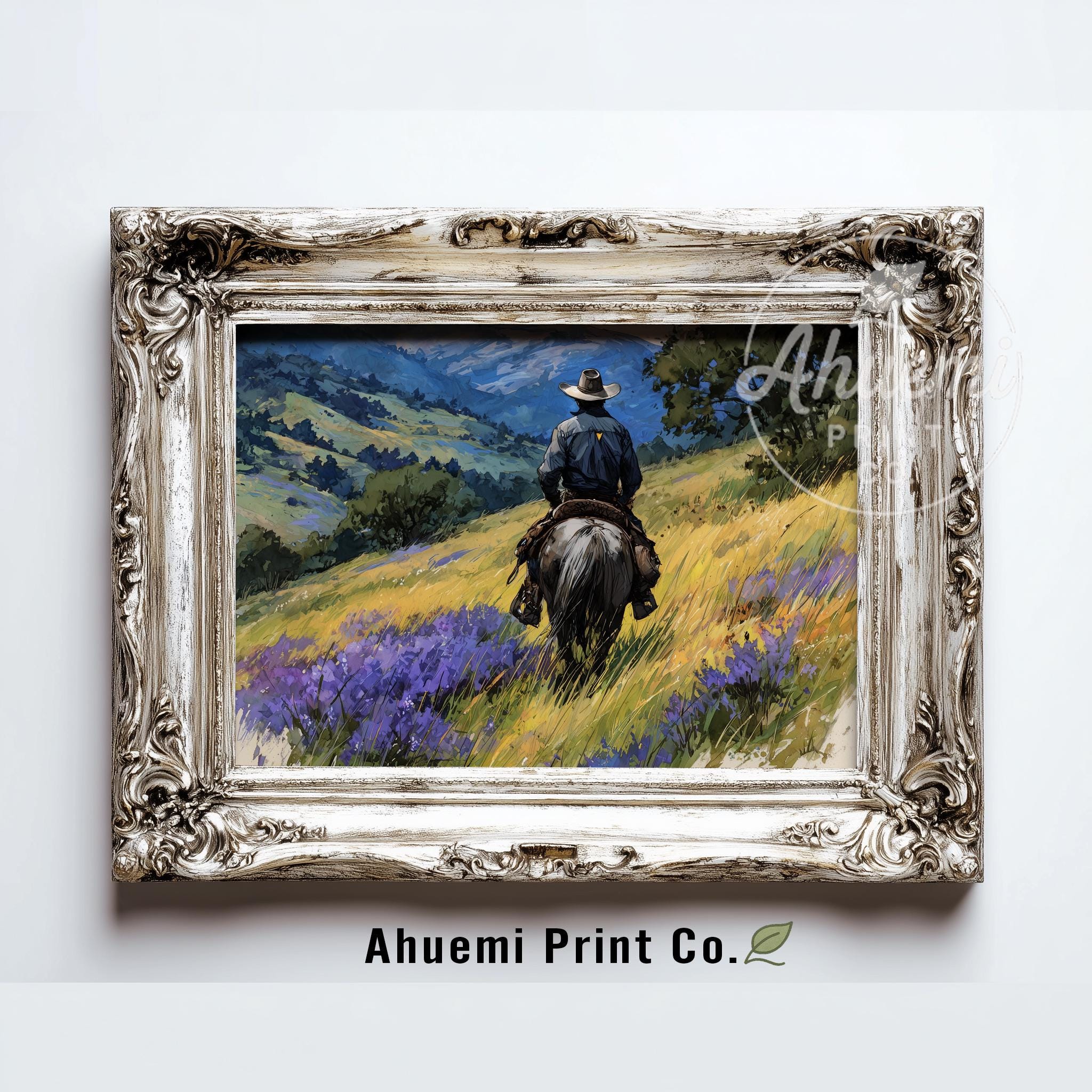 Immerse yourself in the charm with this rustic painting of a cowboy riding a horse through a serene landscape. An instantly downloadable print, it's perfect for elevating your decor with budget-friendly charm. This gives you the flexibility to customize the size, frame, and material according to your personal taste and space, ensuring a perfect fit for your walls.