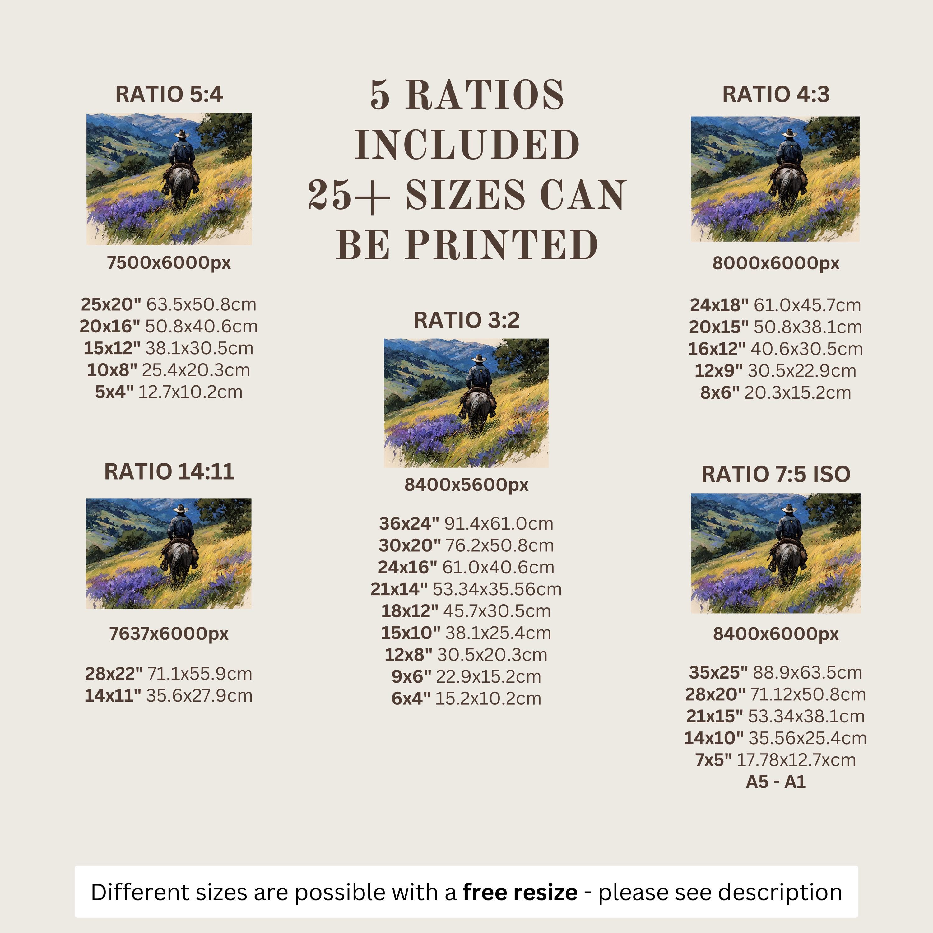 Each artwork includes 5 aspect ratios with 25+ print sizes. Most standard frames are covered. One custom resize per purchase available—message before ordering.