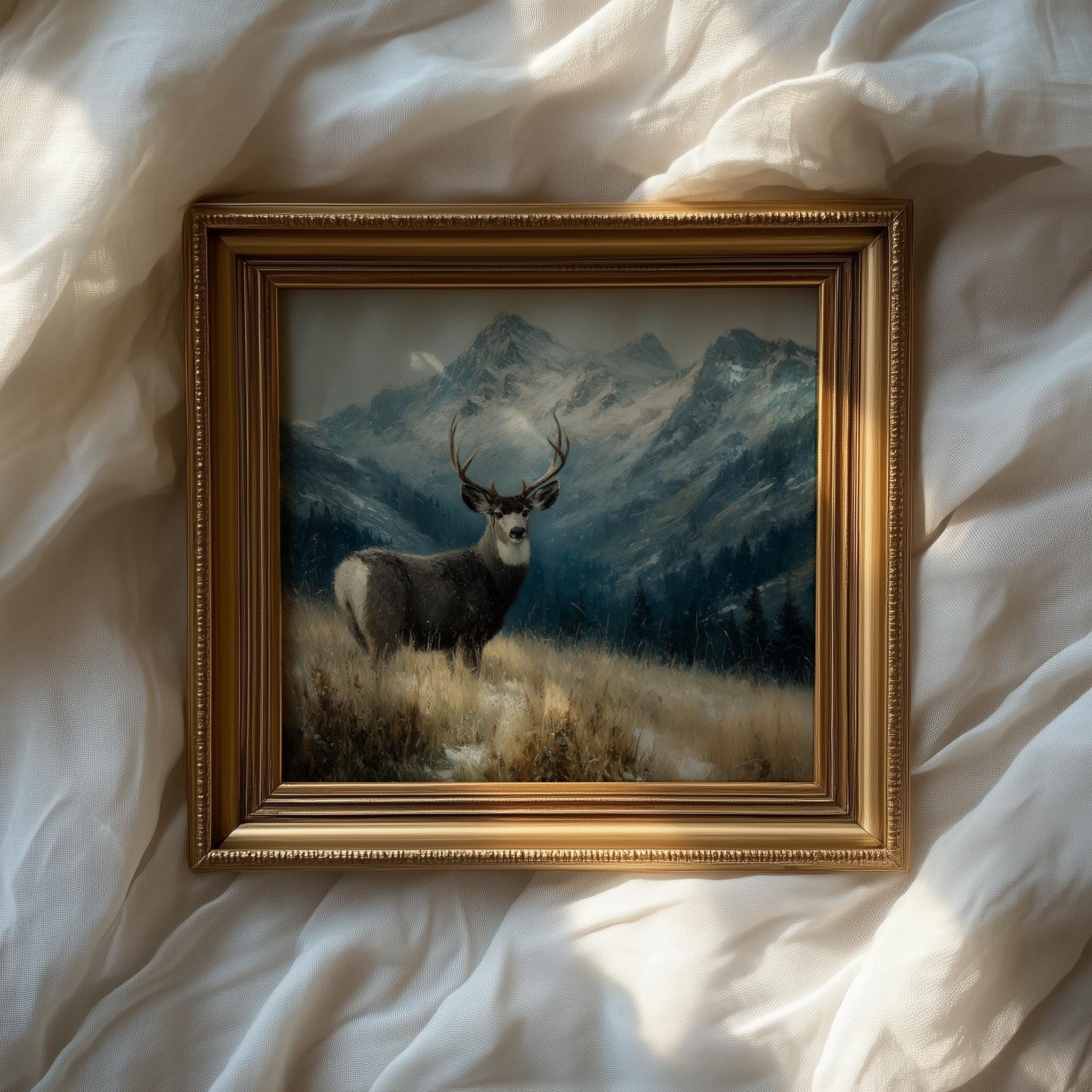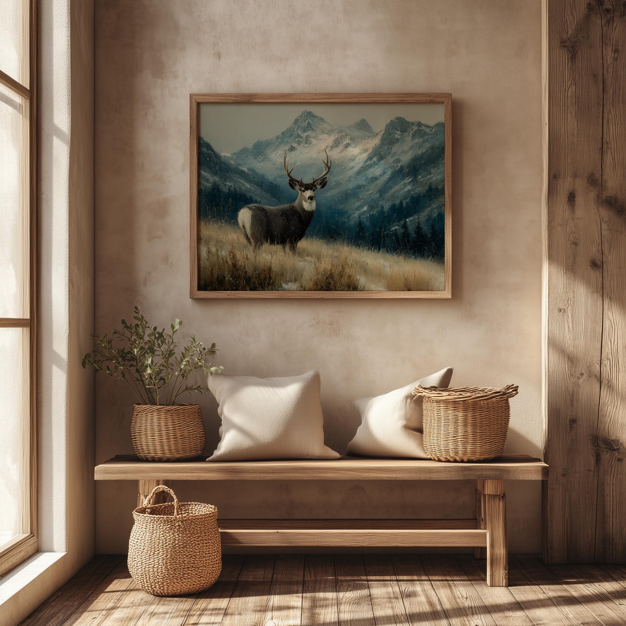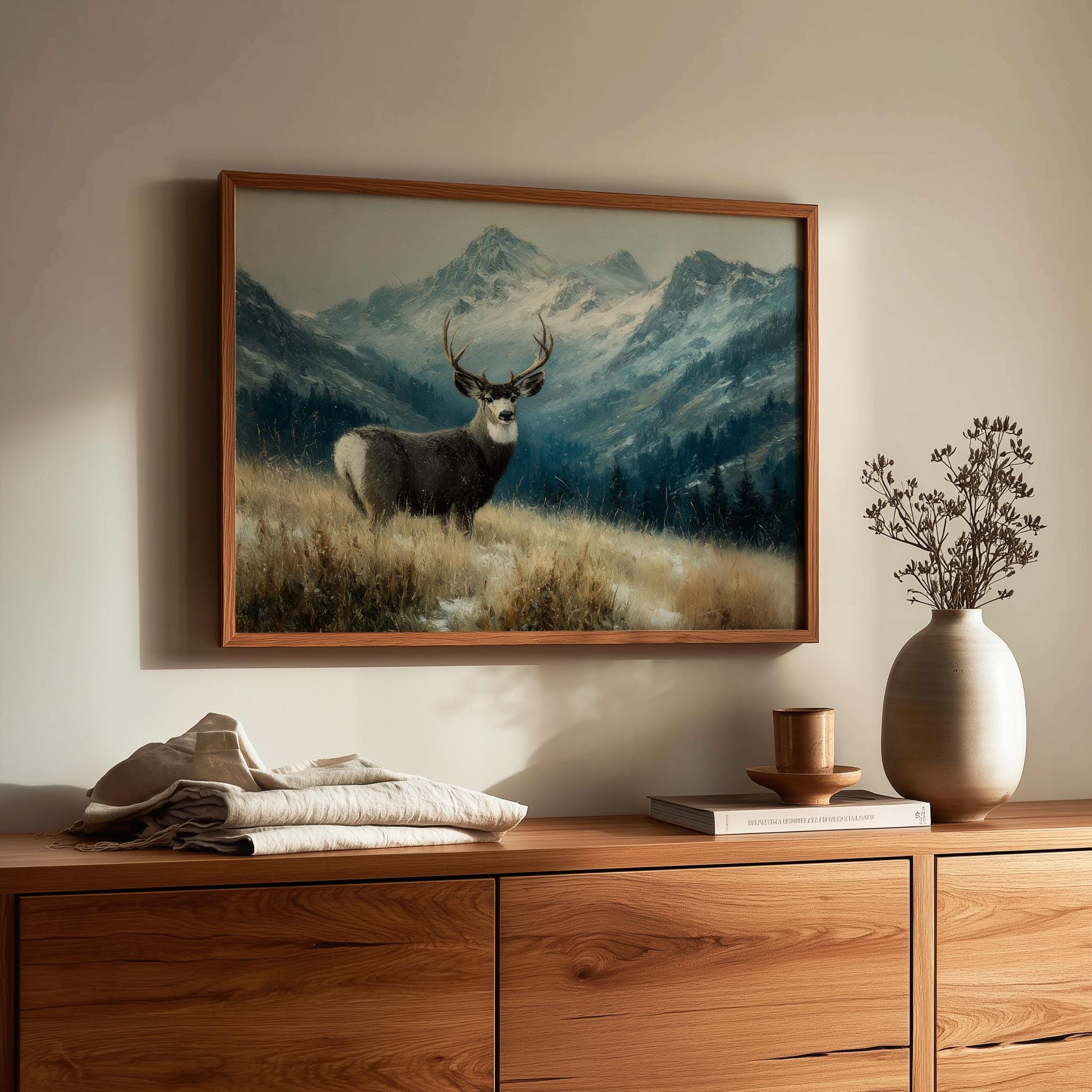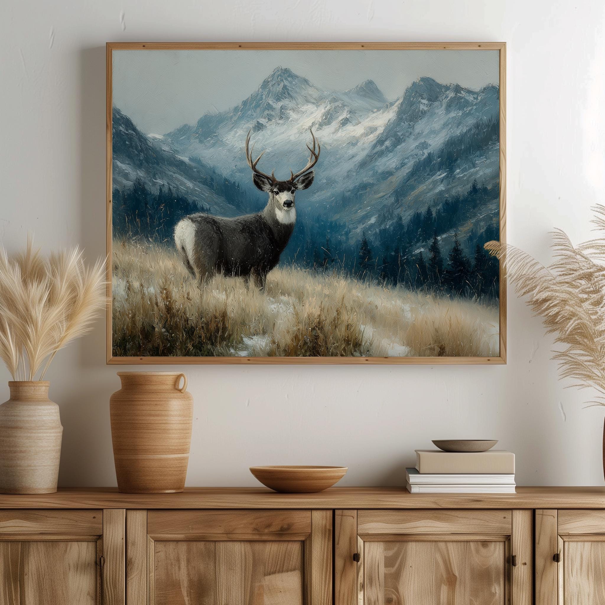 Immerse yourself in the charm with this rustic painting of a majestic mule deer stag in a tranquil meadow. An instantly downloadable print, it's perfect for elevating your decor with budget-friendly charm. This gives you the flexibility to customize the size, frame, and material according to your personal taste and space, ensuring a perfect fit for your walls.