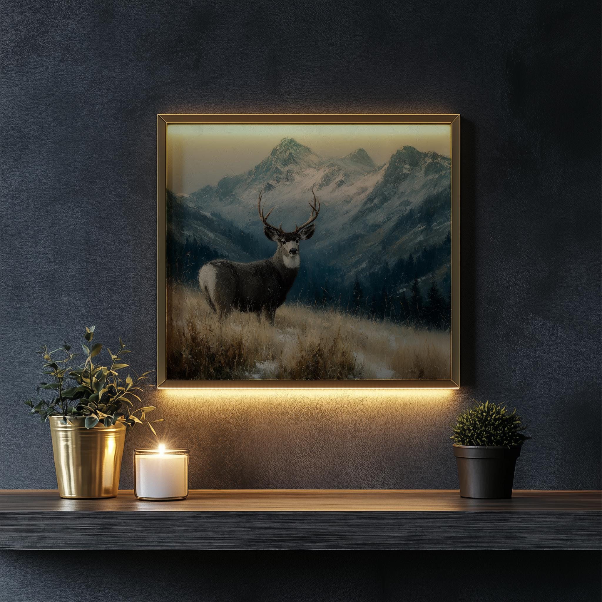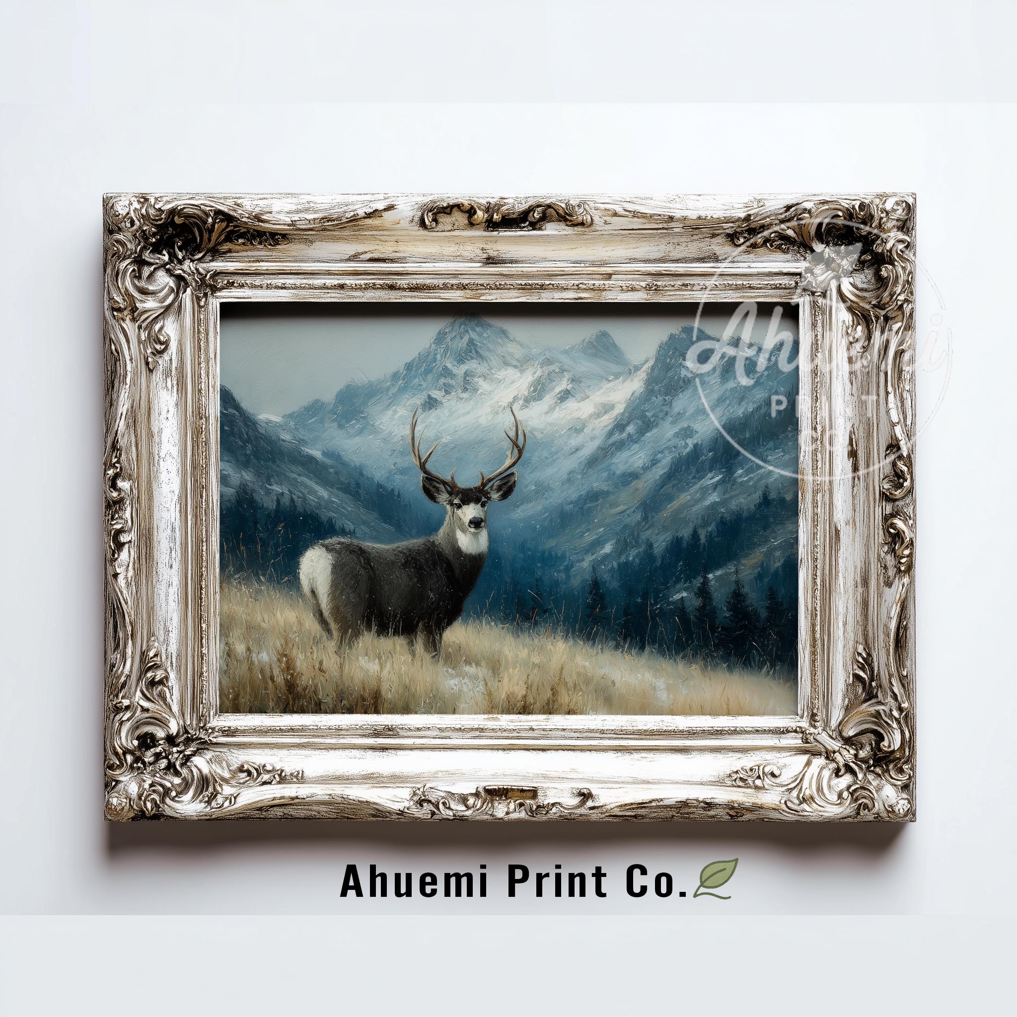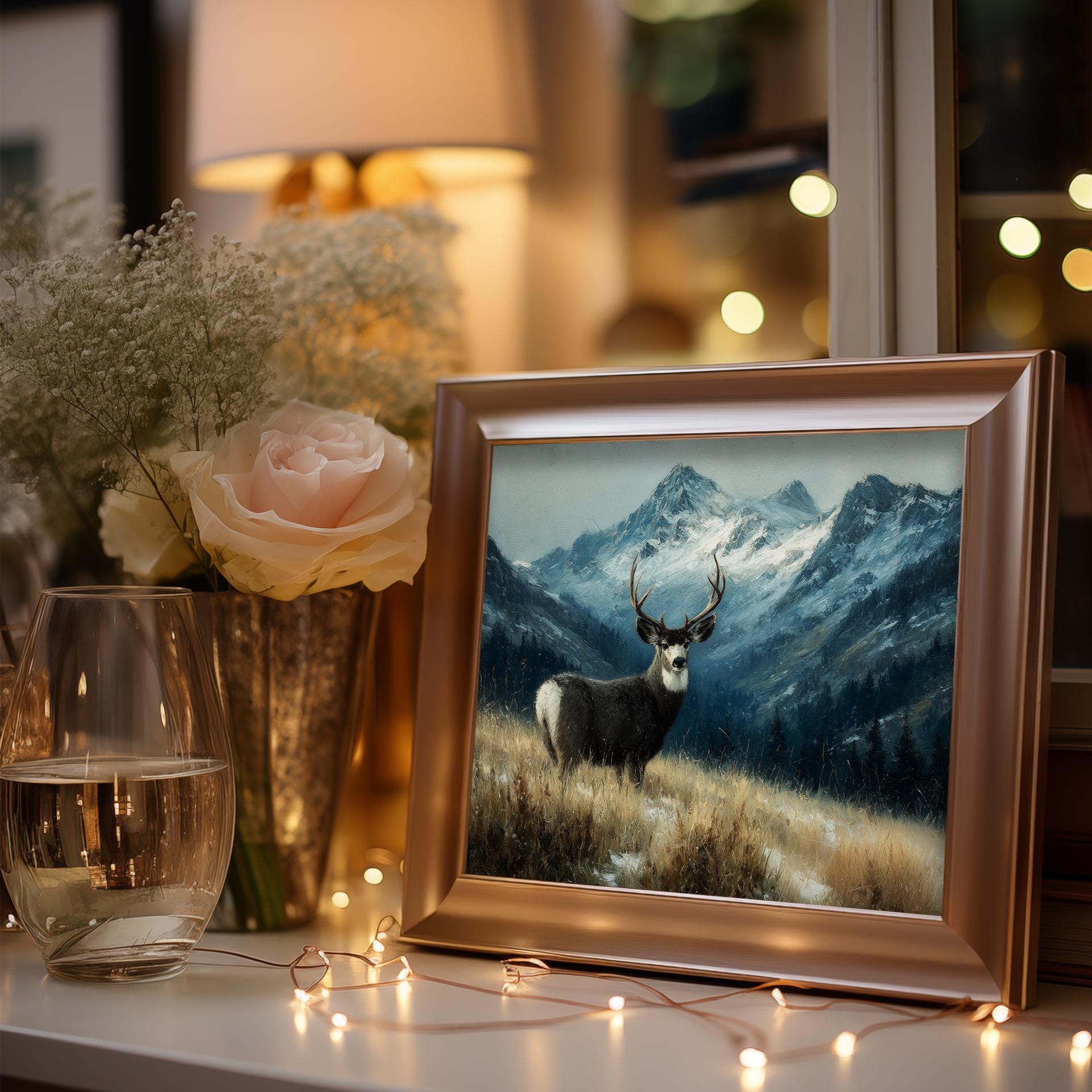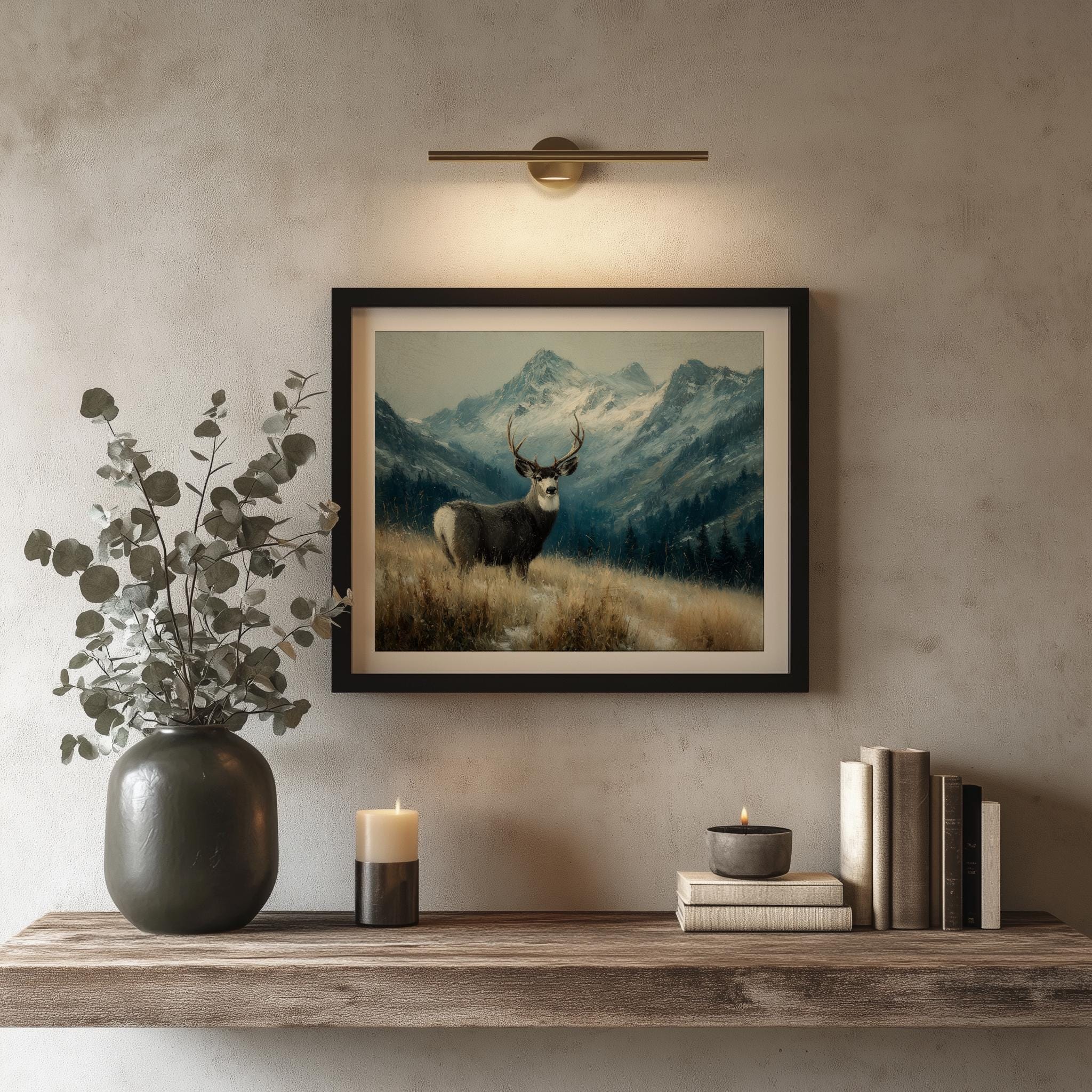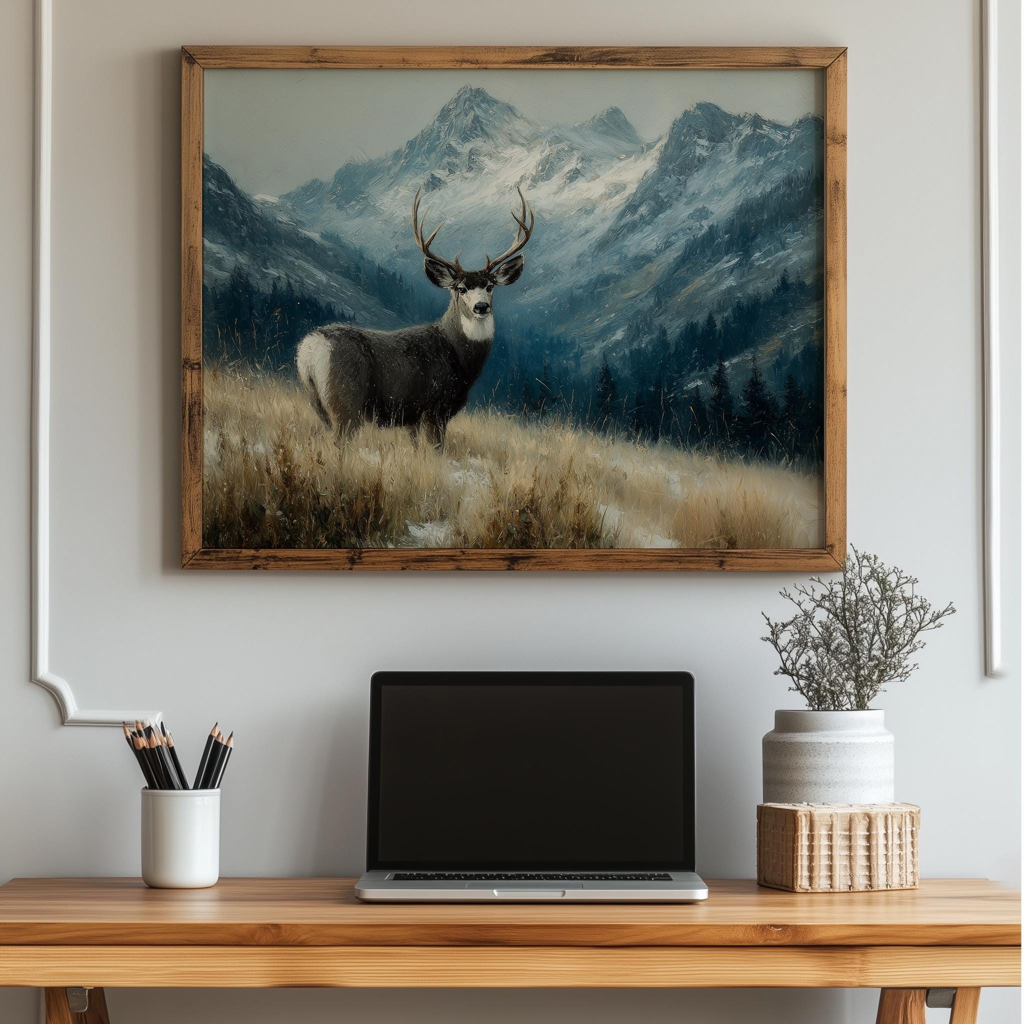 Immerse yourself in the charm with this rustic painting of a majestic mule deer stag in a tranquil meadow. An instantly downloadable print, it's perfect for elevating your decor with budget-friendly charm. This gives you the flexibility to customize the size, frame, and material according to your personal taste and space, ensuring a perfect fit for your walls.