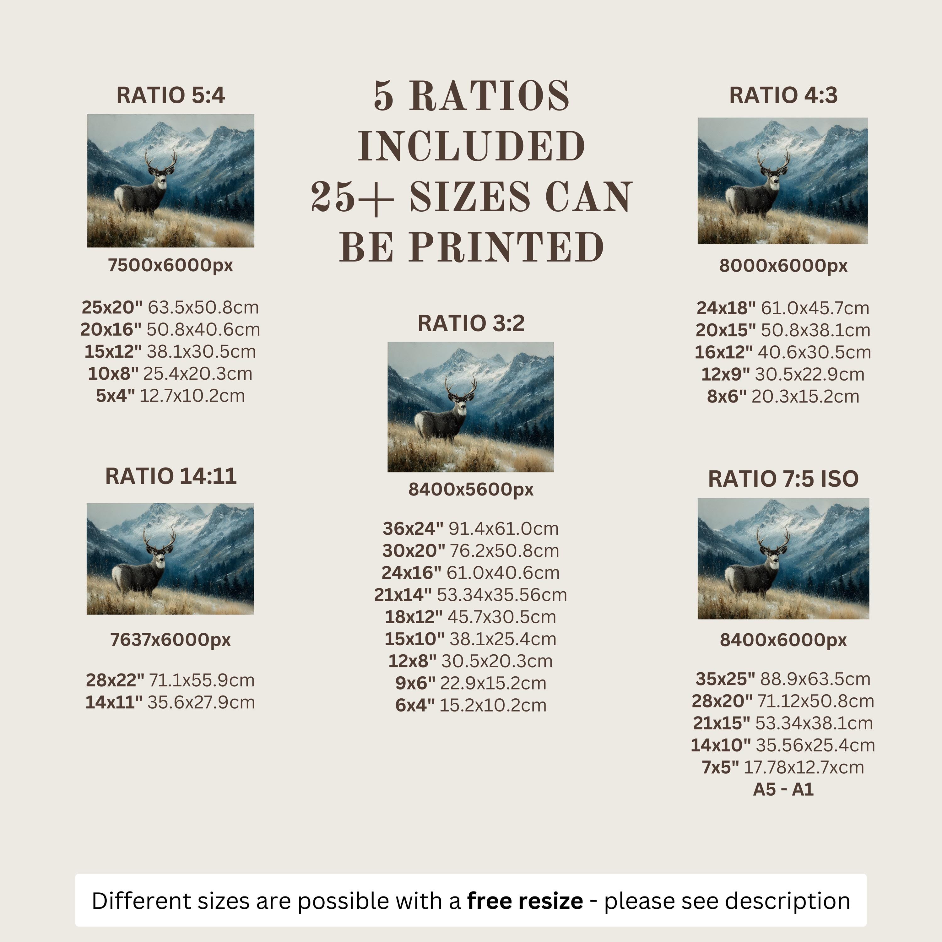 Each artwork includes 5 aspect ratios with 25+ print sizes. Most standard frames are covered. One custom resize per purchase available—message before ordering.