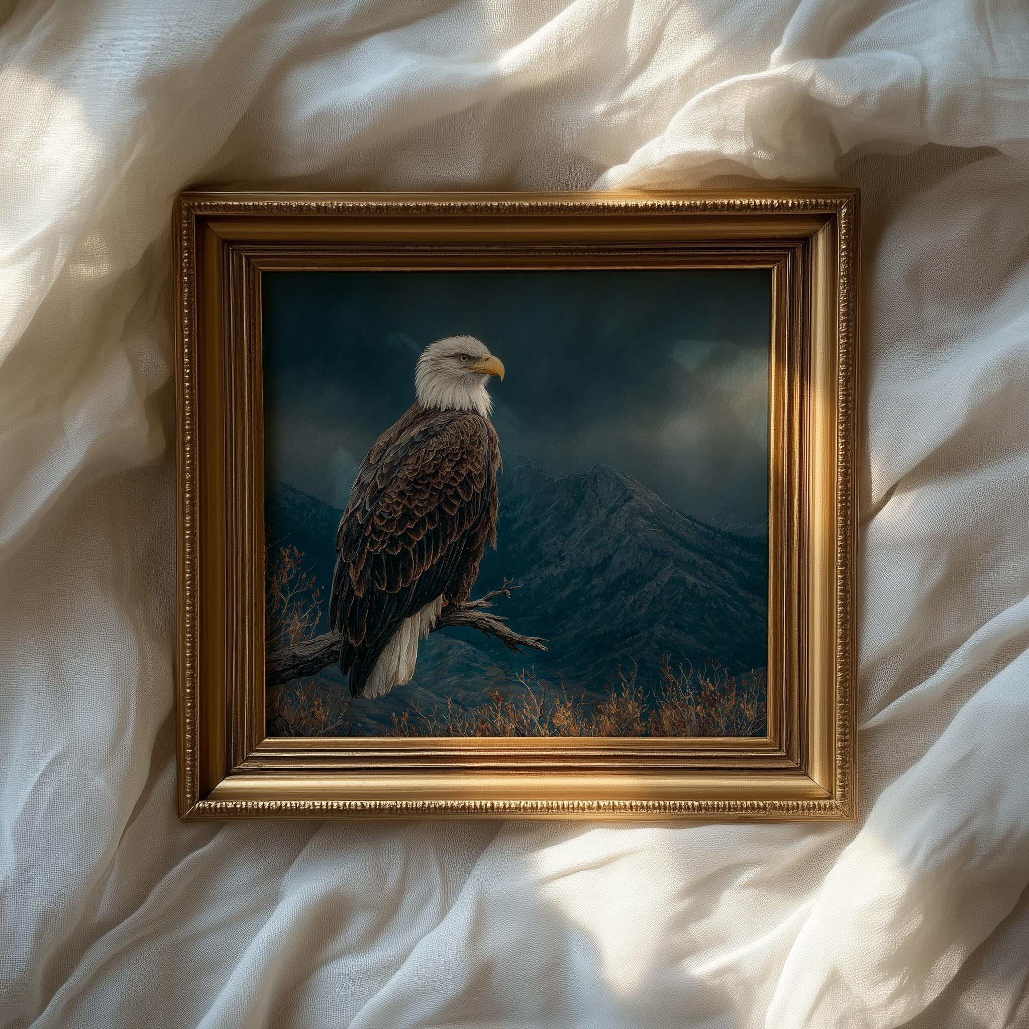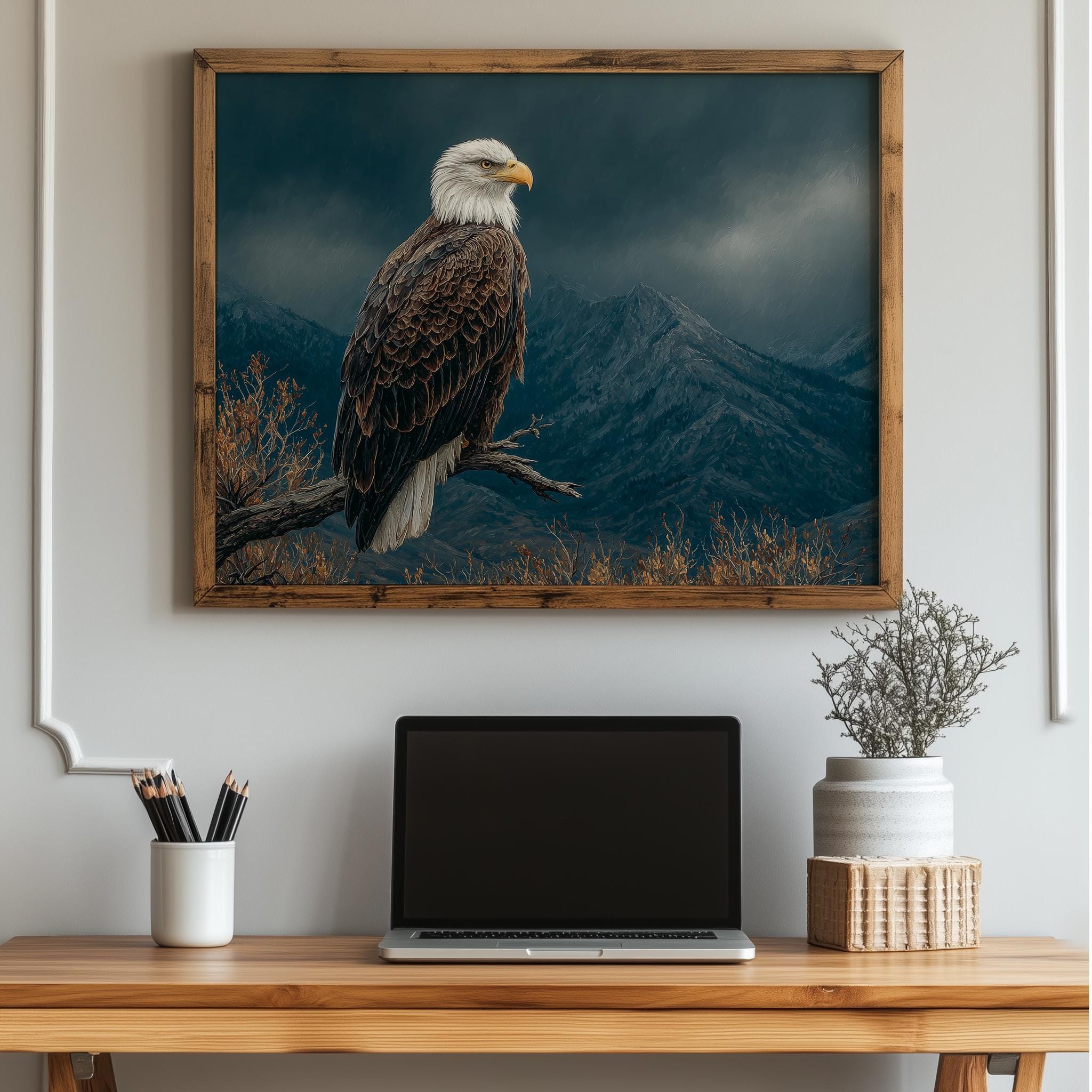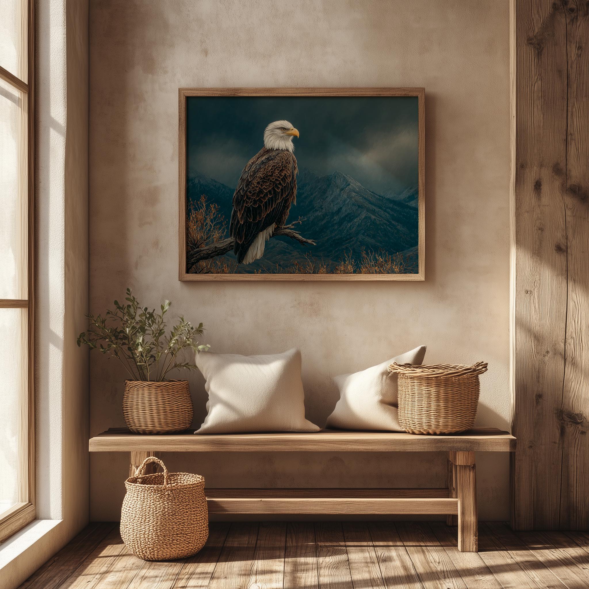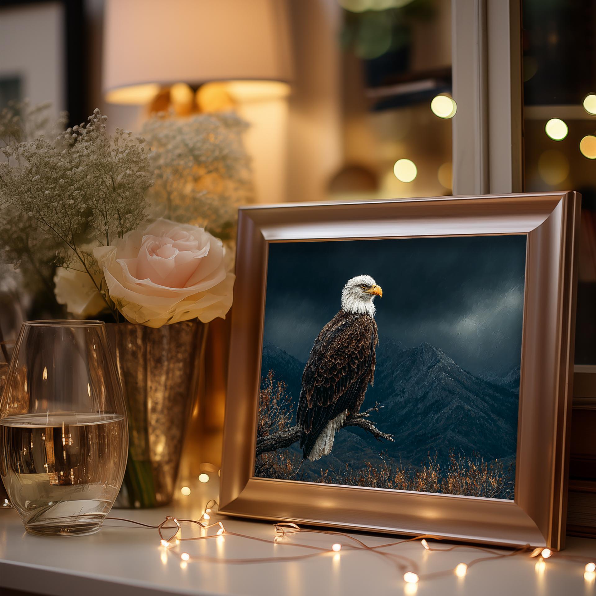 Immerse yourself in the charm with this rustic painting of a majestic bald eagle soaring through a moonlit night sky. An instantly downloadable print, it's perfect for elevating your decor with budget-friendly charm. This gives you the flexibility to customize the size, frame, and material according to your personal taste and space, ensuring a perfect fit for your walls.