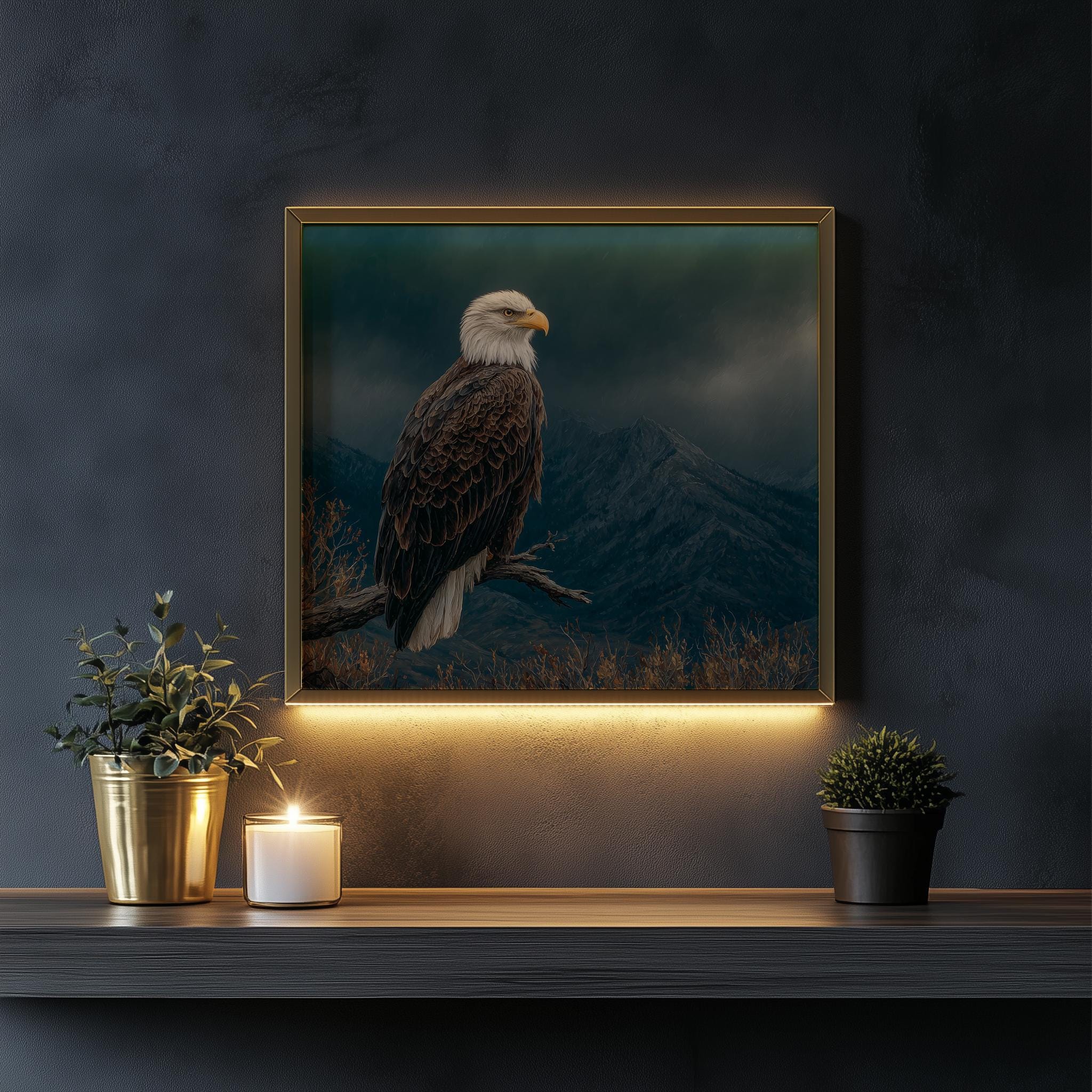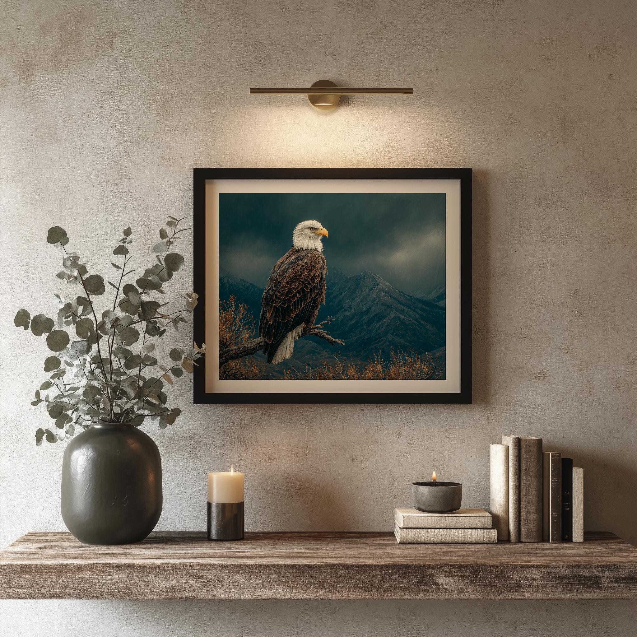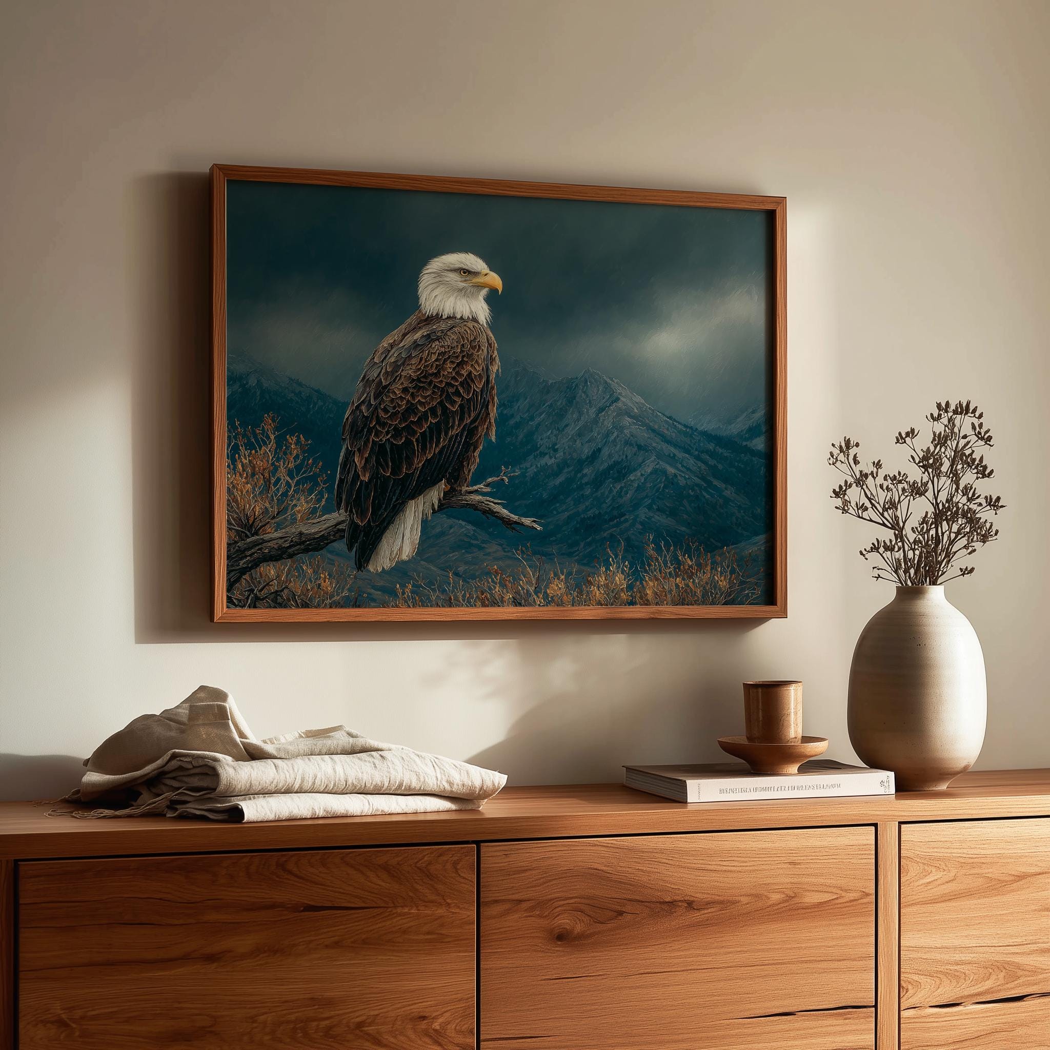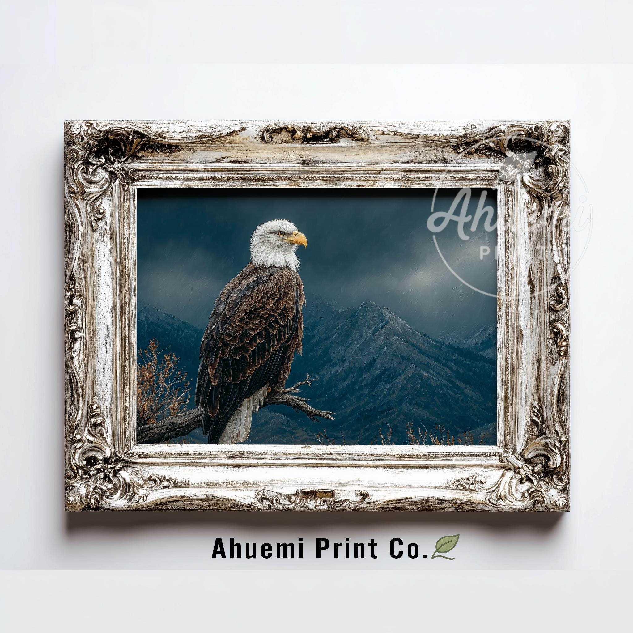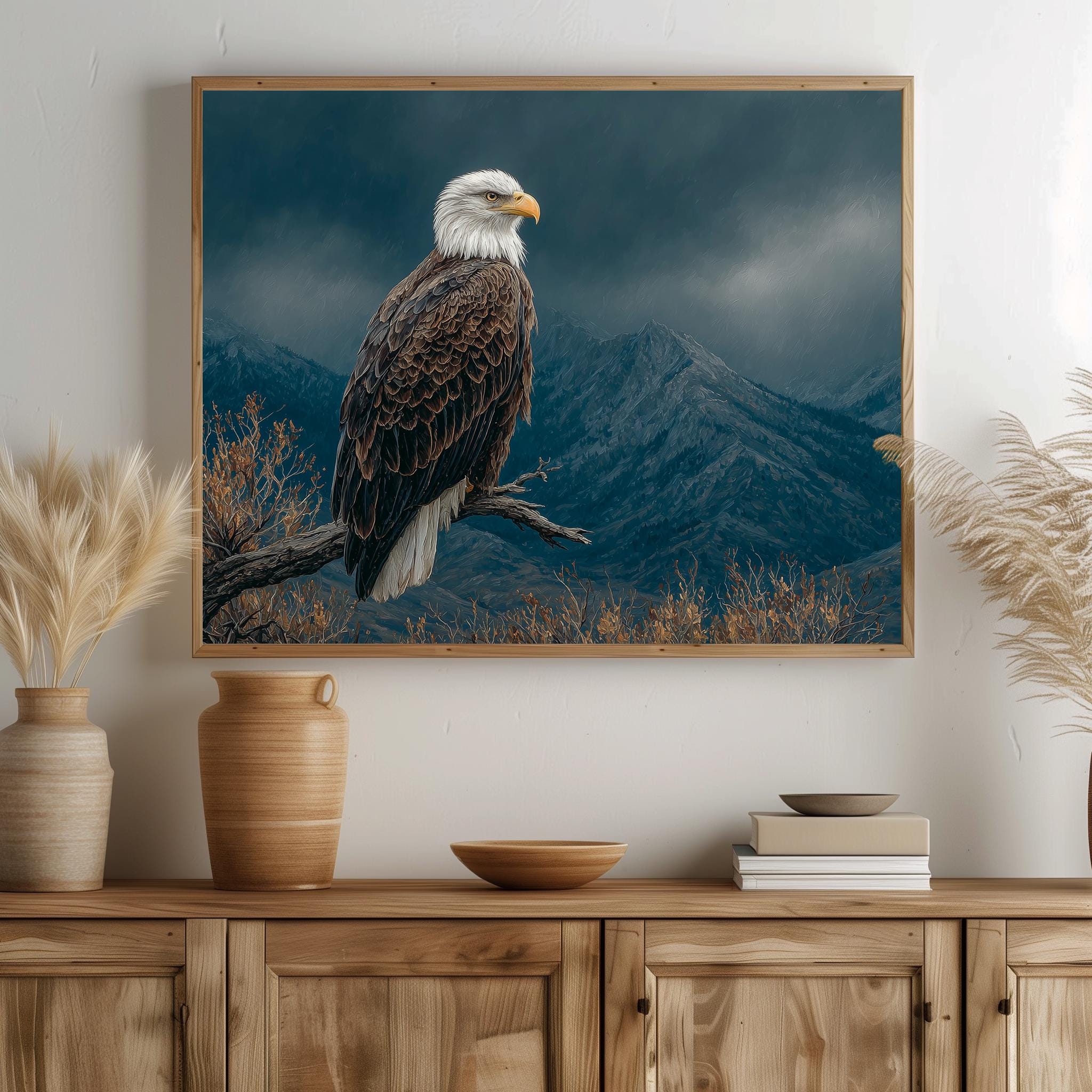 Immerse yourself in the charm with this rustic painting of a majestic bald eagle soaring through a moonlit night sky. An instantly downloadable print, it's perfect for elevating your decor with budget-friendly charm. This gives you the flexibility to customize the size, frame, and material according to your personal taste and space, ensuring a perfect fit for your walls.