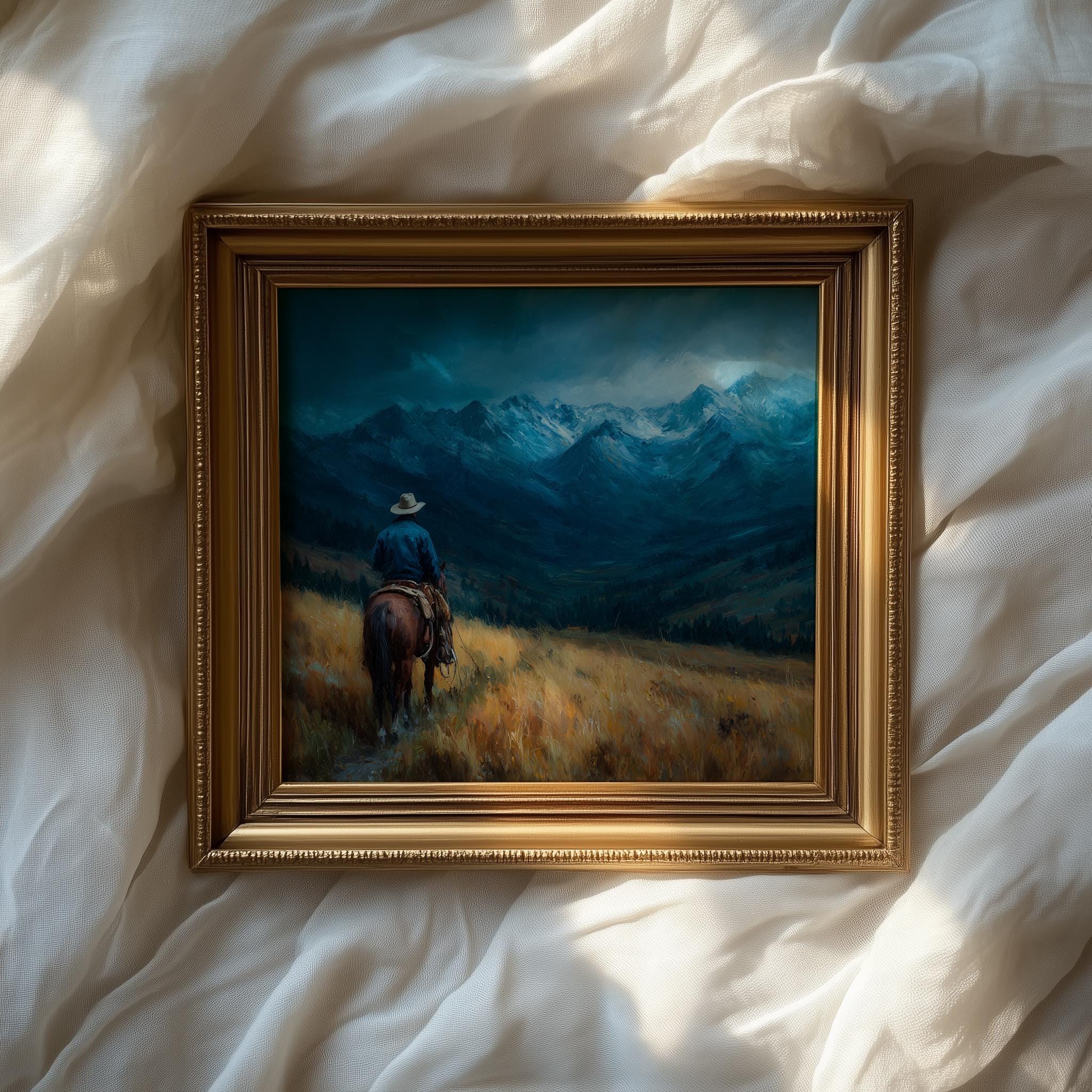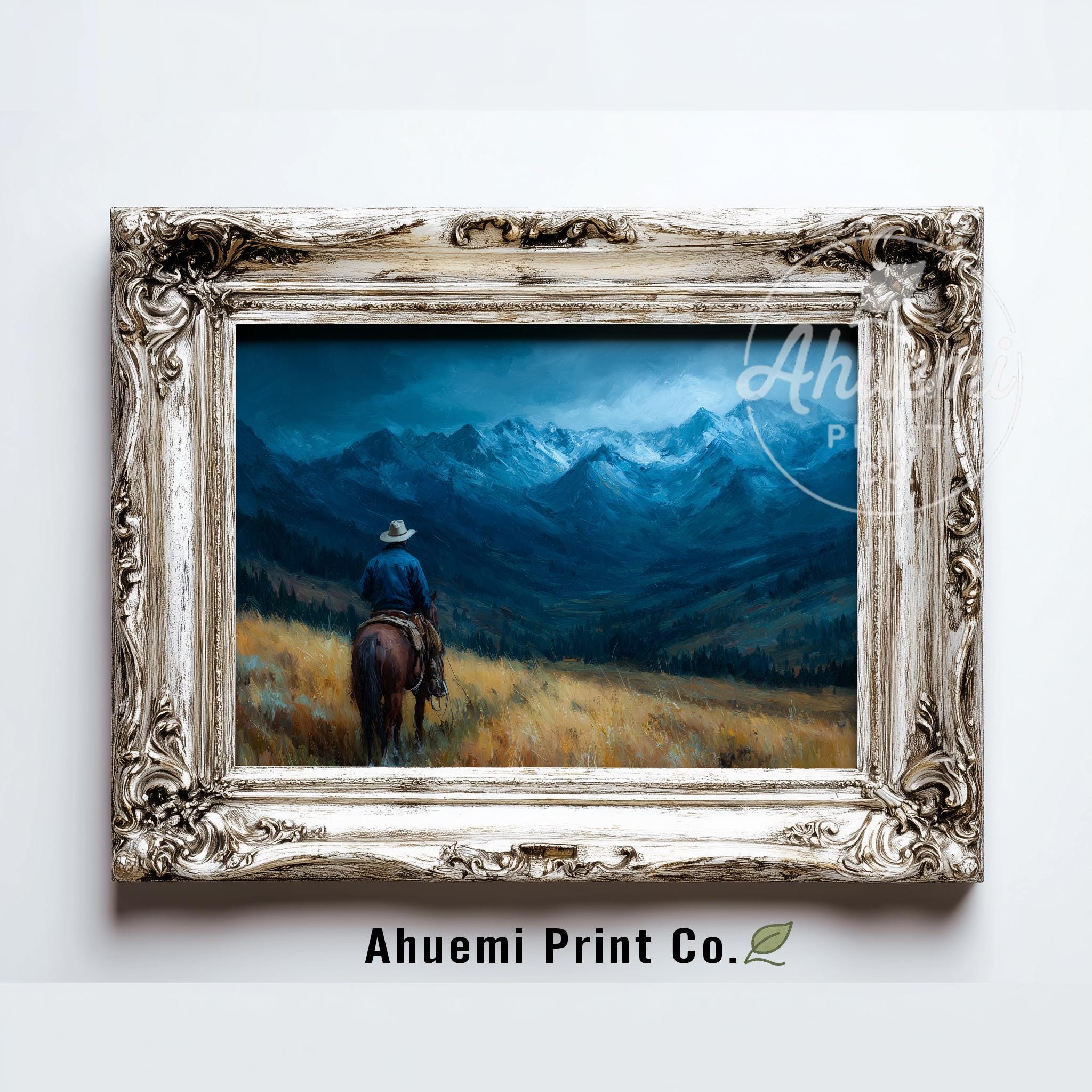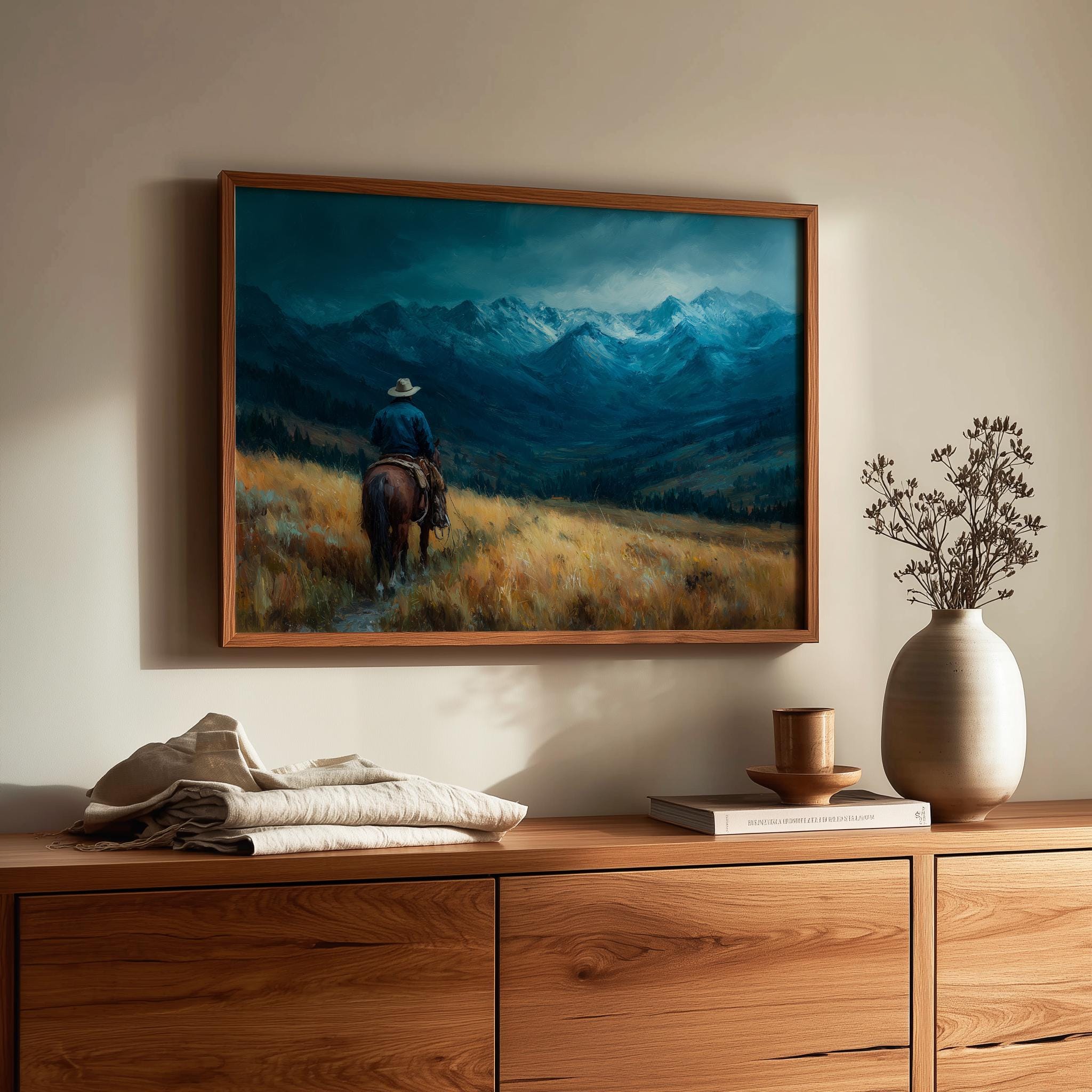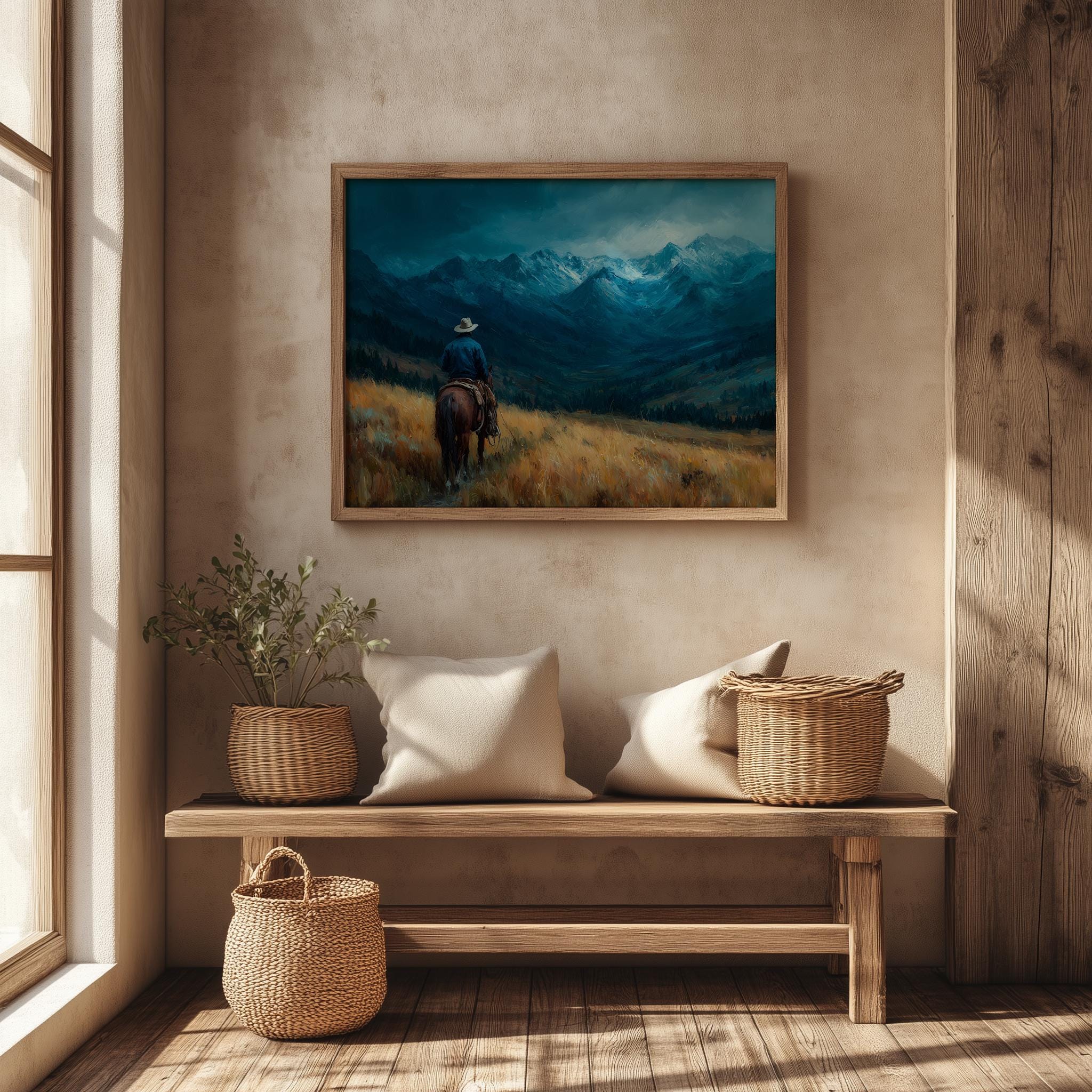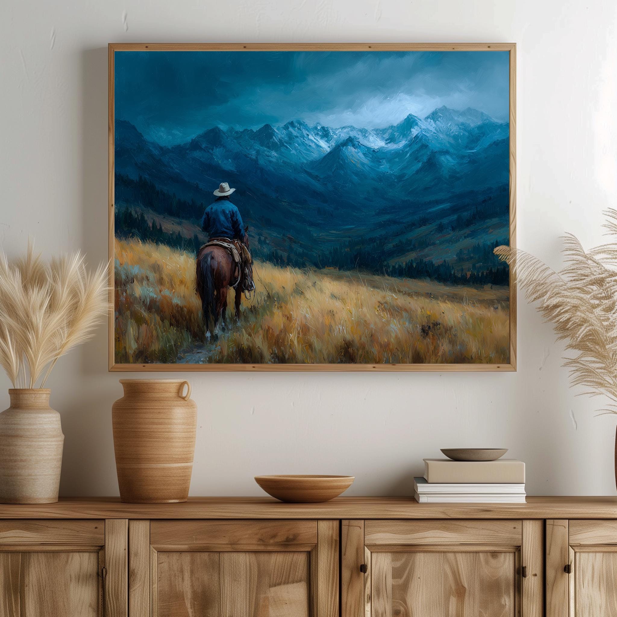 Immerse yourself in the charm with this rustic painting of a lone rider traversing a serene mountain valley. An instantly downloadable print, it's perfect for elevating your decor with budget-friendly charm. This gives you the flexibility to customize the size, frame, and material according to your personal taste and space, ensuring a perfect fit for your walls.