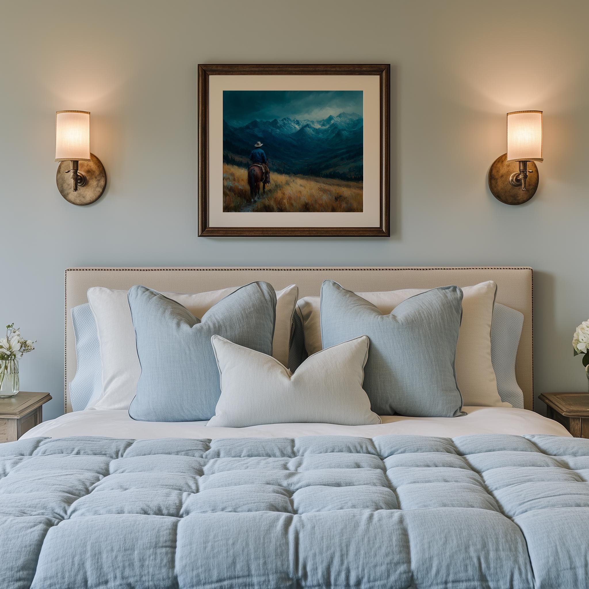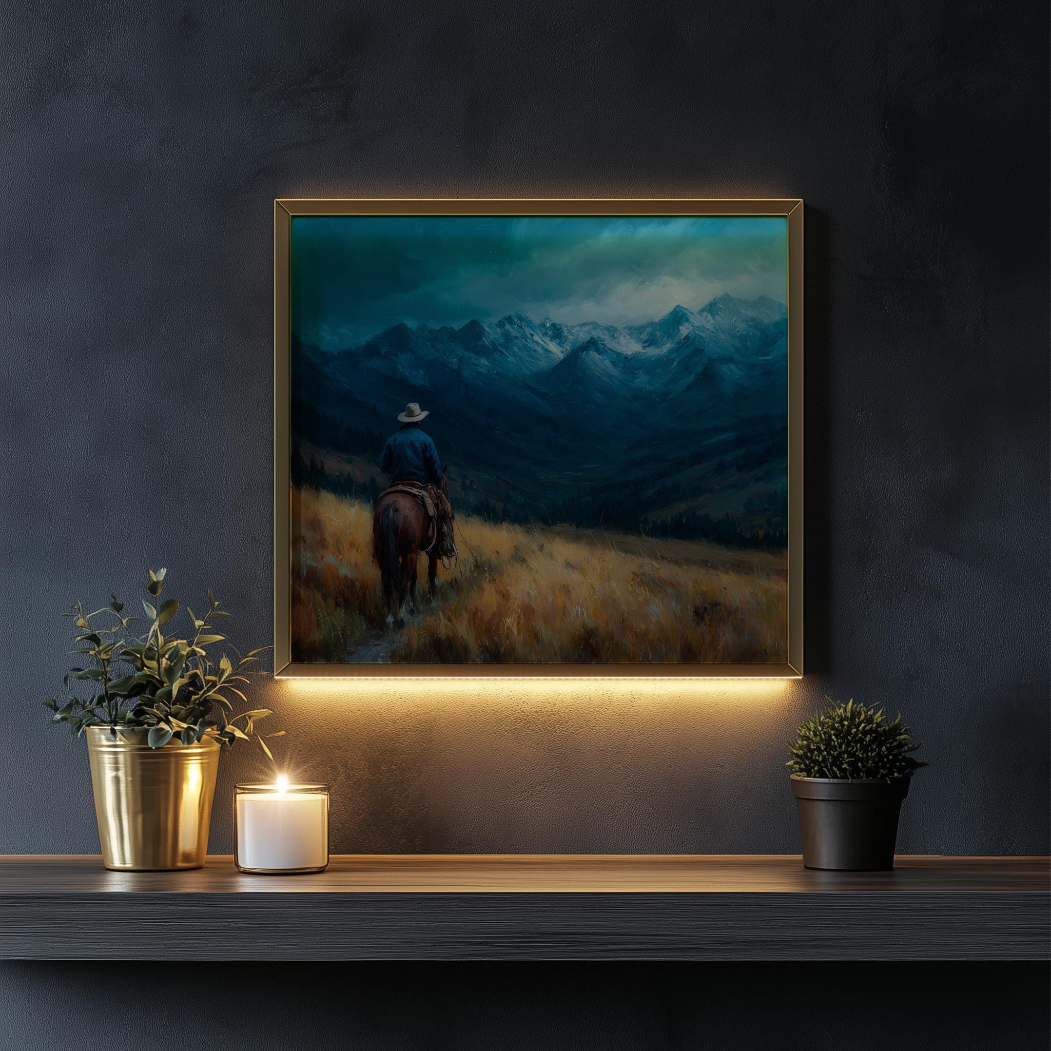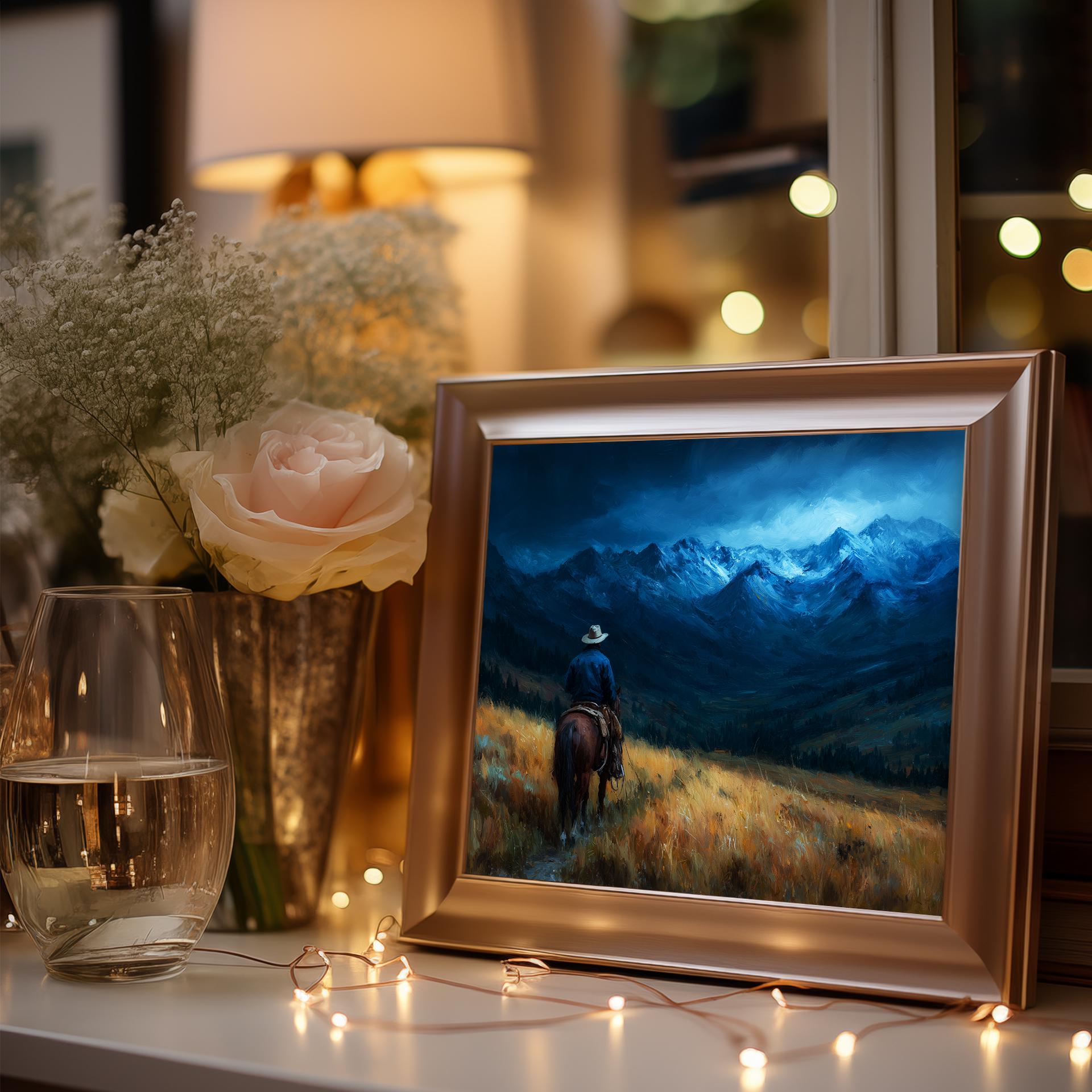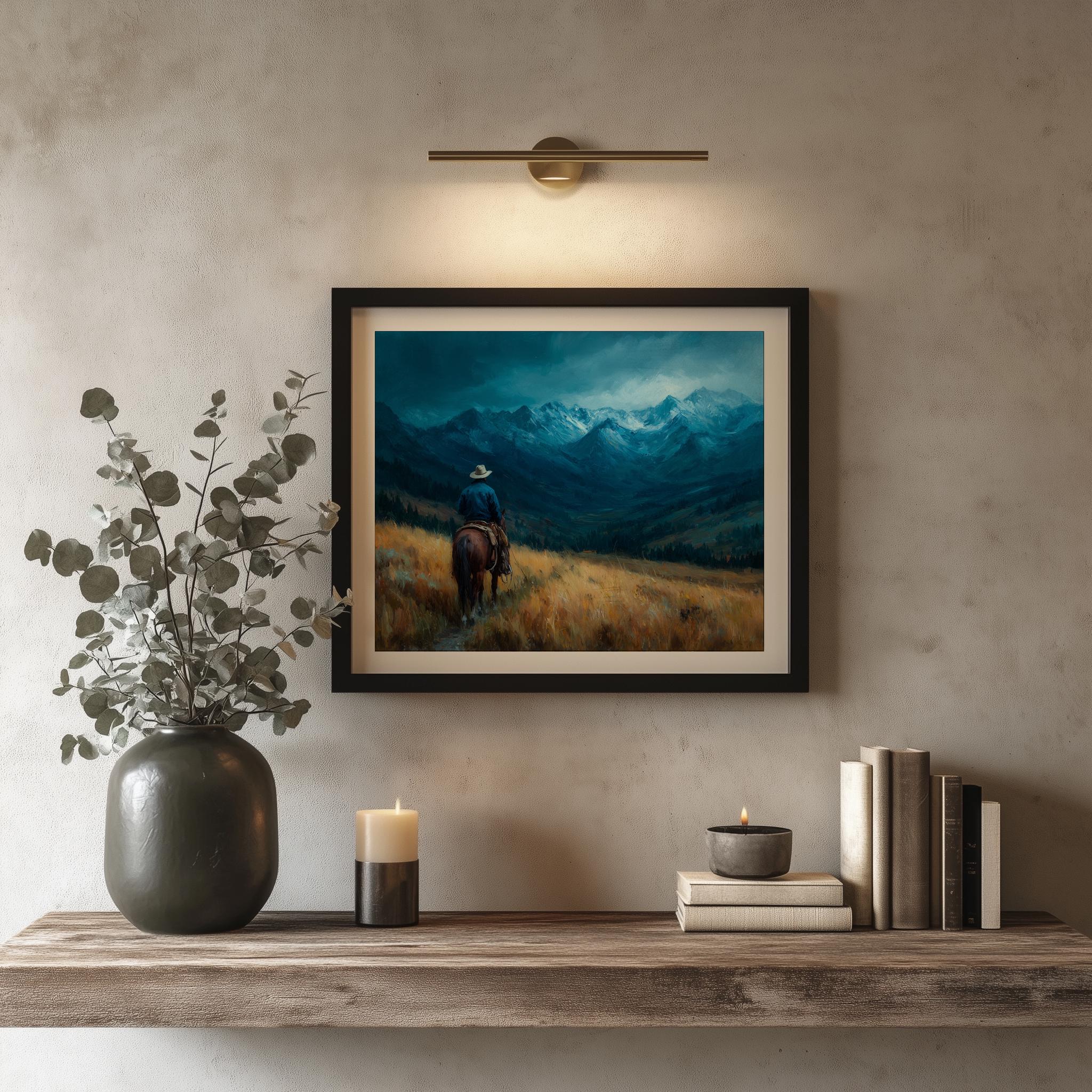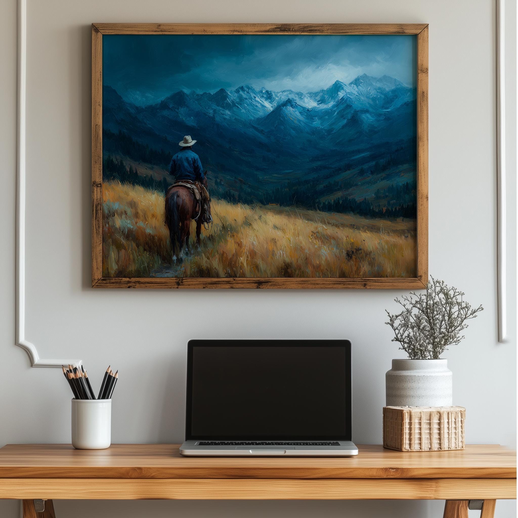 Immerse yourself in the charm with this rustic painting of a lone rider traversing a serene mountain valley. An instantly downloadable print, it's perfect for elevating your decor with budget-friendly charm. This gives you the flexibility to customize the size, frame, and material according to your personal taste and space, ensuring a perfect fit for your walls.
