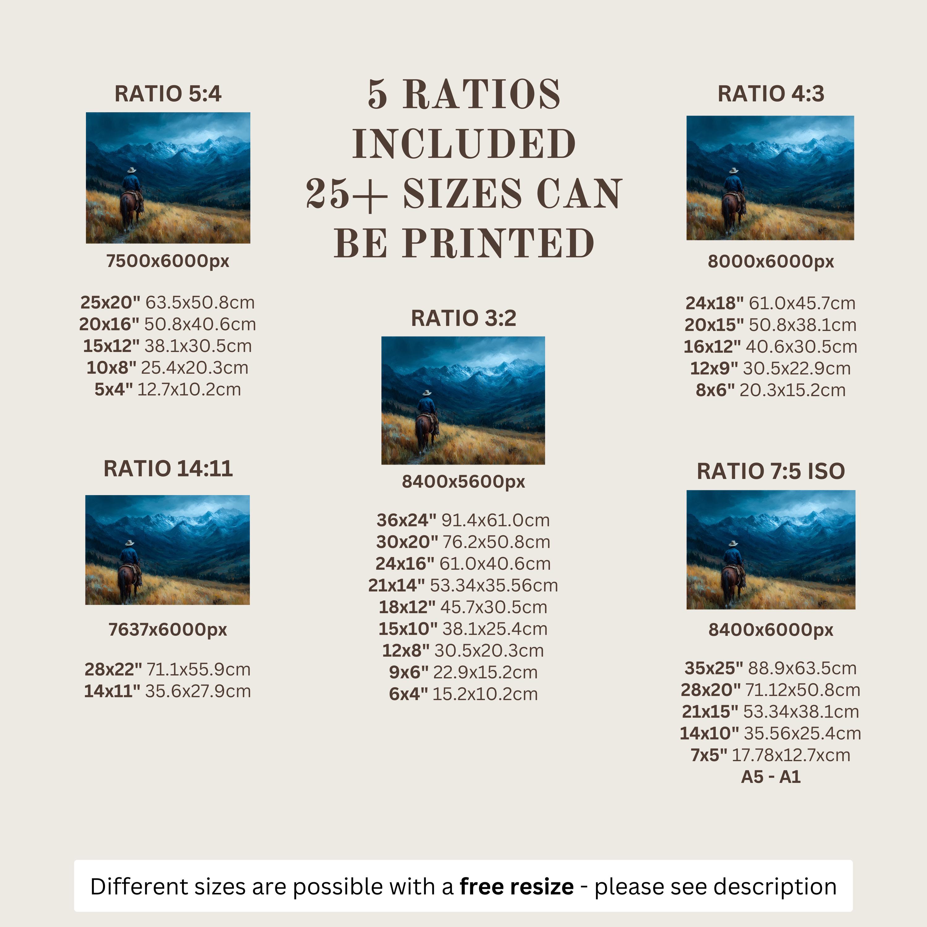 Each artwork includes 5 aspect ratios with 25+ print sizes. Most standard frames are covered. One custom resize per purchase available—message before ordering.