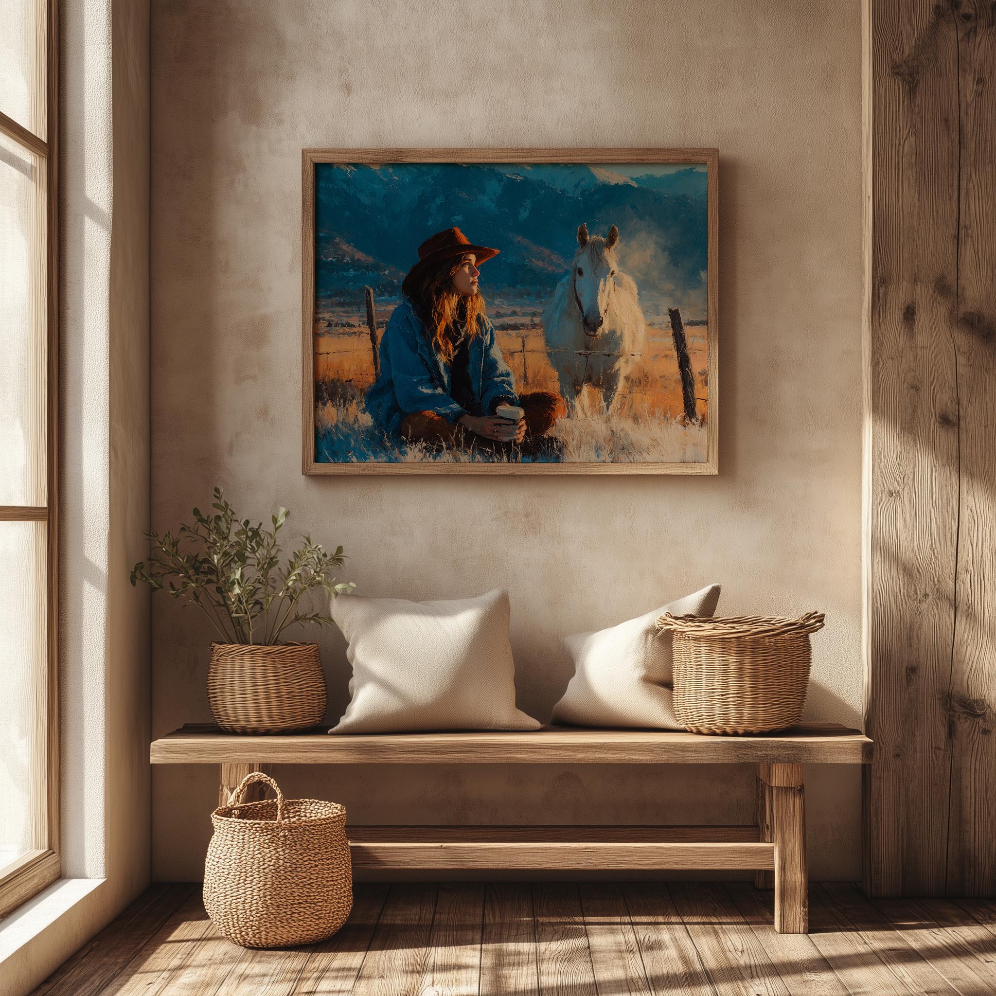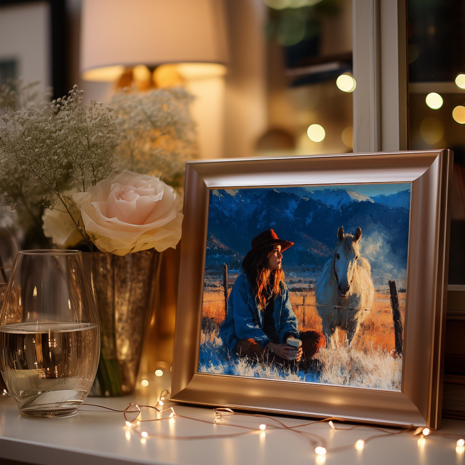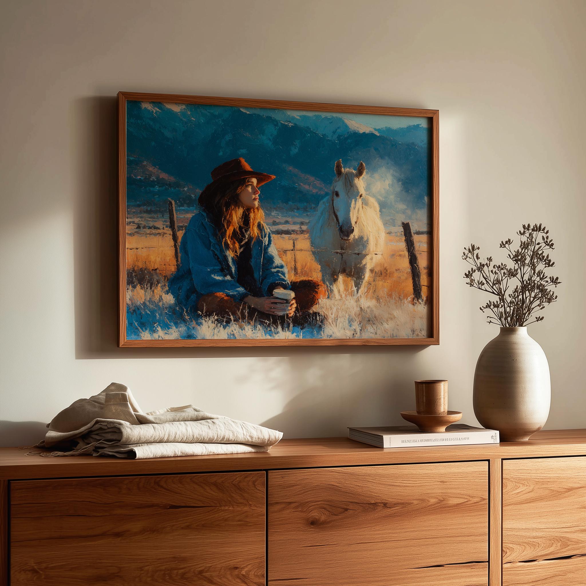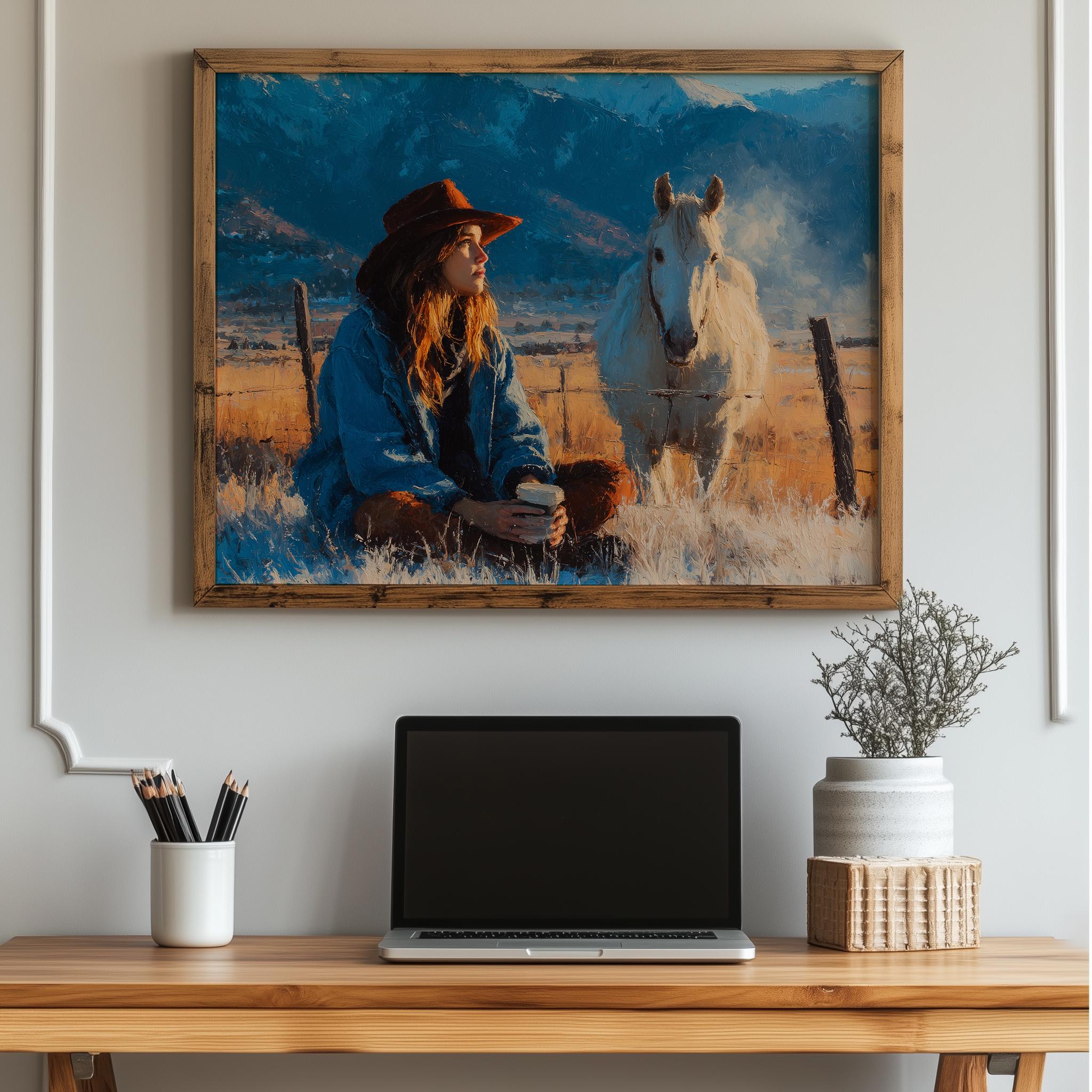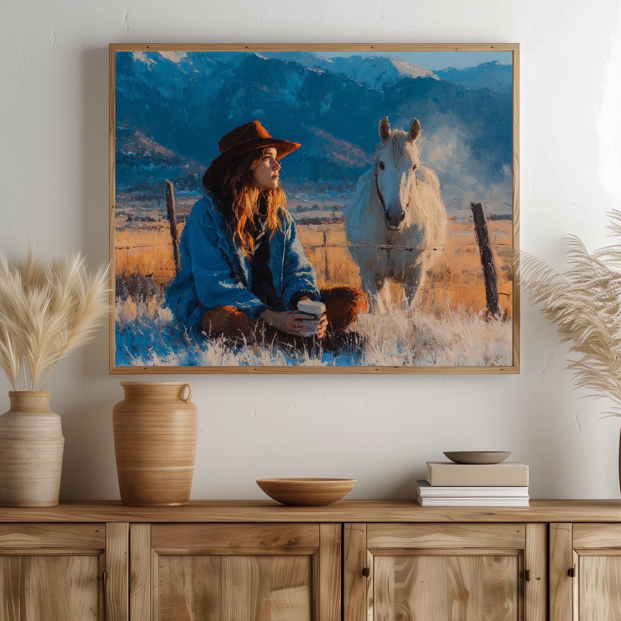 Immerse yourself in the charm with this rustic painting of a cowgirl and her horse in a frost-dusted field. An instantly downloadable print, it's perfect for elevating your decor with budget-friendly charm. This gives you the flexibility to customize the size, frame, and material according to your personal taste and space, ensuring a perfect fit for your walls.