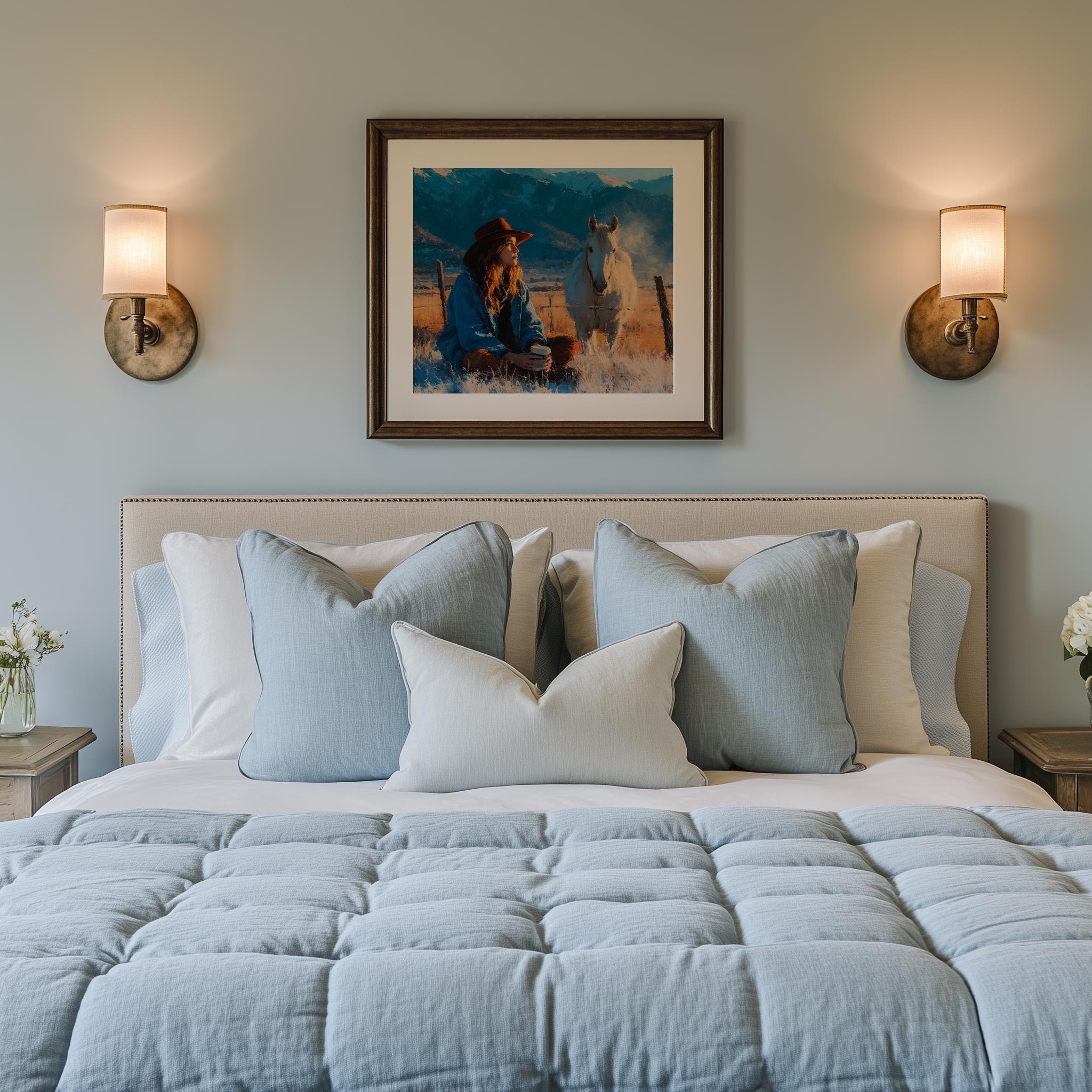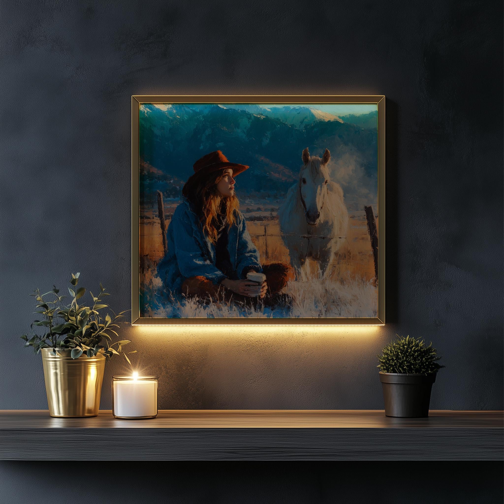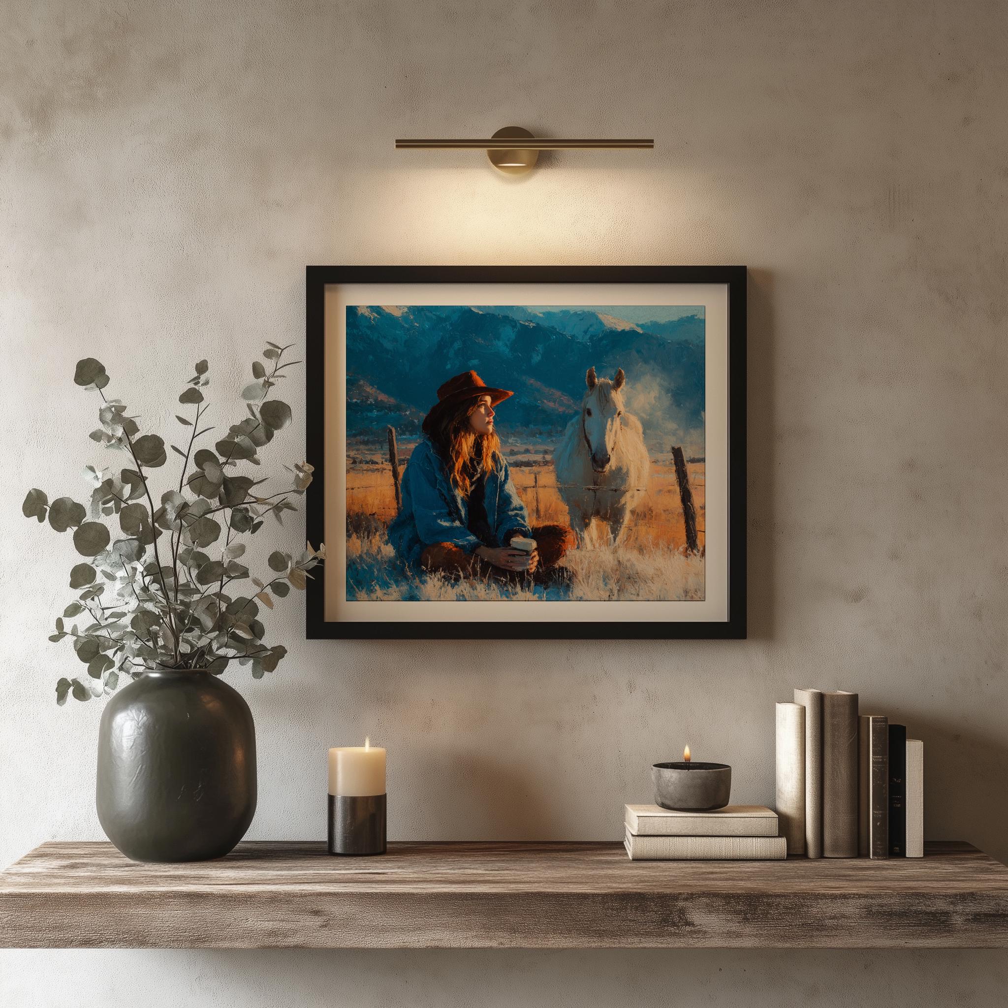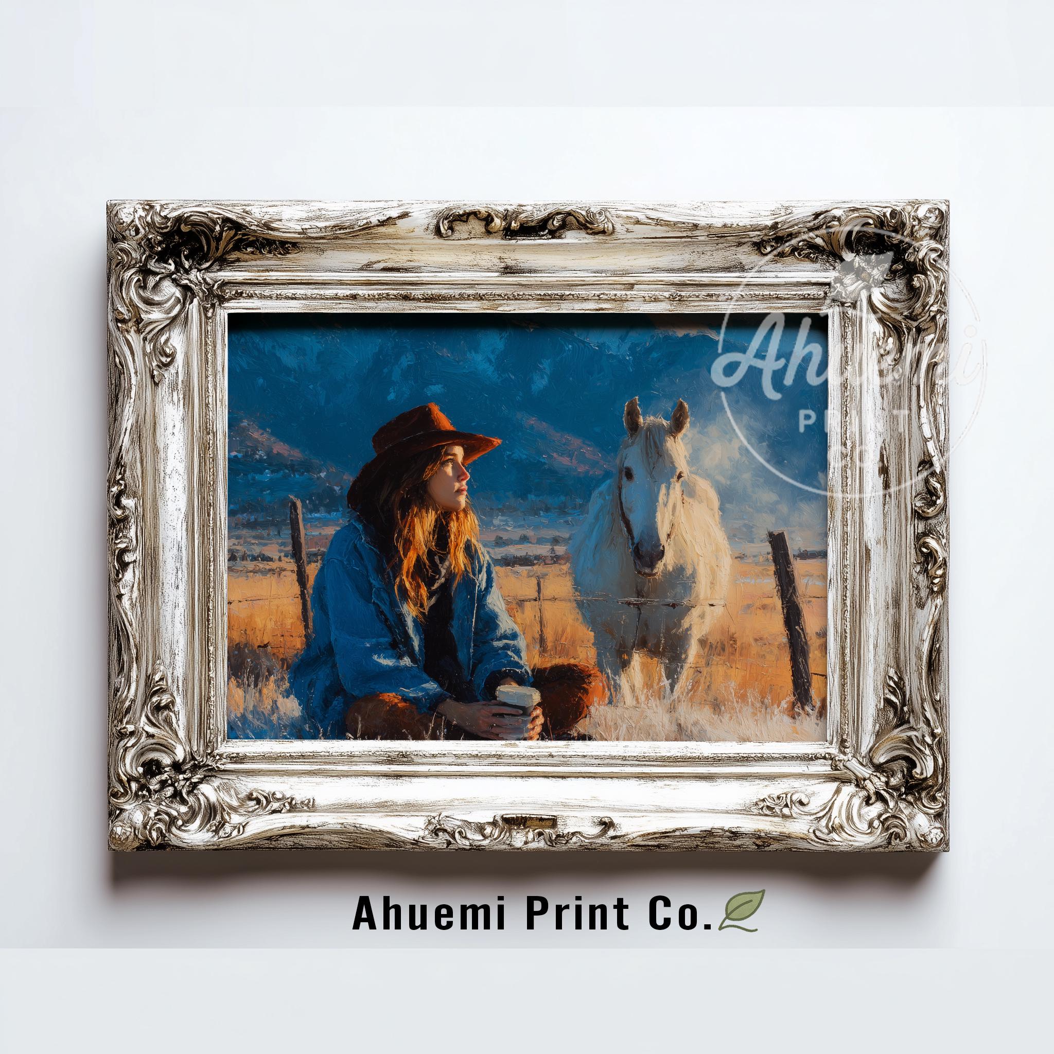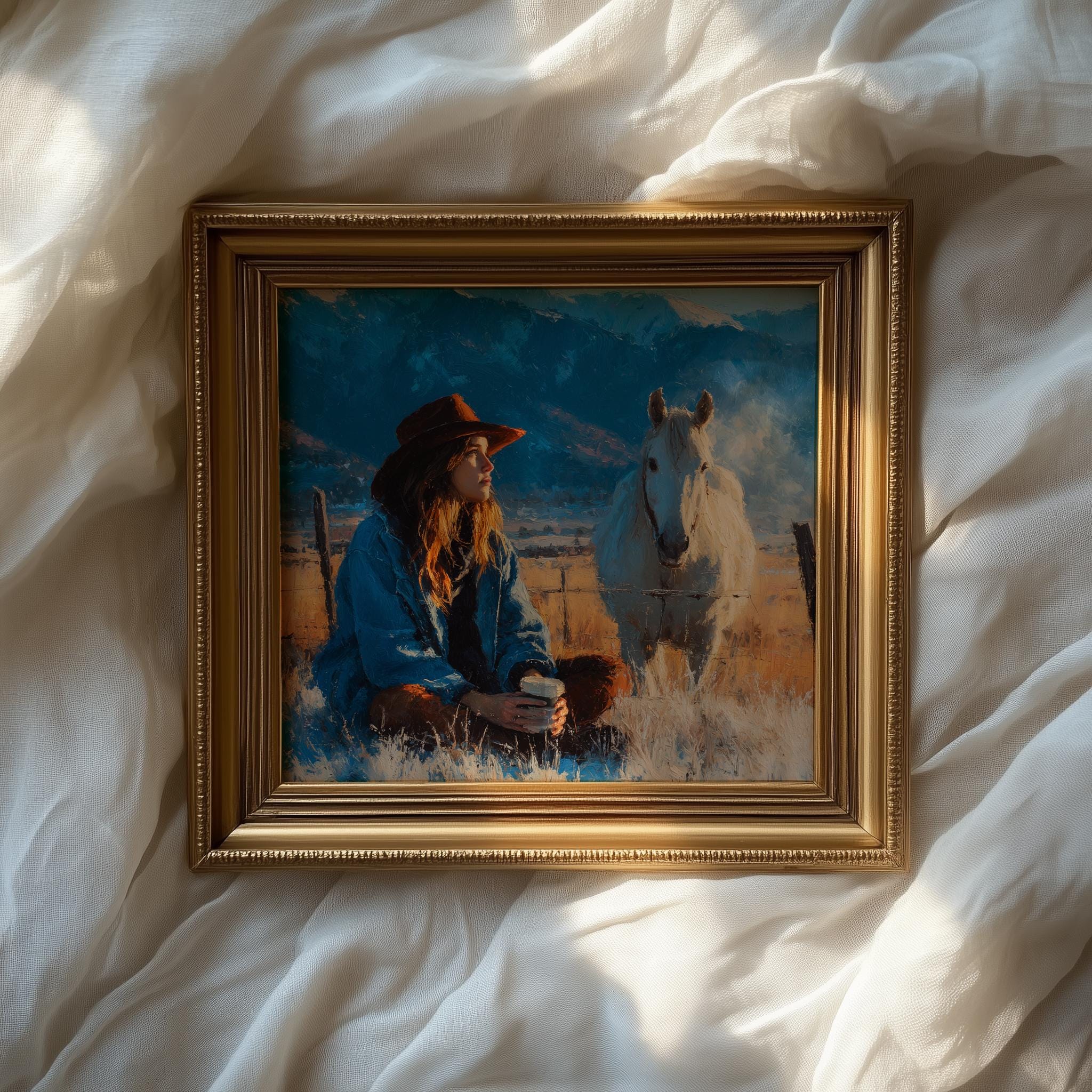 Immerse yourself in the charm with this rustic painting of a cowgirl and her horse in a frost-dusted field. An instantly downloadable print, it's perfect for elevating your decor with budget-friendly charm. This gives you the flexibility to customize the size, frame, and material according to your personal taste and space, ensuring a perfect fit for your walls.