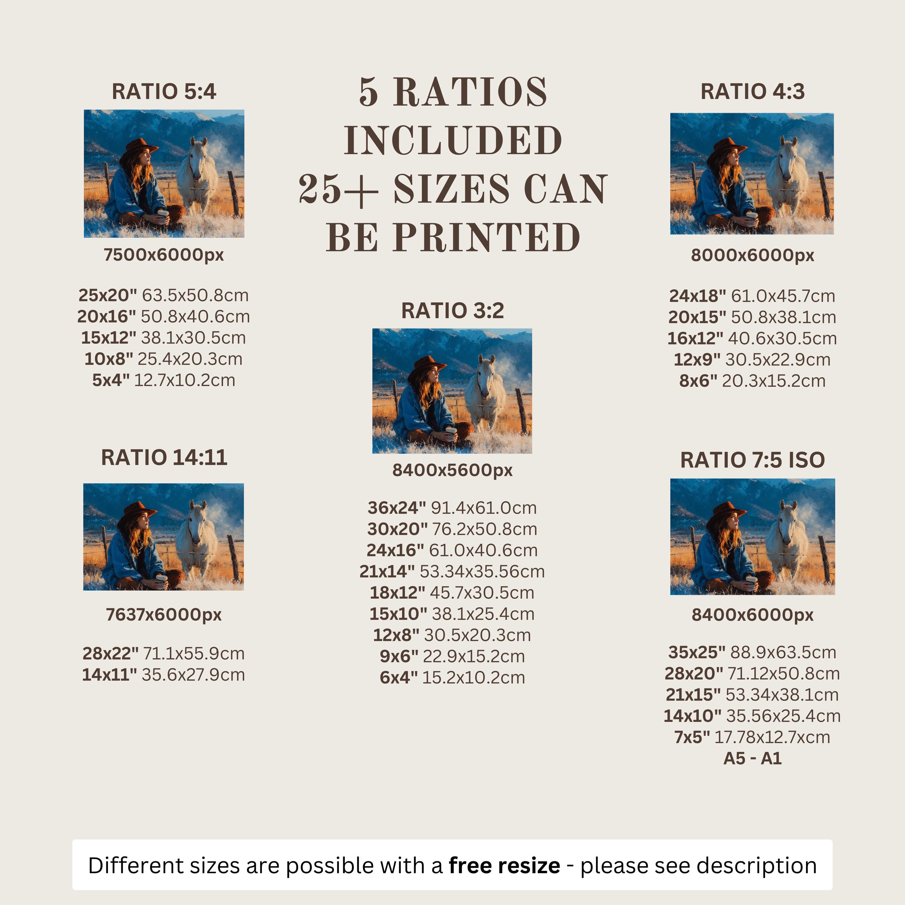 Each artwork includes 5 aspect ratios with 25+ print sizes. Most standard frames are covered. One custom resize per purchase available—message before ordering.