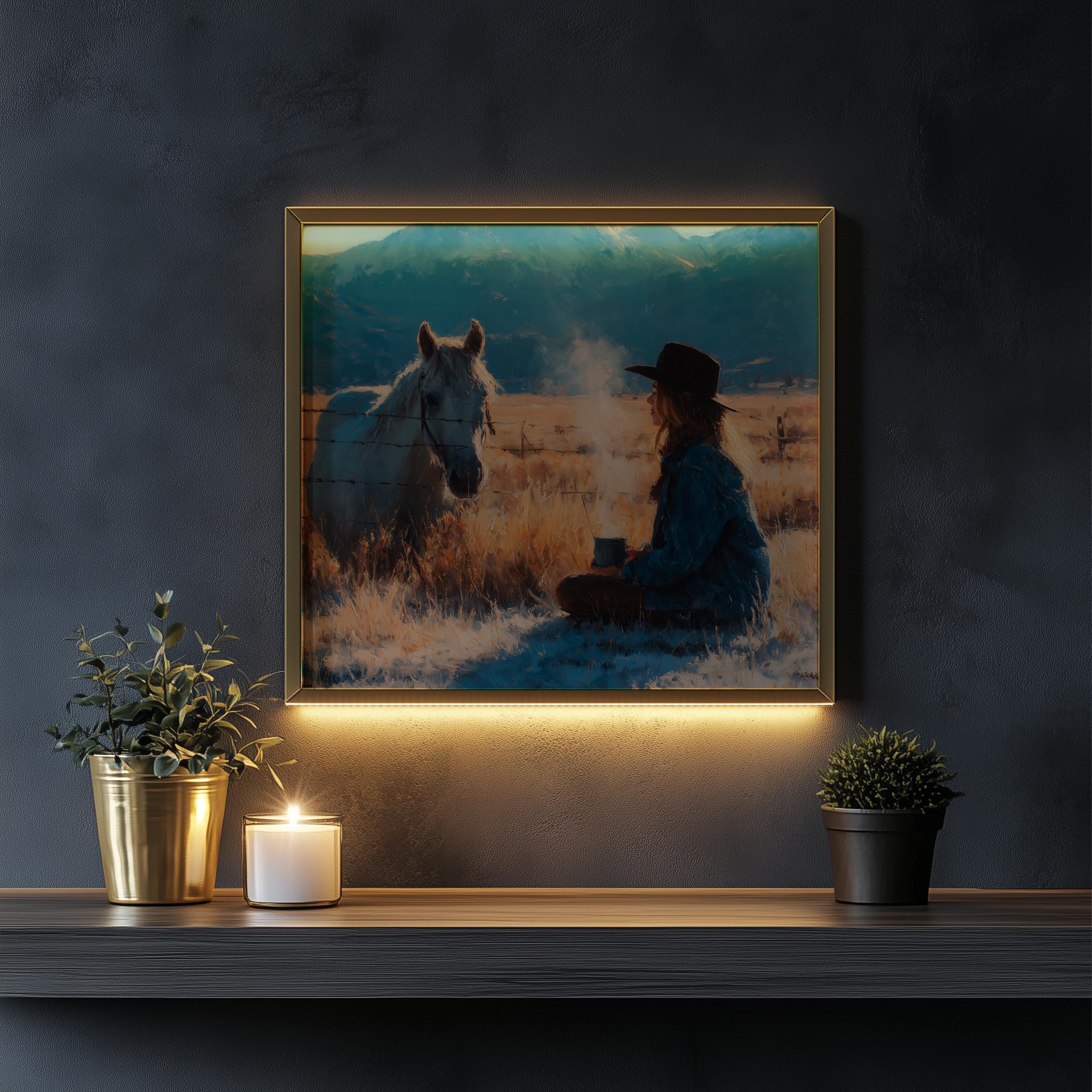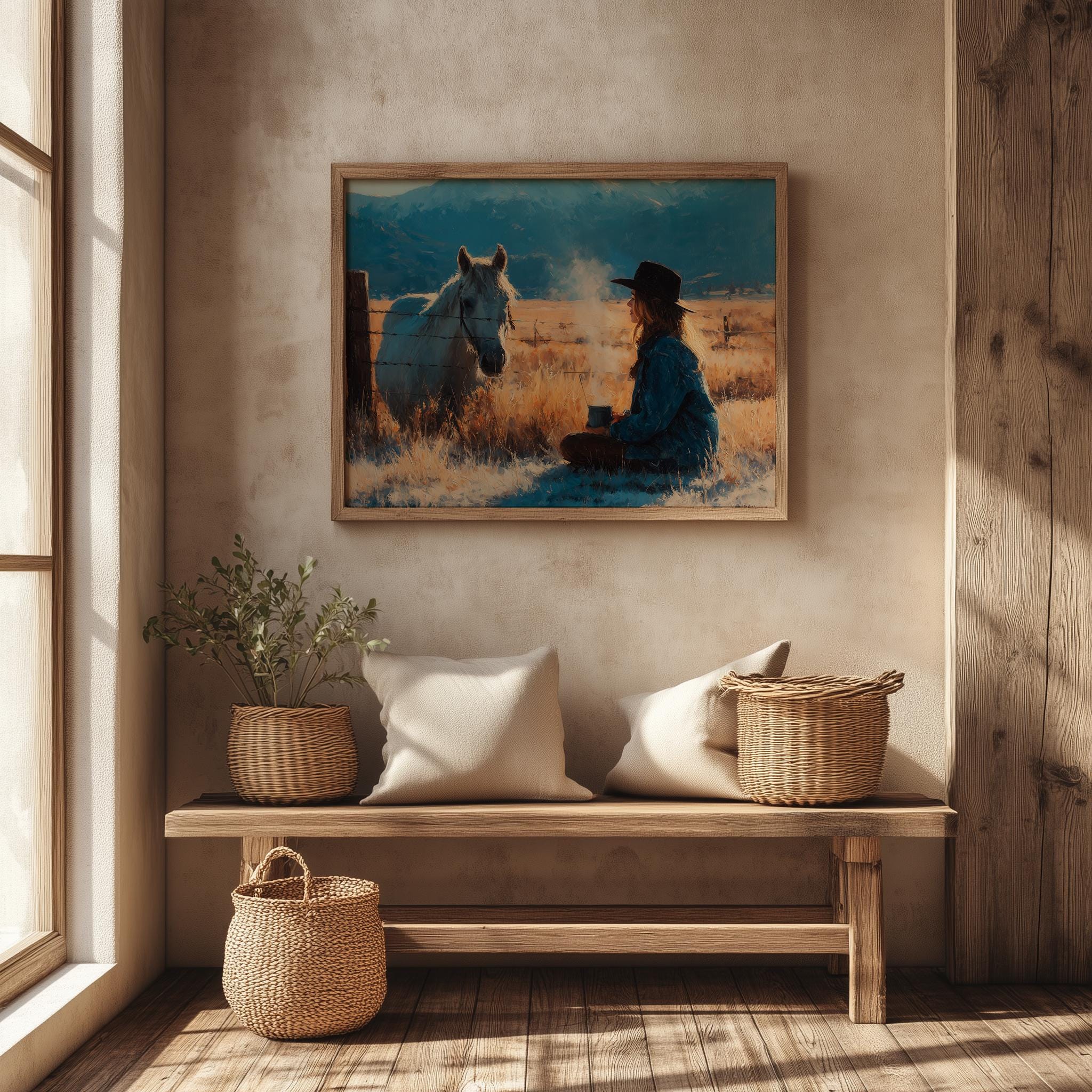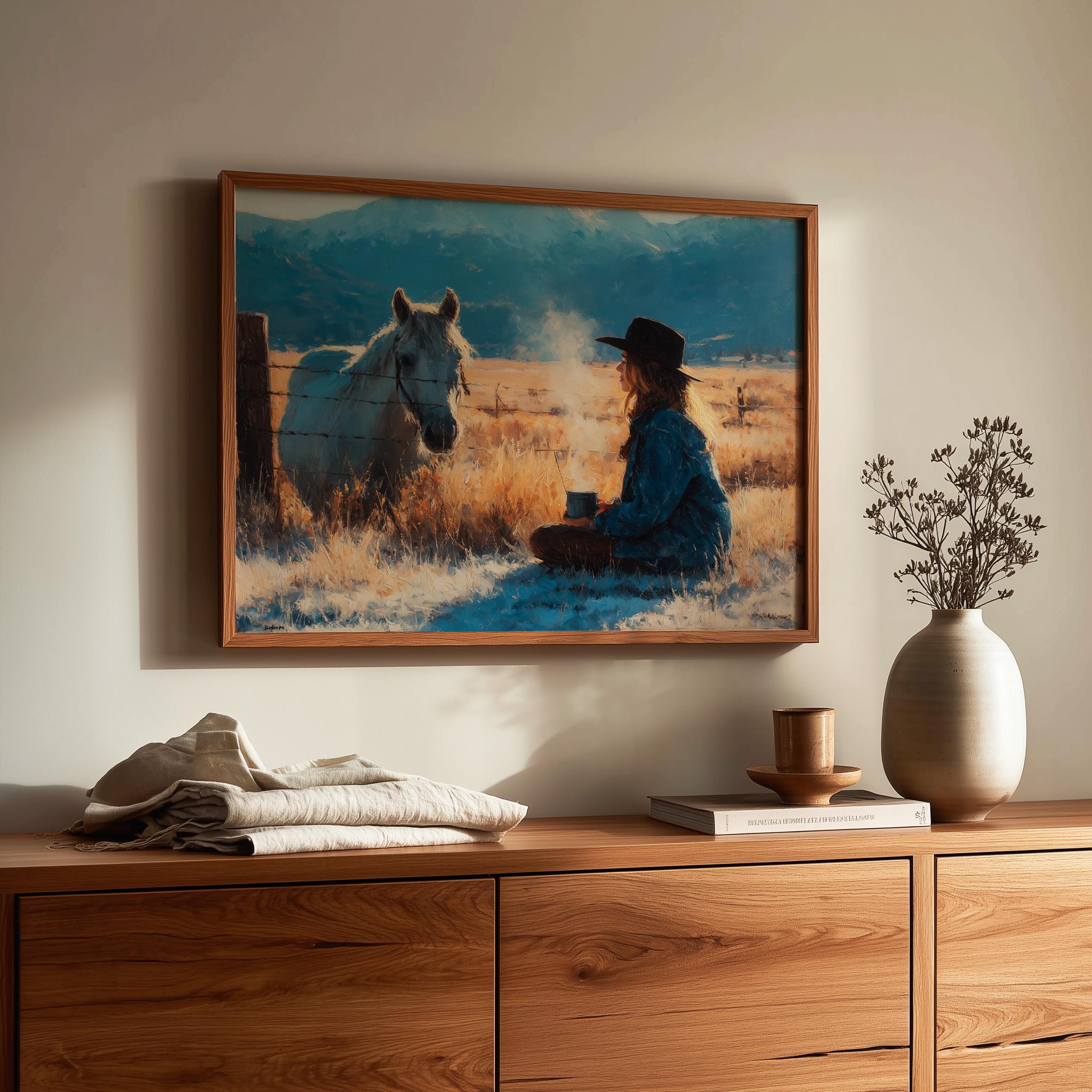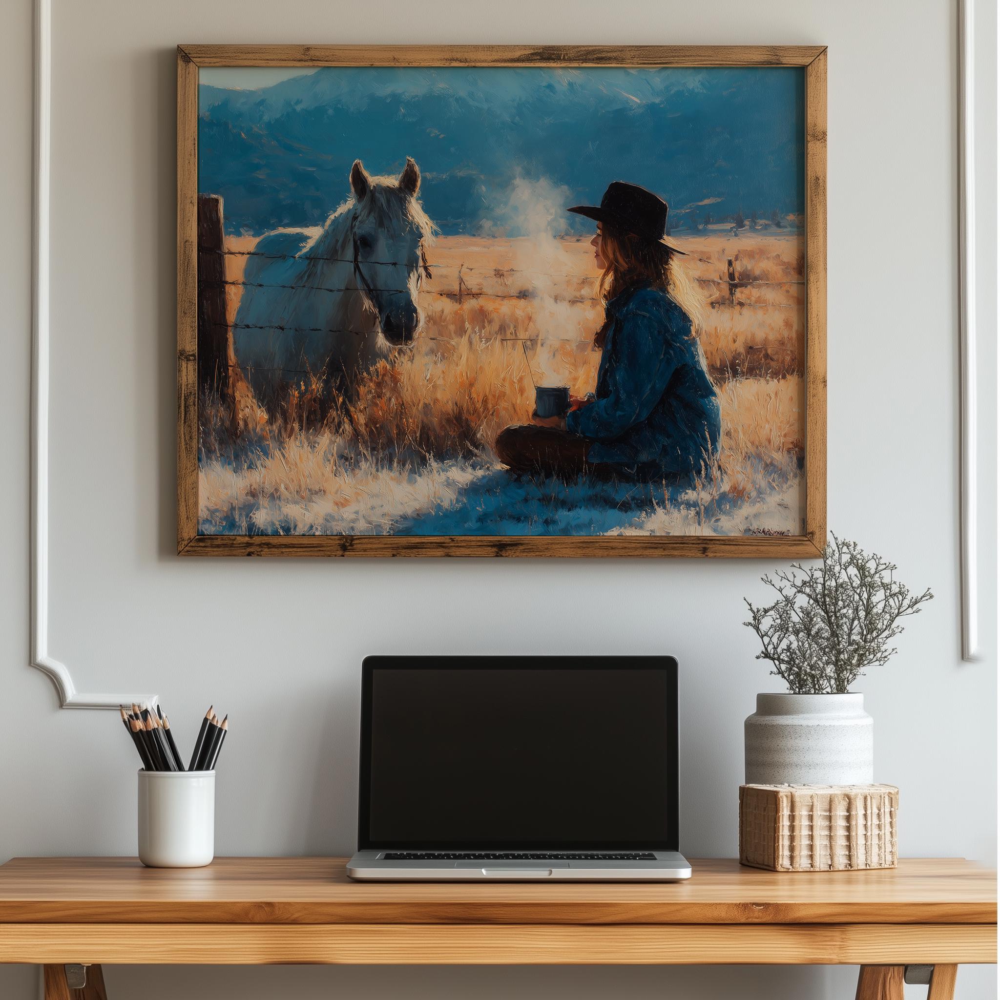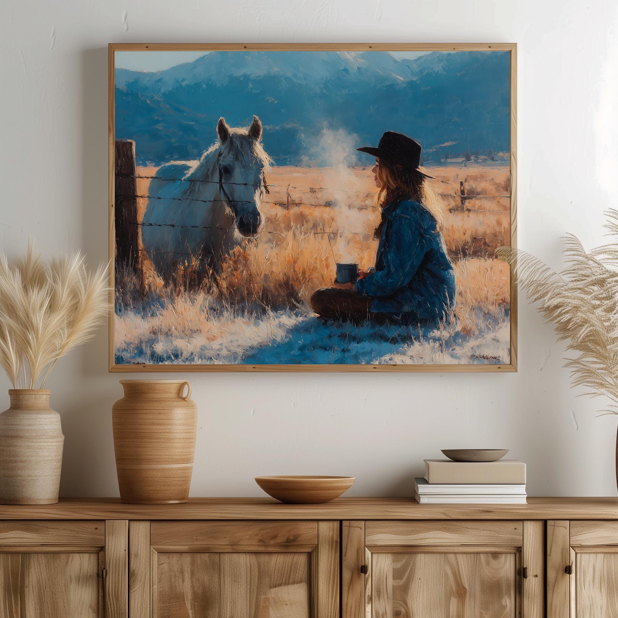 Immerse yourself in the charm with this rustic painting of a cowgirl riding a majestic white horse in a serene winter landscape. An instantly downloadable print, it's perfect for elevating your decor with budget-friendly charm. This gives you the flexibility to customize the size, frame, and material according to your personal taste and space, ensuring a perfect fit for your walls.