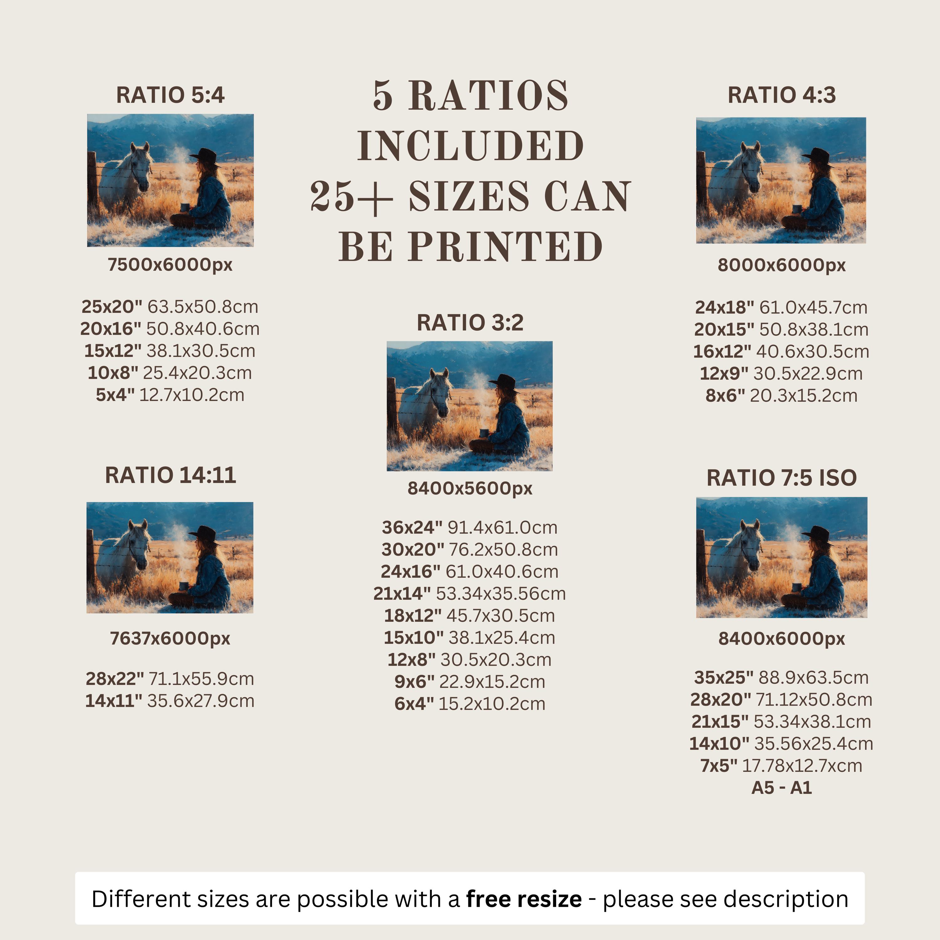 Each artwork includes 5 aspect ratios with 25+ print sizes. Most standard frames are covered. One custom resize per purchase available—message before ordering.