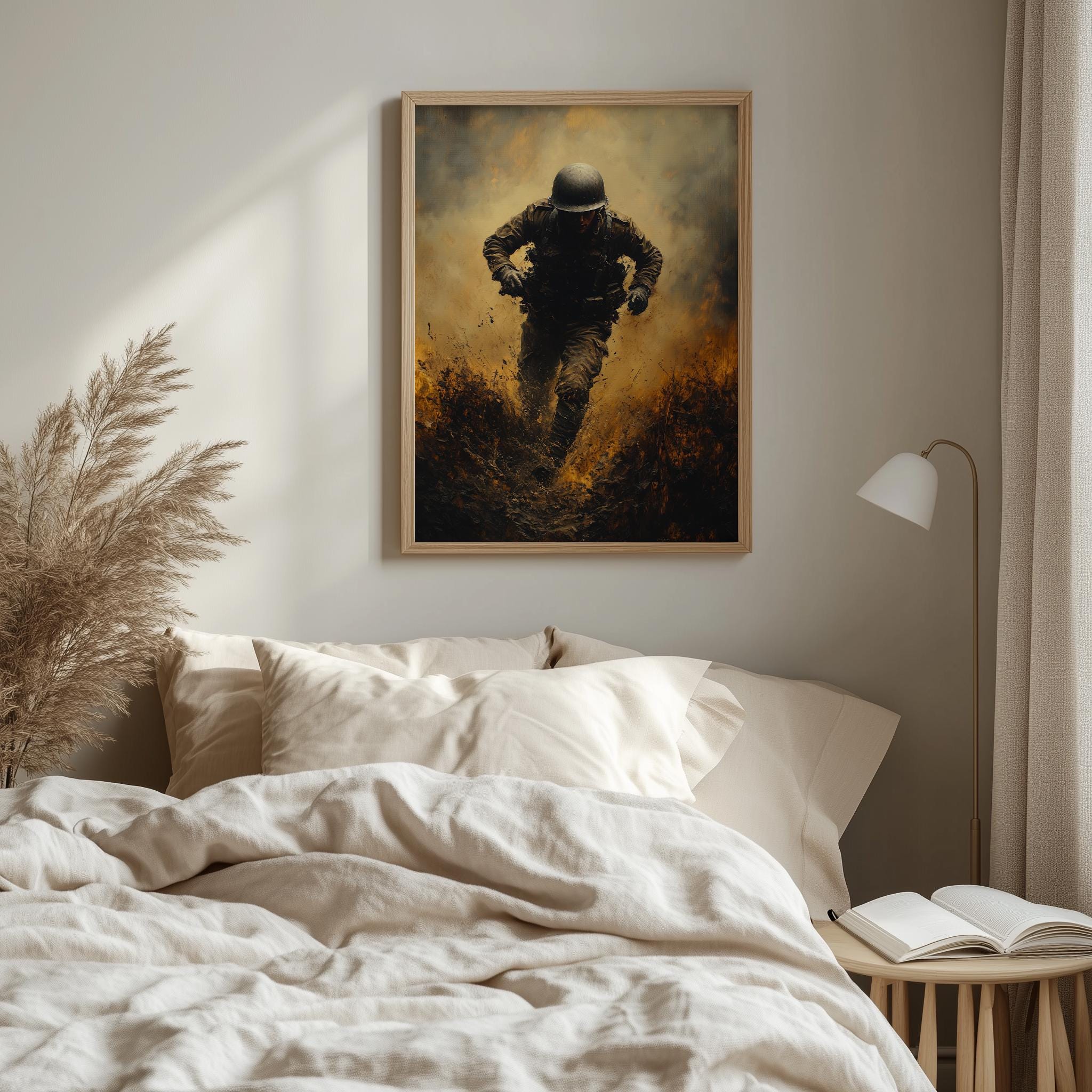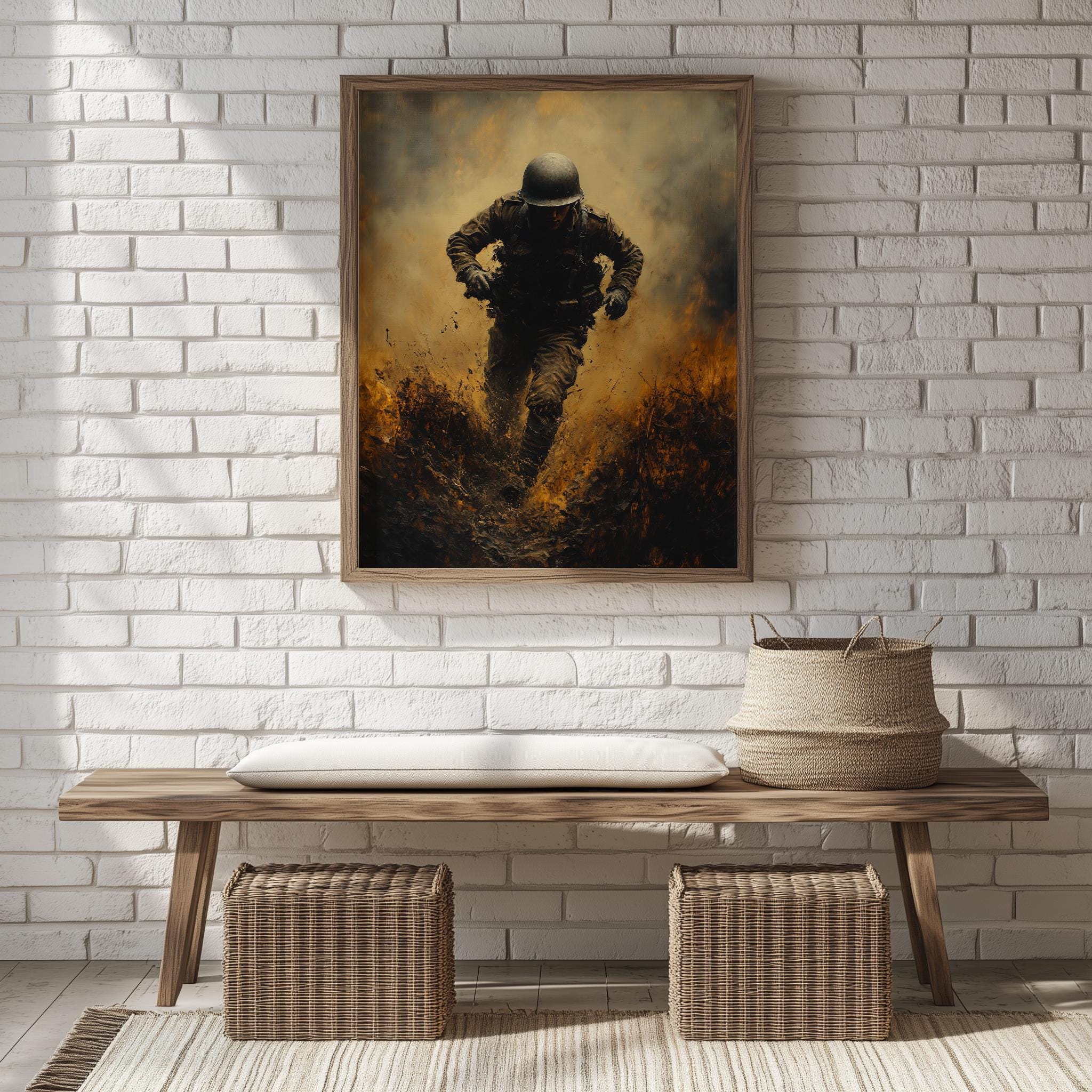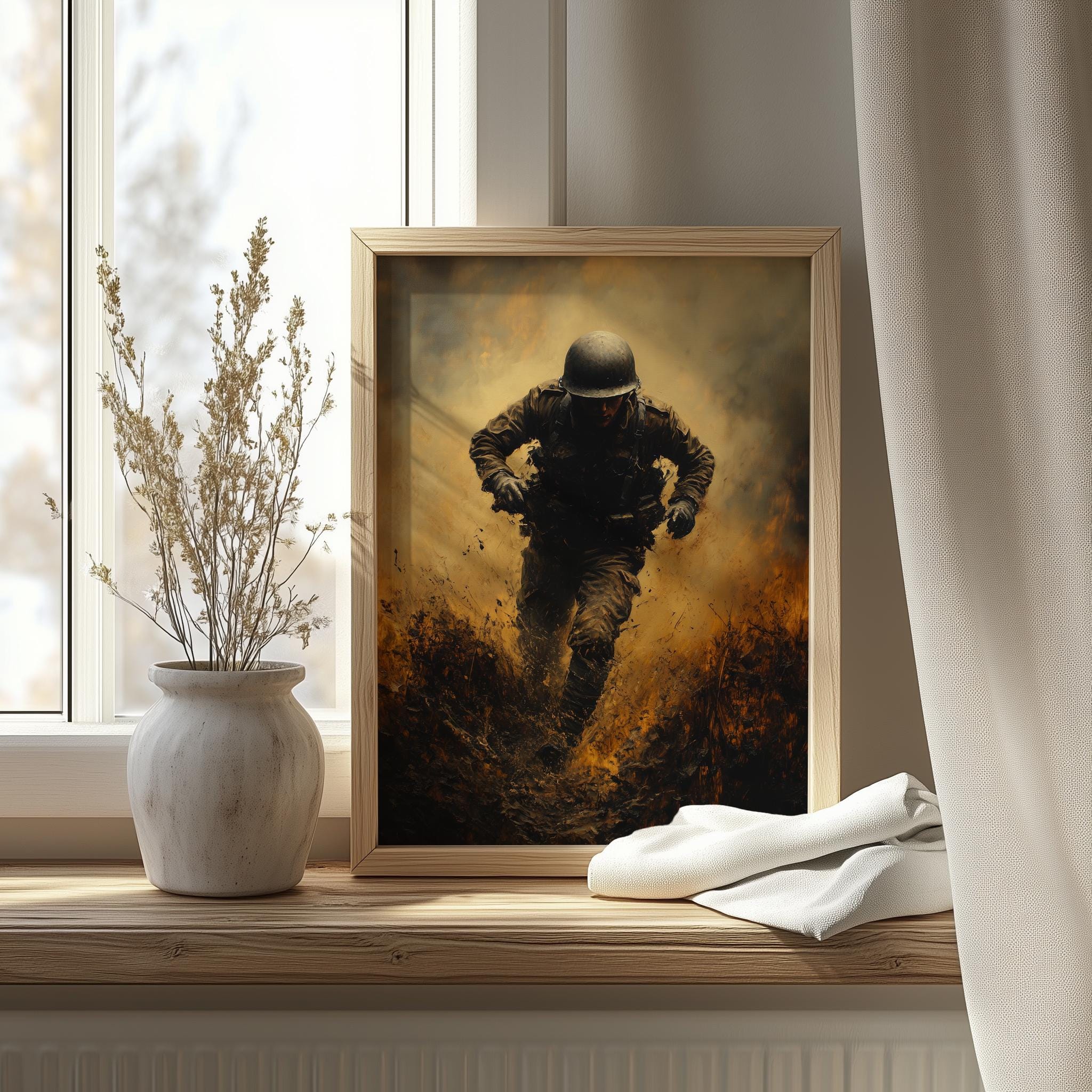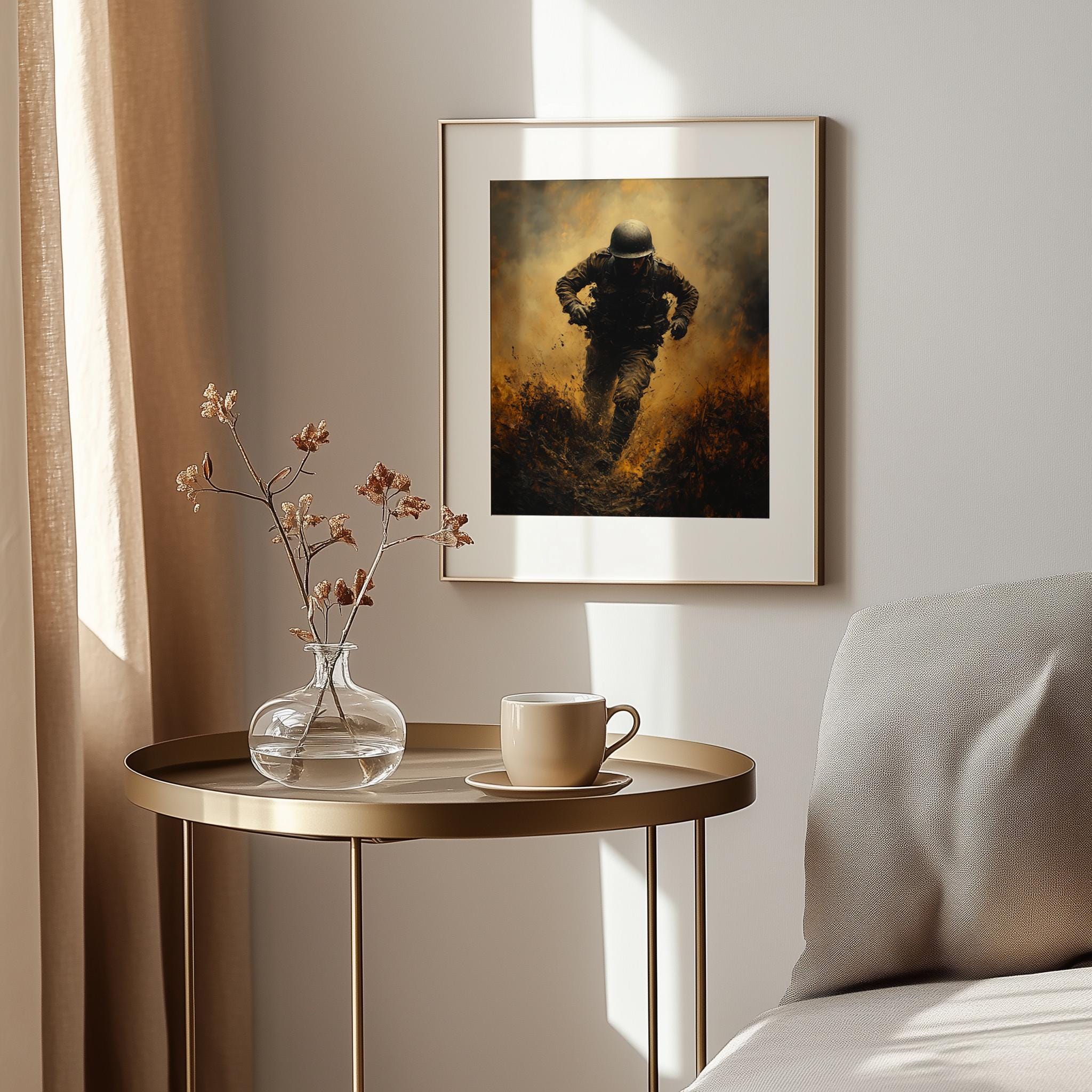 Immerse yourself in the charm of this painting of a brave soldier navigating the desolate battlegrounds of World War I. An instantly downloadable print, it's perfect for elevating your decor with budget-friendly charm. This gives you the flexibility to customize the size, frame, and material according to your personal taste and space, ensuring a perfect fit for your walls.