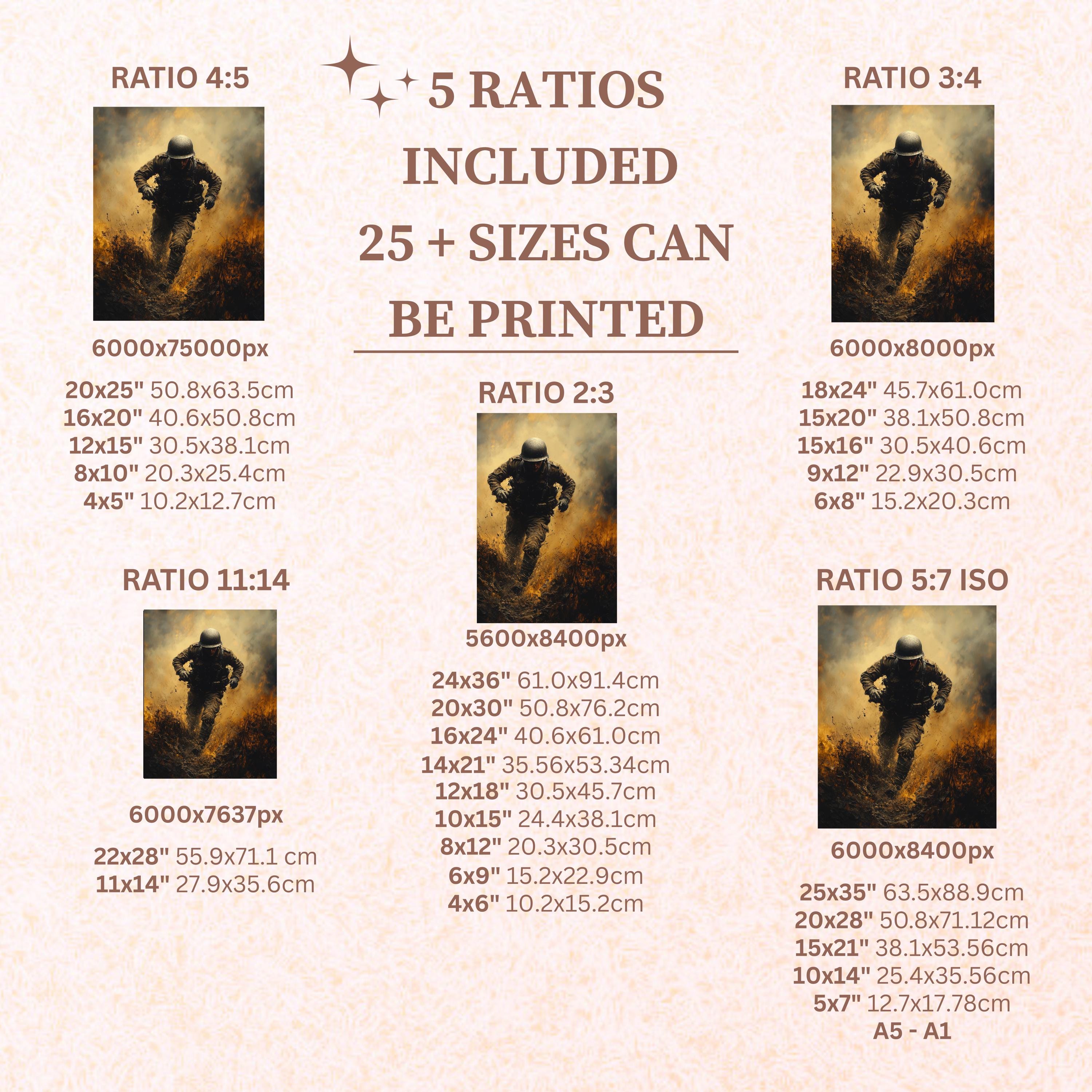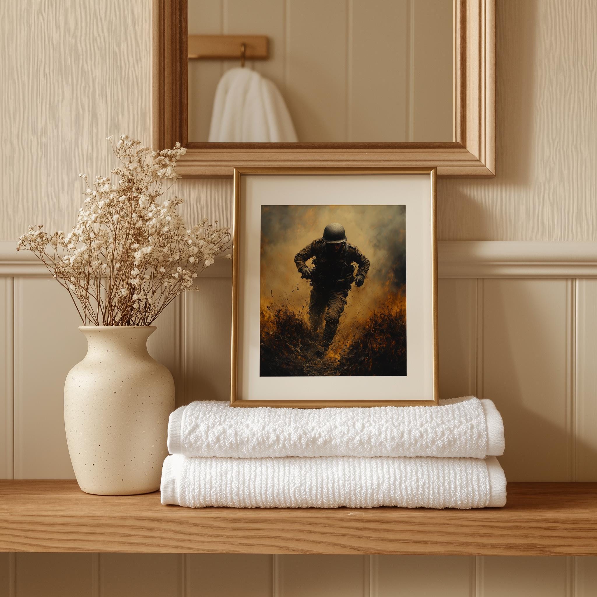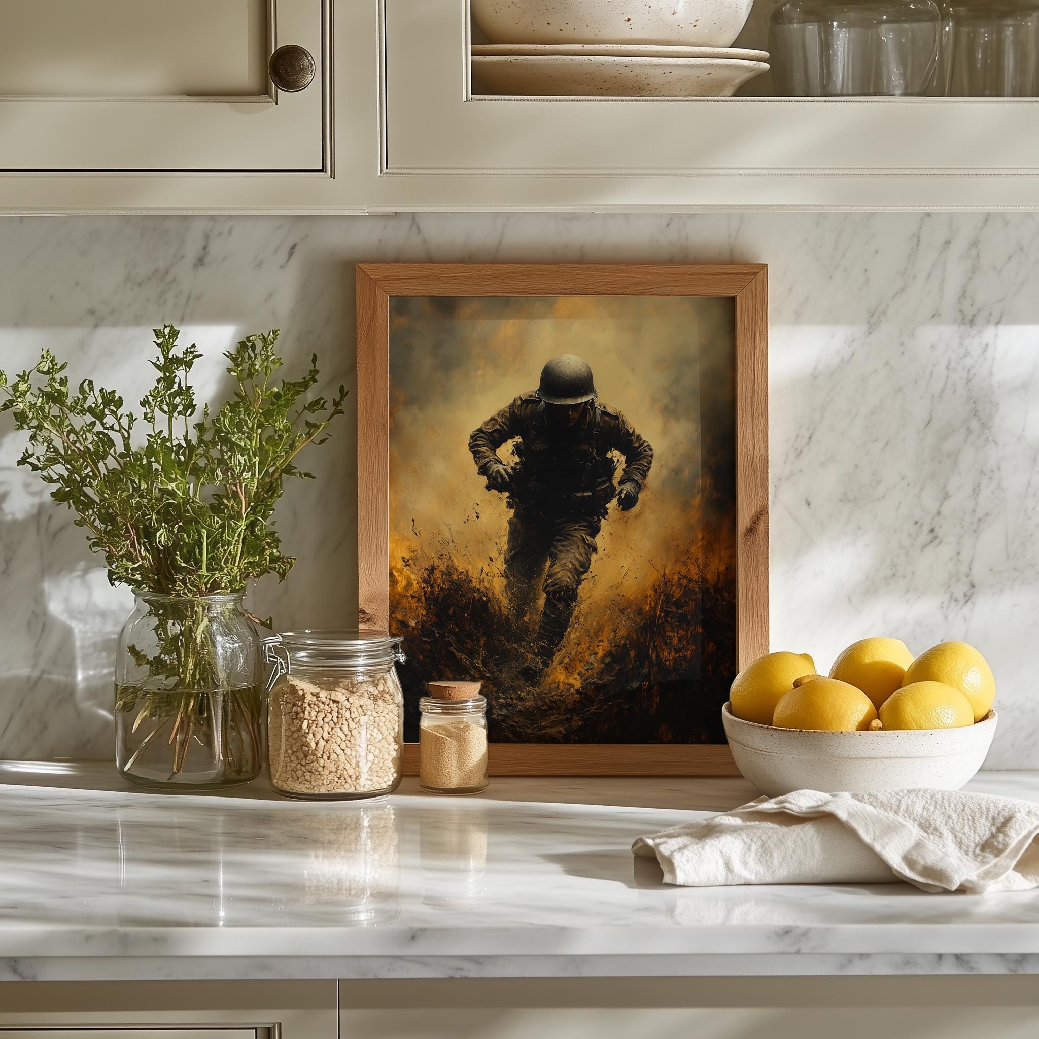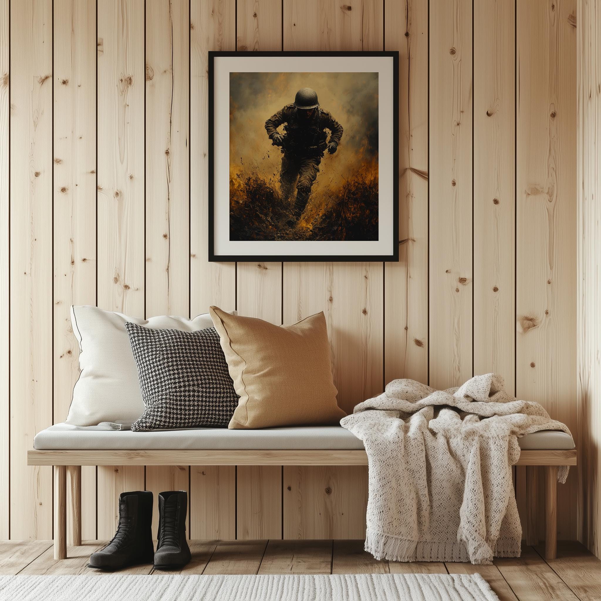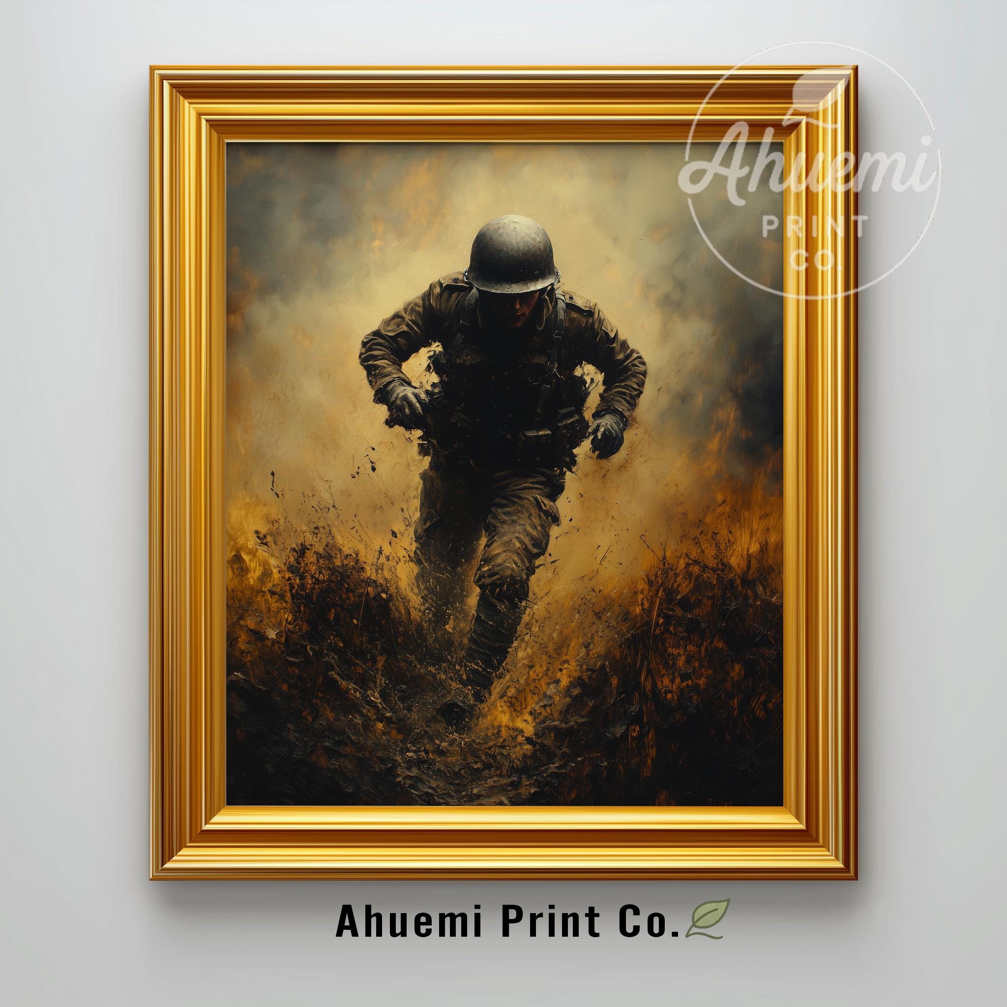 Immerse yourself in the charm of this painting of a brave soldier navigating the desolate battlegrounds of World War I. An instantly downloadable print, it's perfect for elevating your decor with budget-friendly charm. This gives you the flexibility to customize the size, frame, and material according to your personal taste and space, ensuring a perfect fit for your walls.
