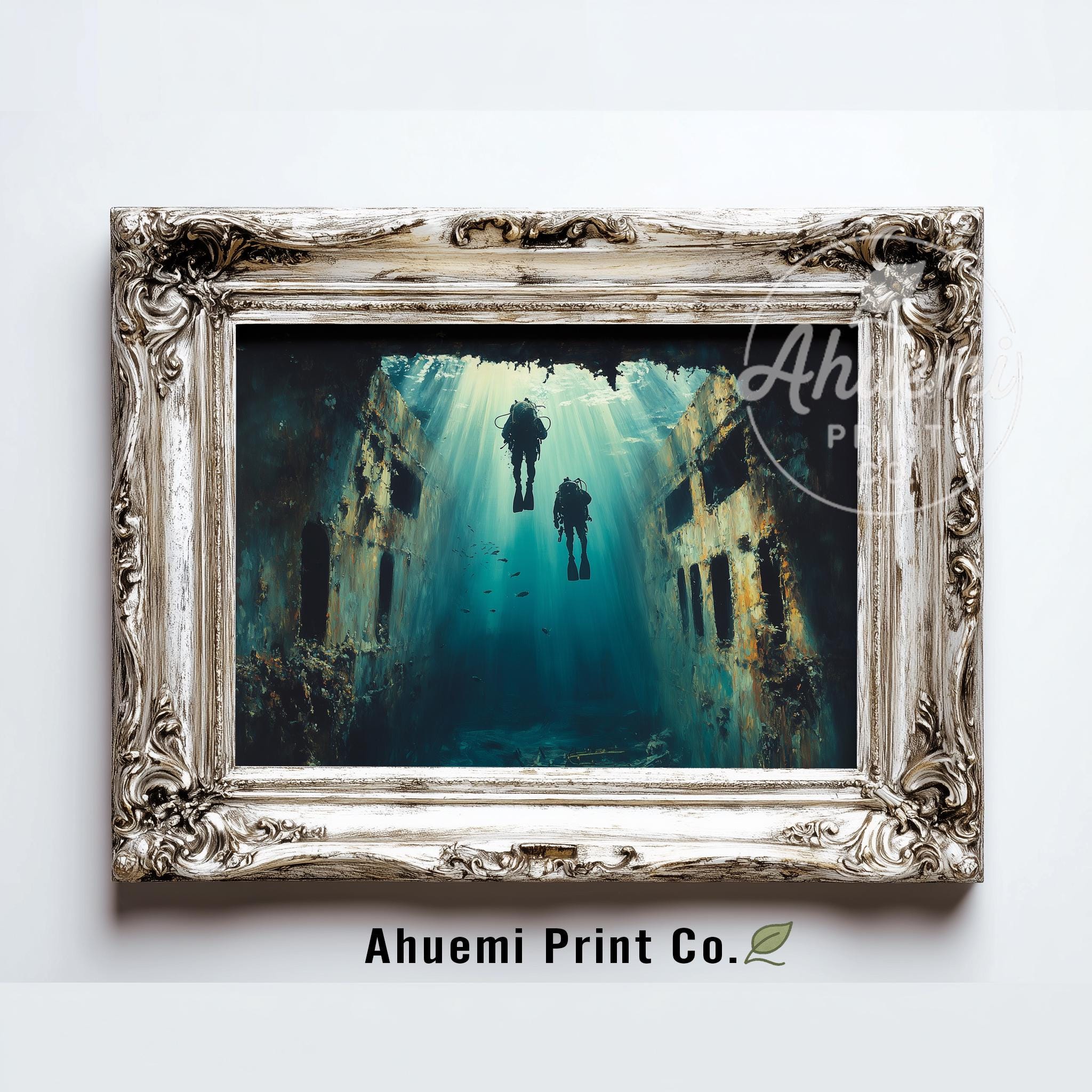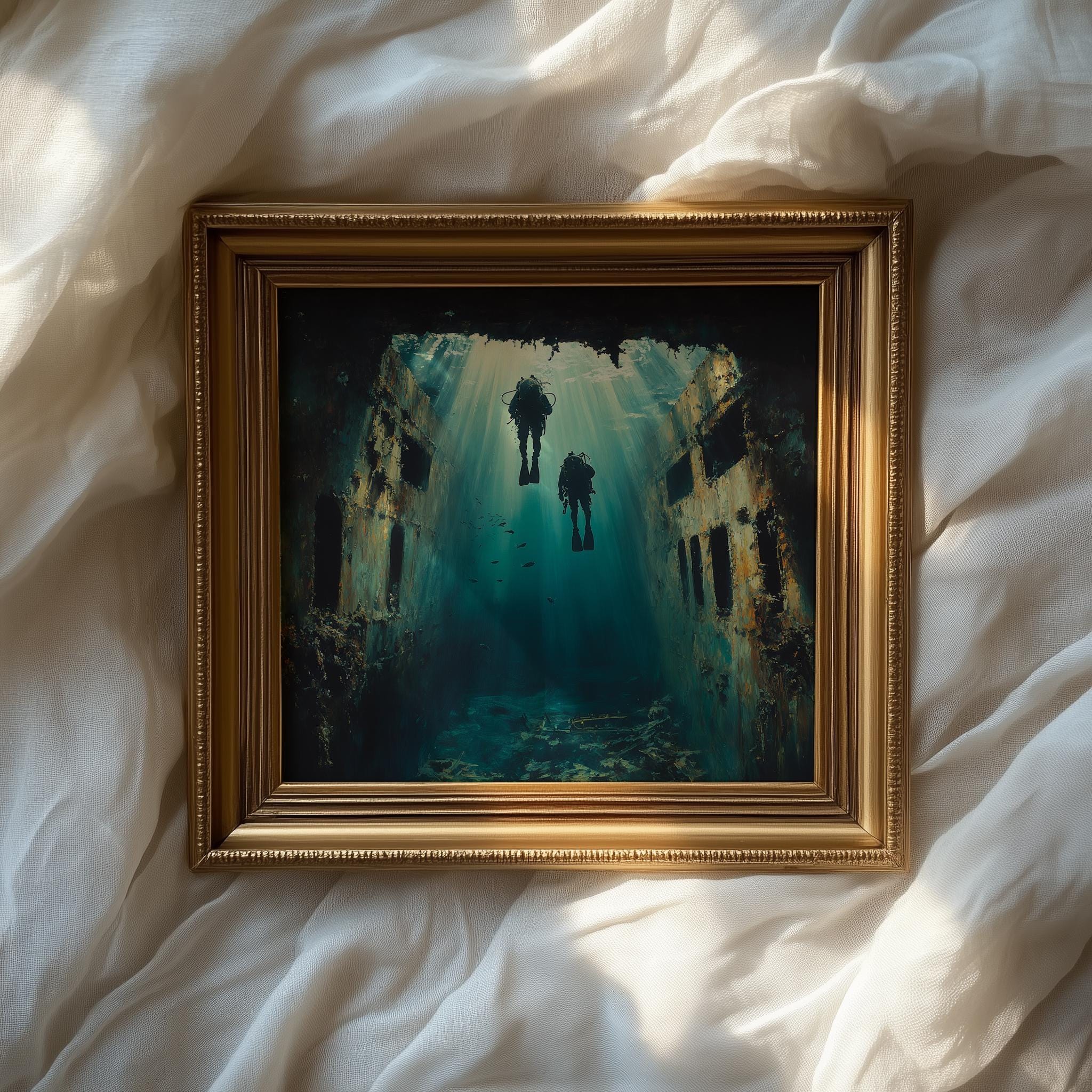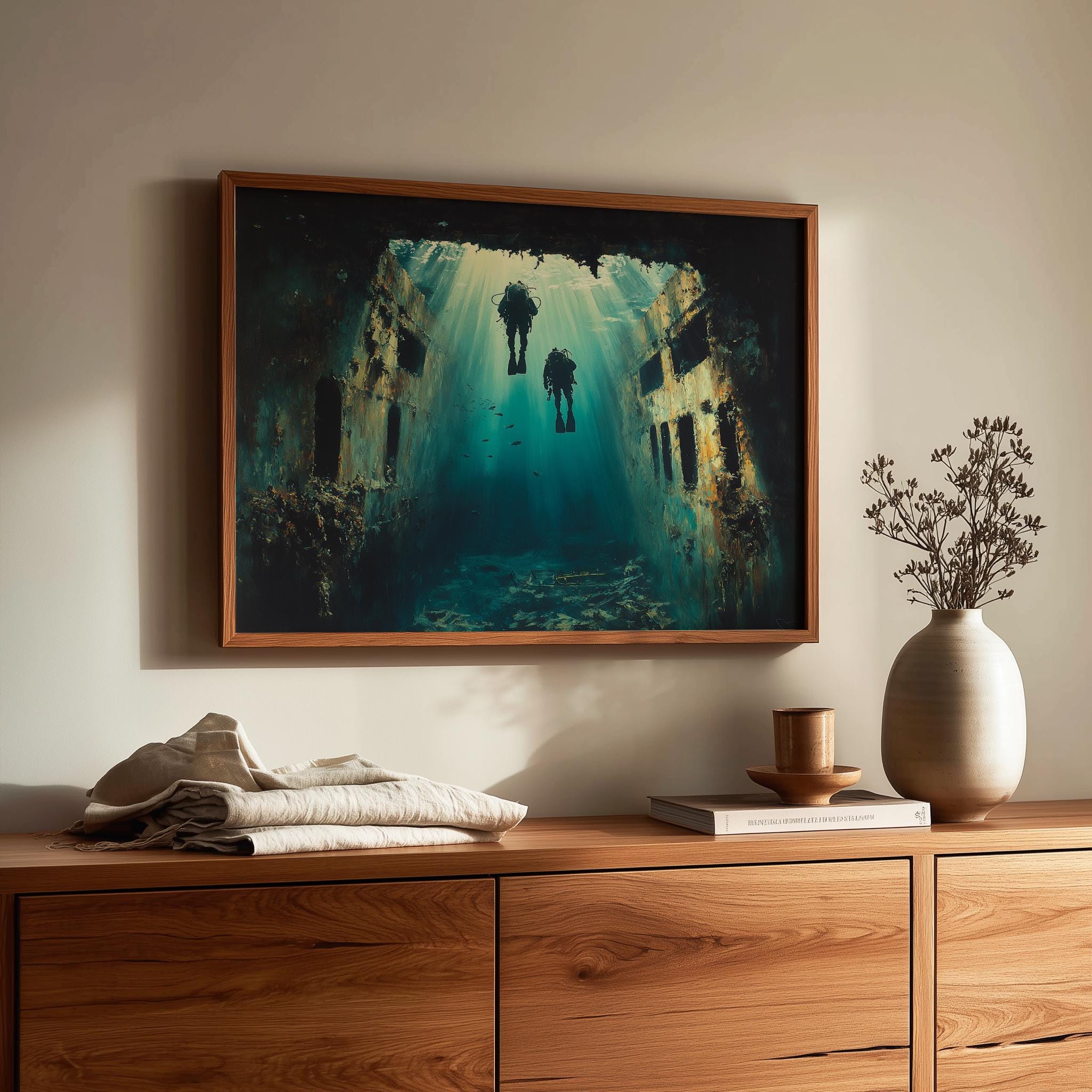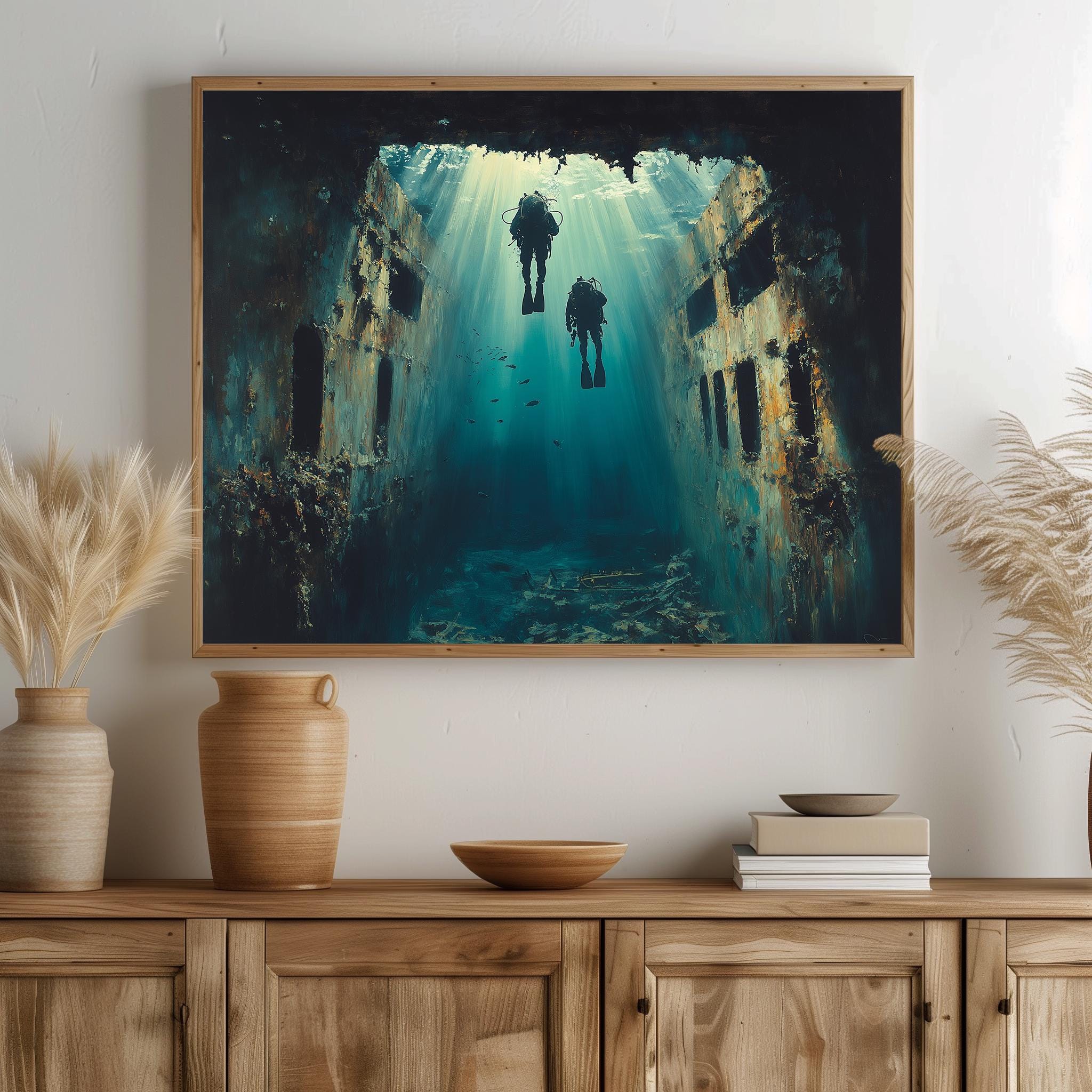 Immerse yourself in the charm with this painting of a mysterious shipwreck surrounded by vibrant marine life. An instantly downloadable print, it's perfect for elevating your decor with budget-friendly charm. This gives you the flexibility to customize the size, frame, and material according to your personal taste and space, ensuring a perfect fit for your walls.