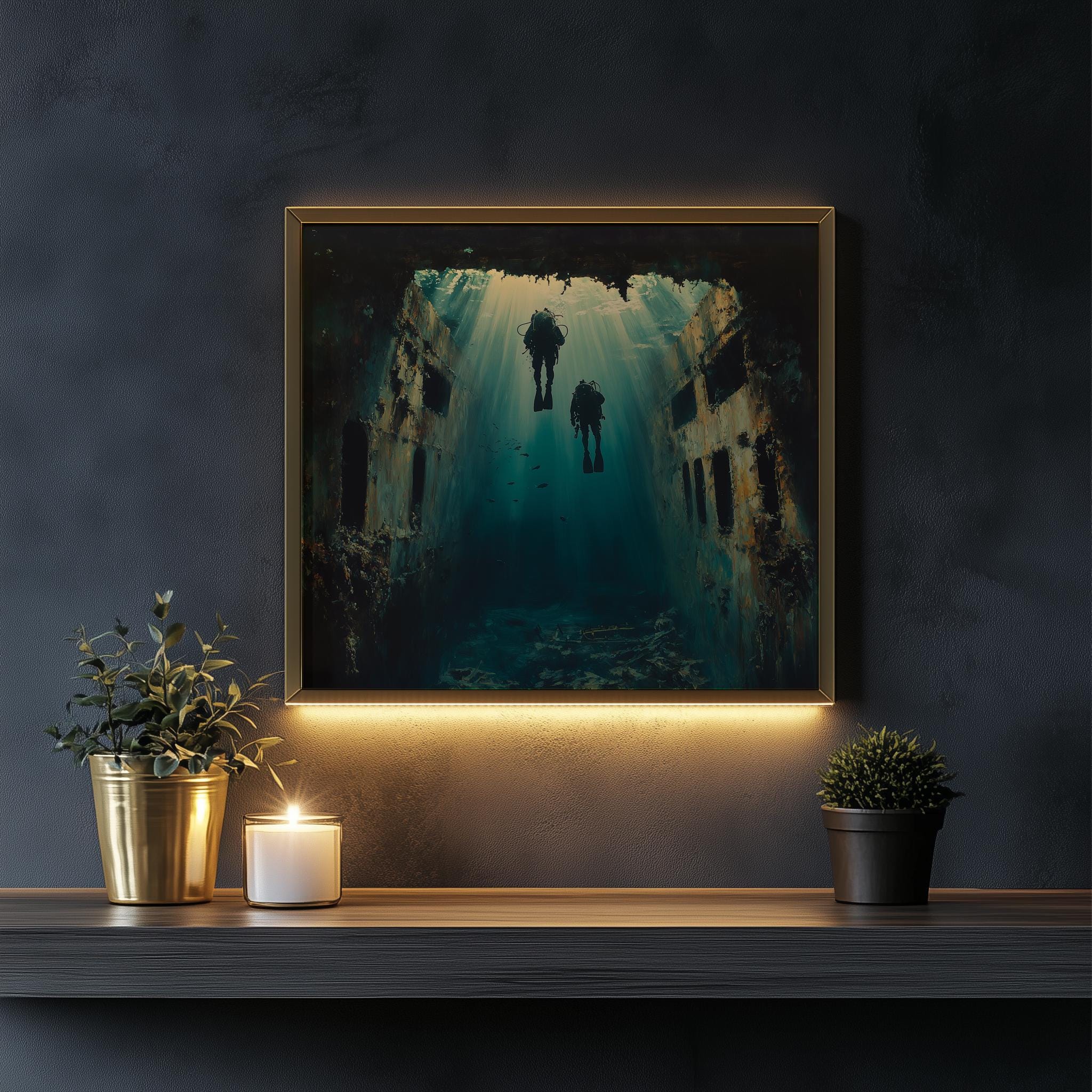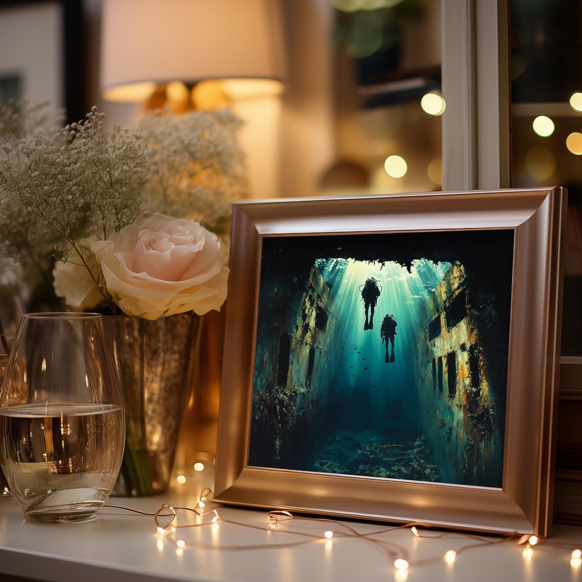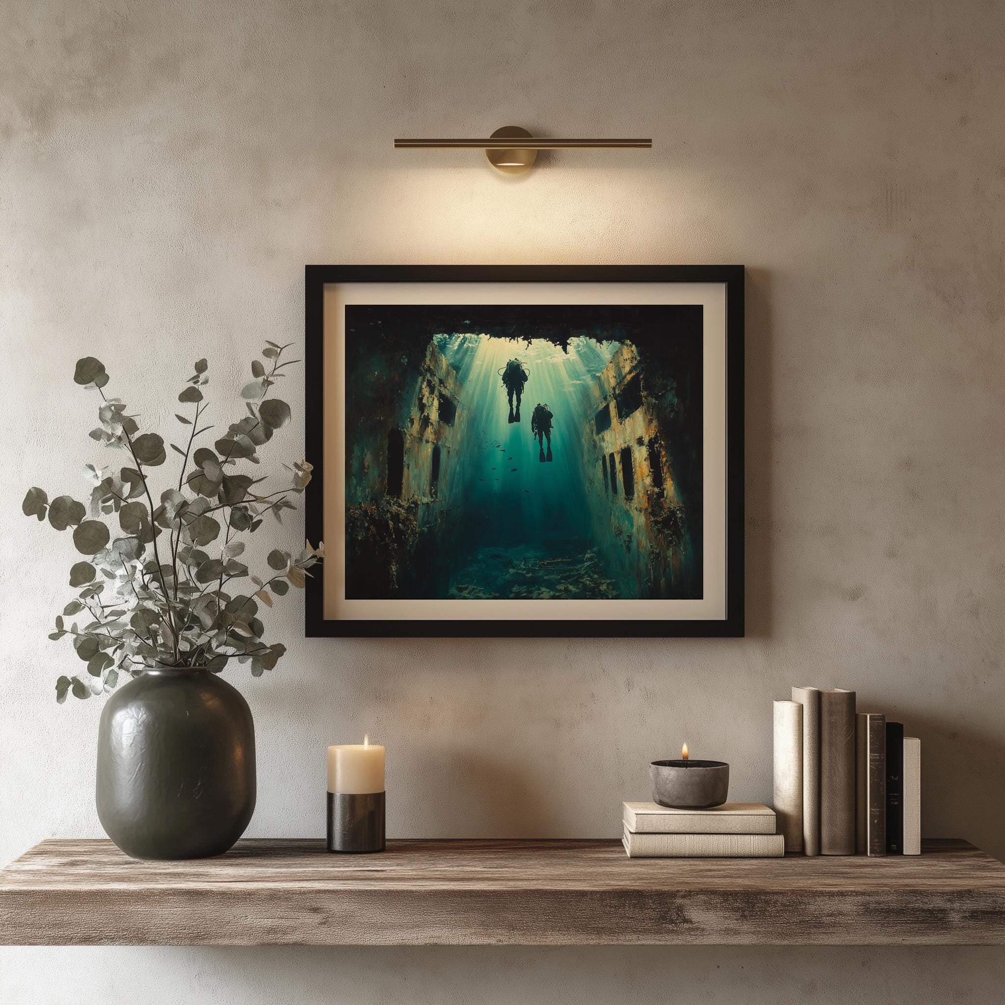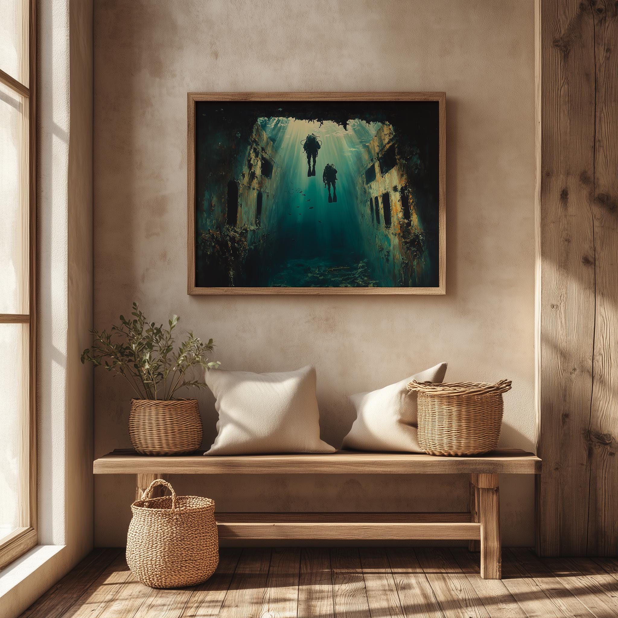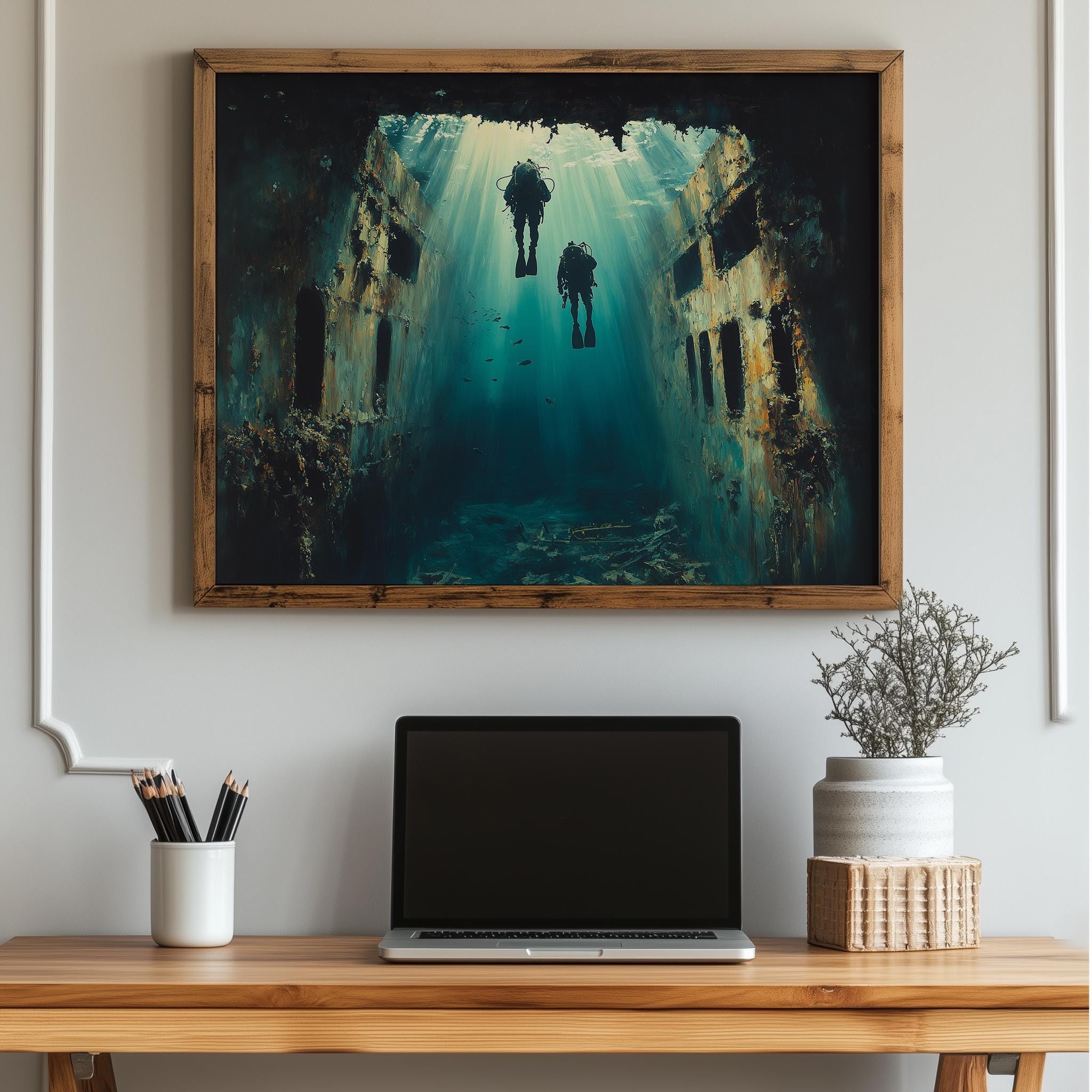 Immerse yourself in the charm with this painting of a mysterious shipwreck surrounded by vibrant marine life. An instantly downloadable print, it's perfect for elevating your decor with budget-friendly charm. This gives you the flexibility to customize the size, frame, and material according to your personal taste and space, ensuring a perfect fit for your walls.