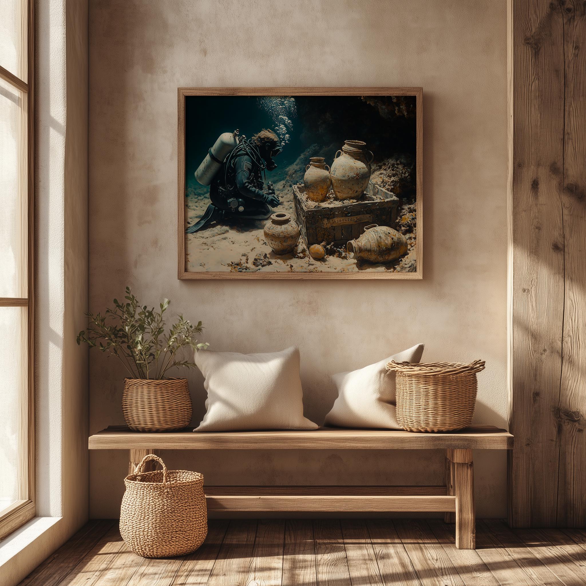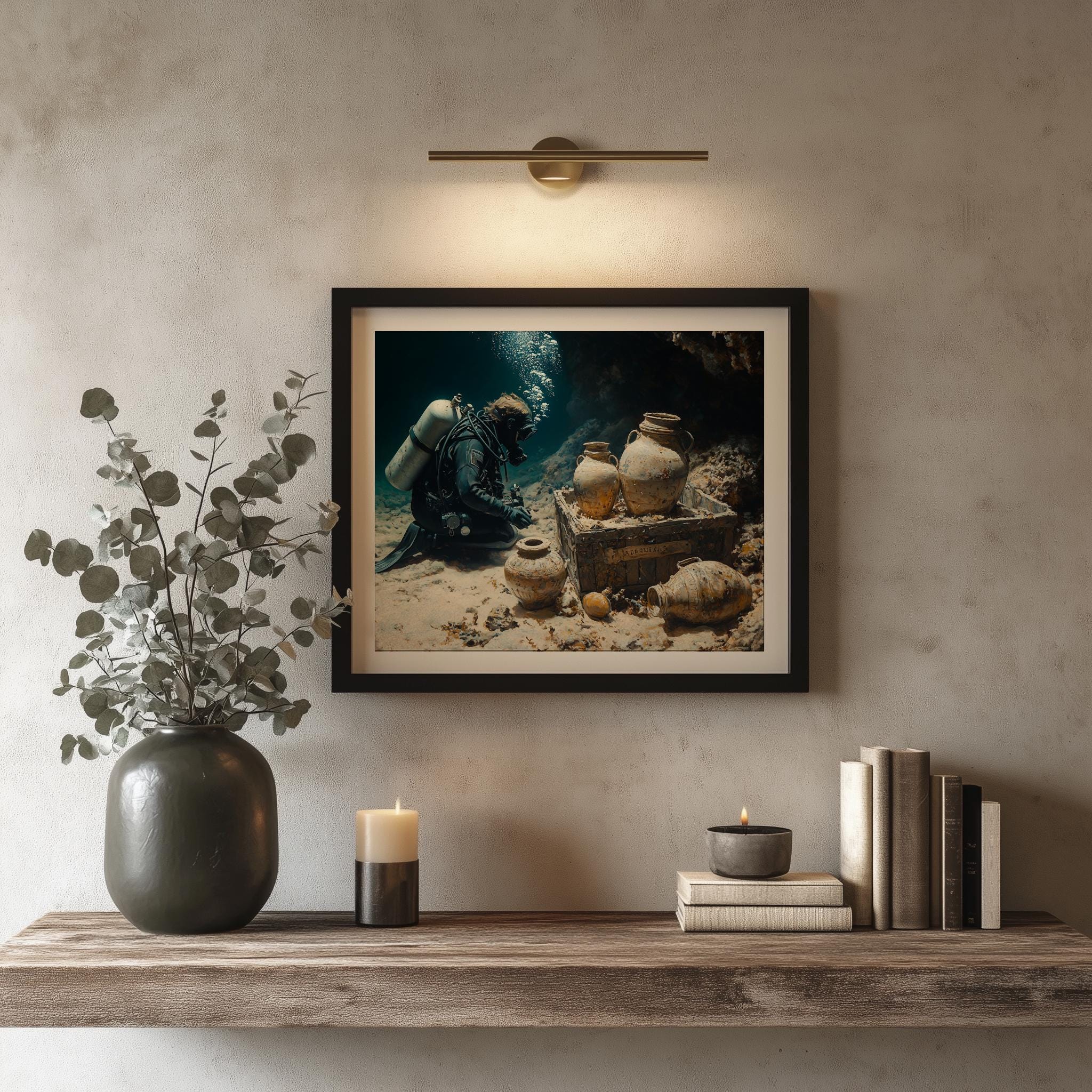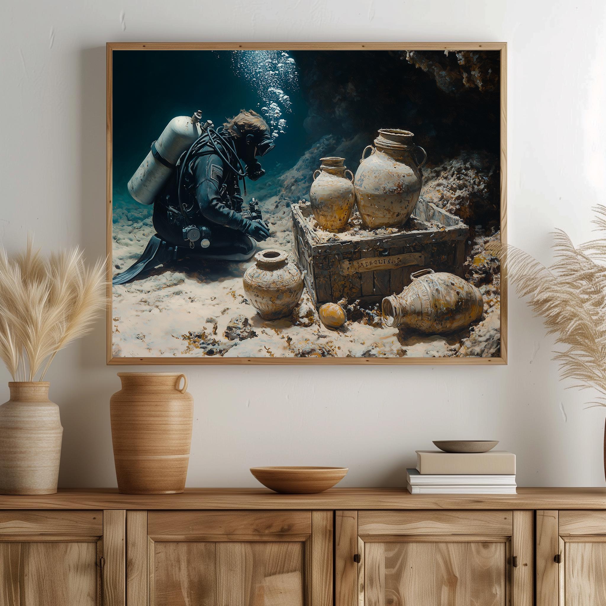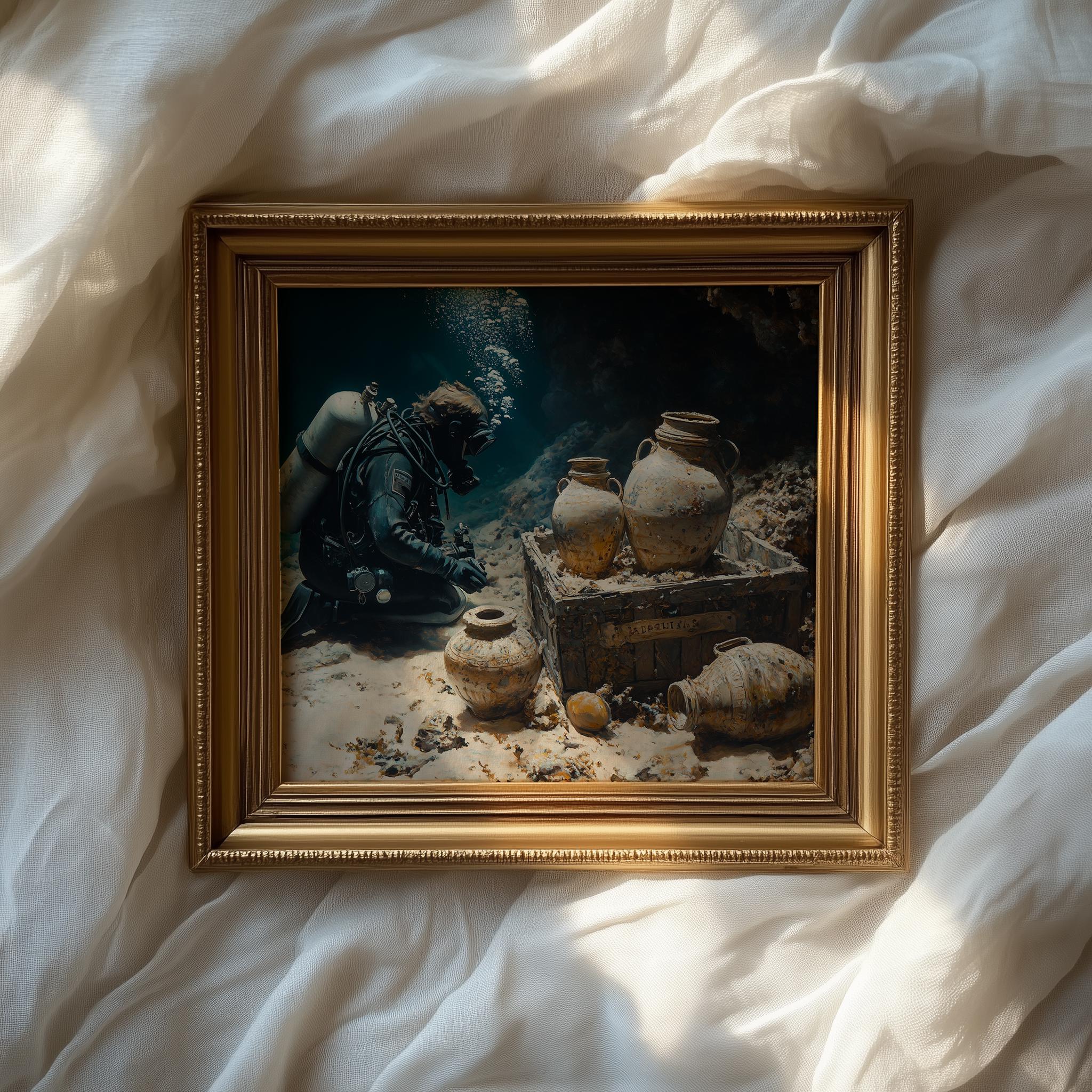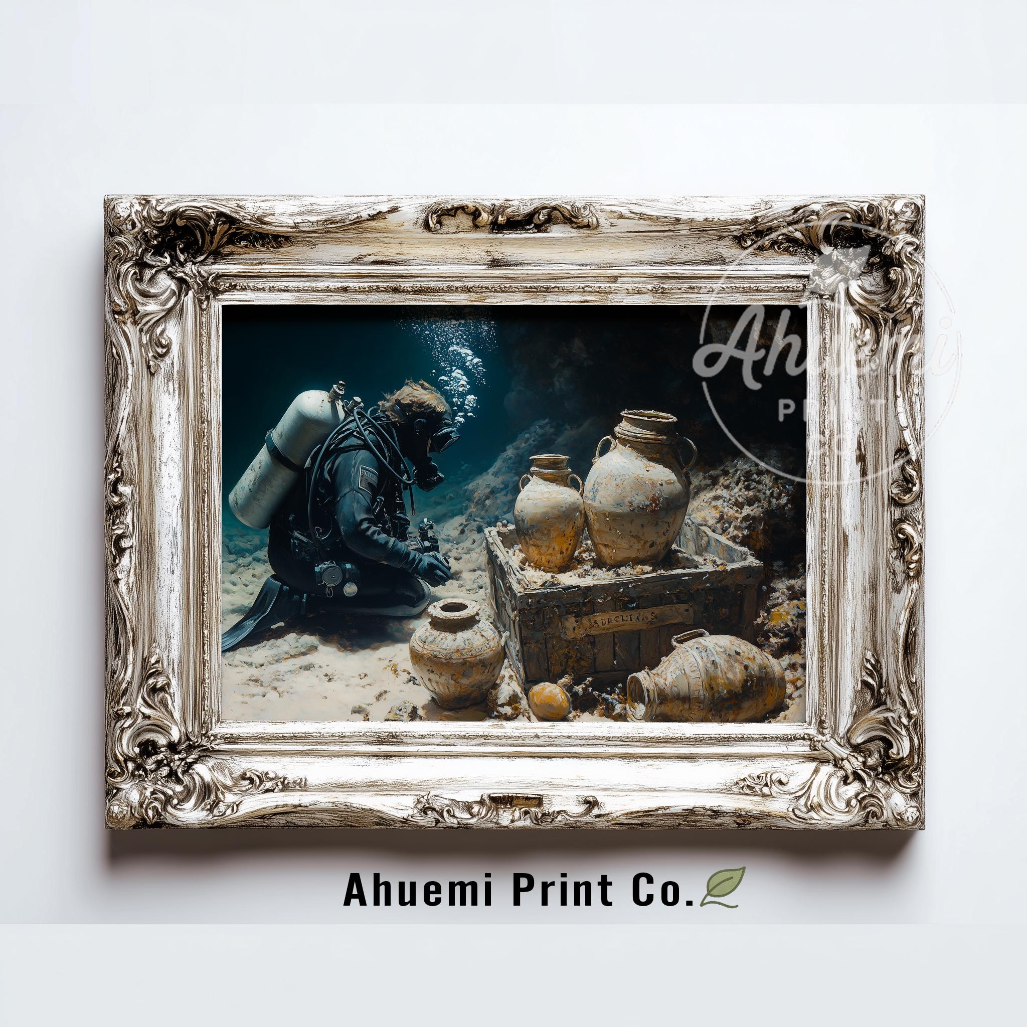 Immerse yourself in the charm with this painting of a scuba diver exploring a sunken treasure. An instantly downloadable print, it's perfect for elevating your decor with budget-friendly charm. This gives you the flexibility to customize the size, frame, and material according to your personal taste and space, ensuring a perfect fit for your walls.