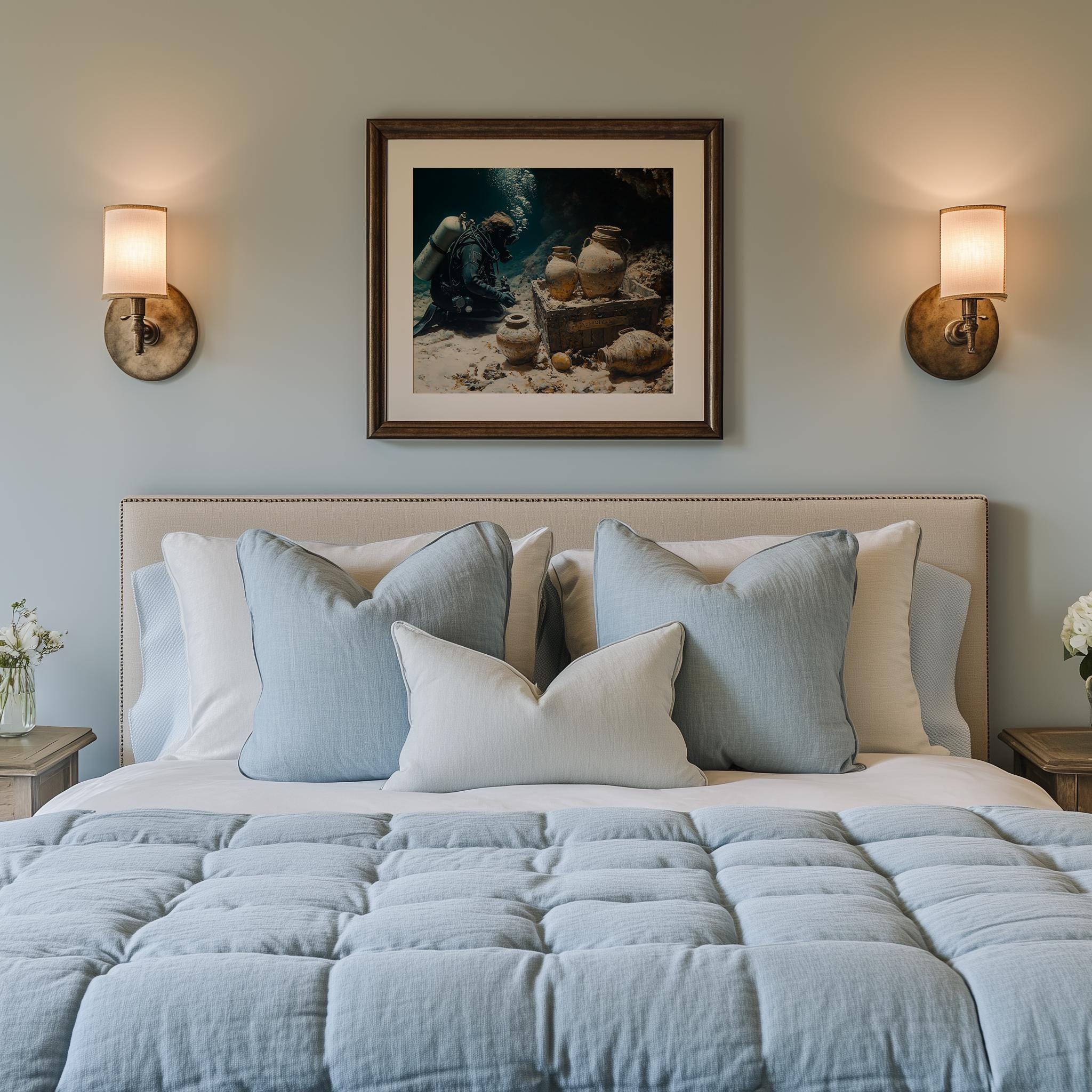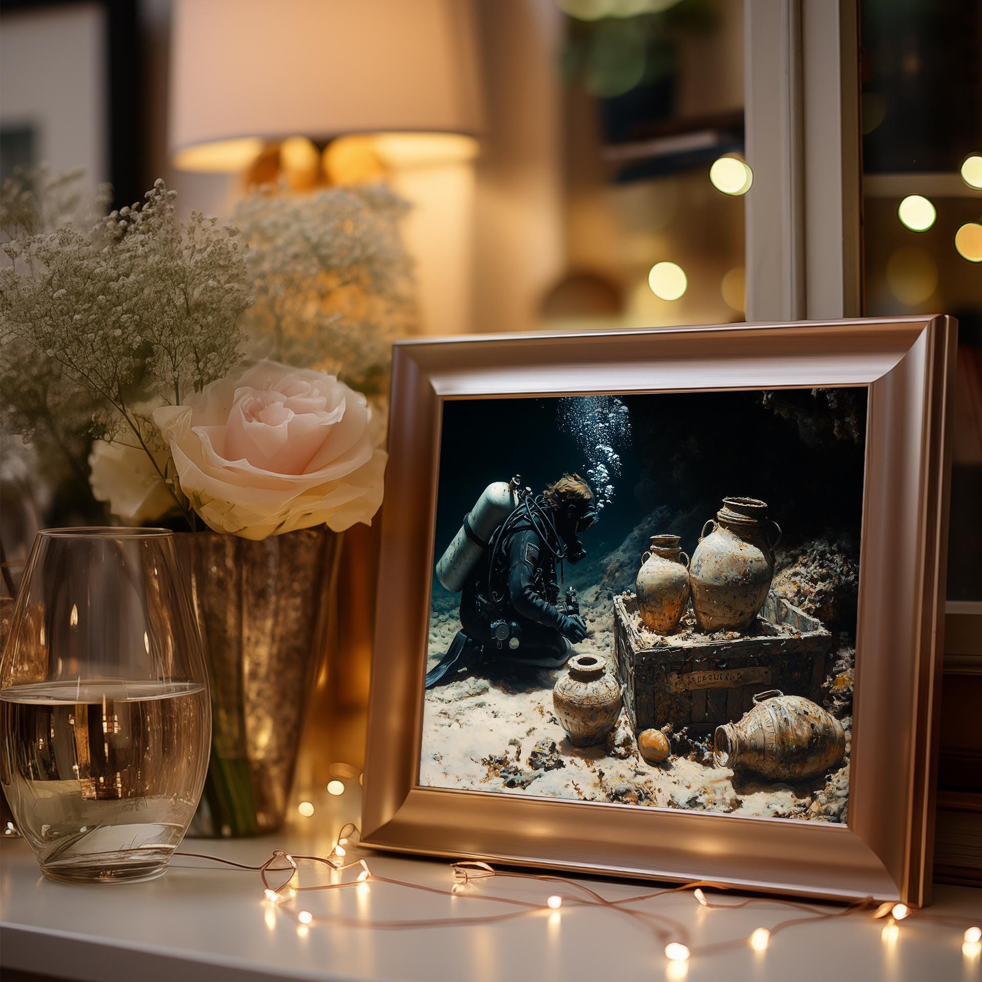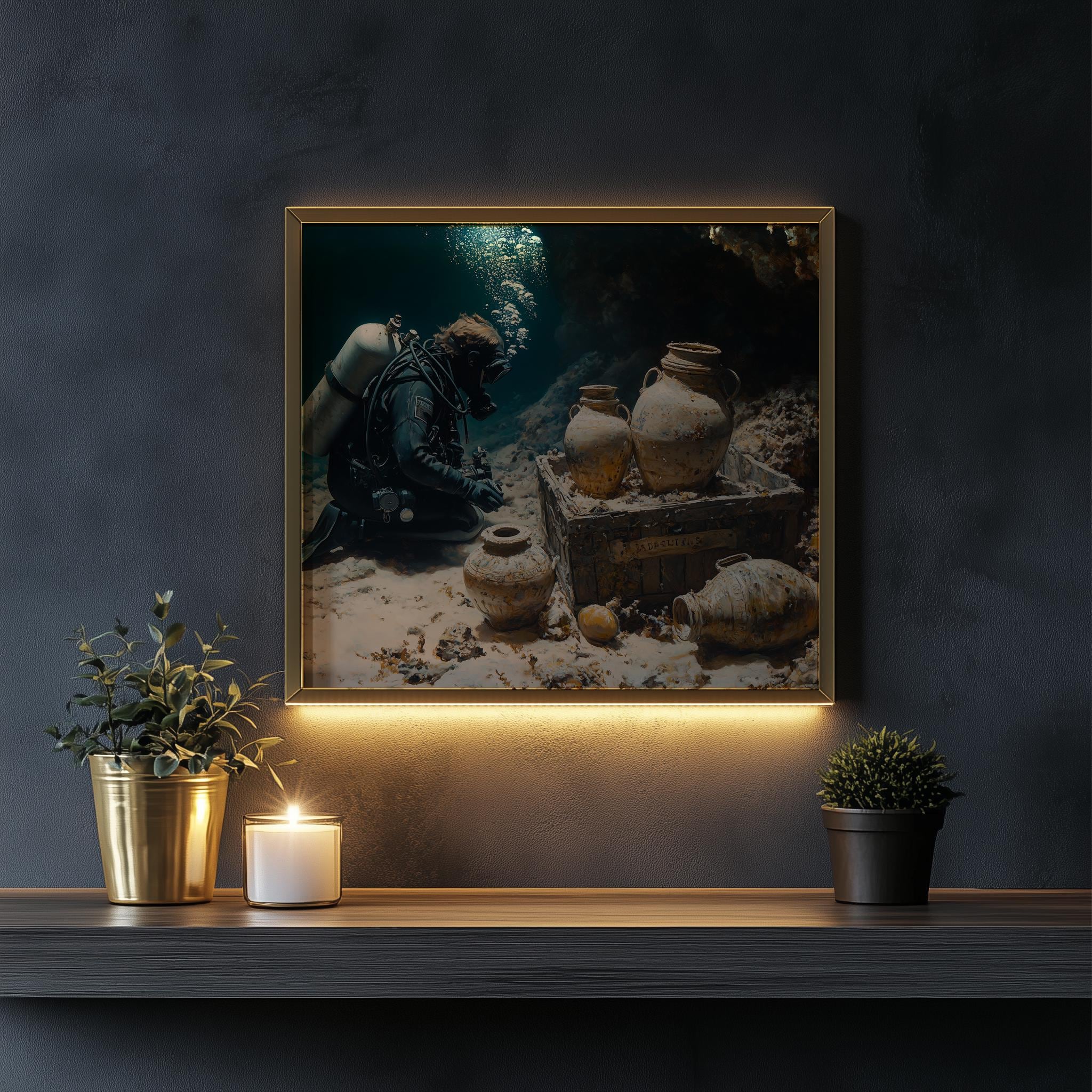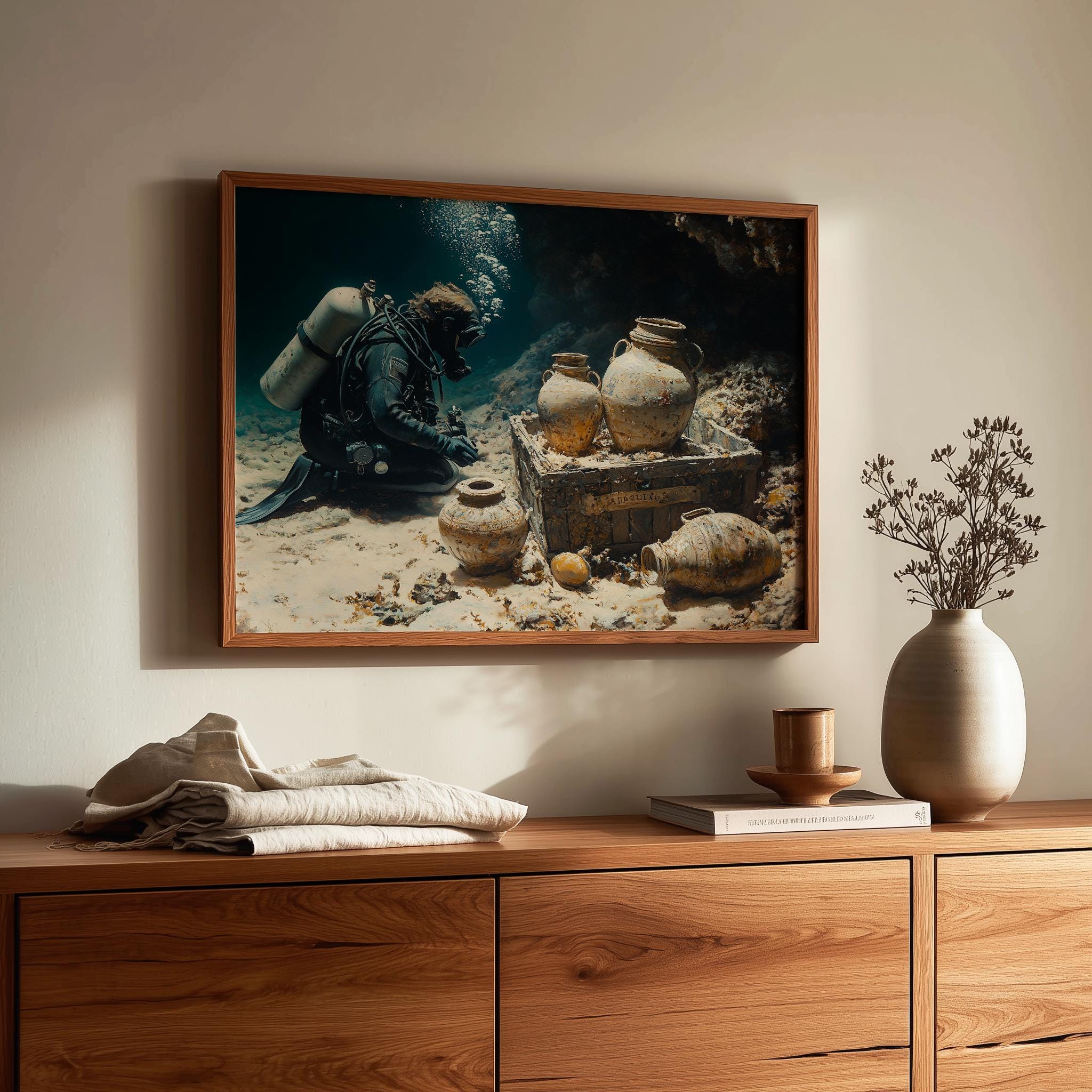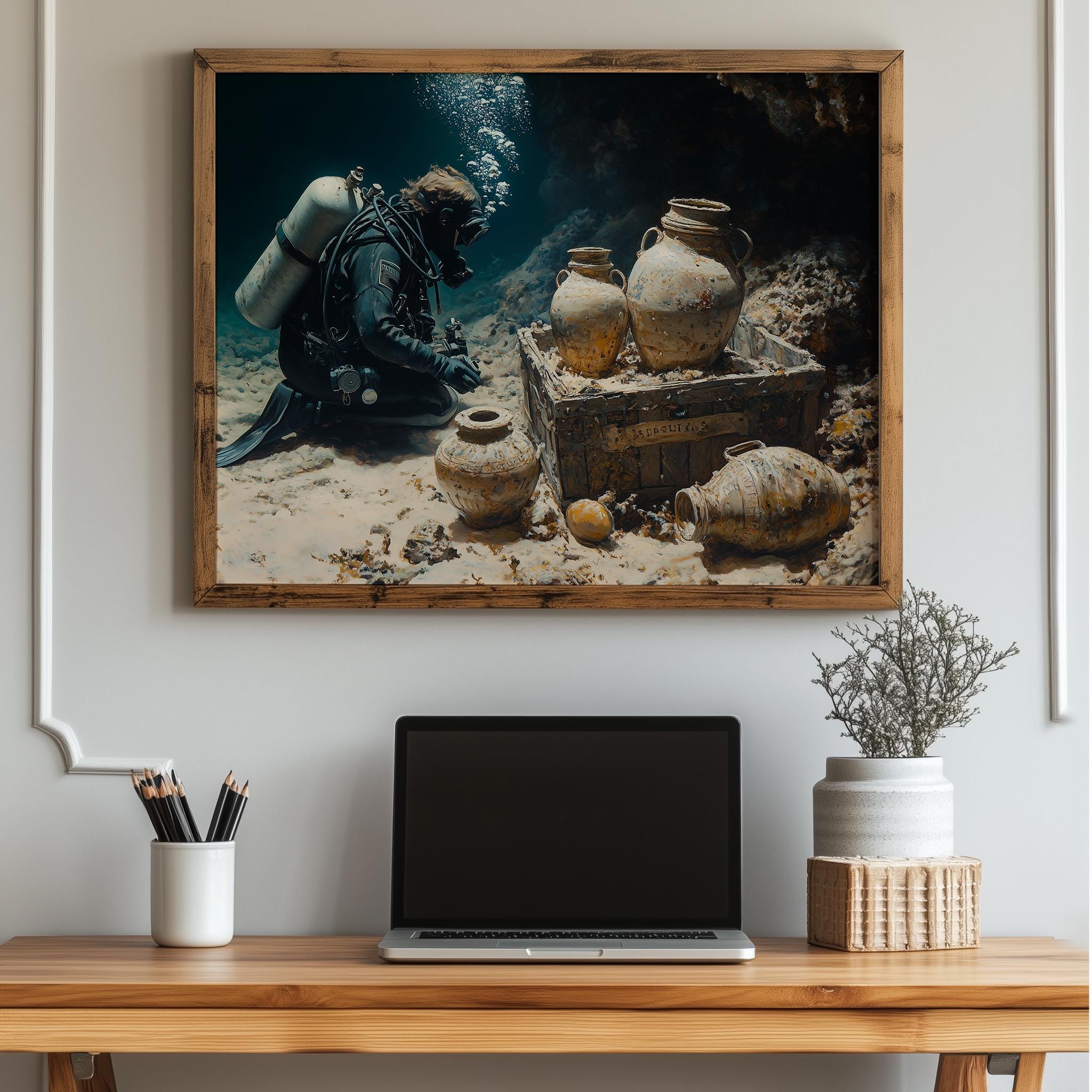Immerse yourself in the charm with this painting of a scuba diver exploring a sunken treasure. An instantly downloadable print, it's perfect for elevating your decor with budget-friendly charm. This gives you the flexibility to customize the size, frame, and material according to your personal taste and space, ensuring a perfect fit for your walls.