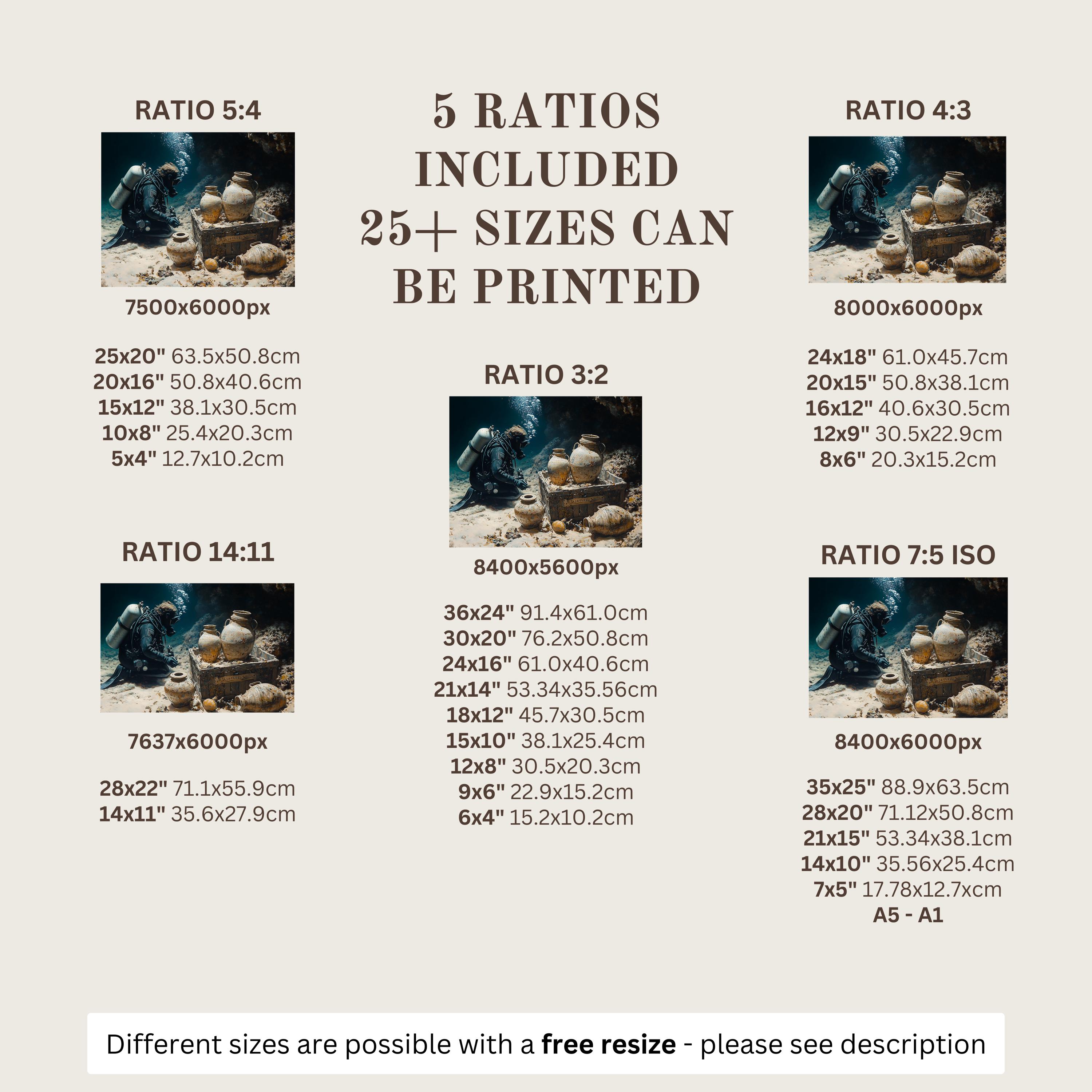 Each artwork includes 5 aspect ratios with 25+ print sizes. Most standard frames are covered. One custom resize per purchase available—message before ordering.