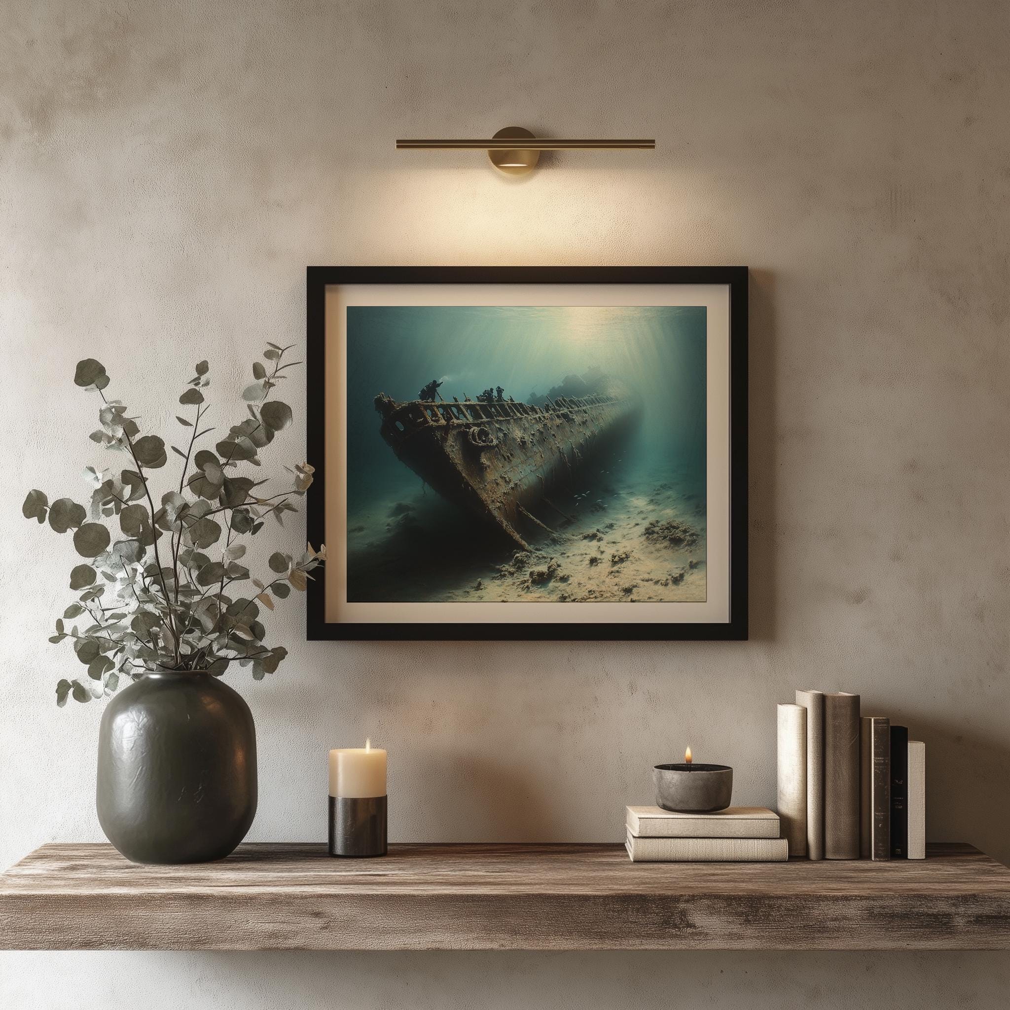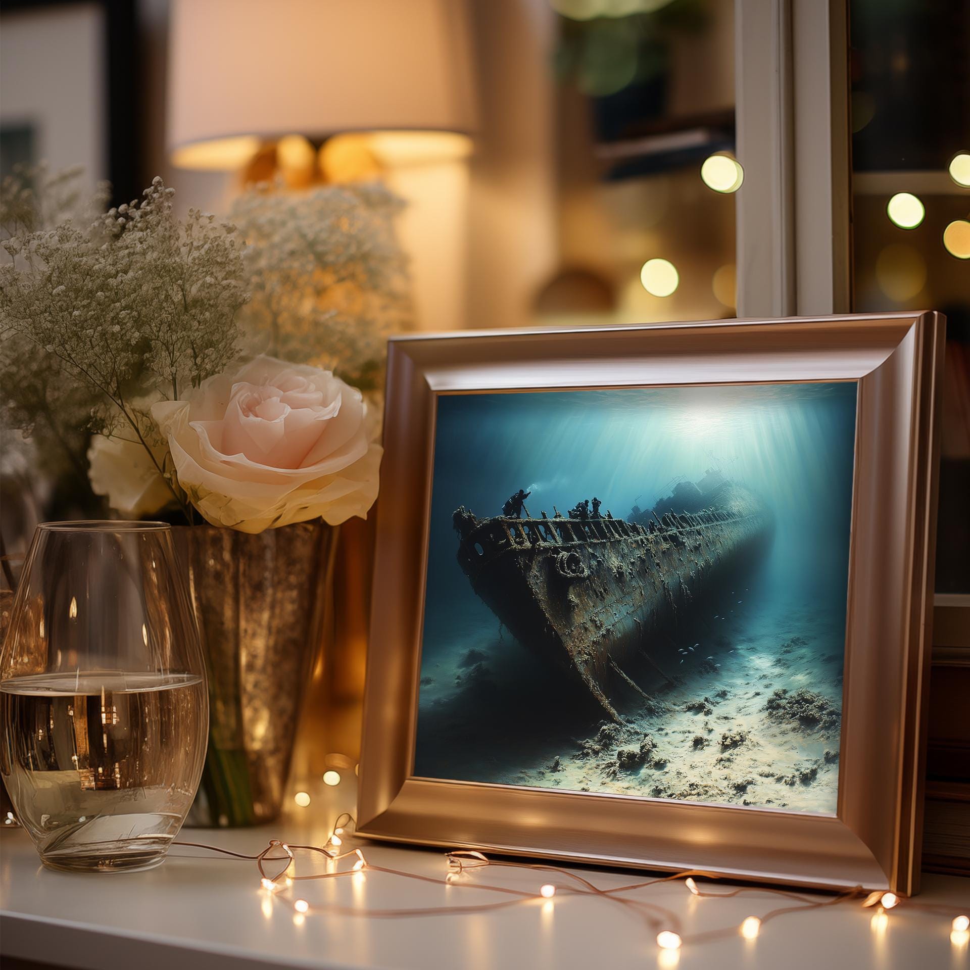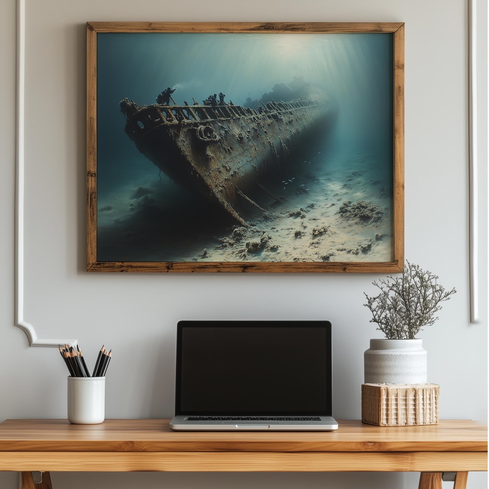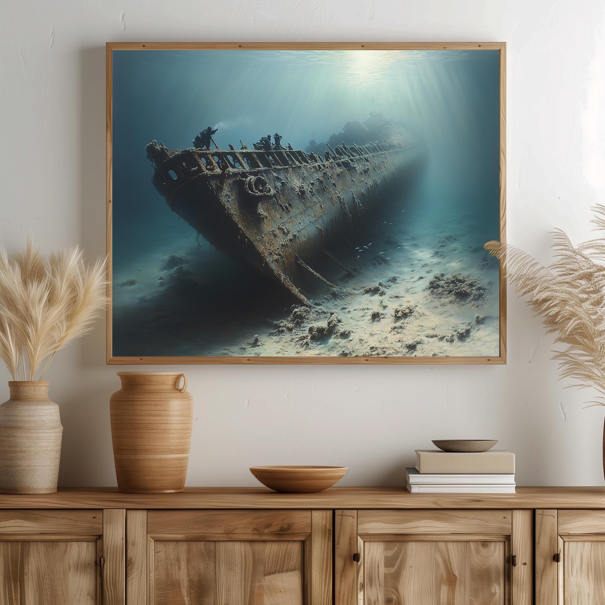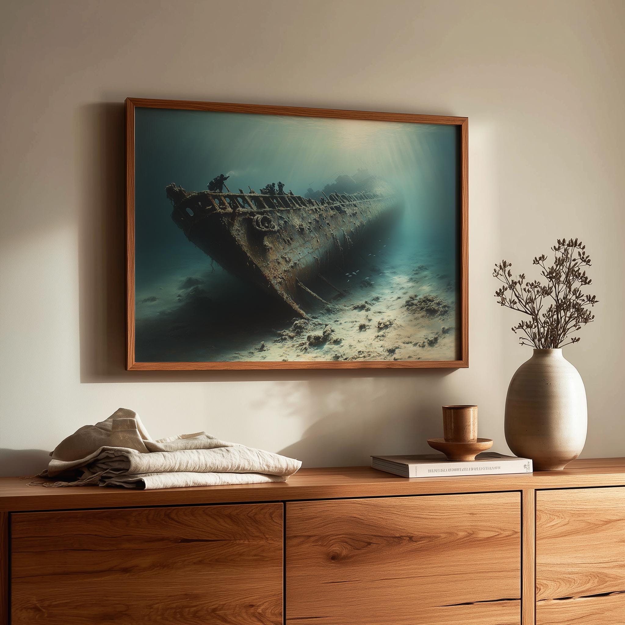 Immerse yourself in the charm with this painting of a mysterious underwater shipwreck. An instantly downloadable print, it's perfect for elevating your decor with budget-friendly charm. This gives you the flexibility to customize the size, frame, and material according to your personal taste and space, ensuring a perfect fit for your walls.