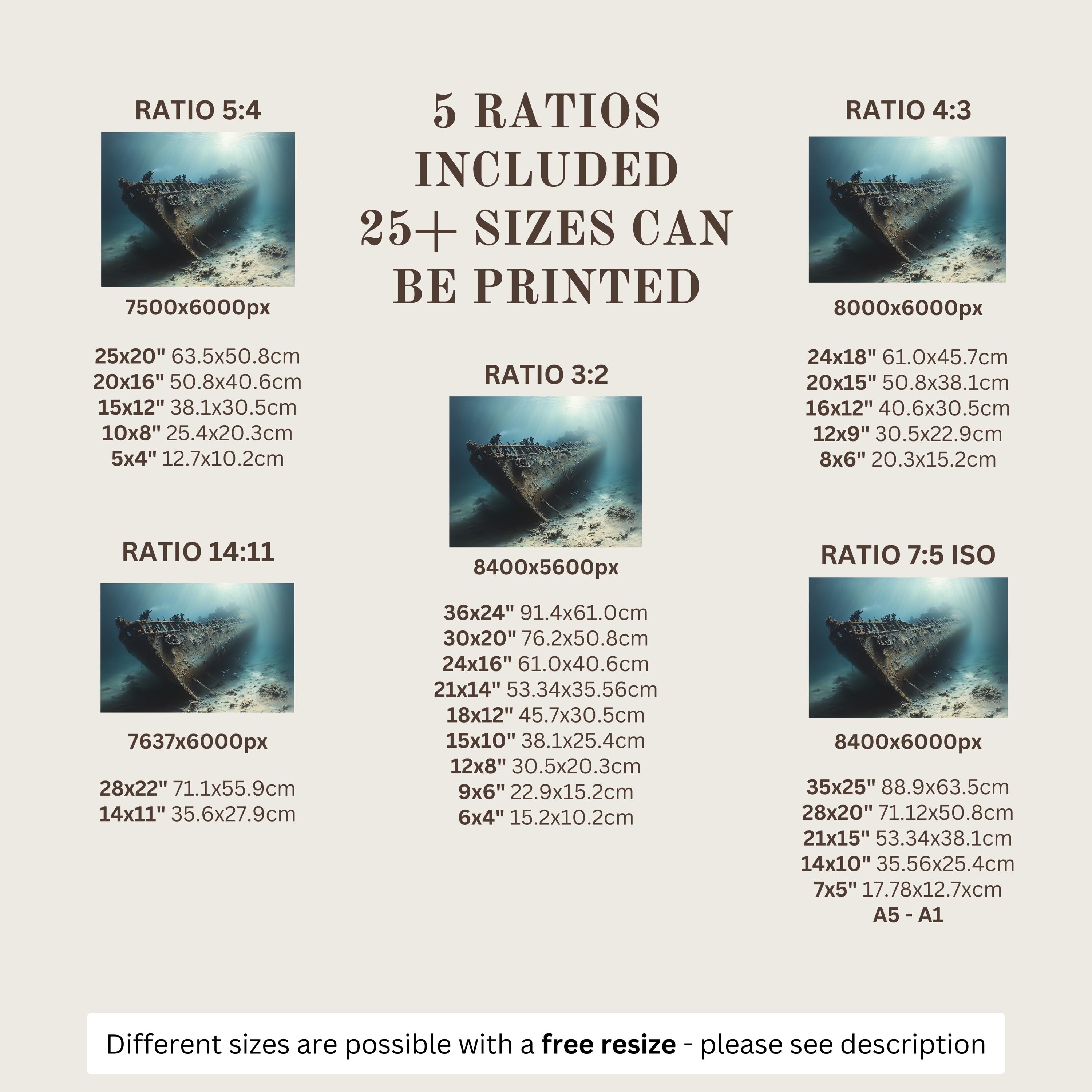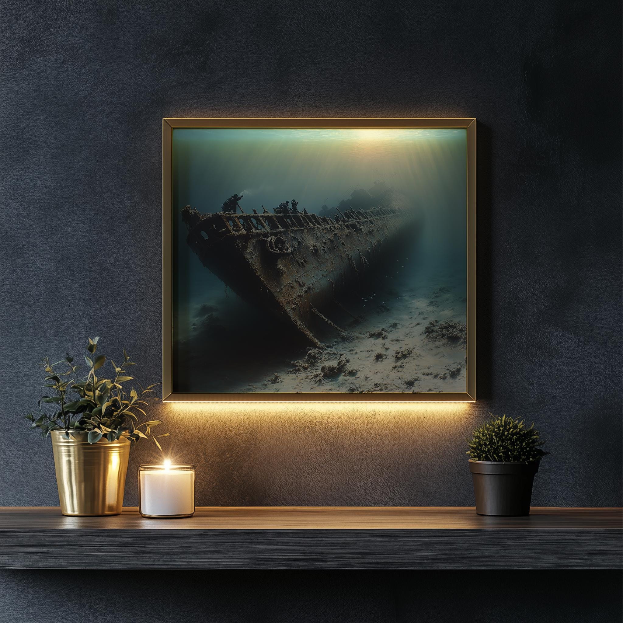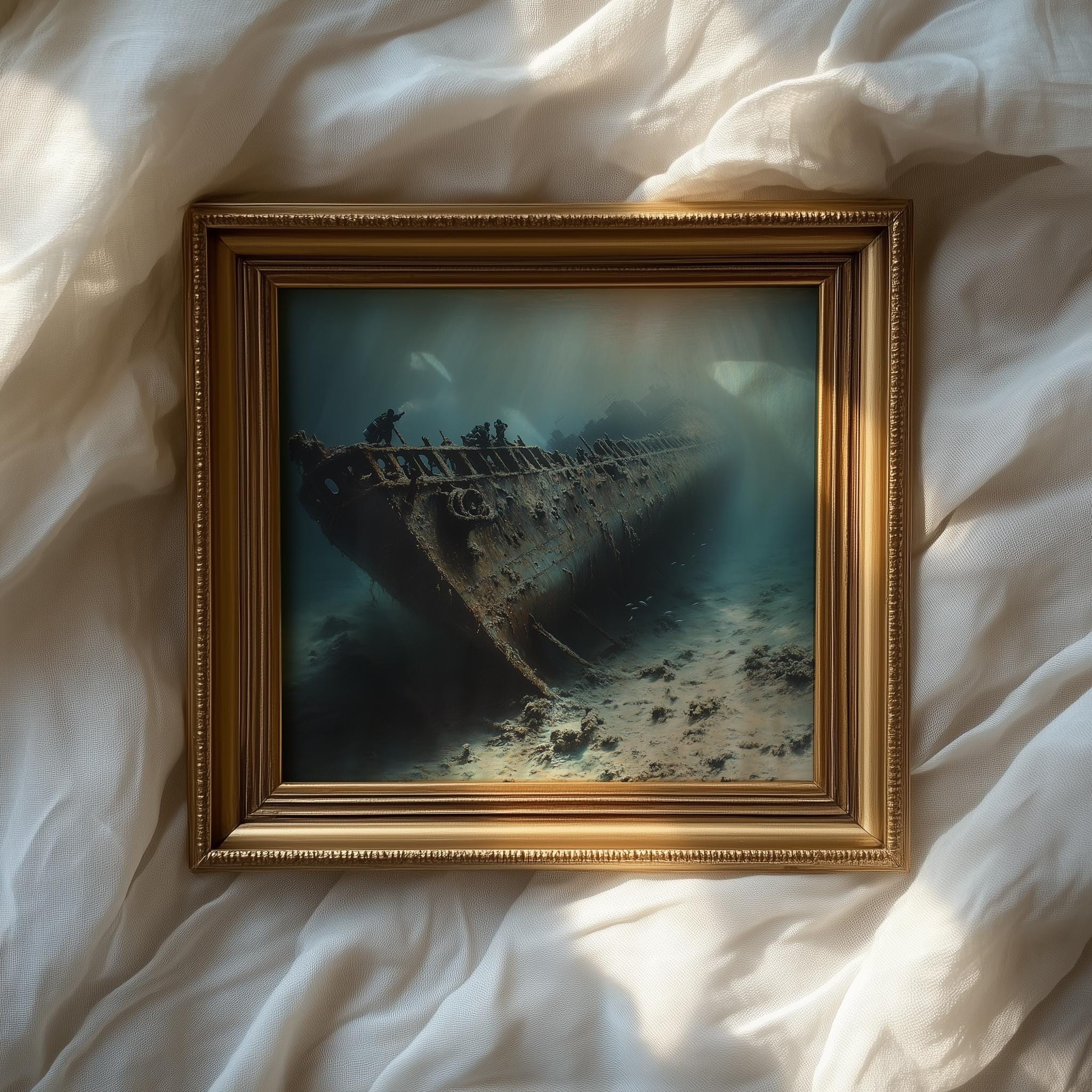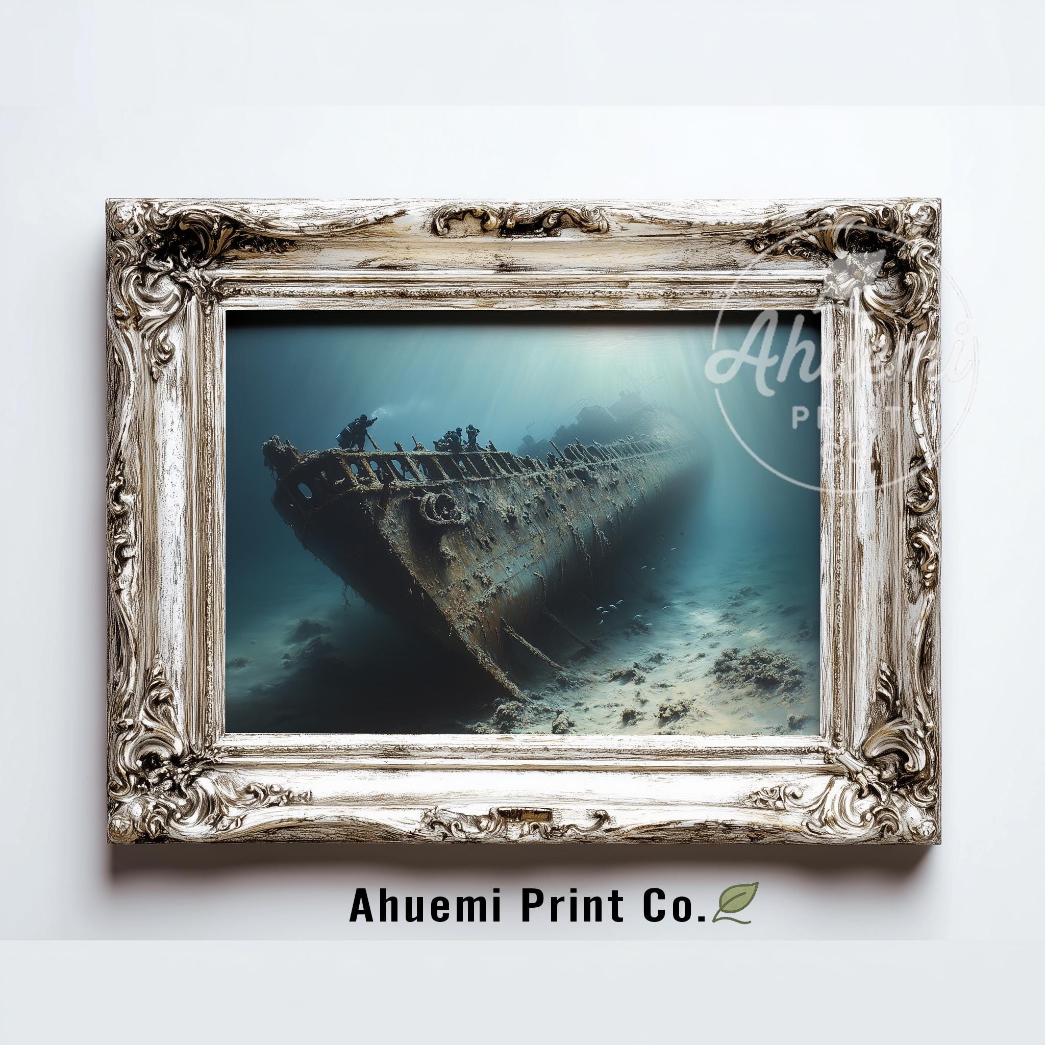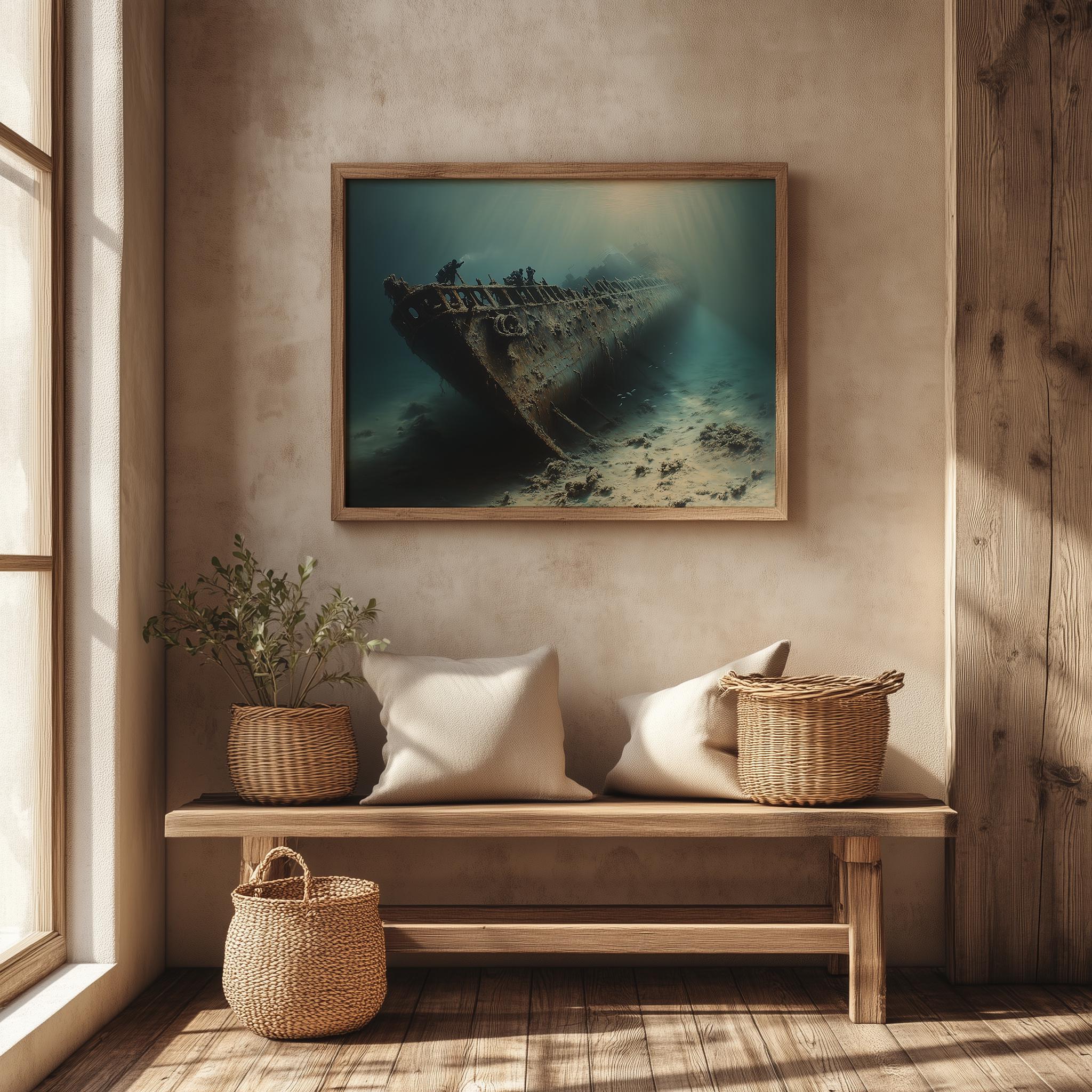 Immerse yourself in the charm with this painting of a mysterious underwater shipwreck. An instantly downloadable print, it's perfect for elevating your decor with budget-friendly charm. This gives you the flexibility to customize the size, frame, and material according to your personal taste and space, ensuring a perfect fit for your walls.