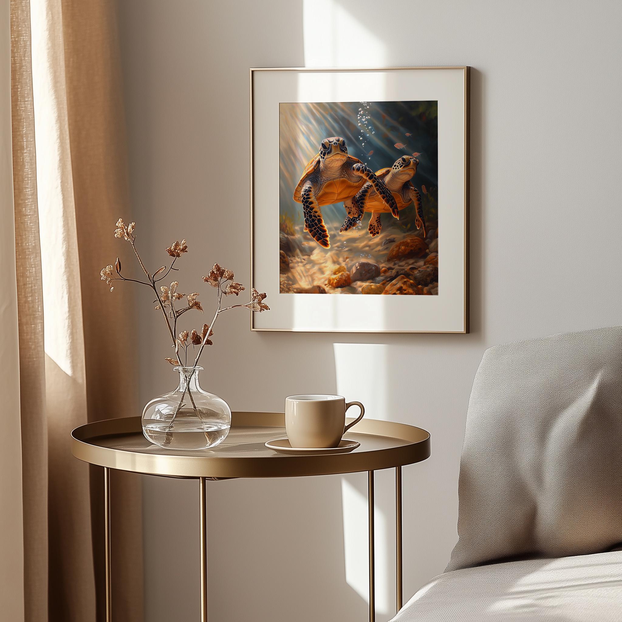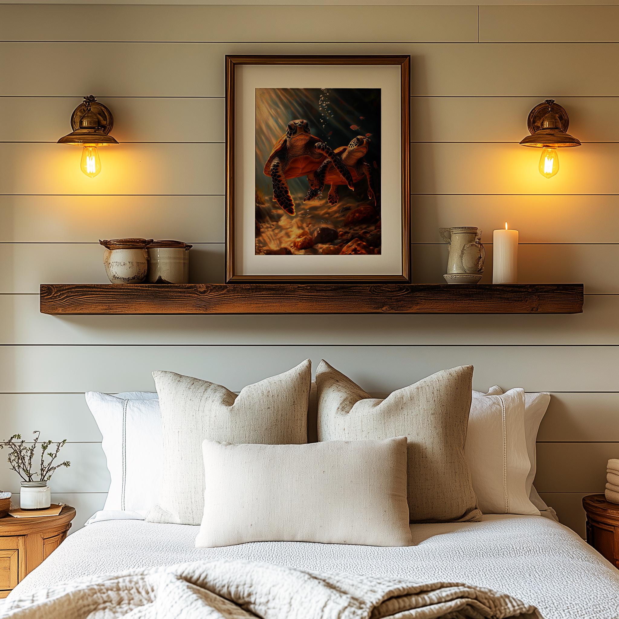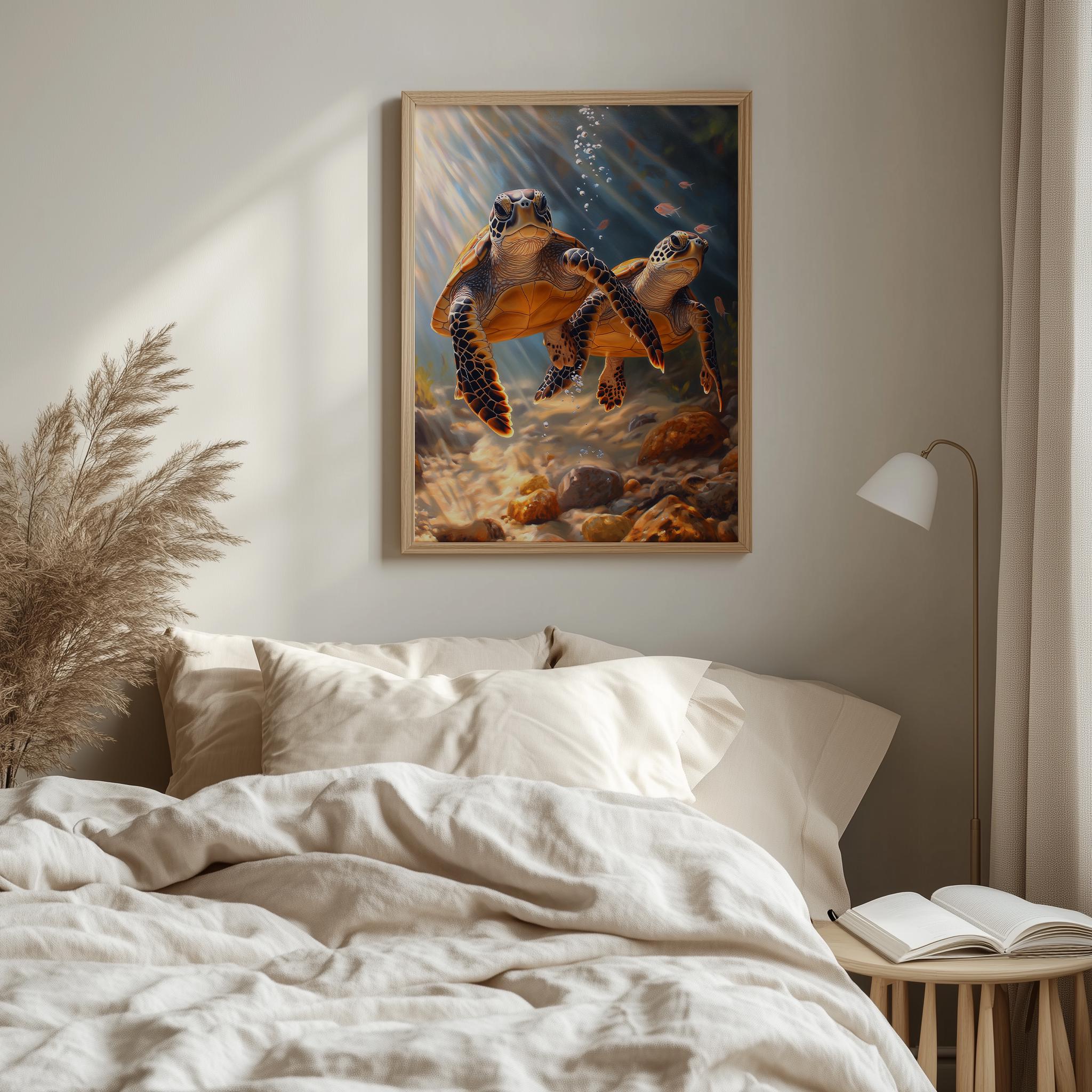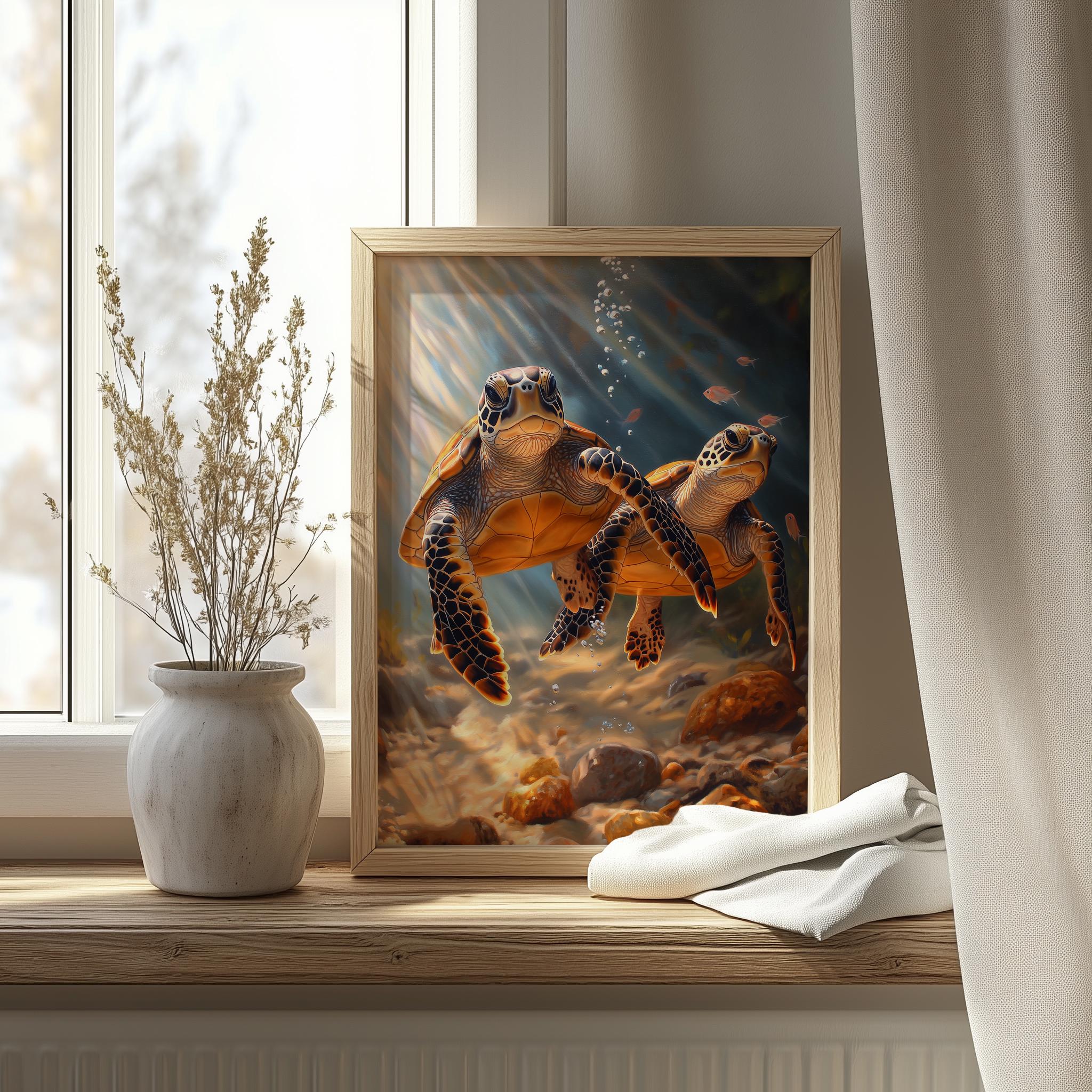 Immerse yourself in the charm of this painting of a graceful sea turtle gliding through the serene depths of the ocean. An instantly downloadable print, it's perfect for elevating your decor with budget-friendly charm. This gives you the flexibility to customize the size, frame, and material according to your personal taste and space, ensuring a perfect fit for your walls.
