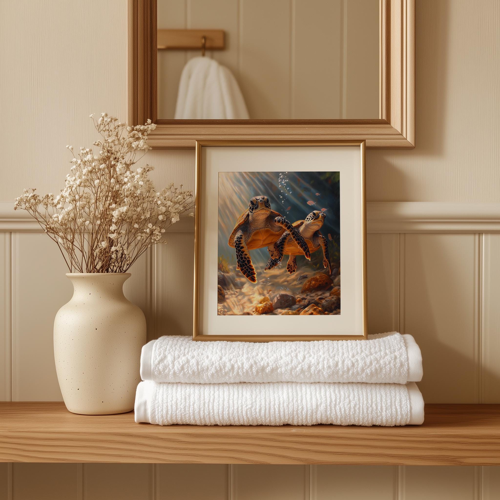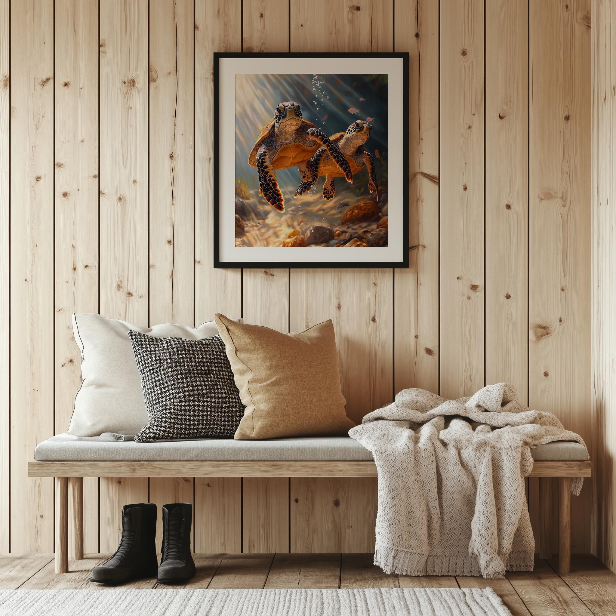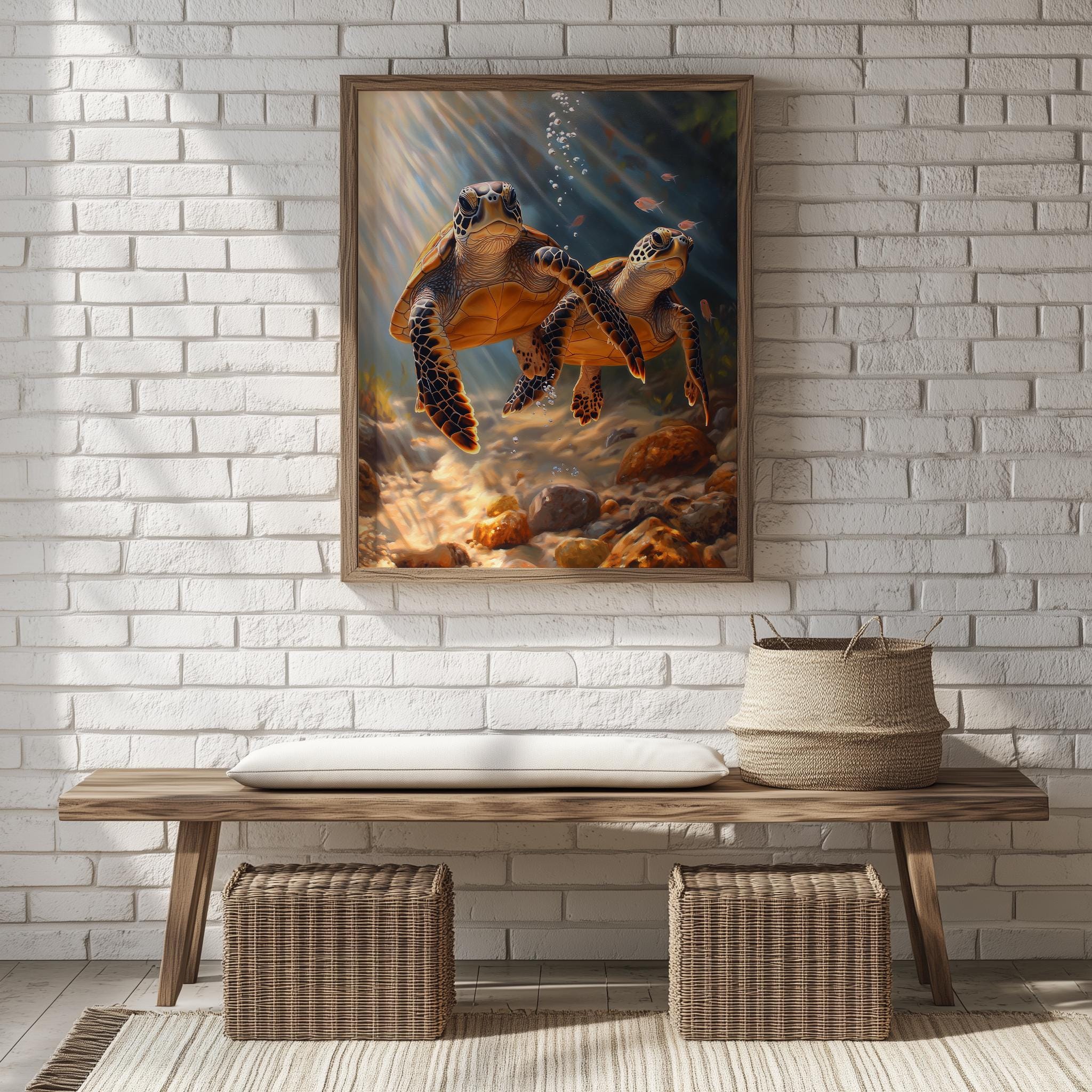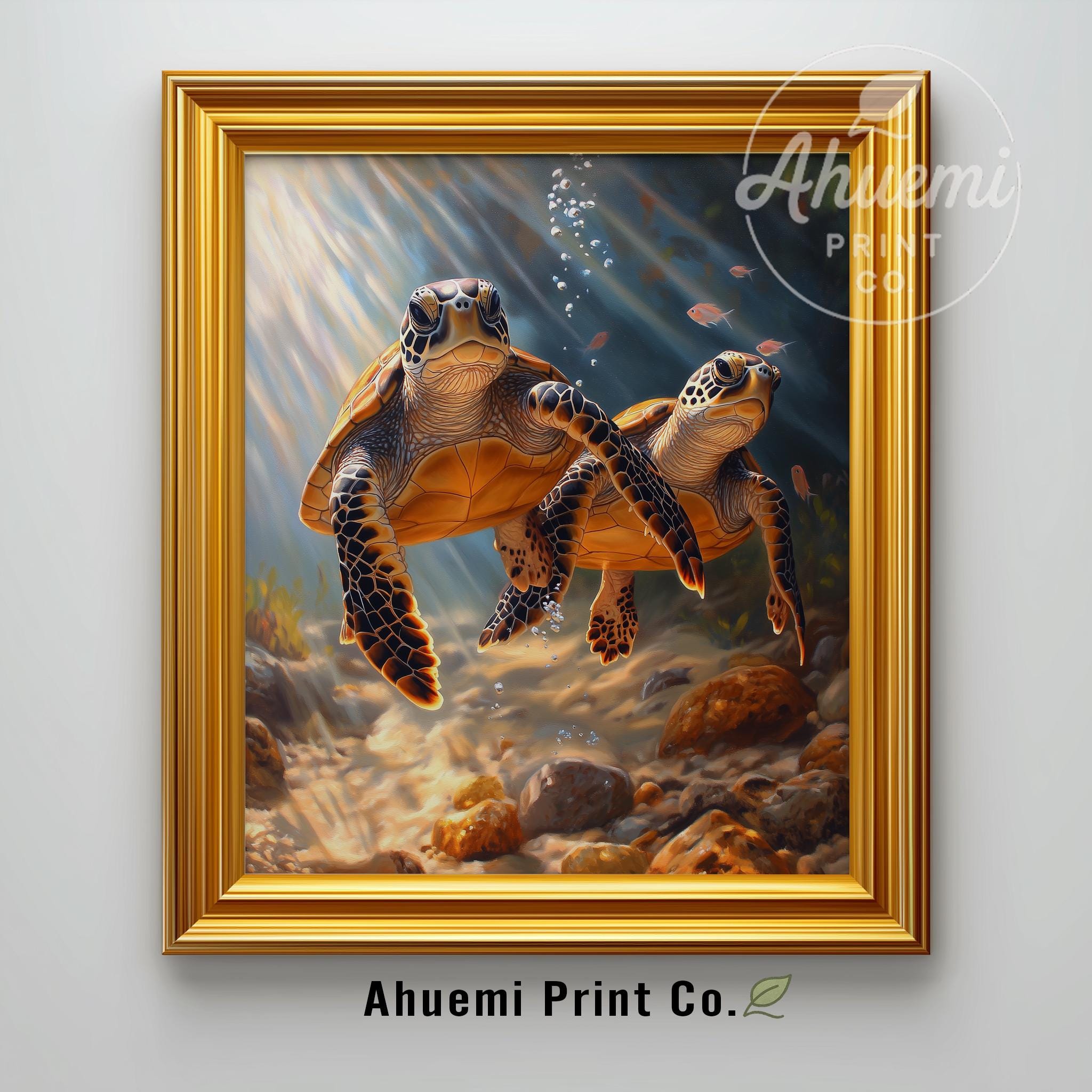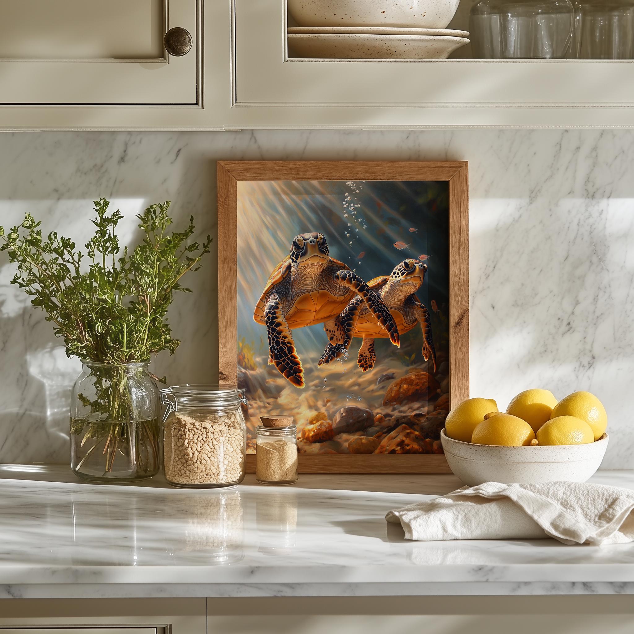 Immerse yourself in the charm of this painting of a graceful sea turtle gliding through the serene depths of the ocean. An instantly downloadable print, it's perfect for elevating your decor with budget-friendly charm. This gives you the flexibility to customize the size, frame, and material according to your personal taste and space, ensuring a perfect fit for your walls.