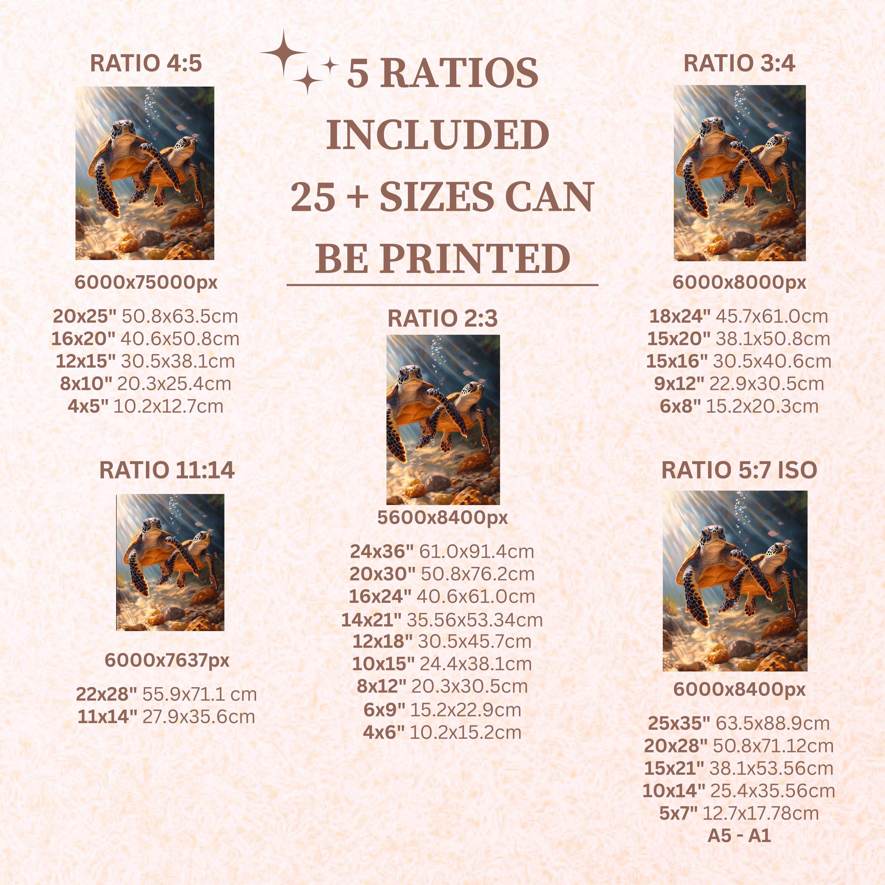Each artwork includes 5 aspect ratios with 25+ print sizes. Most standard frames are covered. One custom resize per purchase available—message before ordering.