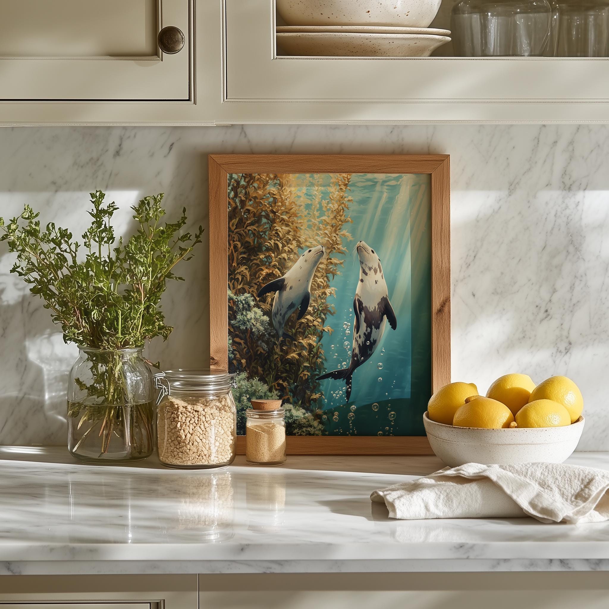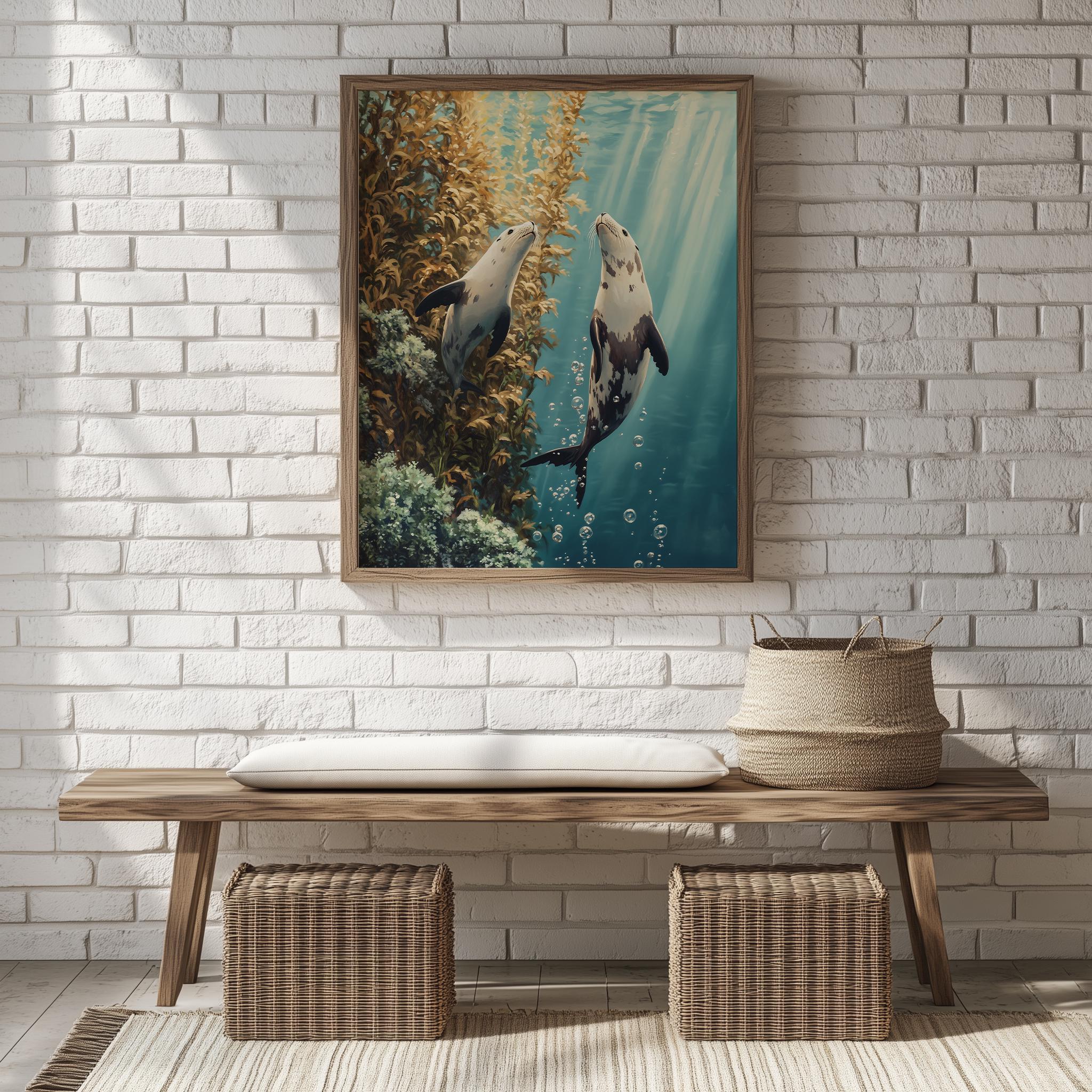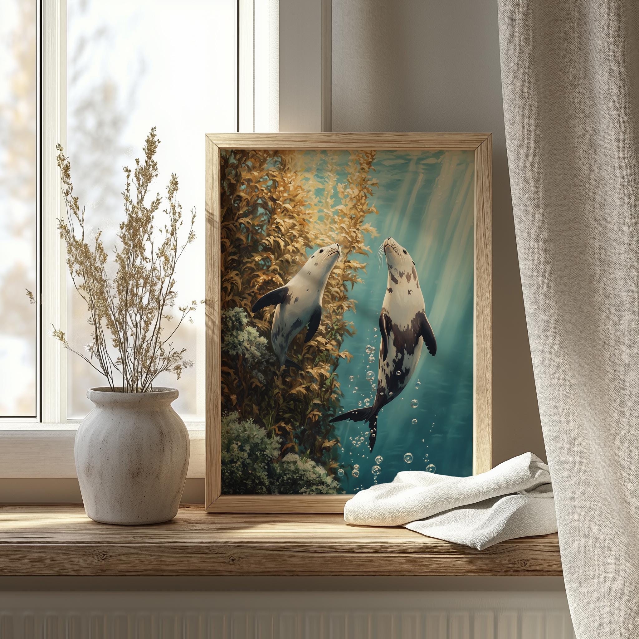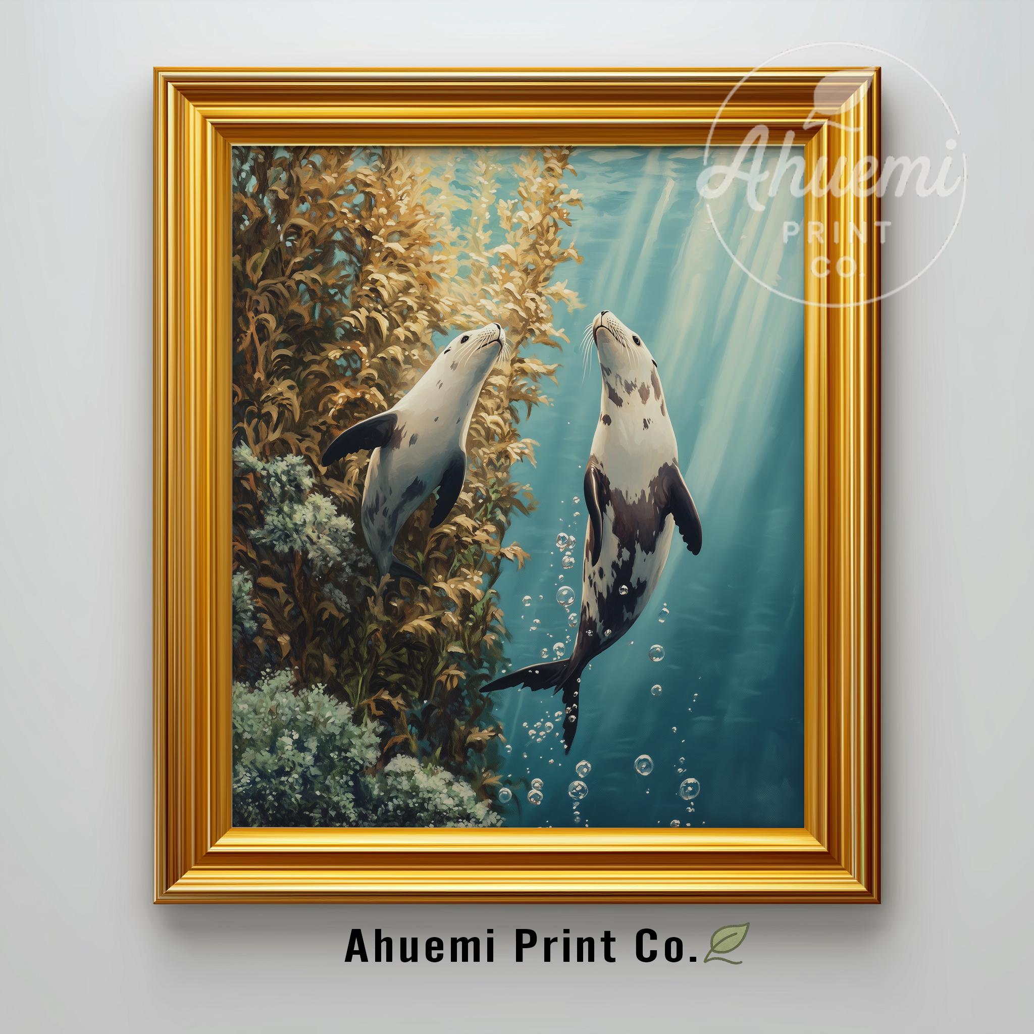 Immerse yourself in the charm of this painting of seals playing amidst a vibrant underwater kelp forest. An instantly downloadable print, it's perfect for elevating your decor with budget-friendly charm. This gives you the flexibility to customize the size, frame, and material according to your personal taste and space, ensuring a perfect fit for your walls.
