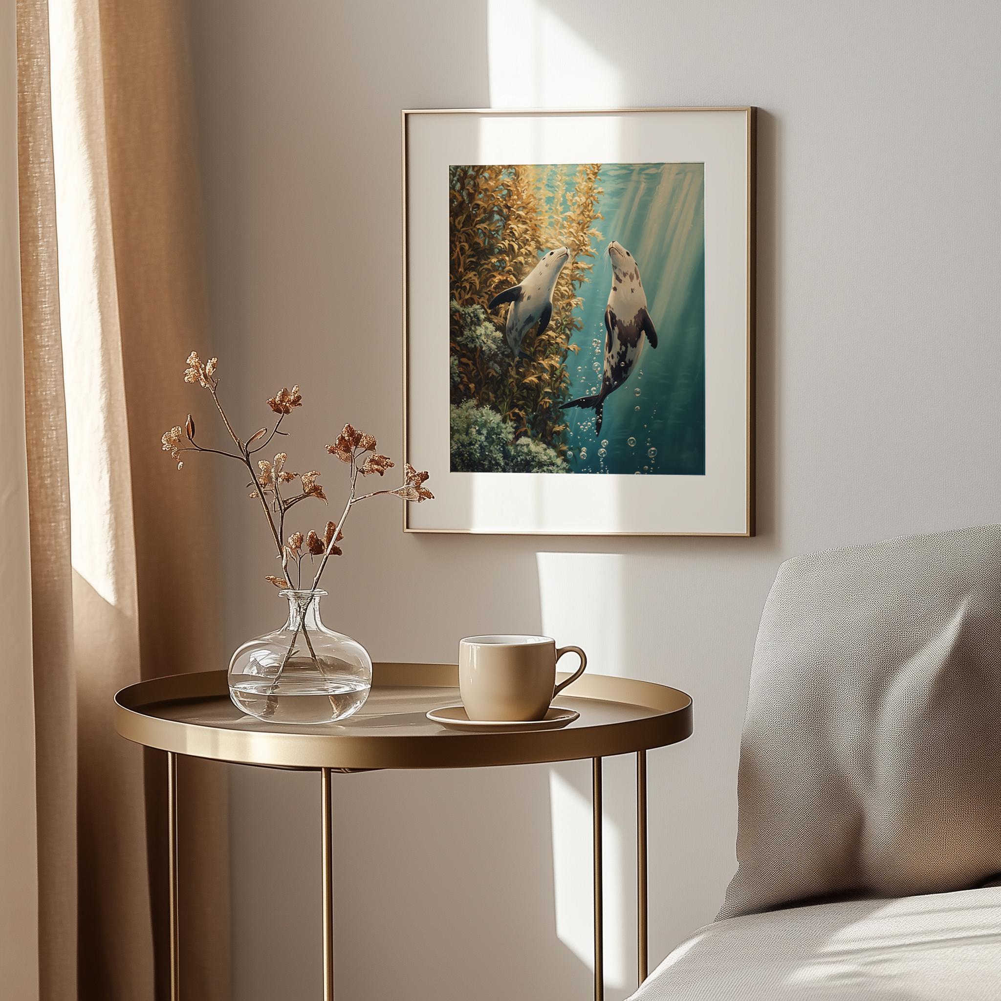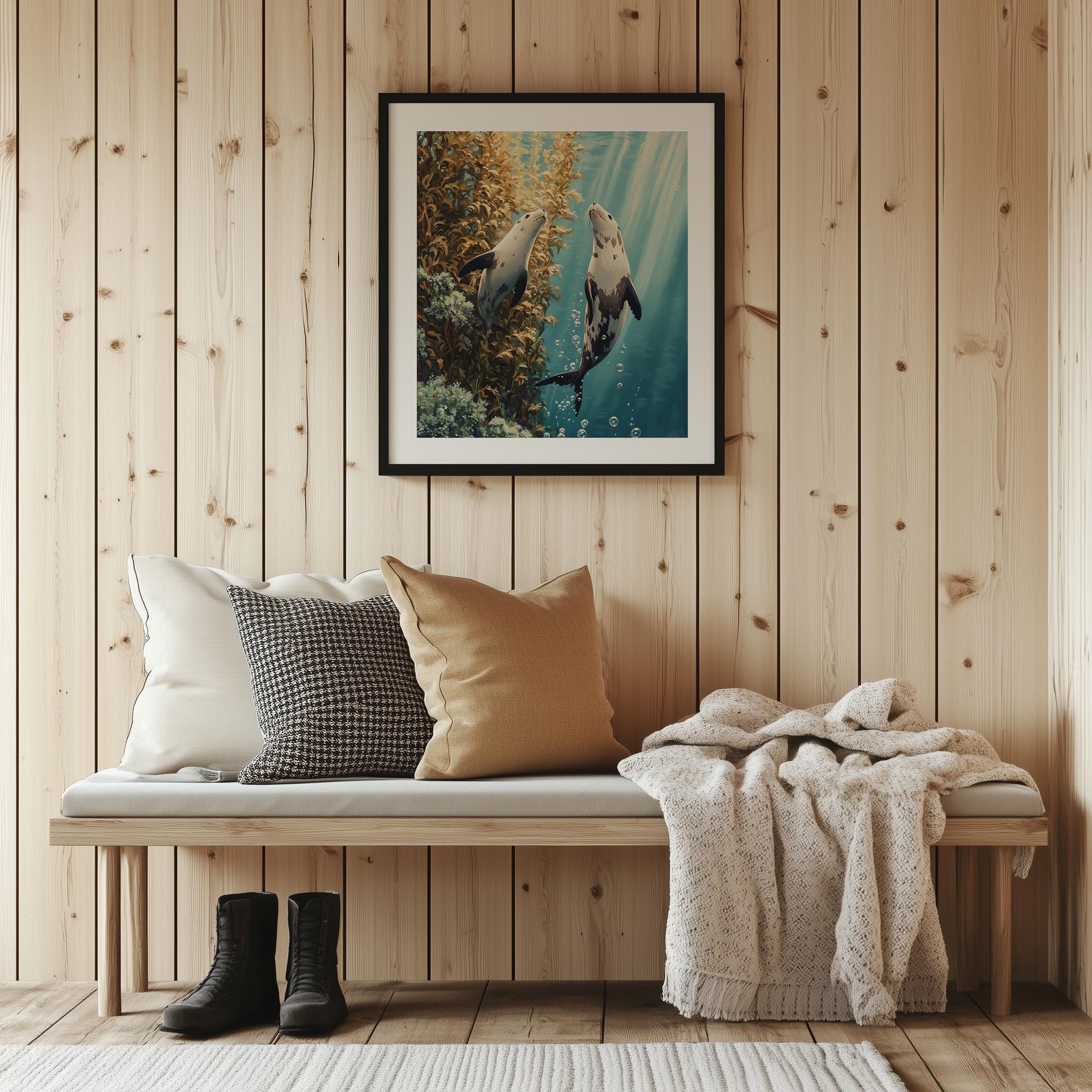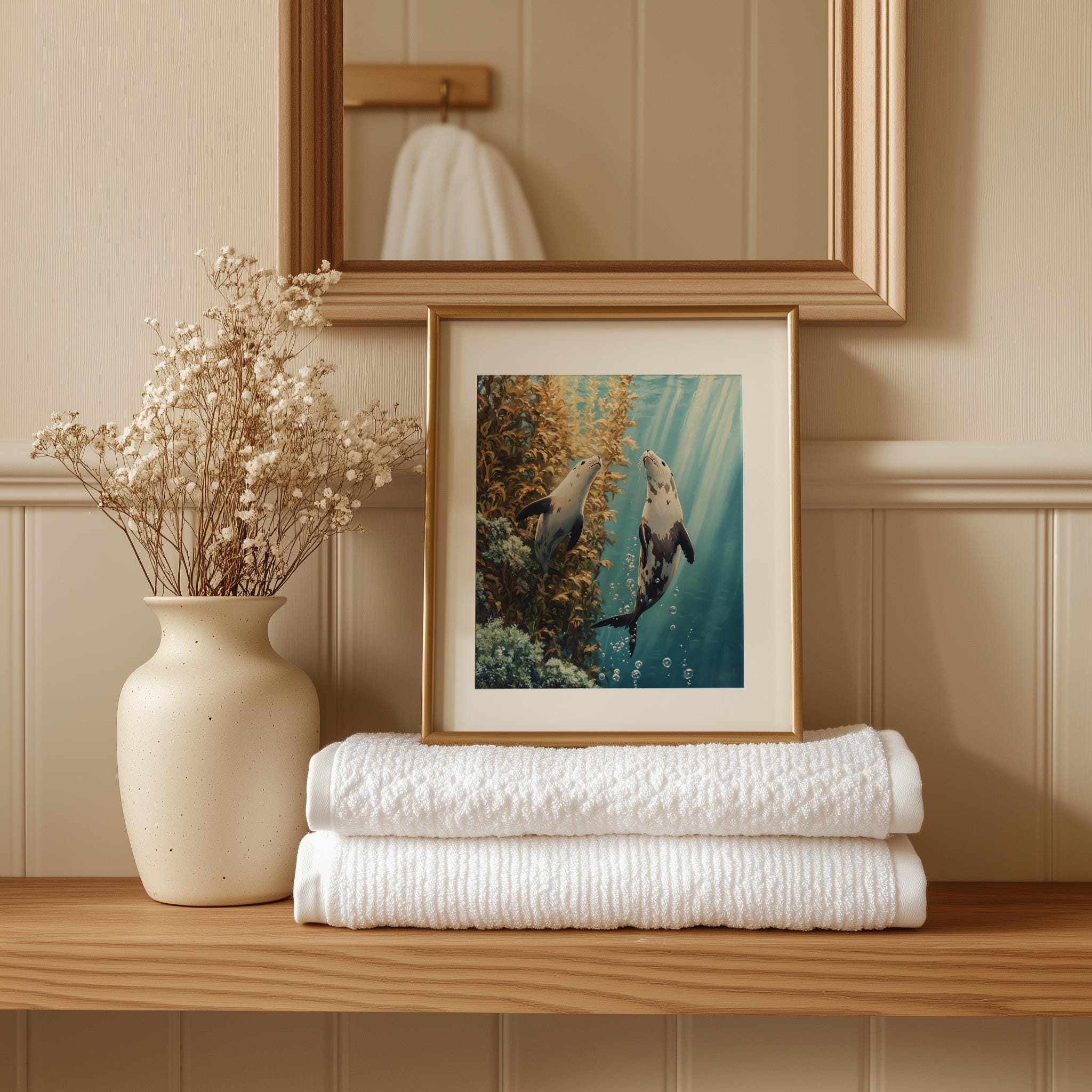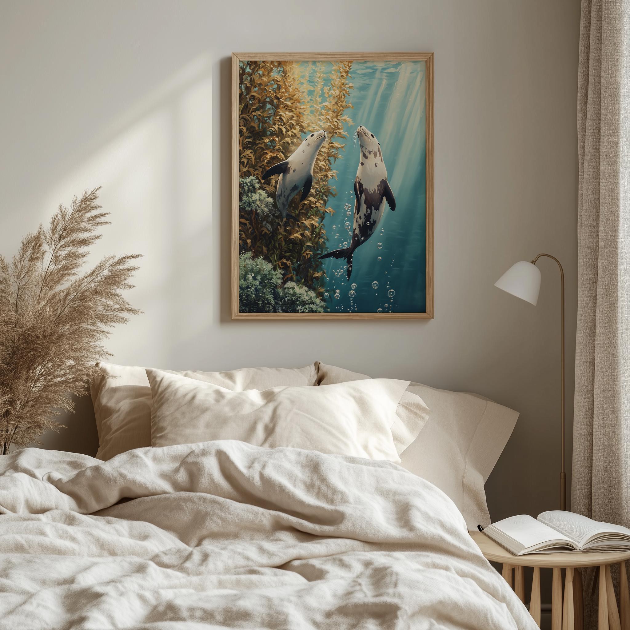 Immerse yourself in the charm of this painting of seals playing amidst a vibrant underwater kelp forest. An instantly downloadable print, it's perfect for elevating your decor with budget-friendly charm. This gives you the flexibility to customize the size, frame, and material according to your personal taste and space, ensuring a perfect fit for your walls.