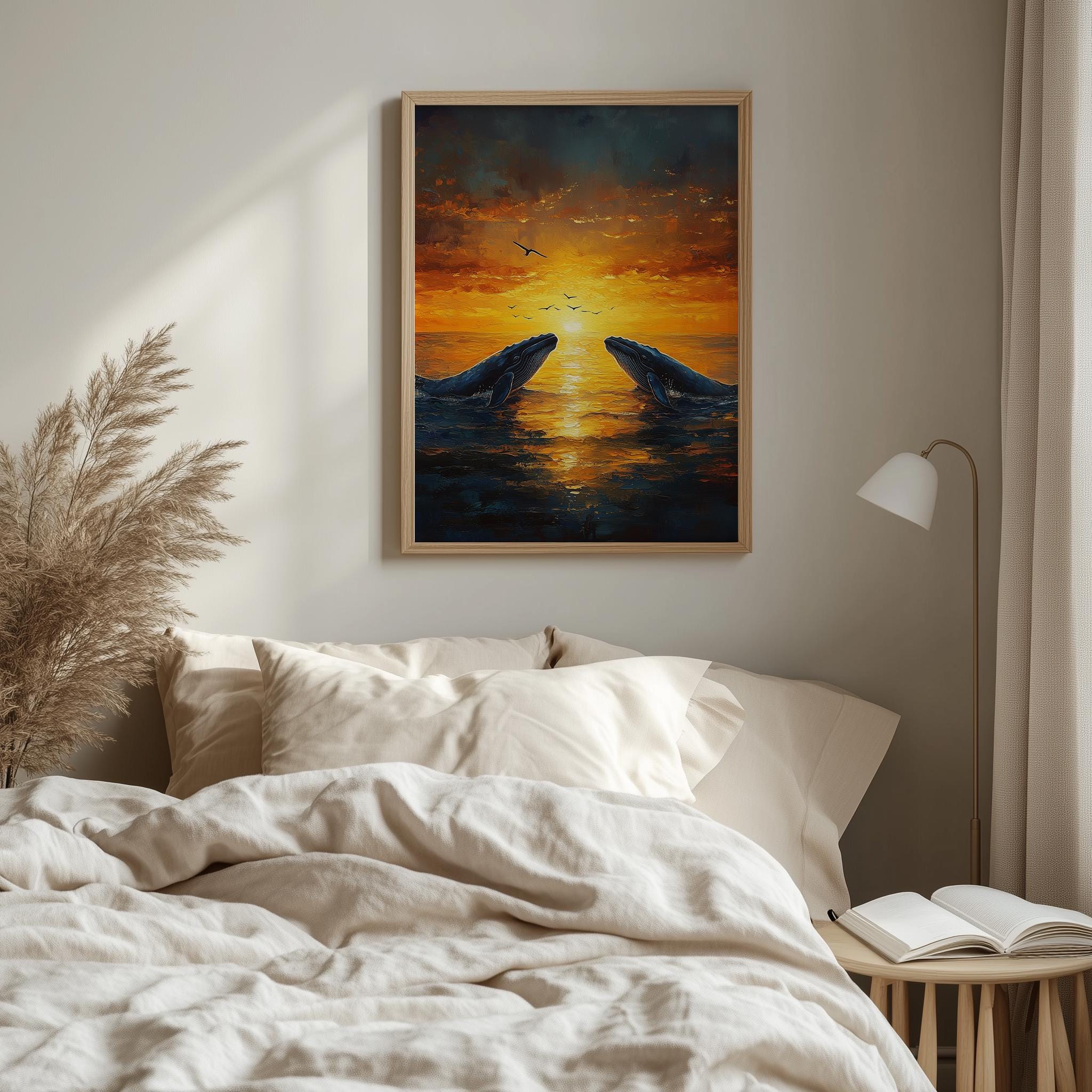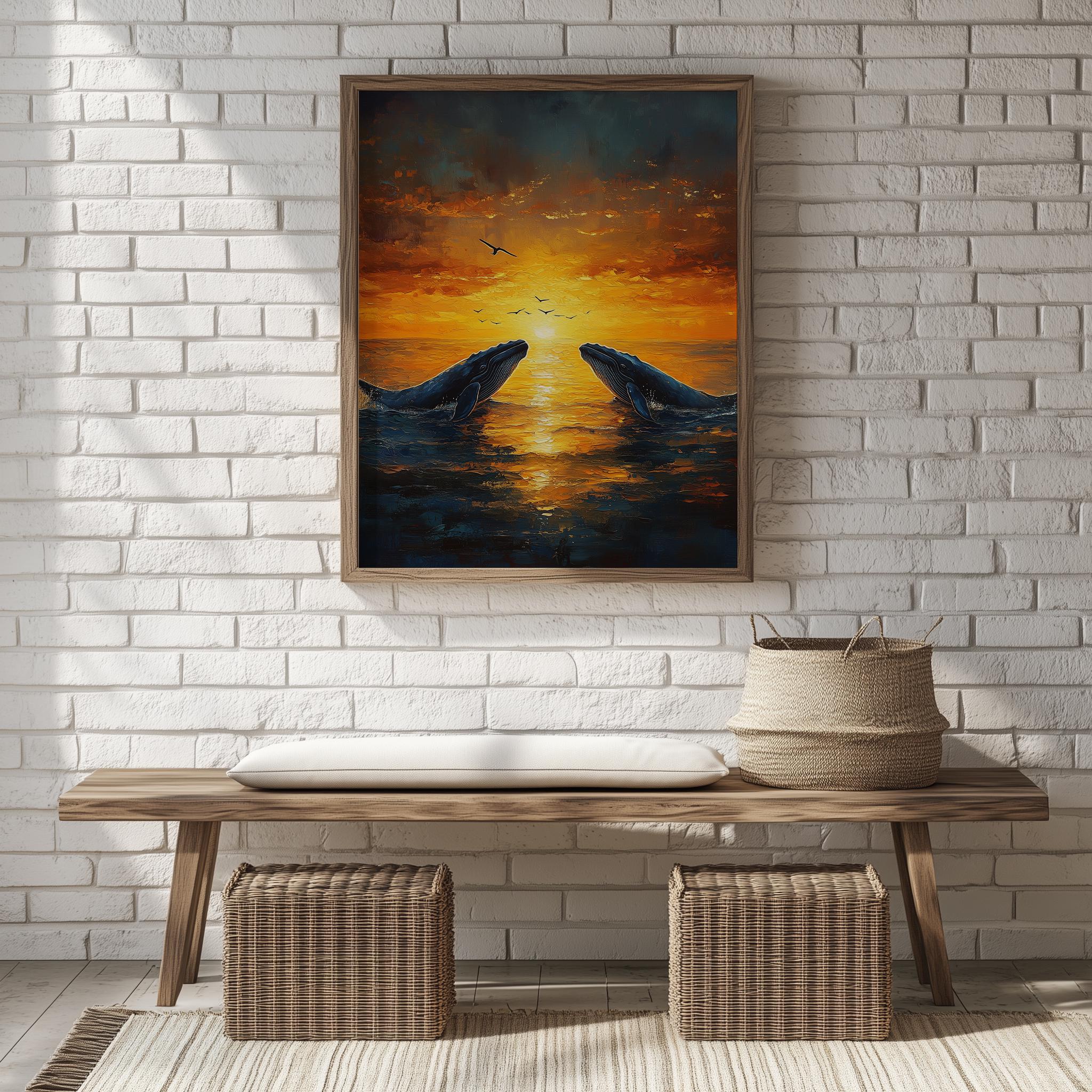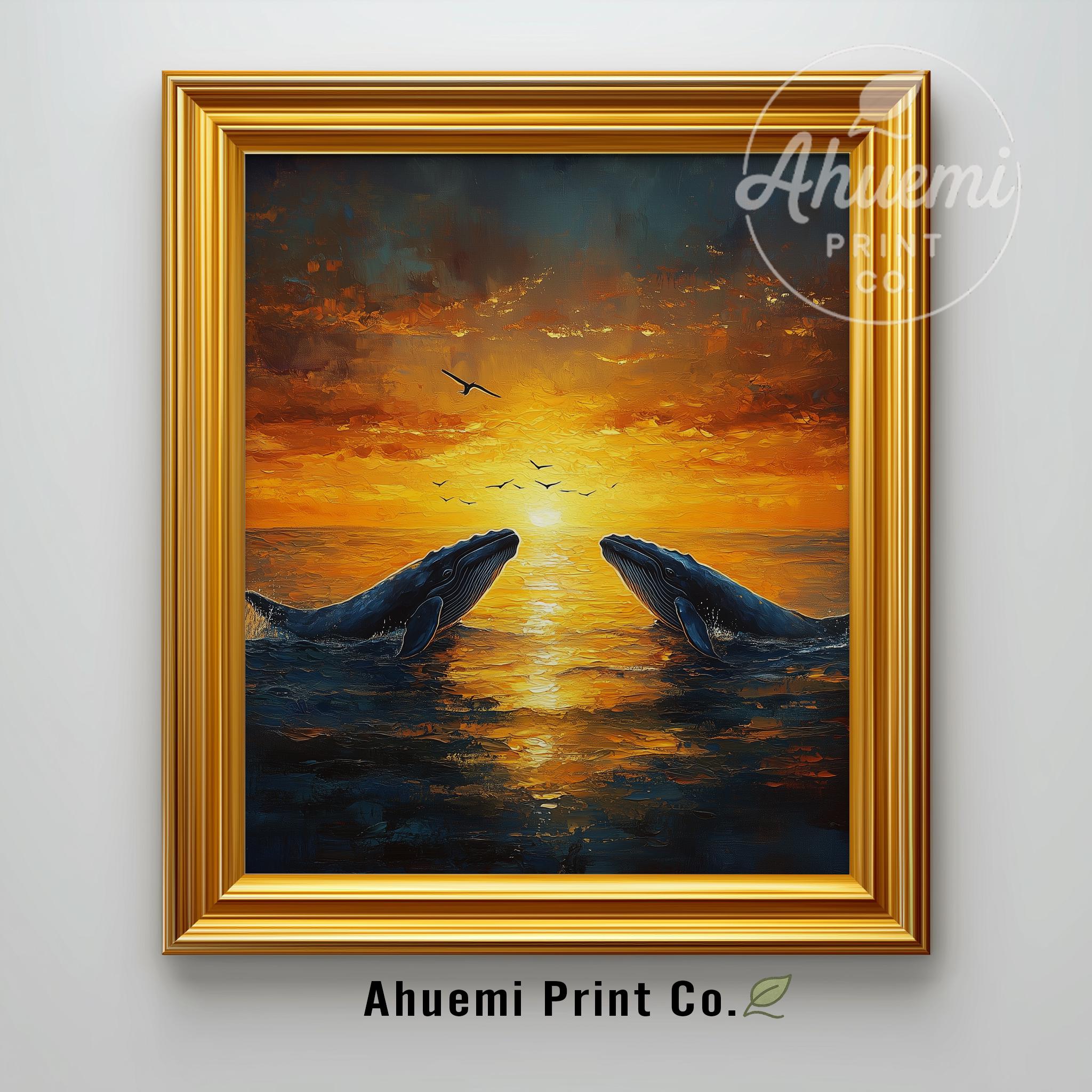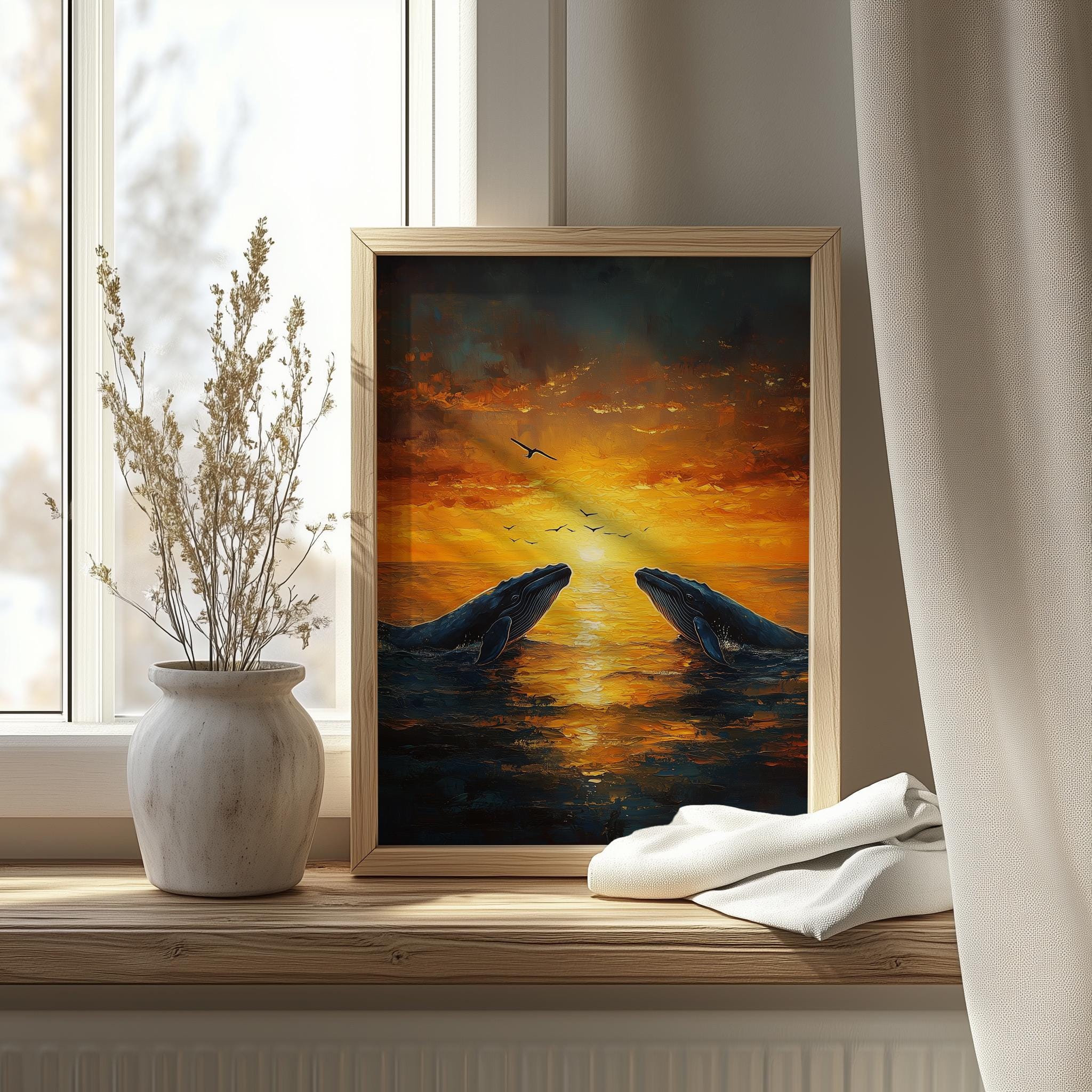 Immerse yourself in the charm of this painting of majestic blue whales swimming gracefully under a moody tropical sunset. An instantly downloadable print, it's perfect for elevating your decor with budget-friendly charm. This gives you the flexibility to customize the size, frame, and material according to your personal taste and space, ensuring a perfect fit for your walls.