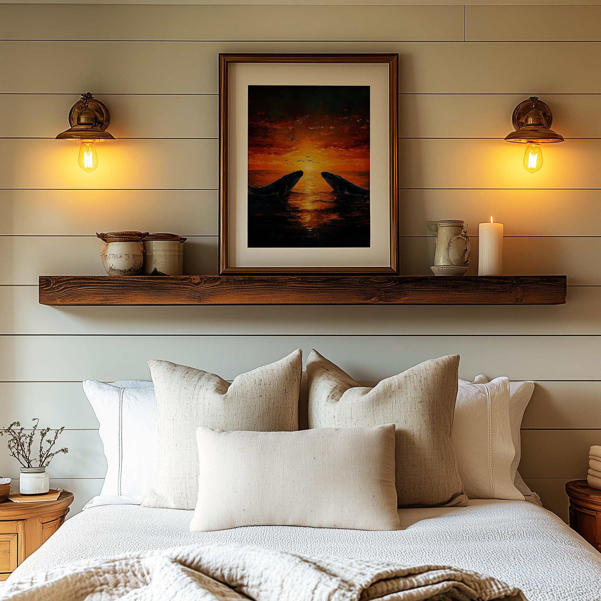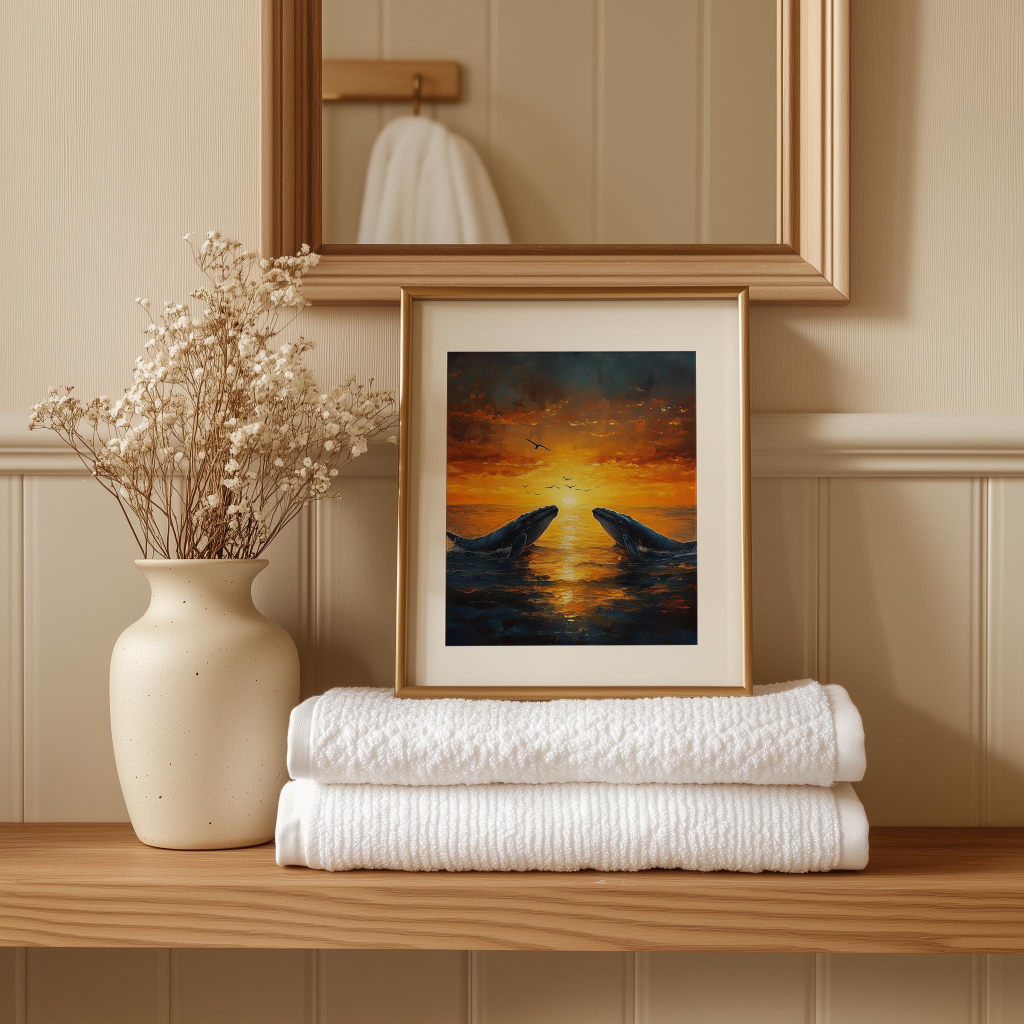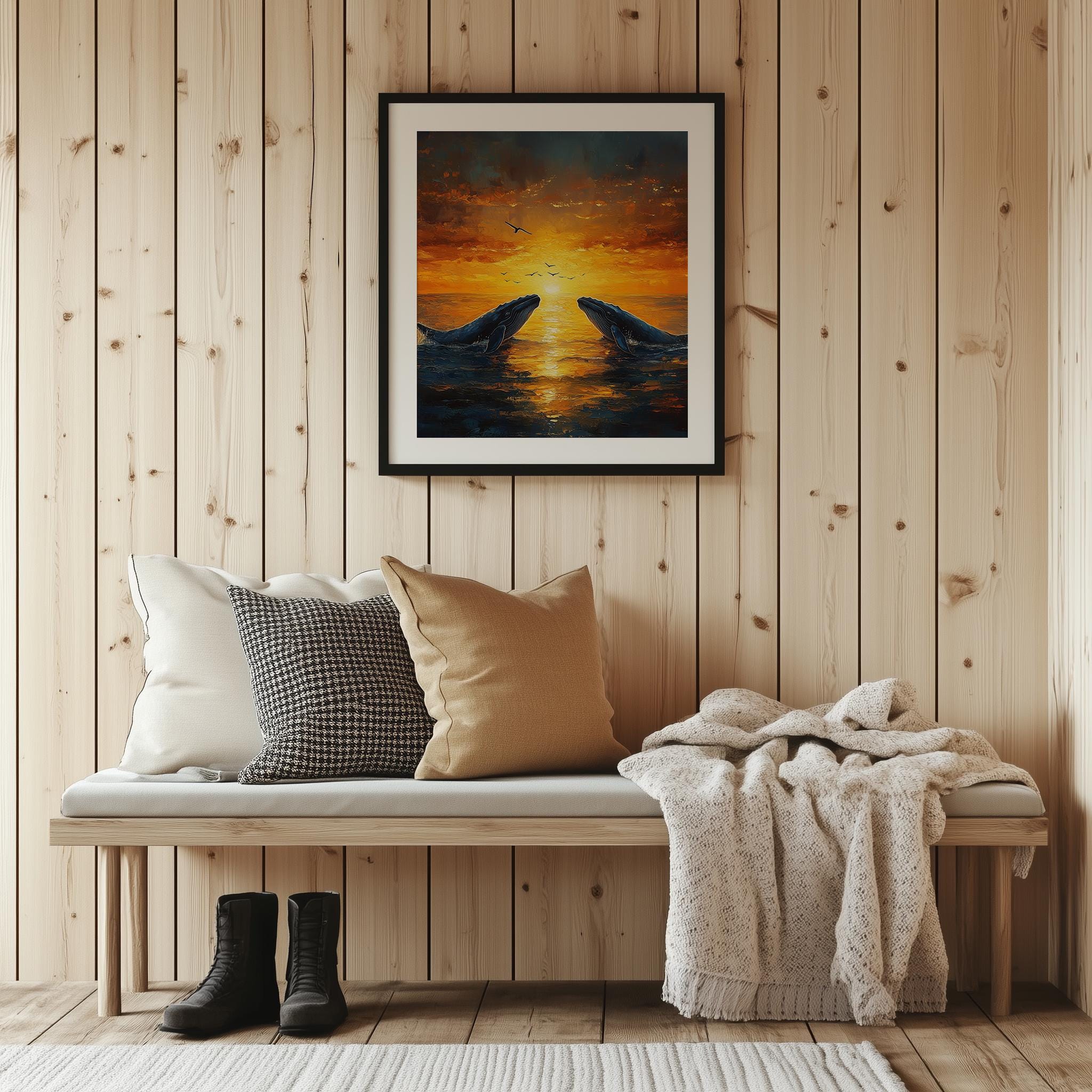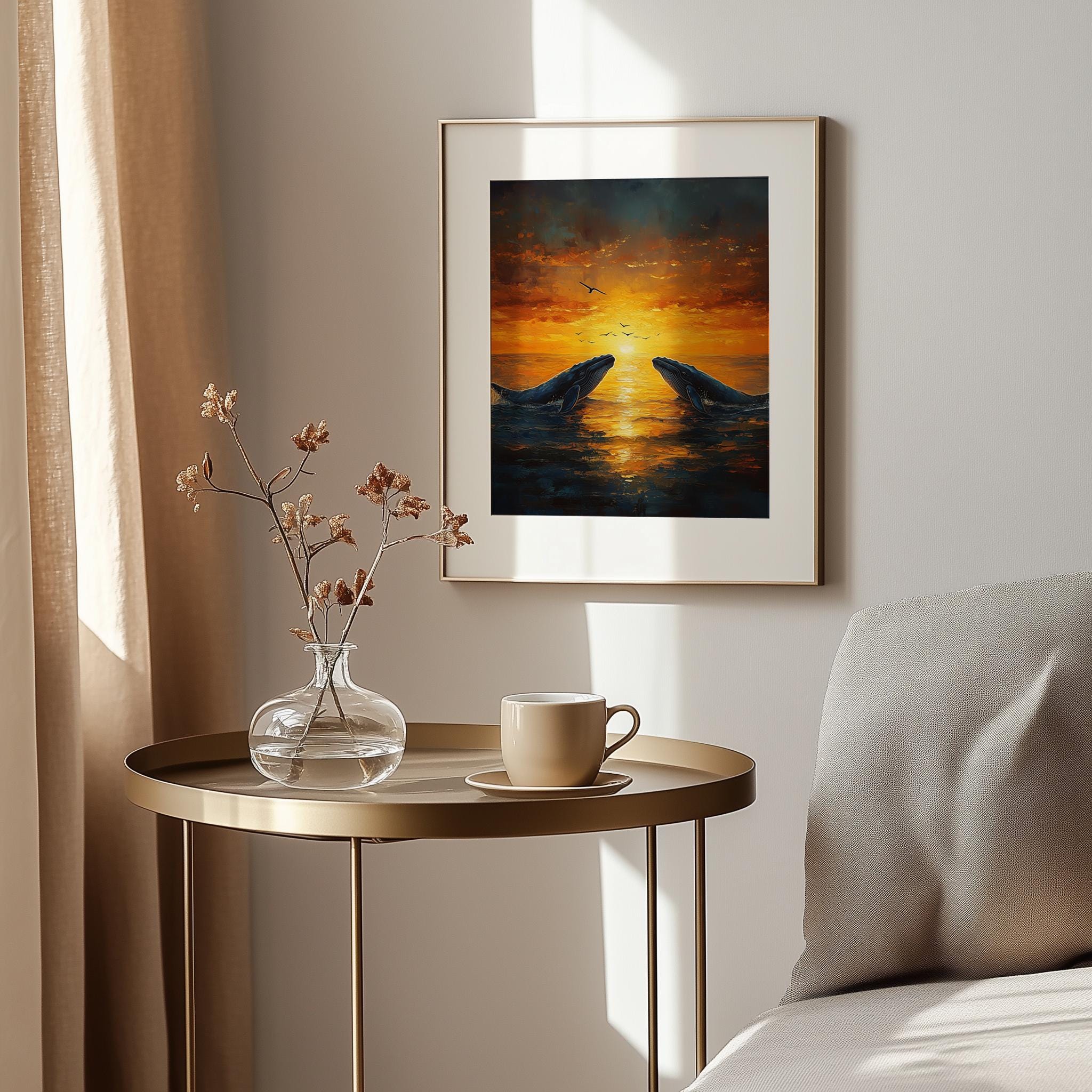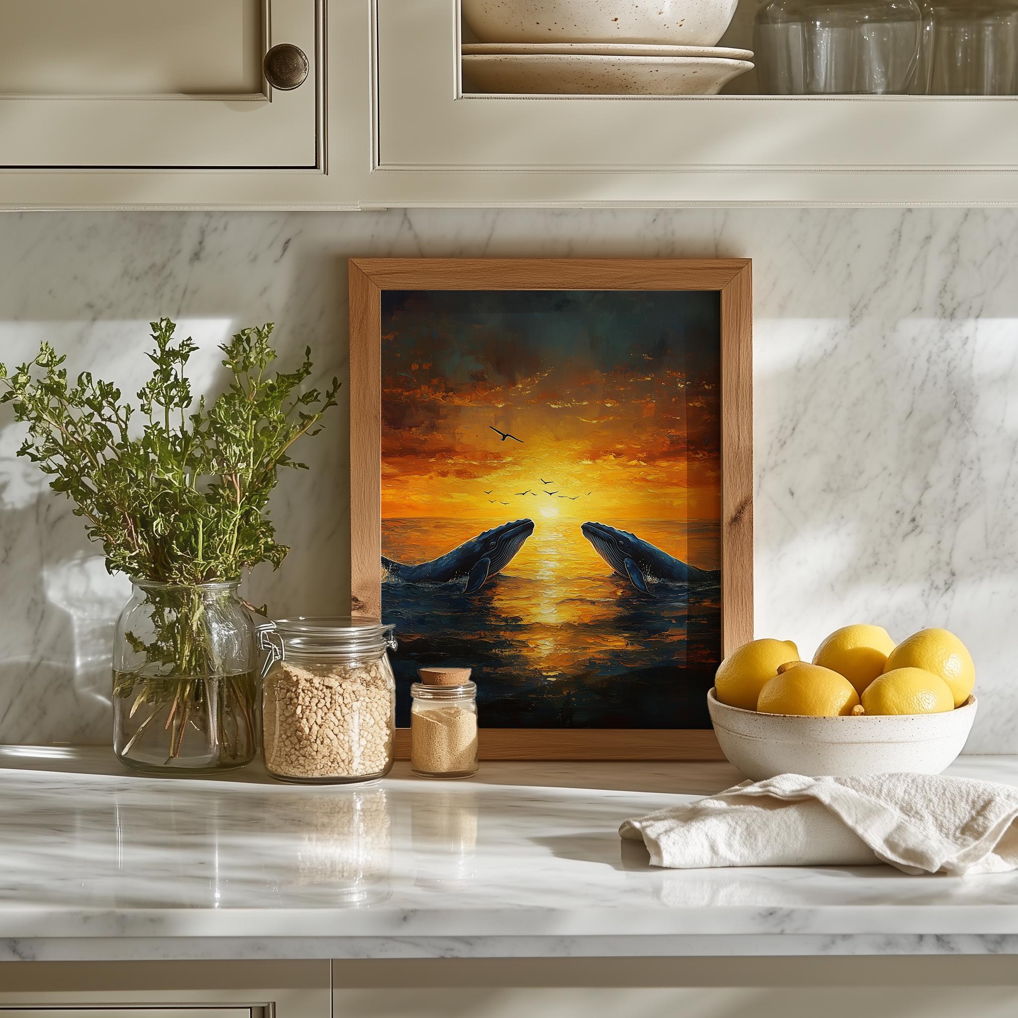 Immerse yourself in the charm of this painting of majestic blue whales swimming gracefully under a moody tropical sunset. An instantly downloadable print, it's perfect for elevating your decor with budget-friendly charm. This gives you the flexibility to customize the size, frame, and material according to your personal taste and space, ensuring a perfect fit for your walls.