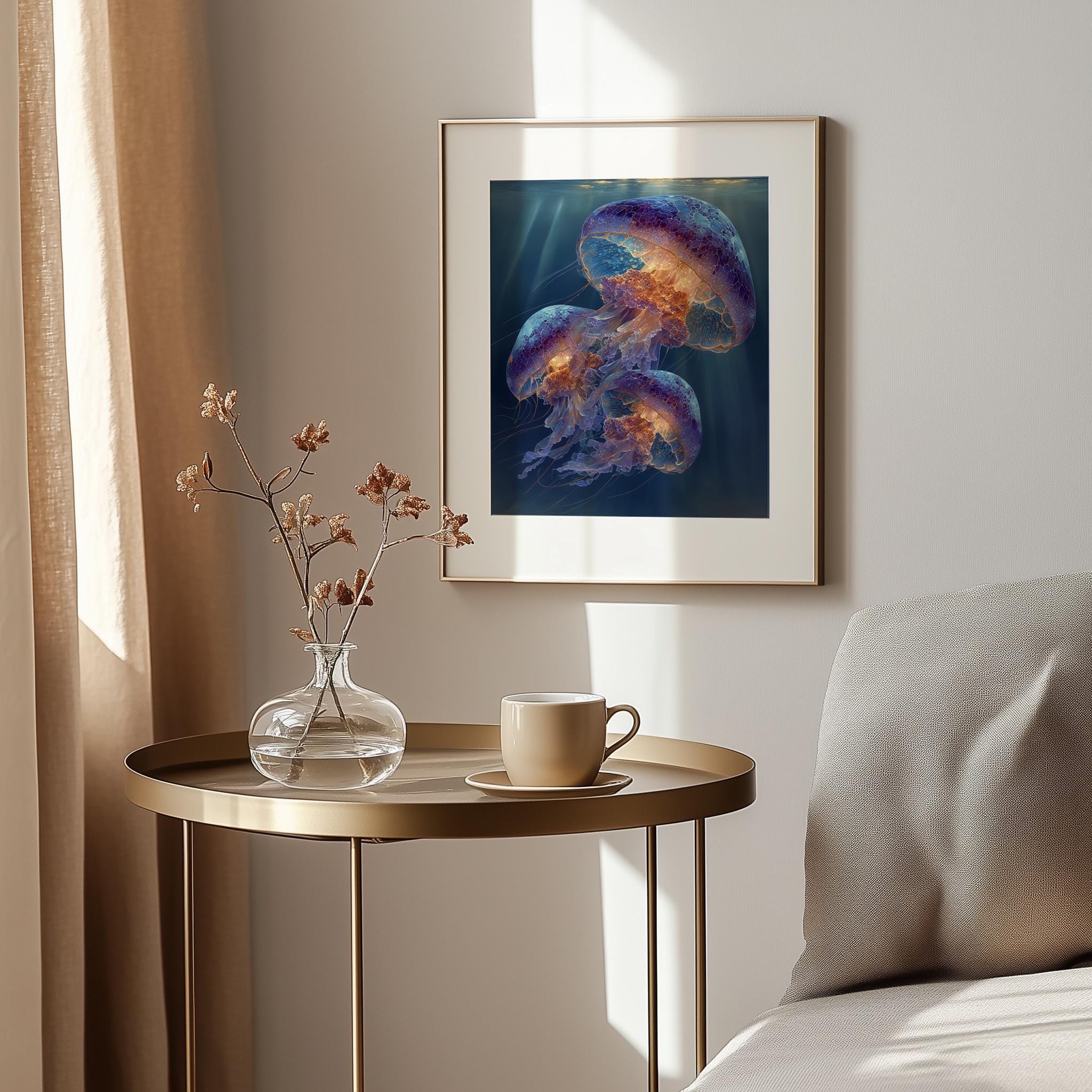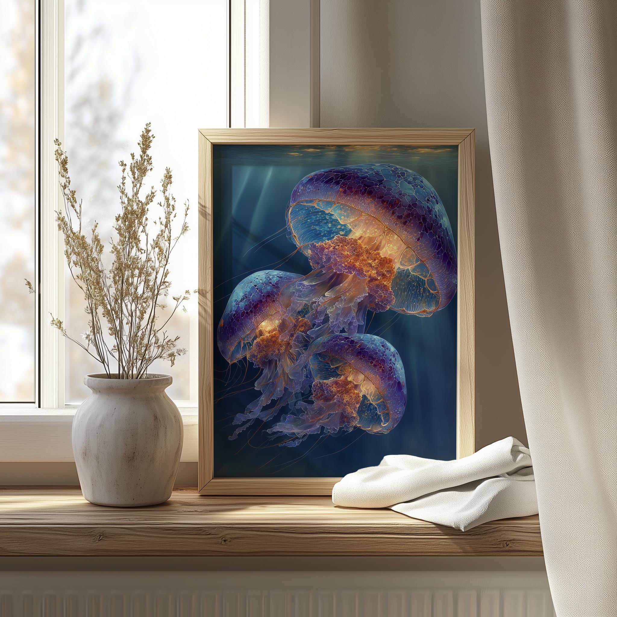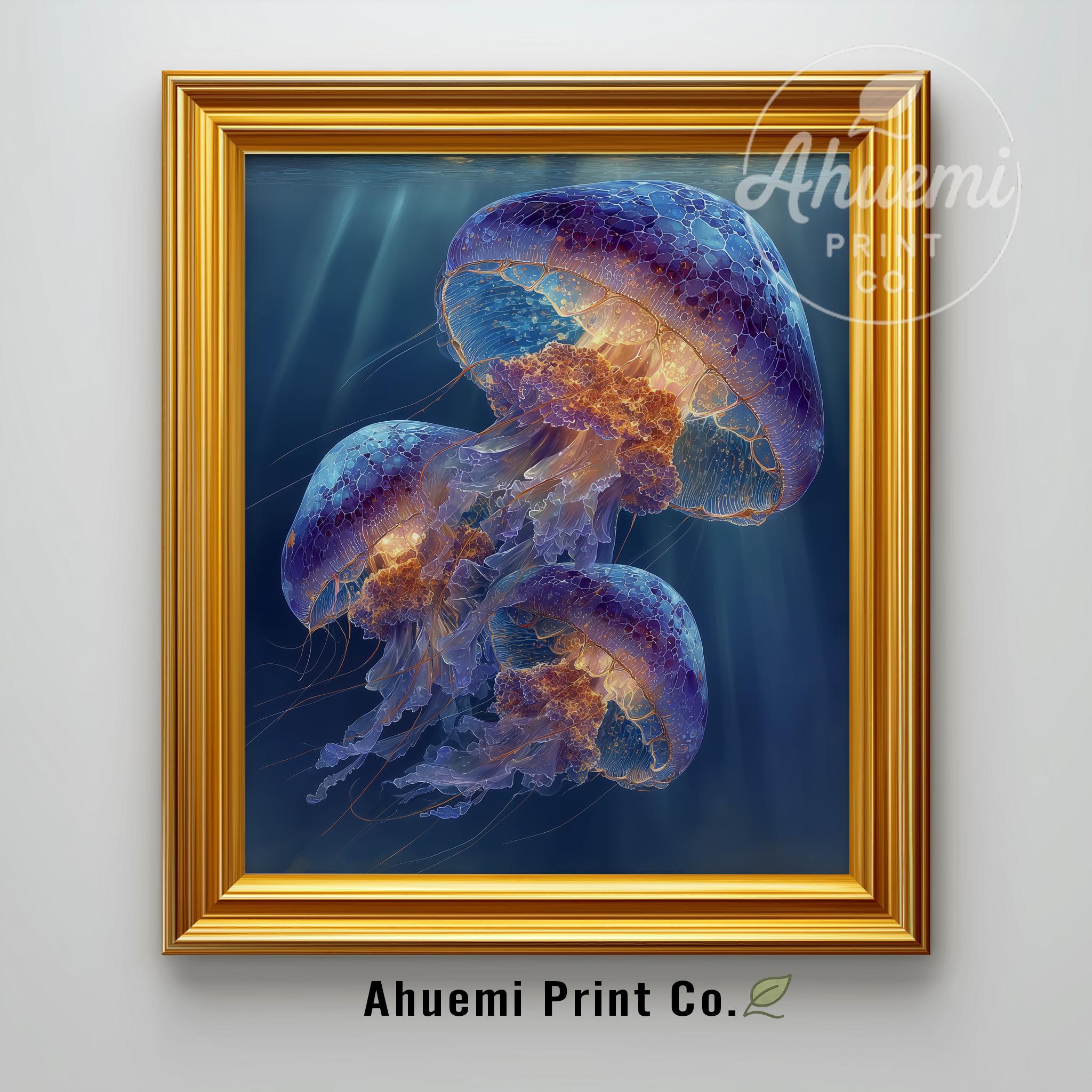 Immerse yourself in the charm of this painting of a mesmerizing moon jellyfish gracefully gliding through deep ocean waters. An instantly downloadable print, it's perfect for elevating your decor with budget-friendly charm. This gives you the flexibility to customize the size, frame, and material according to your personal taste and space, ensuring a perfect fit for your walls.